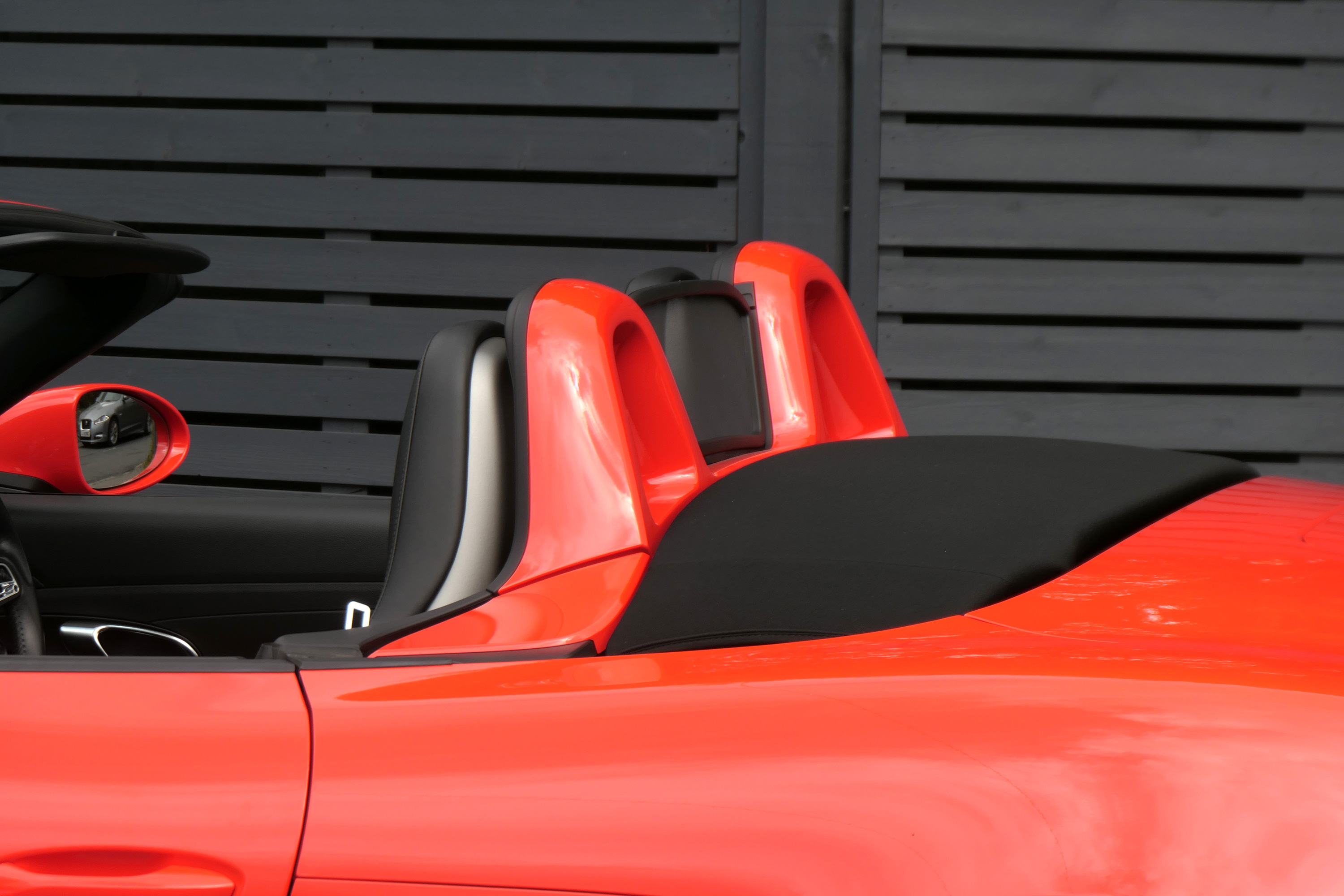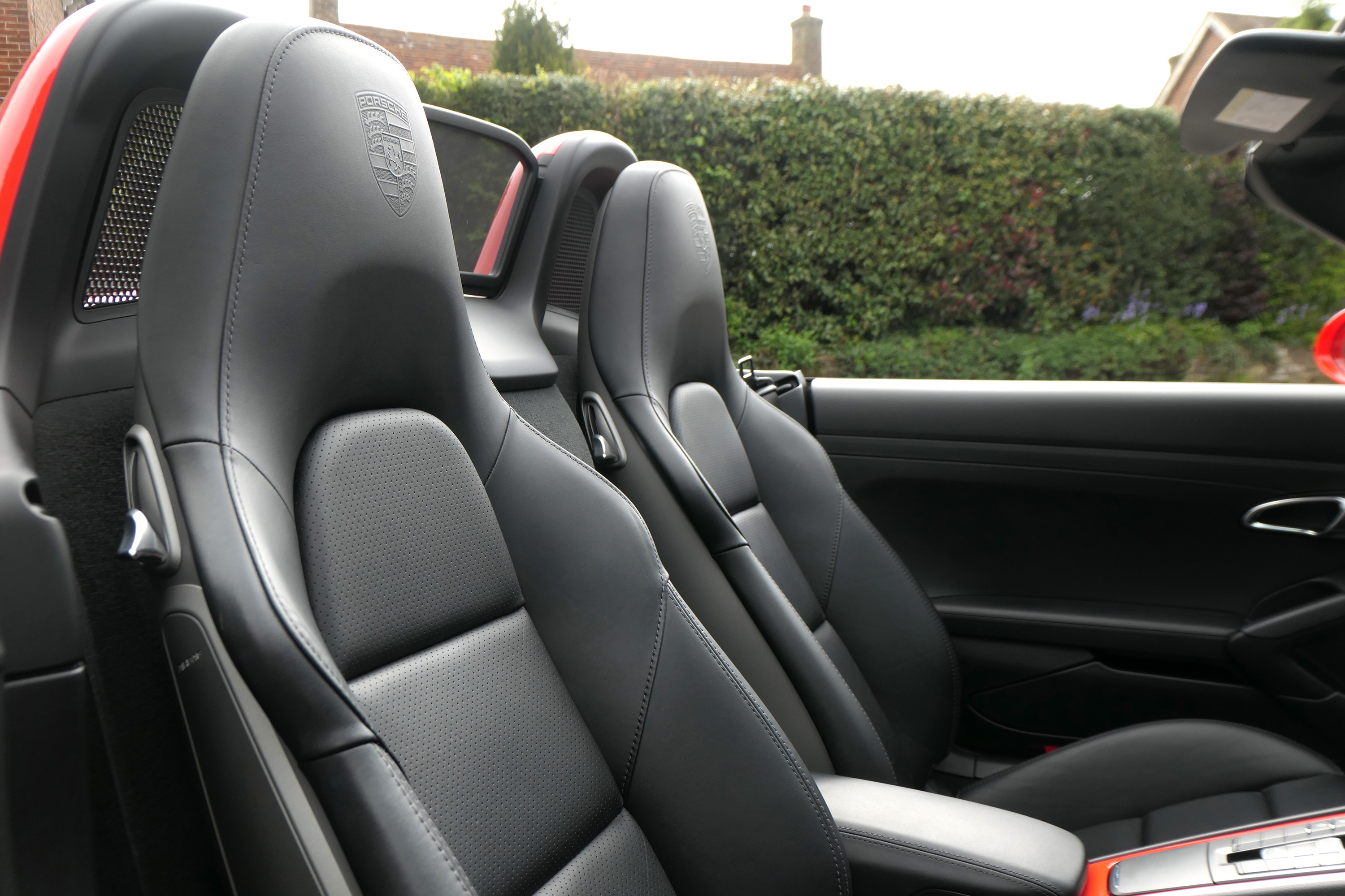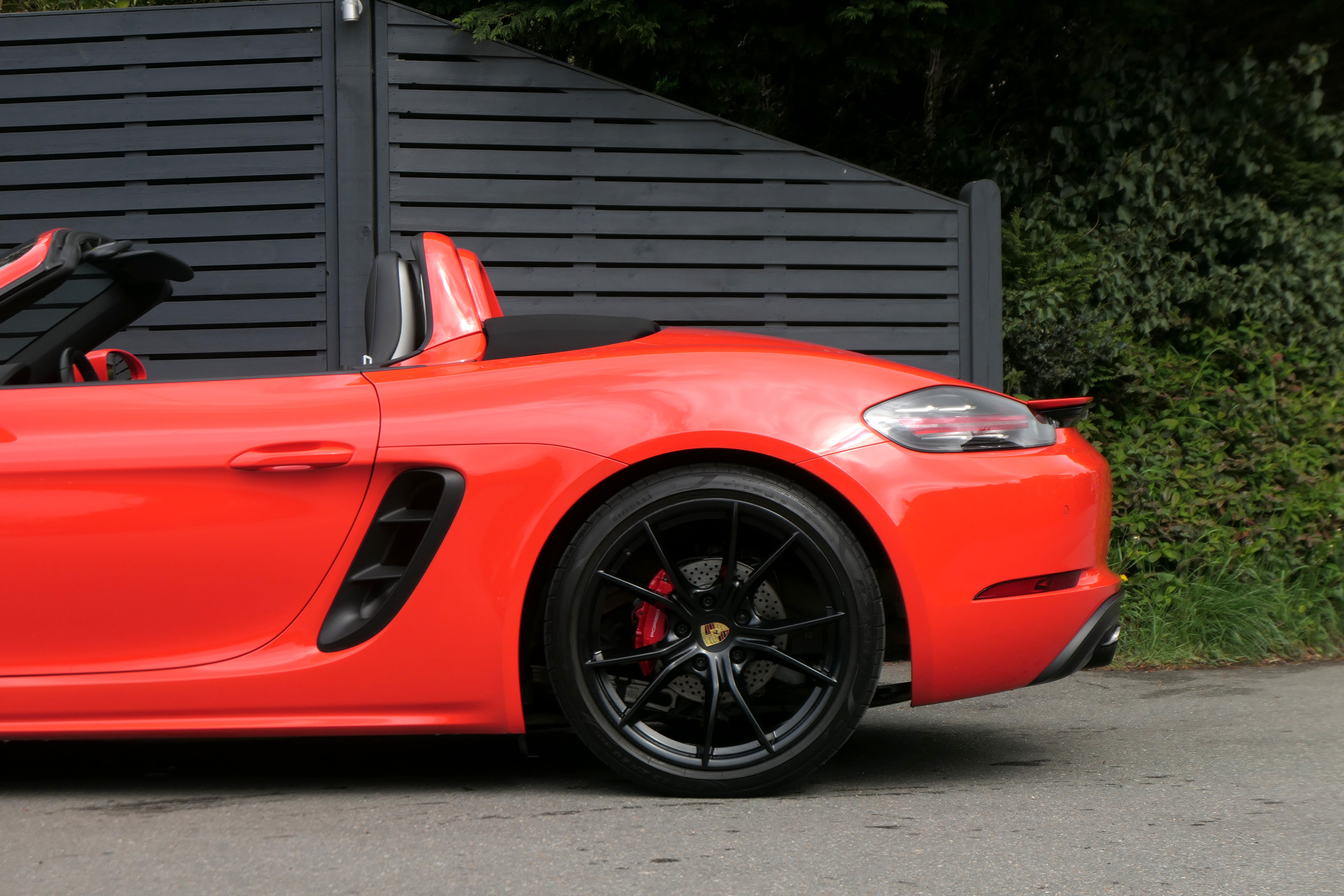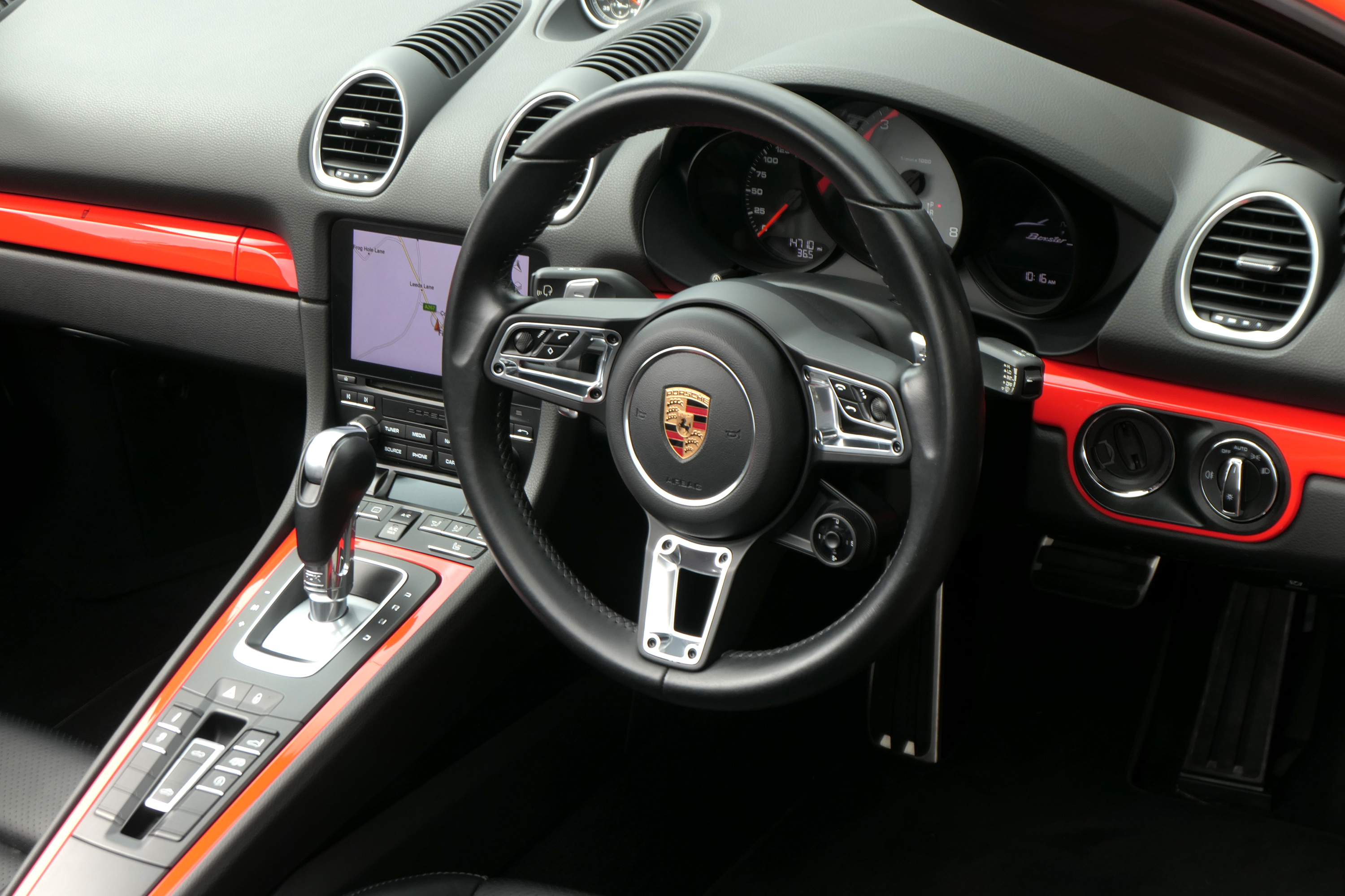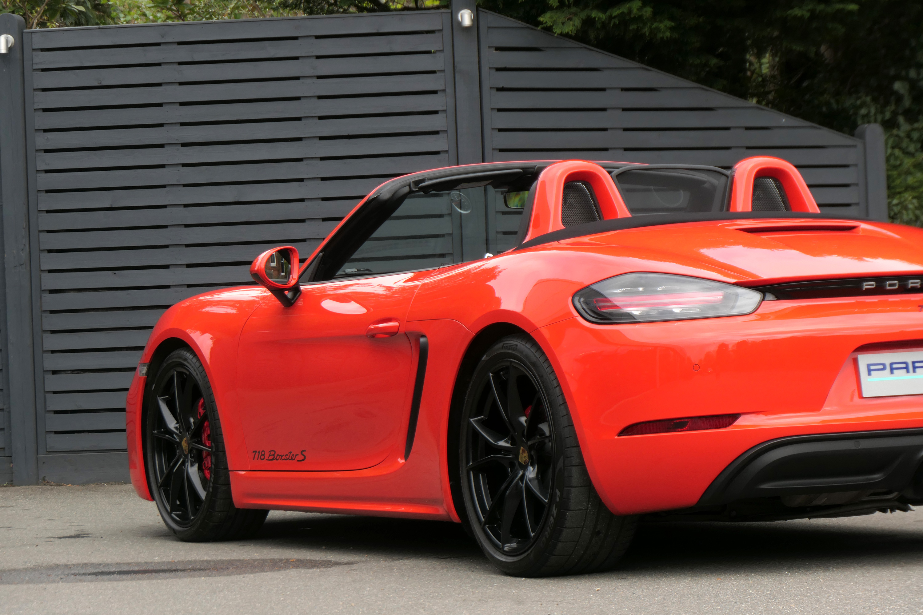 This Boxster S (718) has the 7-speed PDK gearbox and is presented in Lava Orange with black leather seats and a black power hood.