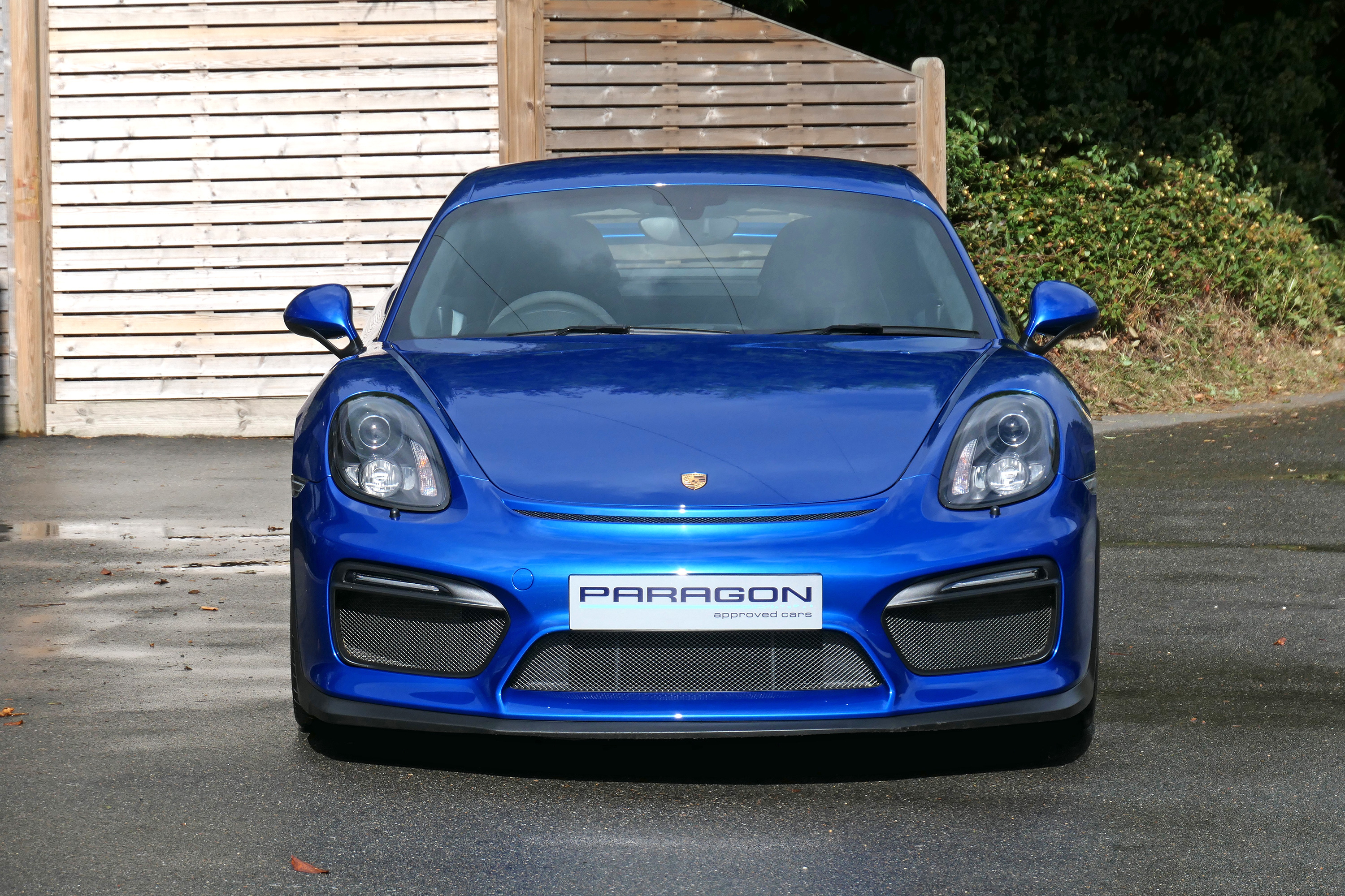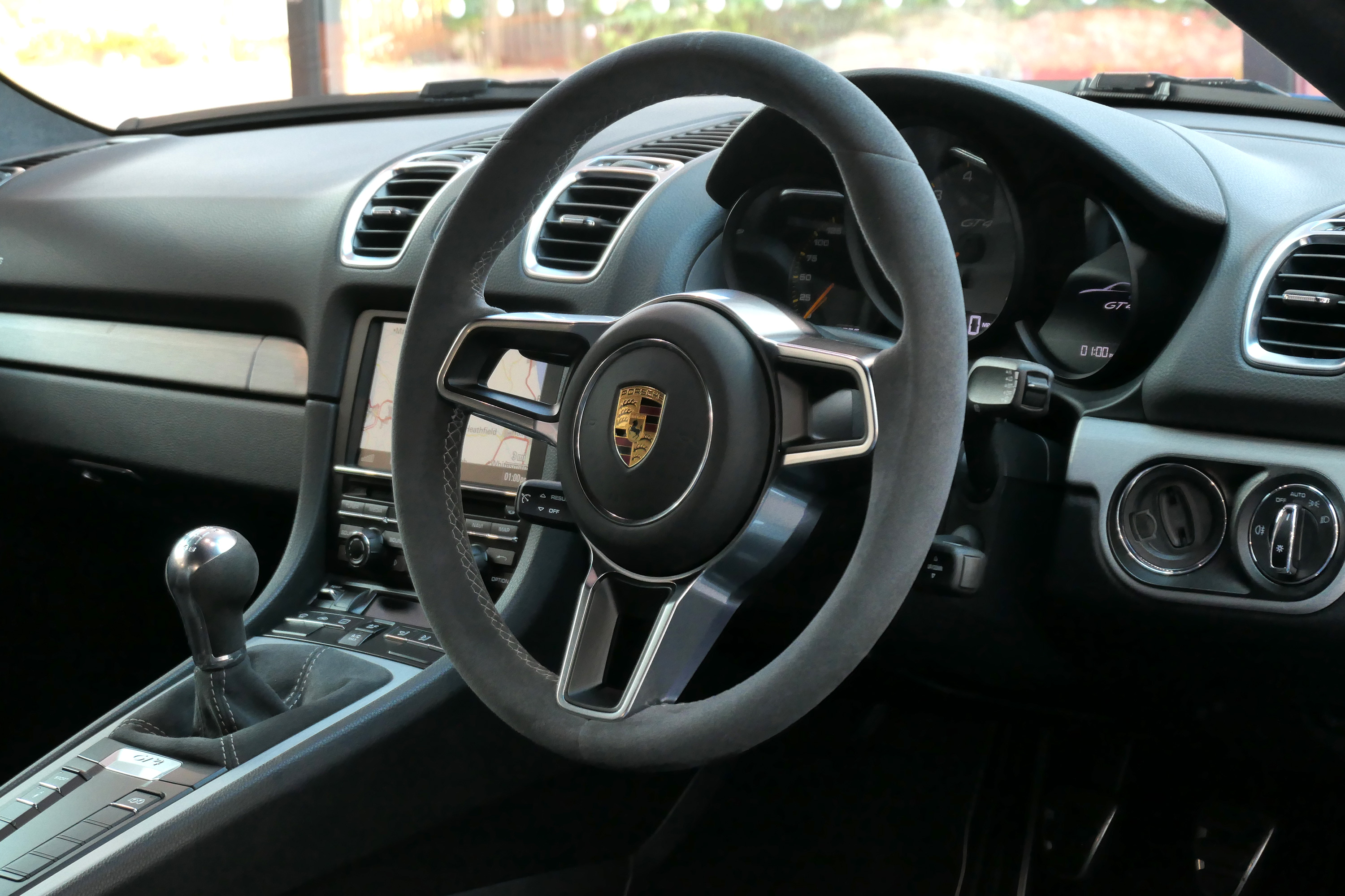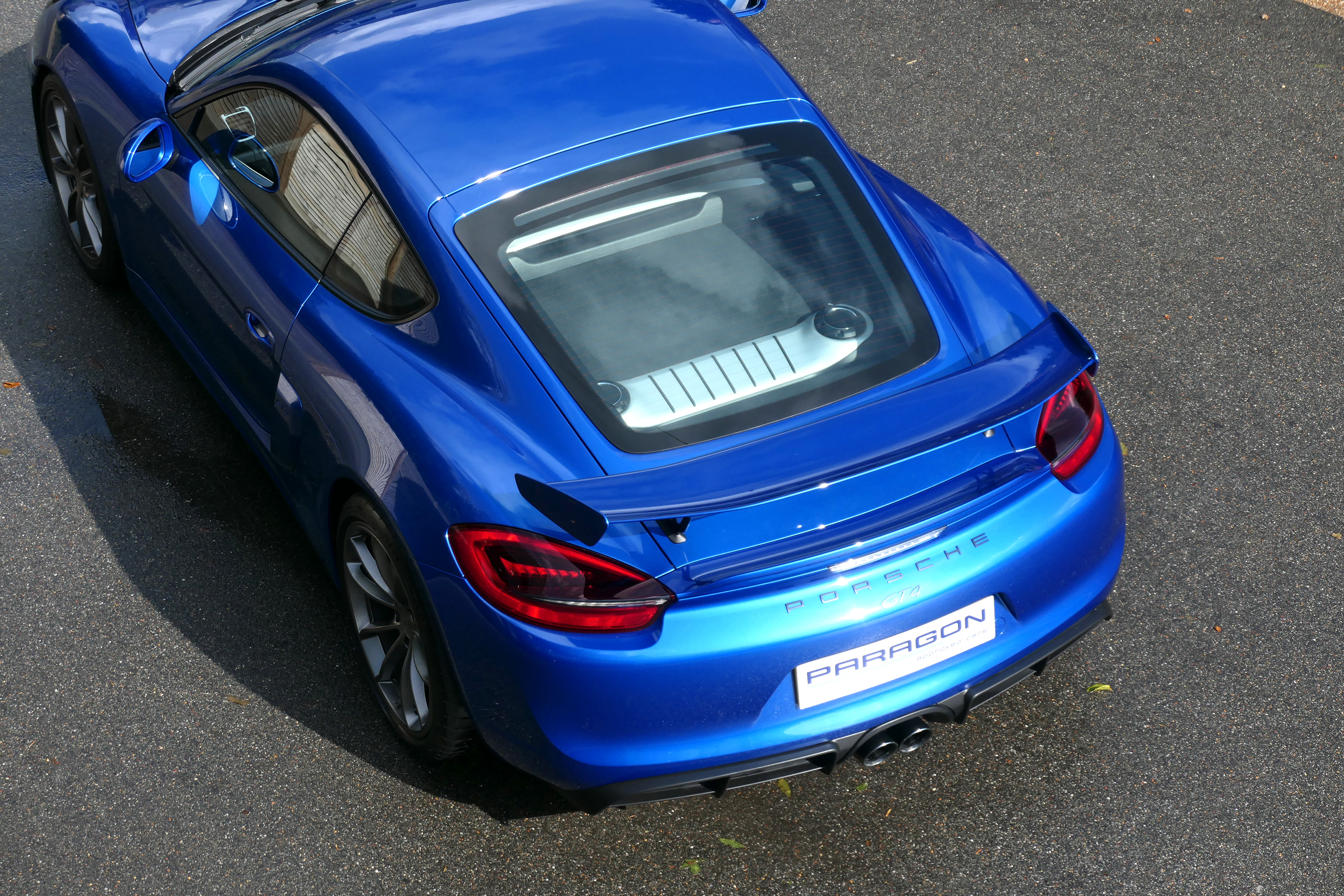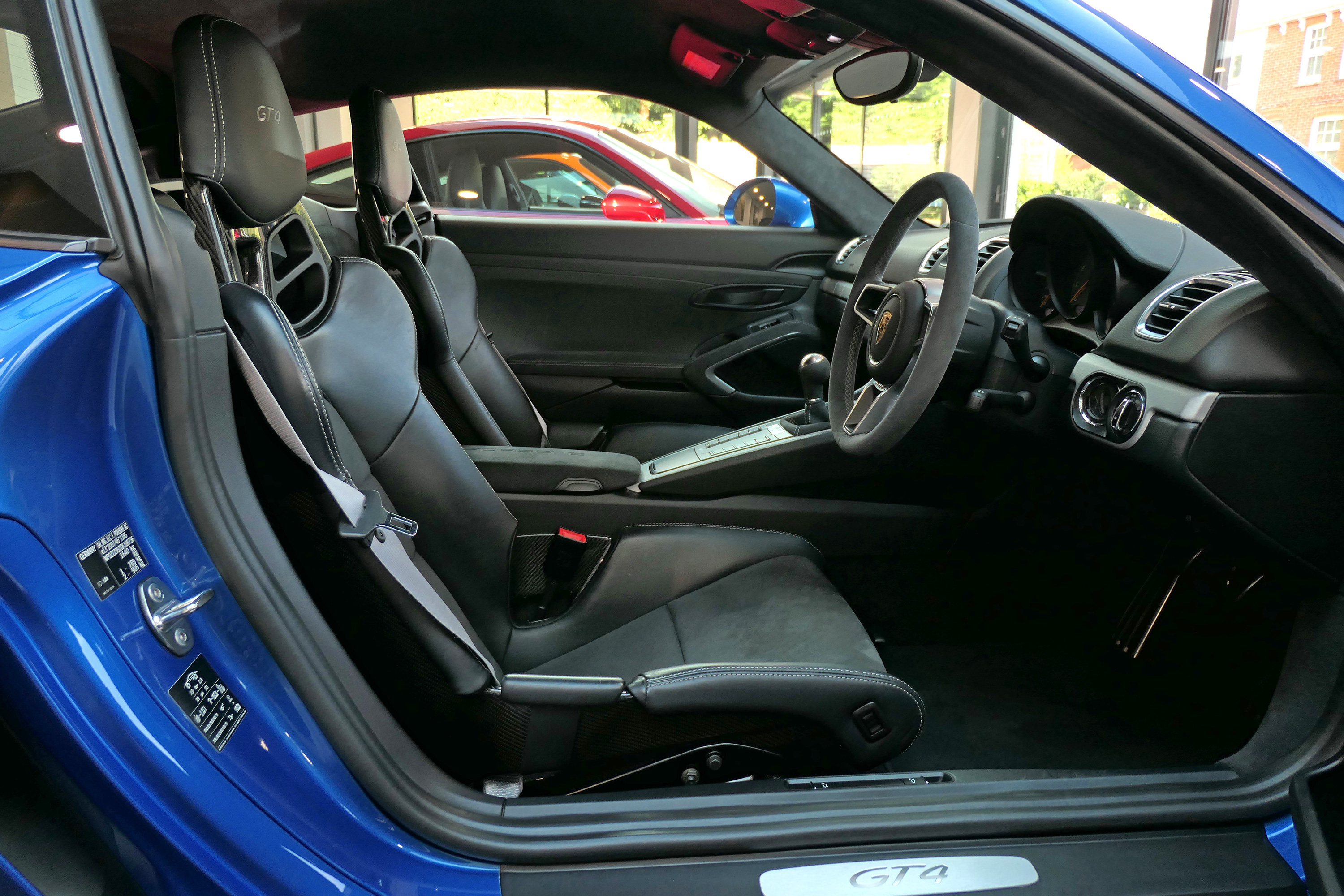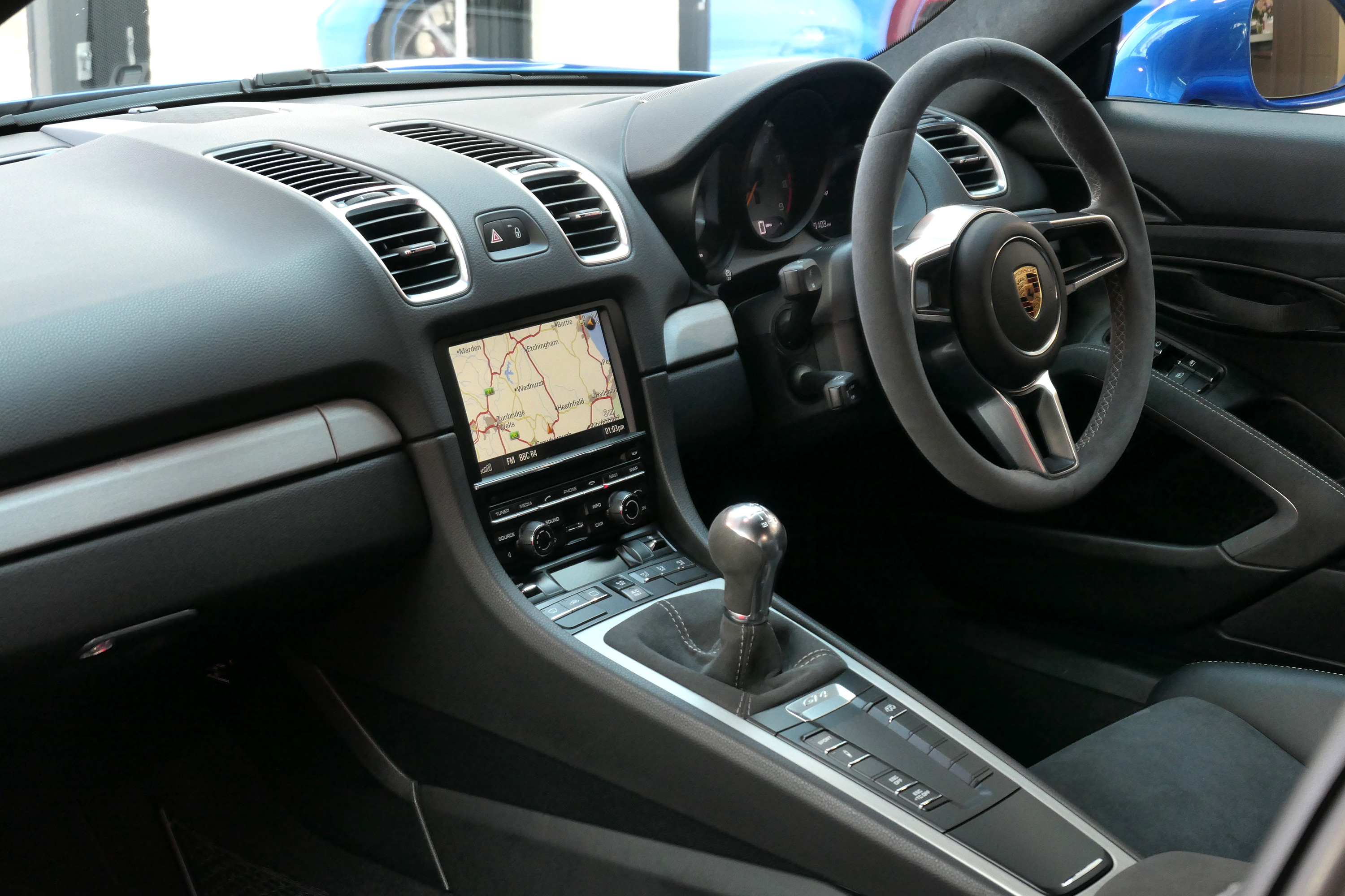 This Cayman GT4 has the 6-speed manual gearbox and is presented in Sapphire Blue with black half leather 918 bucket seats.
