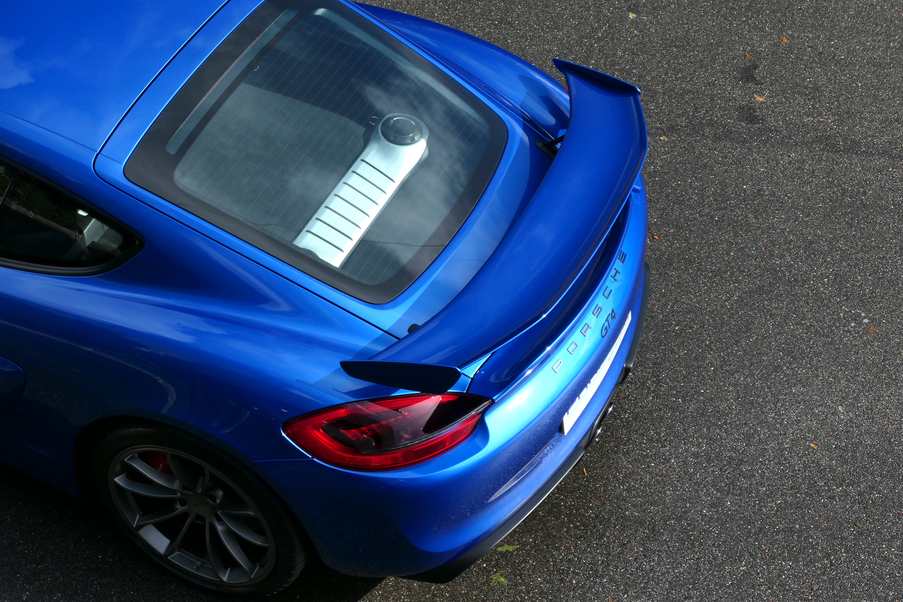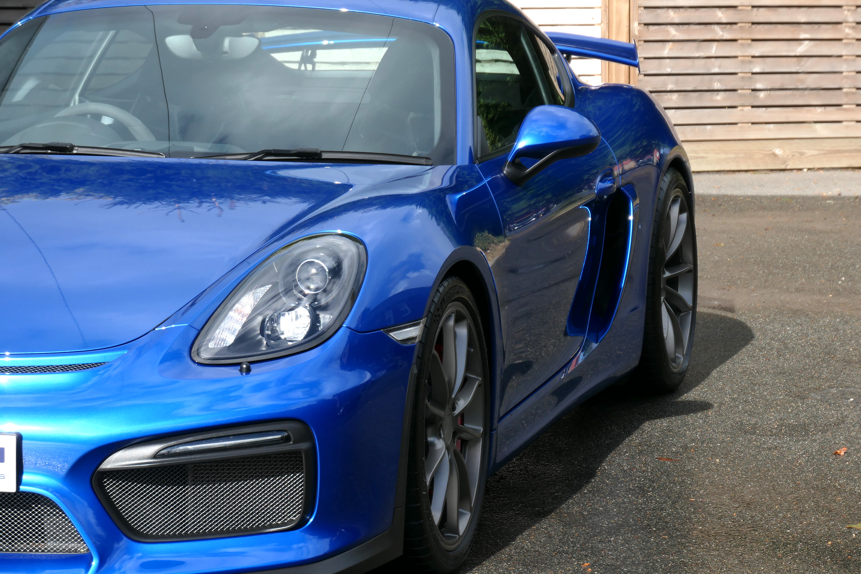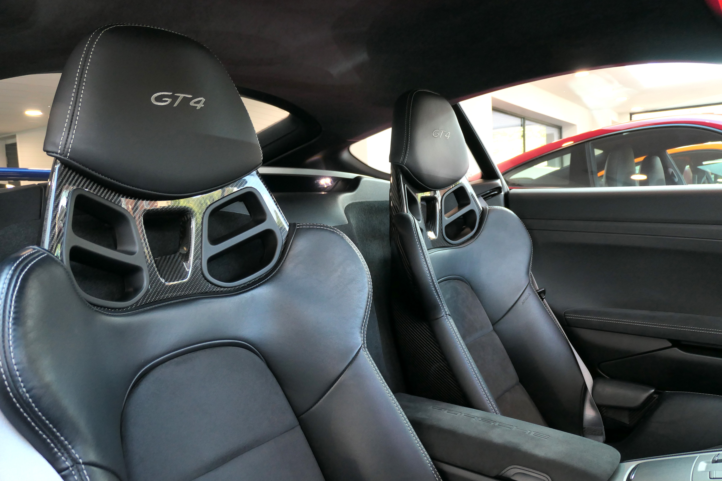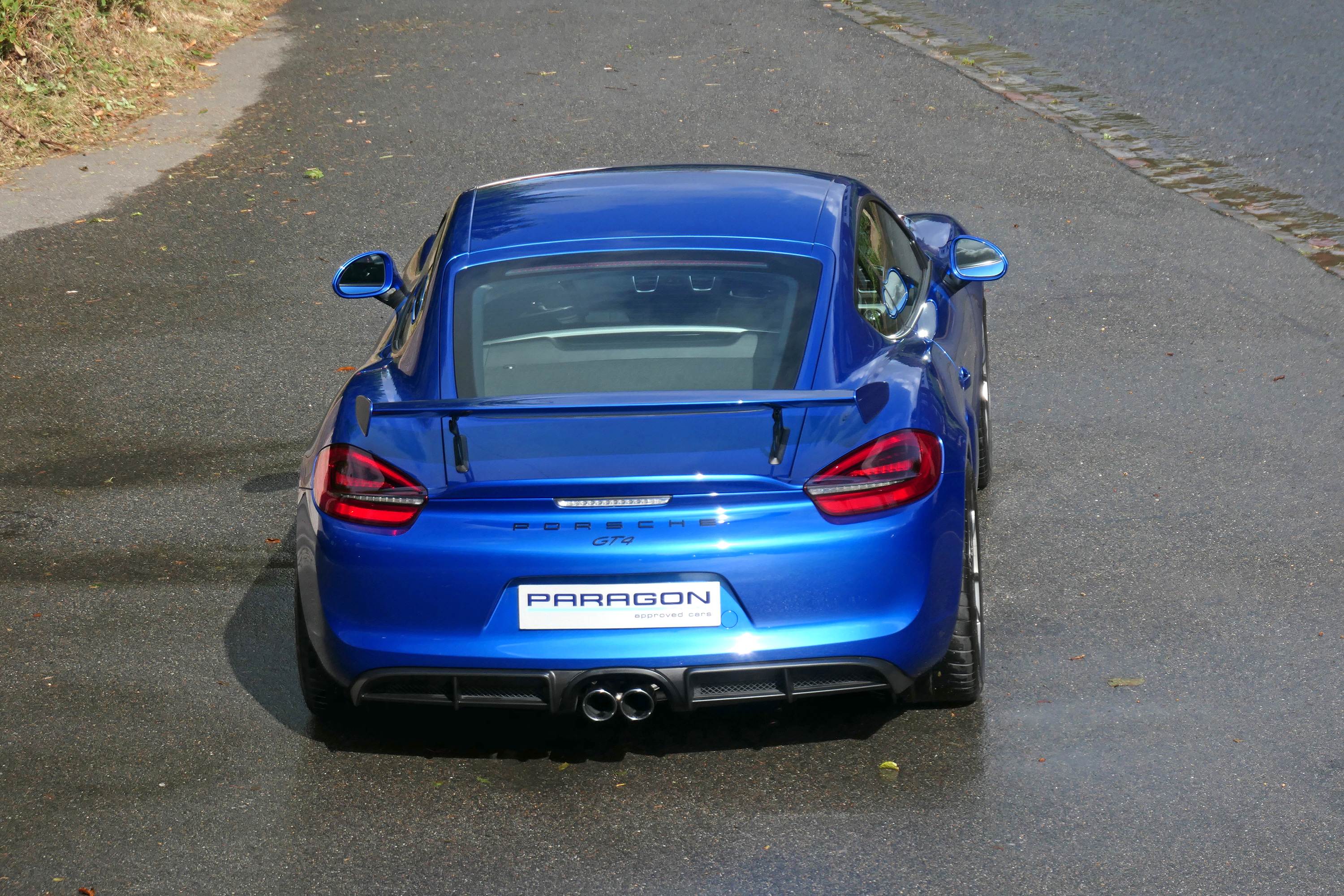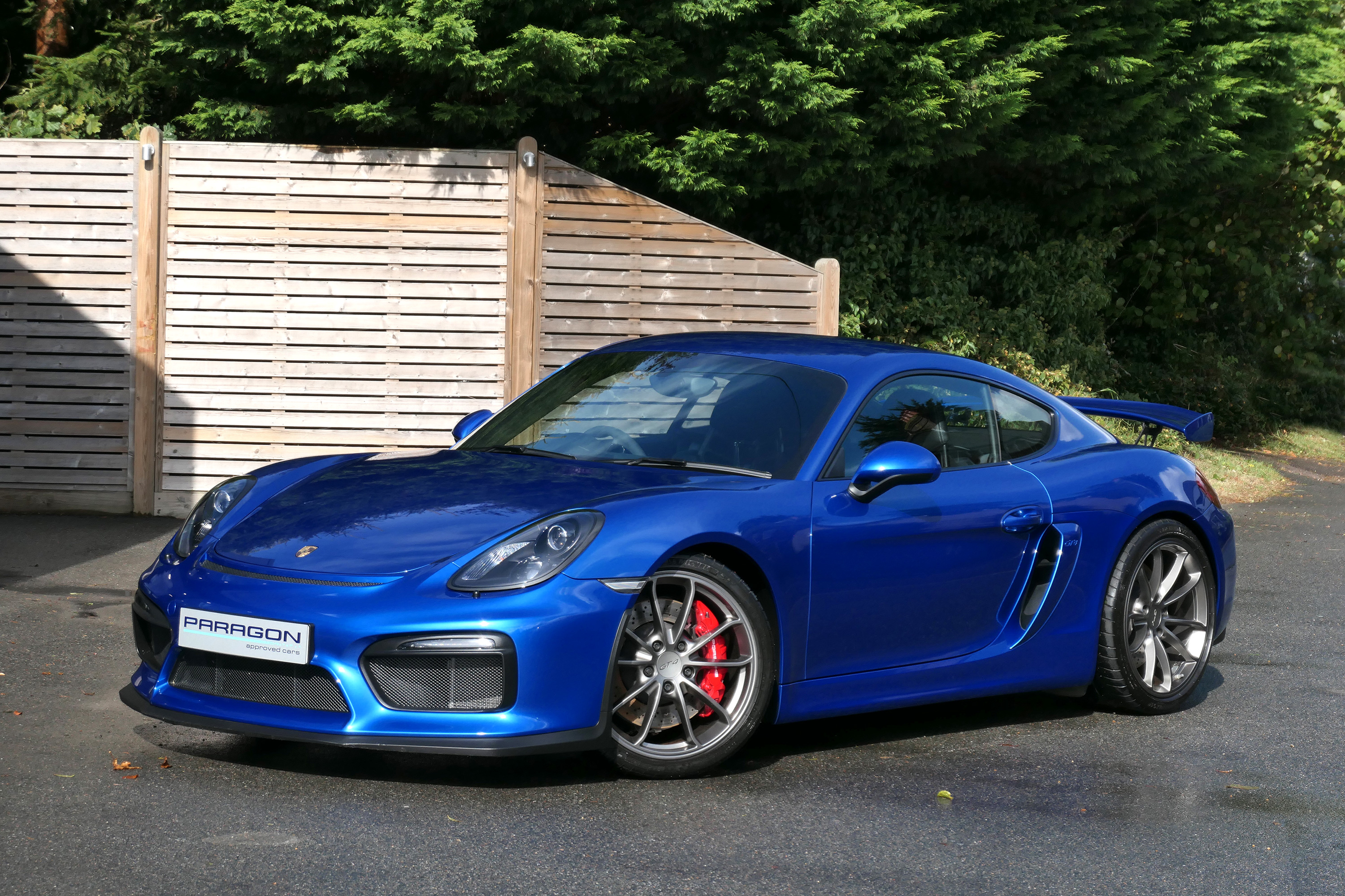 This Cayman GT4 has the 6-speed manual gearbox and is presented in Sapphire Blue with black half leather 918 bucket seats.