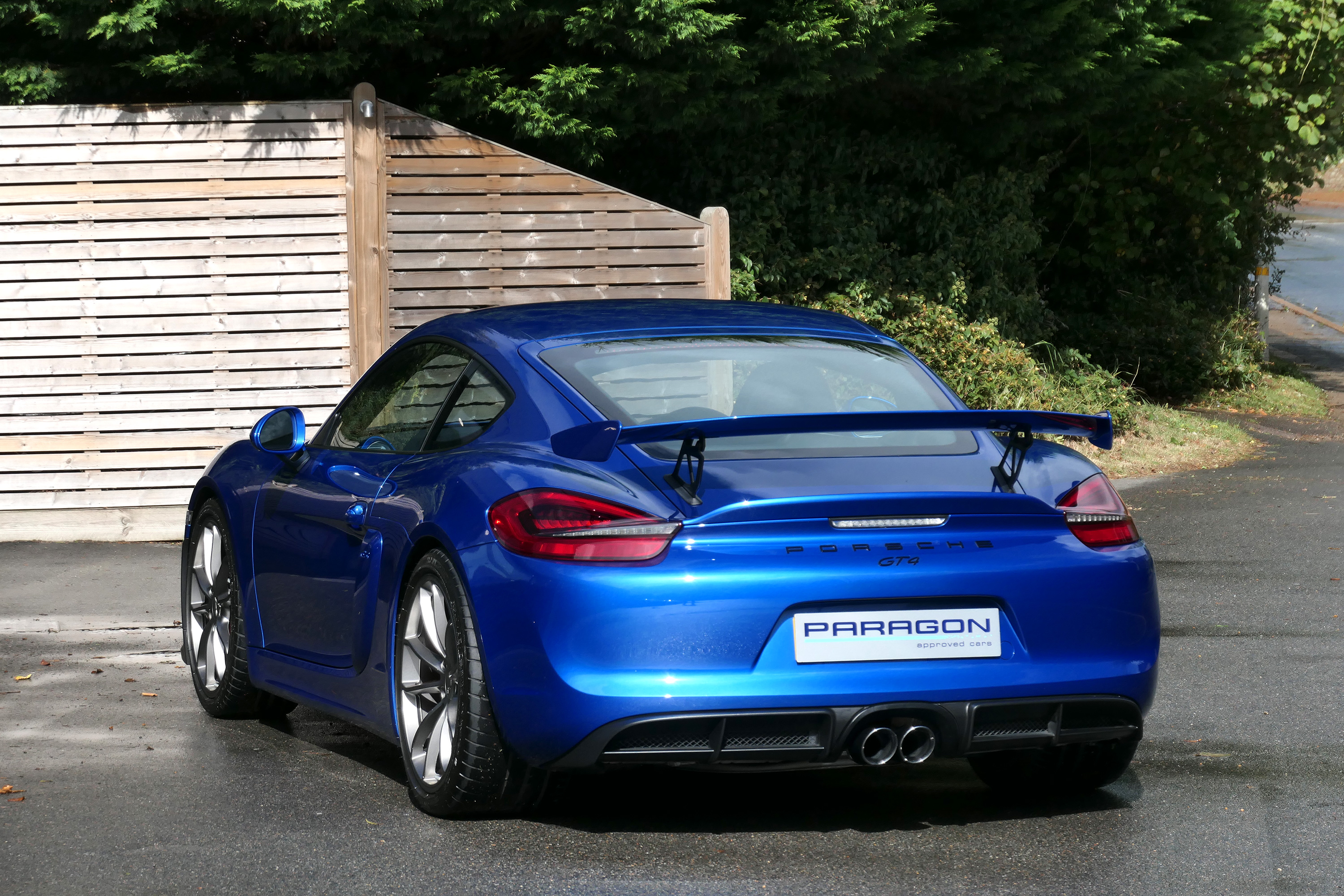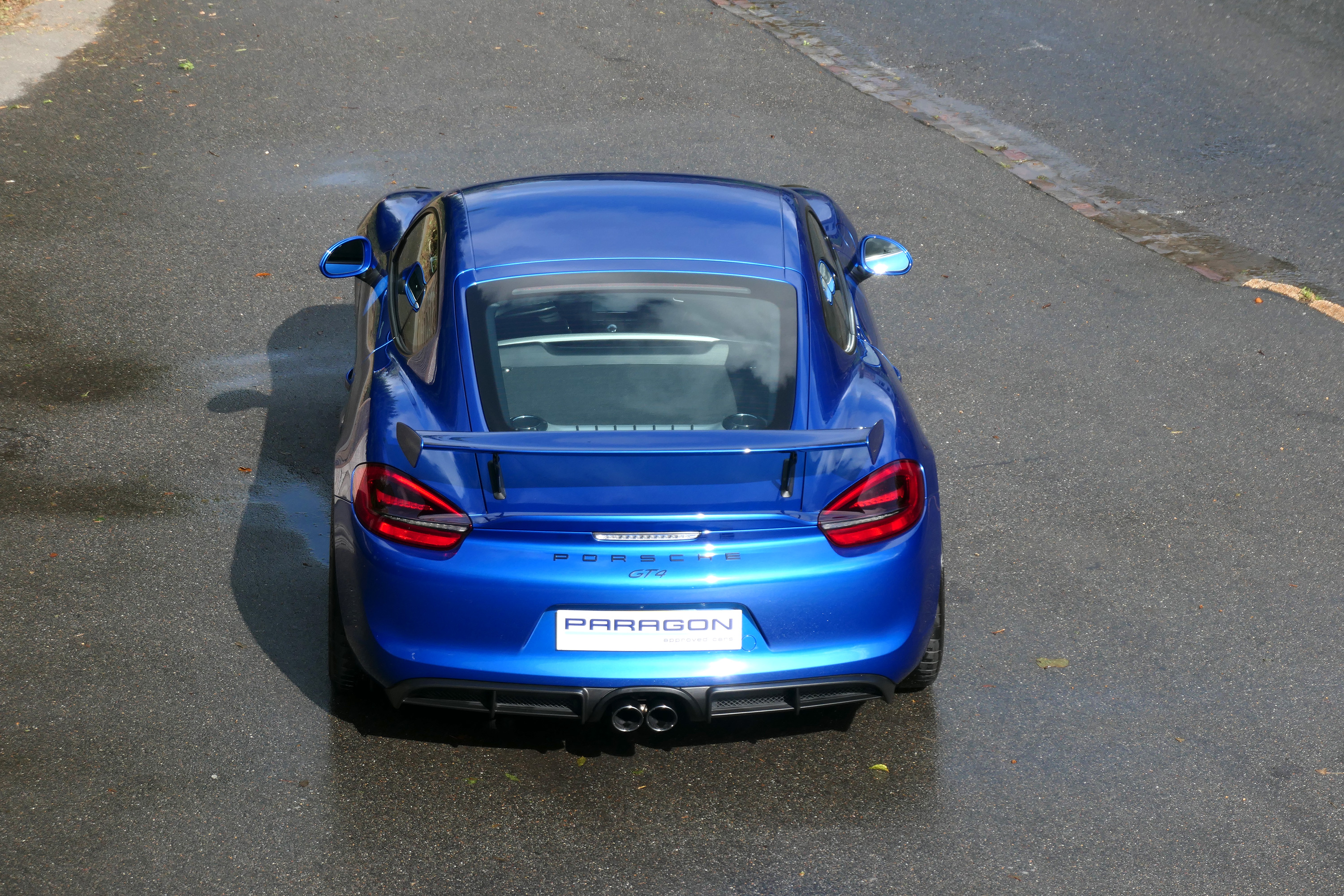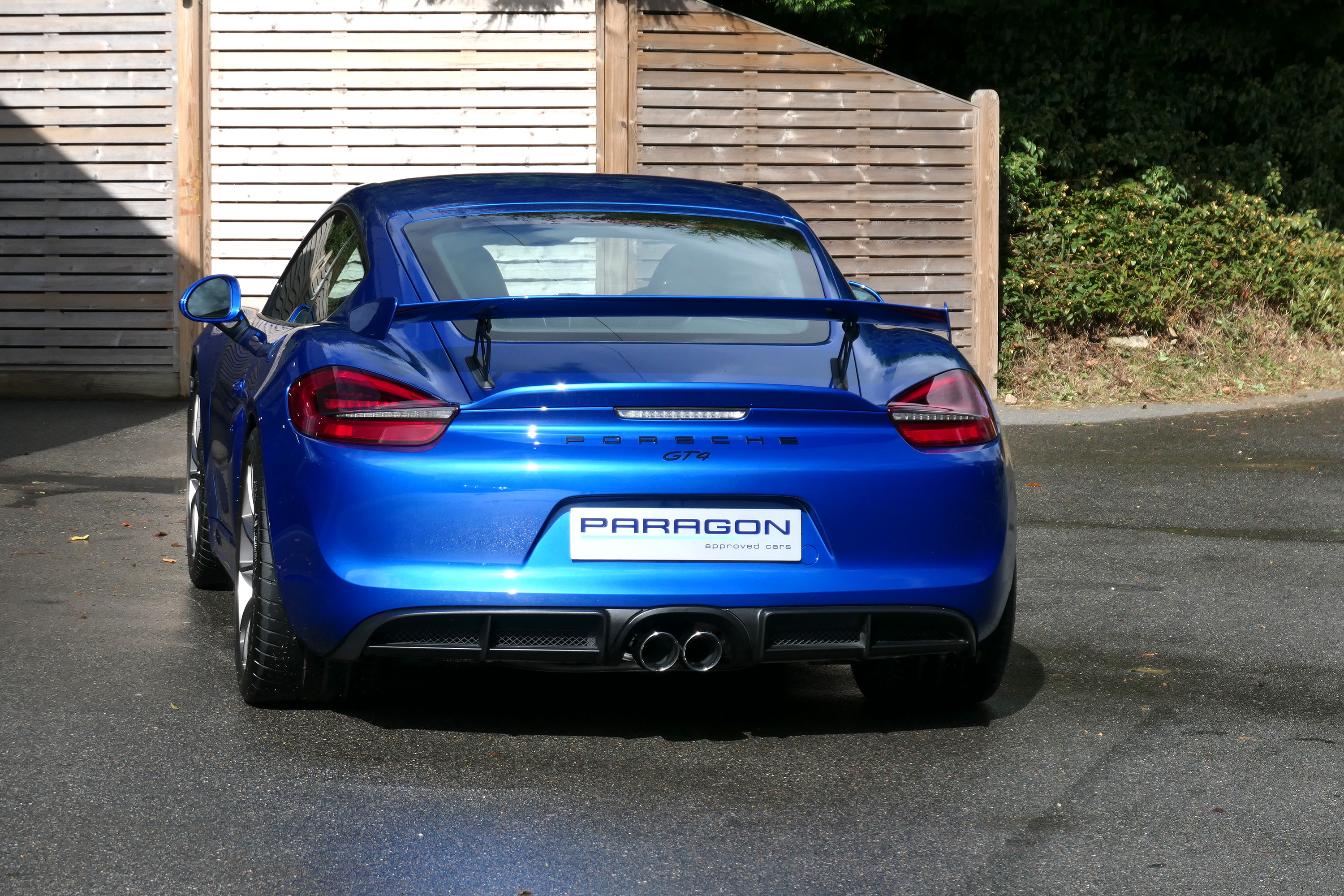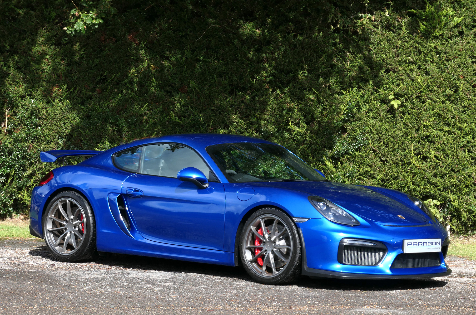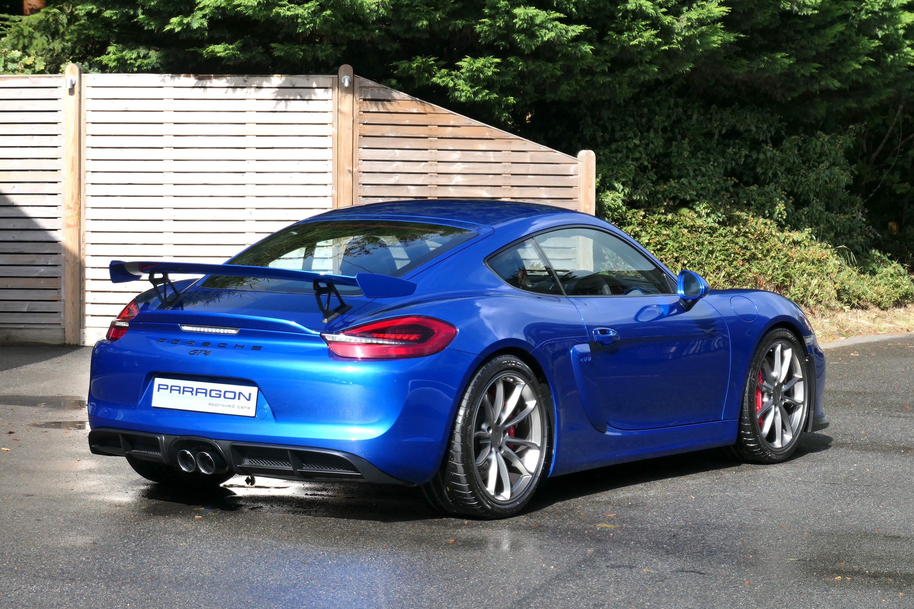 This Cayman GT4 has the 6-speed manual gearbox and is presented in Sapphire Blue with black half leather 918 bucket seats.