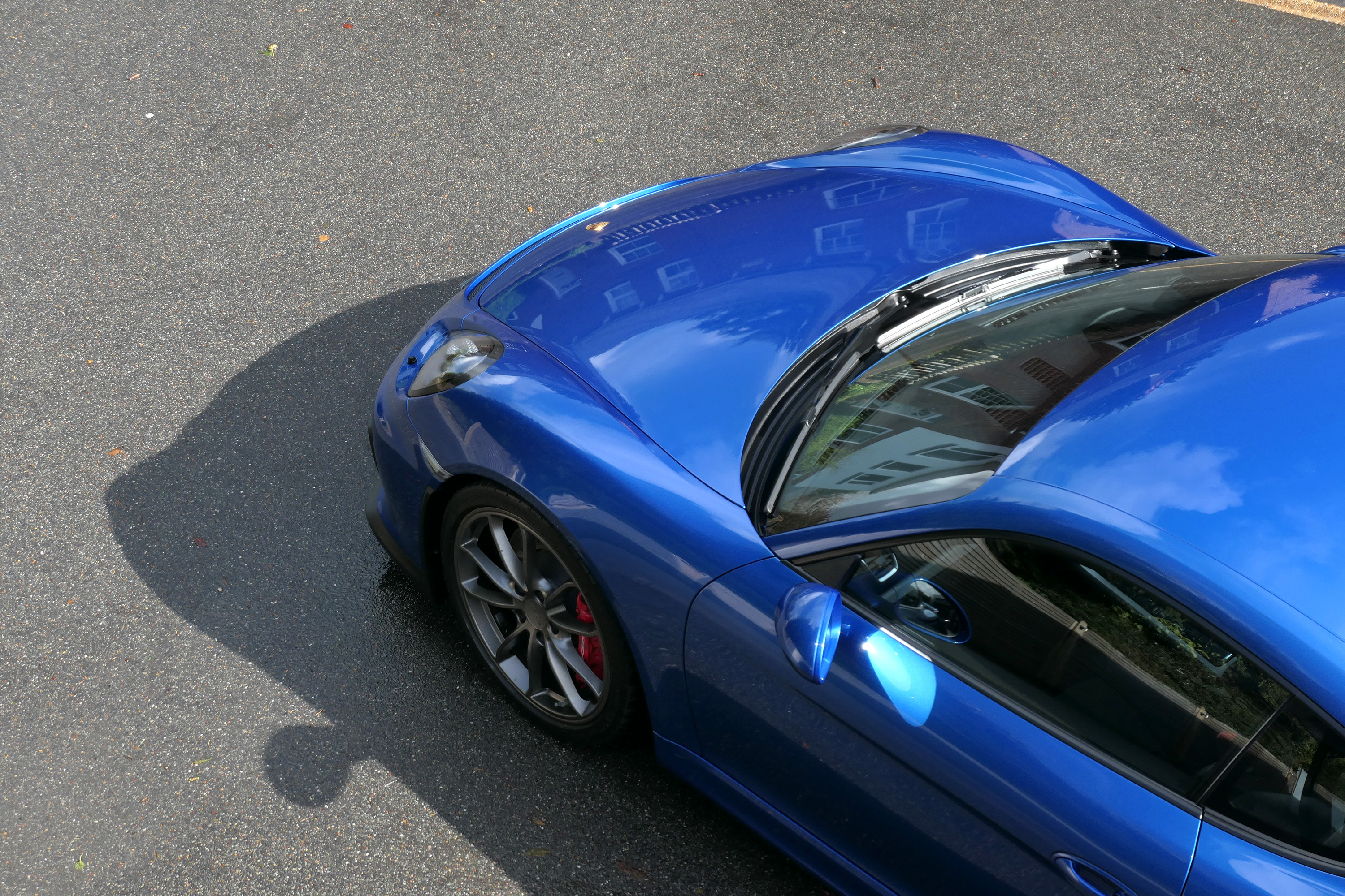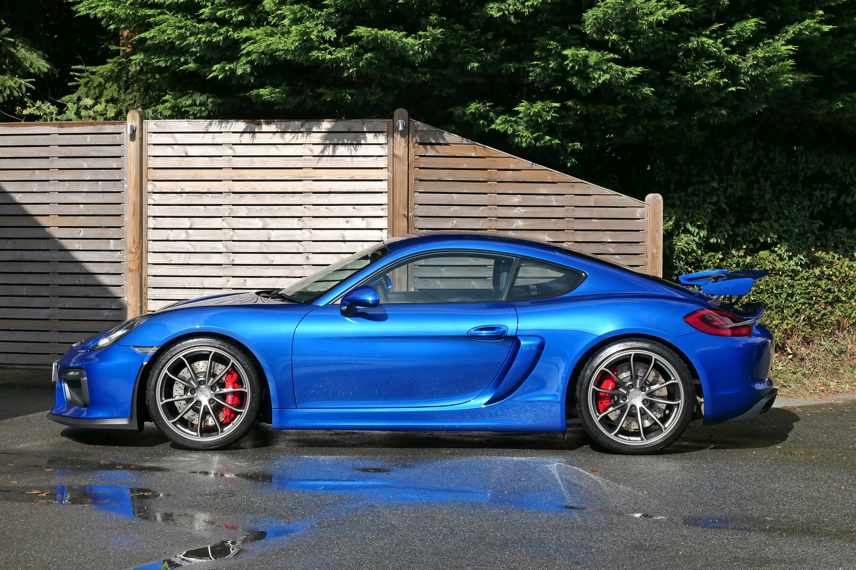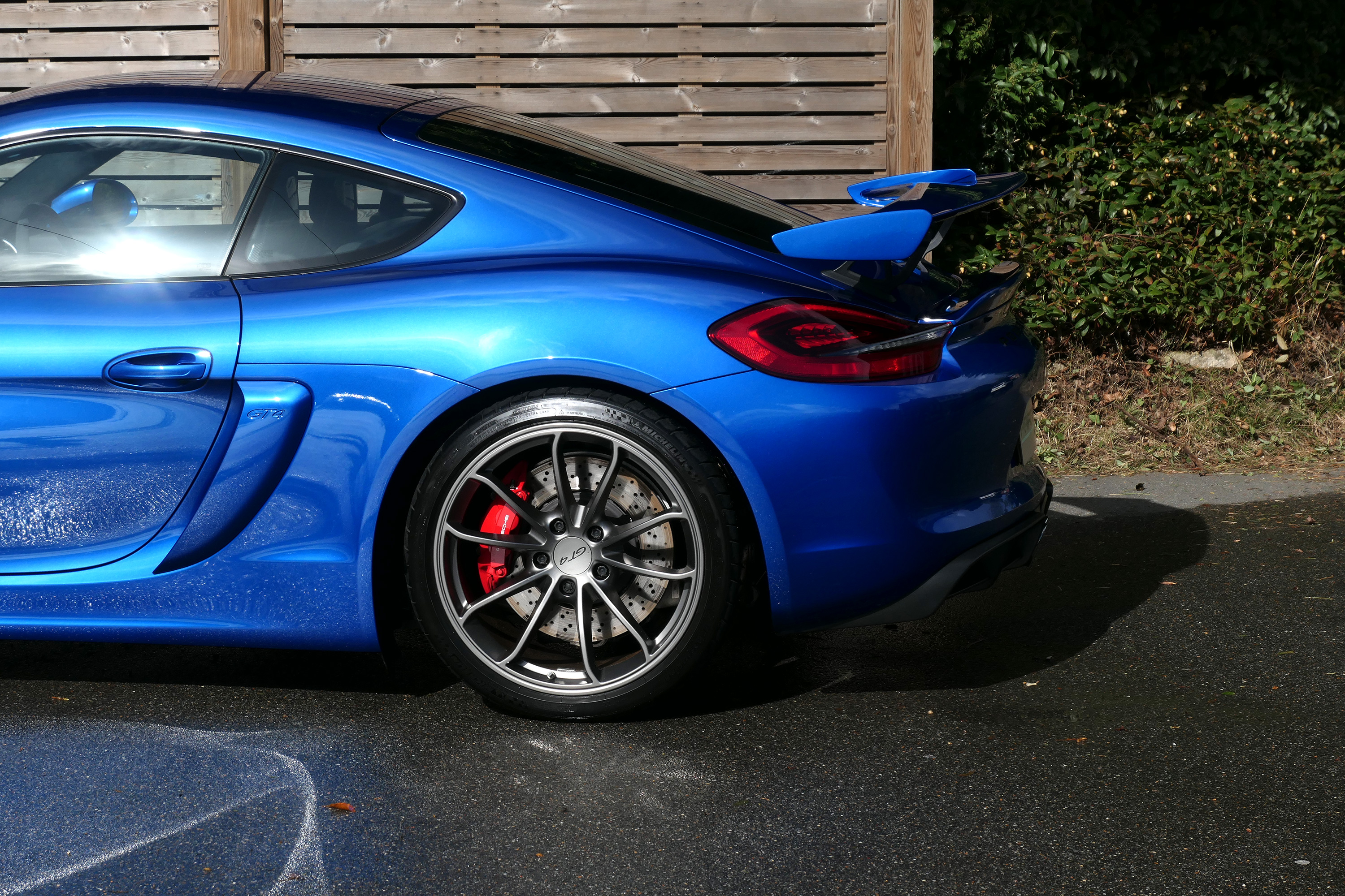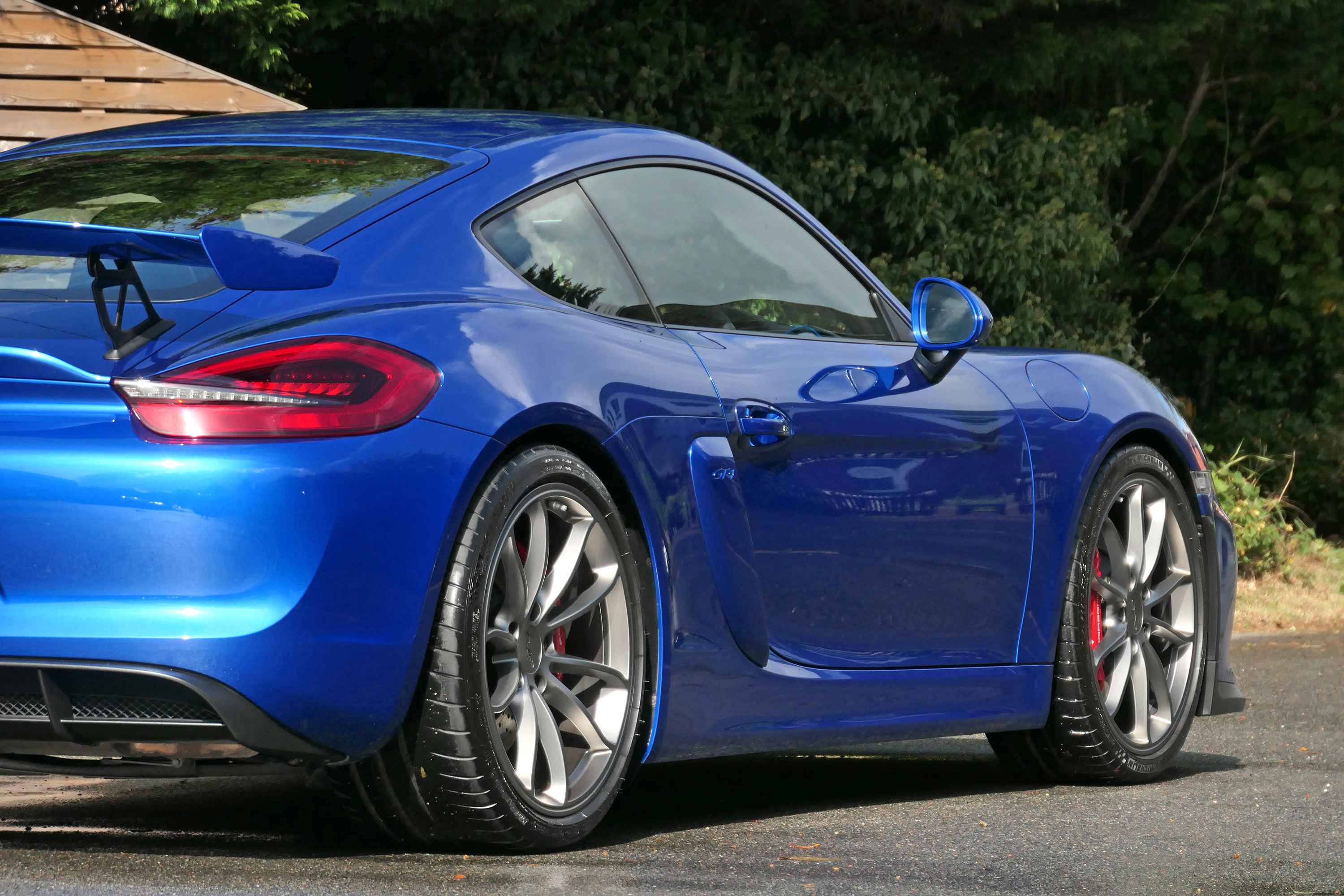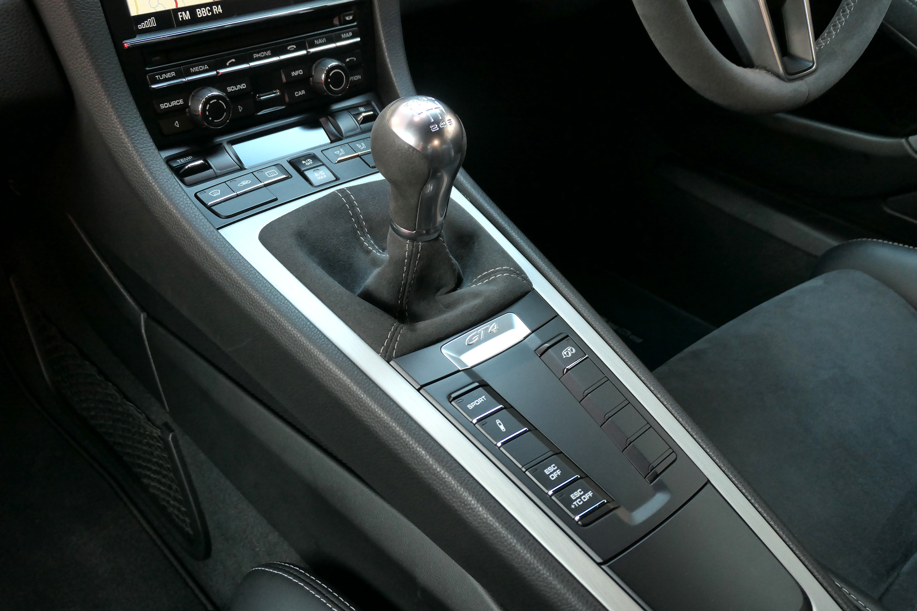 This Cayman GT4 has the 6-speed manual gearbox and is presented in Sapphire Blue with black half leather 918 bucket seats.