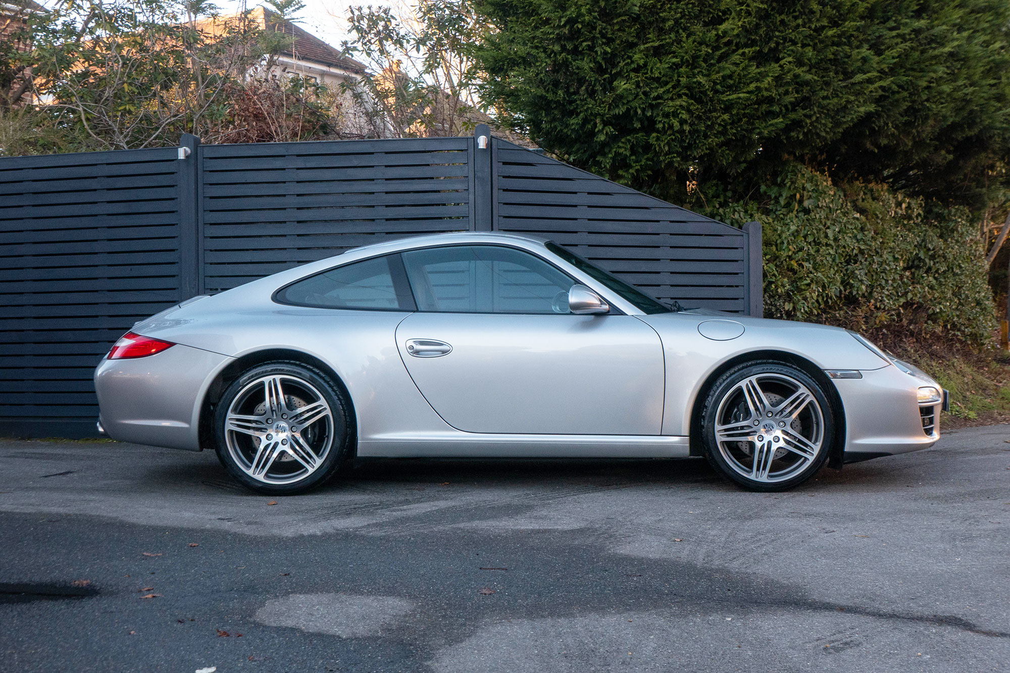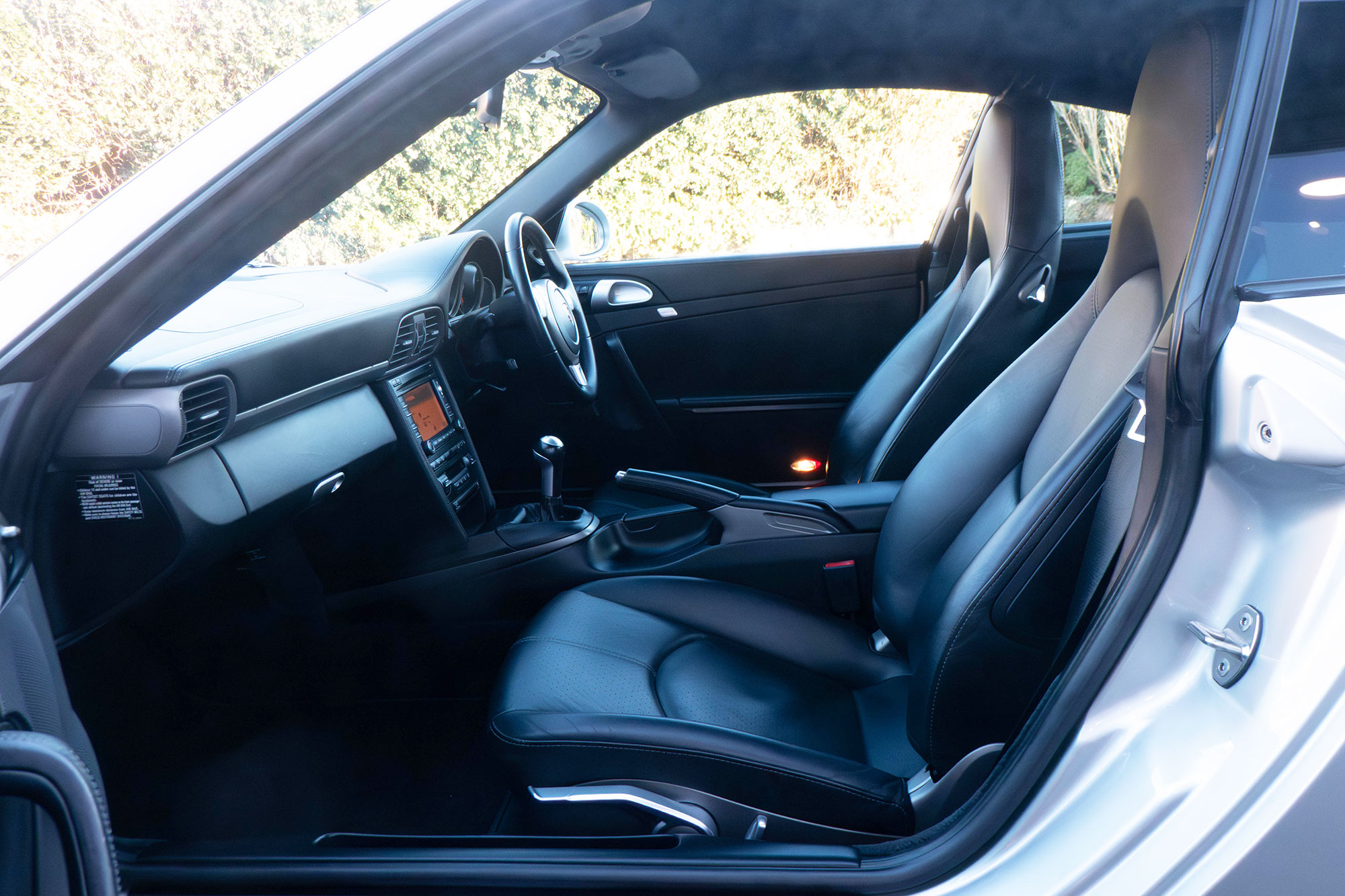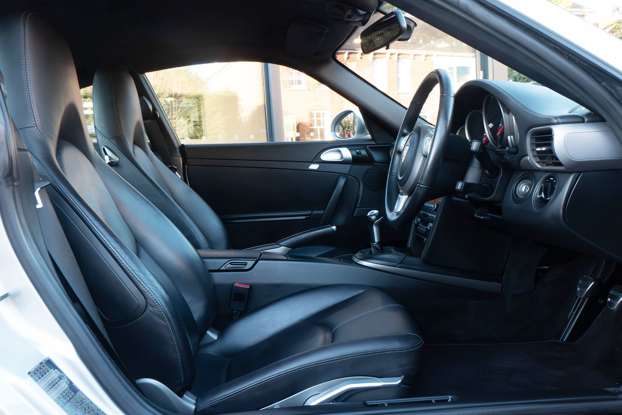 This 911 Carrera 2 Coupe (997.2) has the 6-speed manual gearbox and is presented in Arctic Silver with black leather seats.