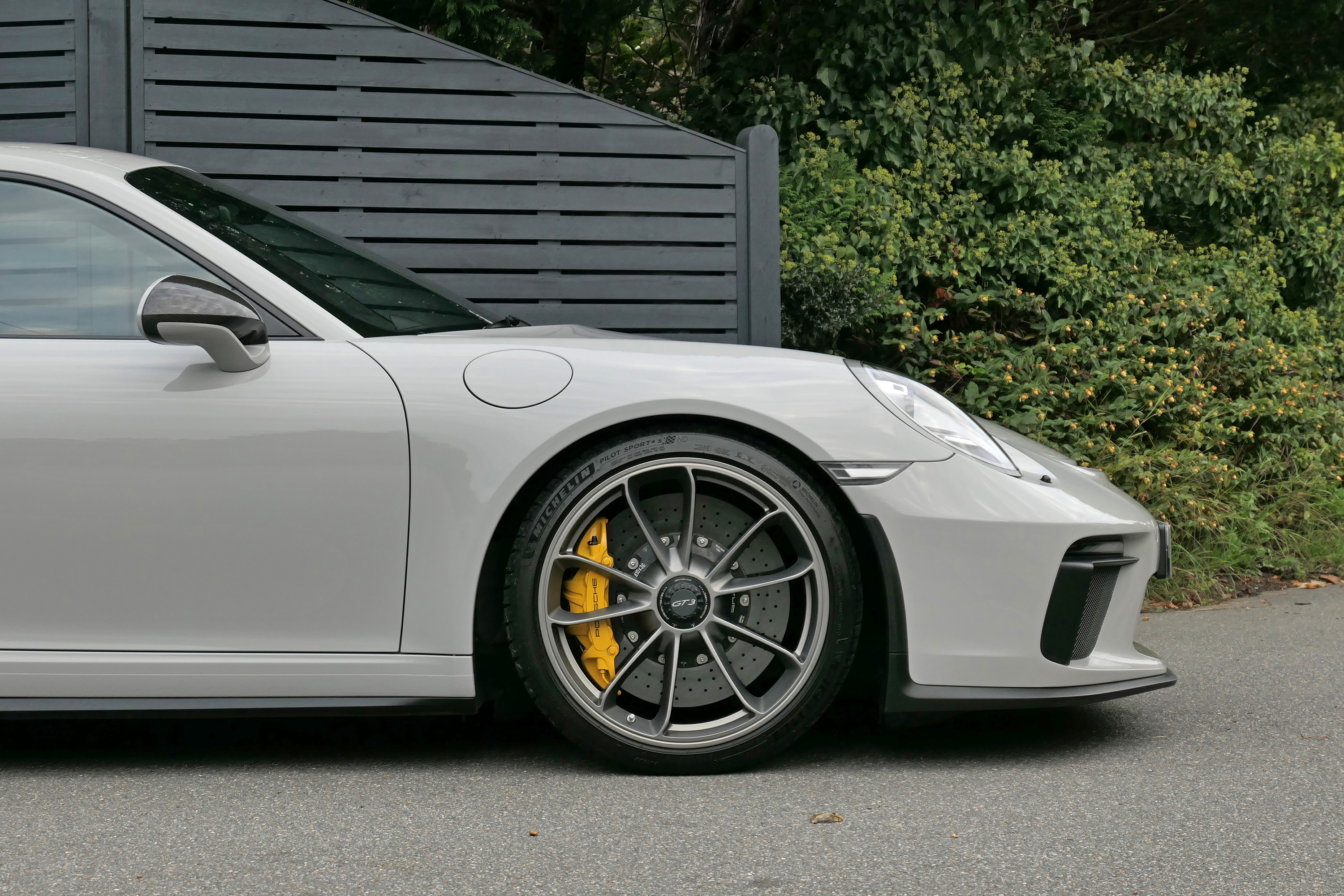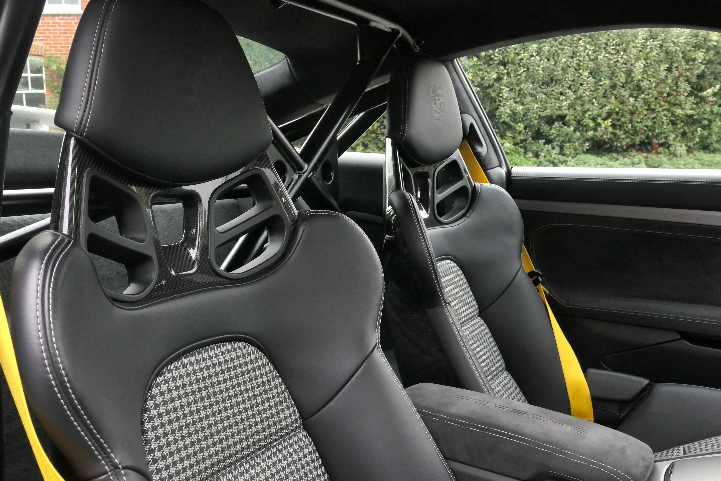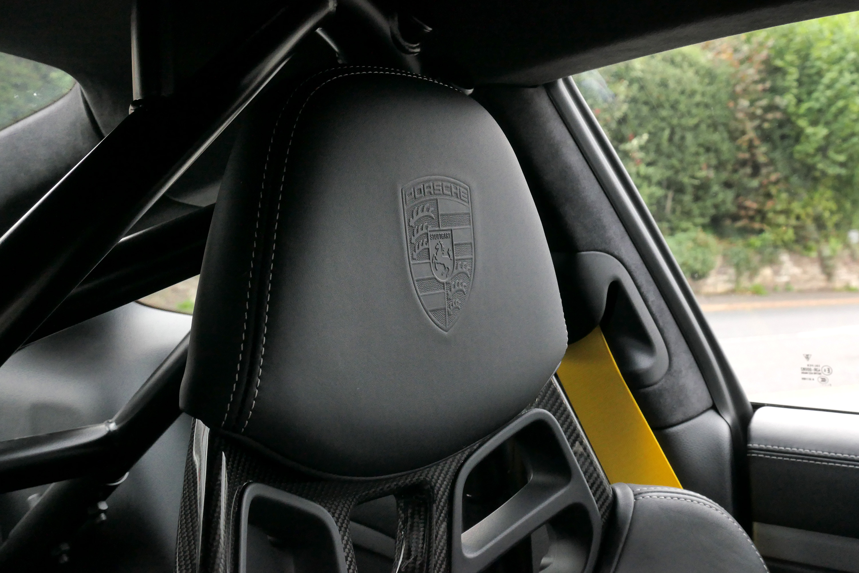 Factory-fitted options include Porsche Ceramic Composite Brakes, the Black Leather Interior Pack, Sport Design mirrors with carbon upper sections, the fuel filler cap in aluminium, the Clubsport pack, front axle lift, the Sport Chrono Pack with lap trigger, the 12 o'clock marking in red, 918 bucket seats with Porsche Exclusive Manufaktur houndstooth seat inserts, the chrono clock finished in white, Racing Yellow seat belts, the sun visors in Alcantara, the storage compartment lid in Alcantara and the Brushed Aluminium Interior Pack.