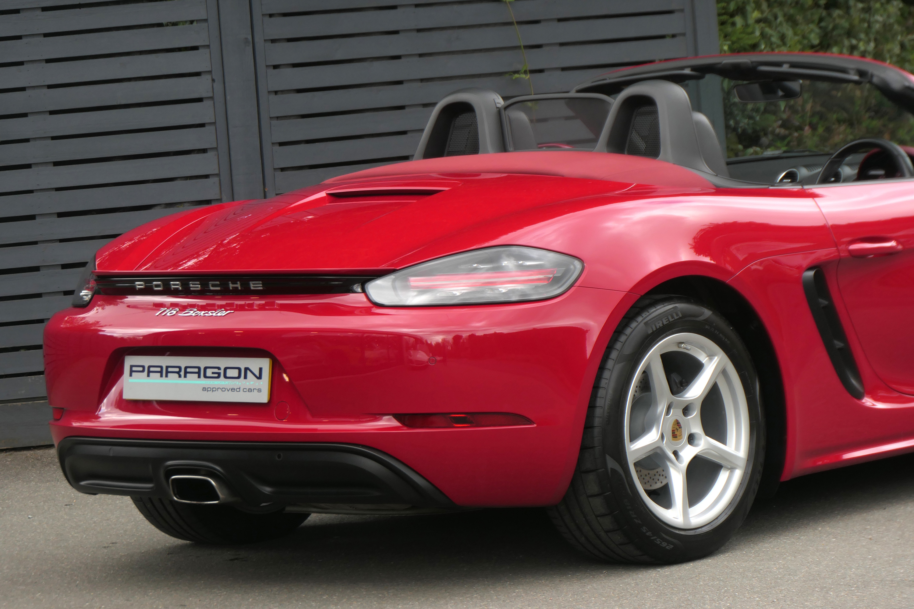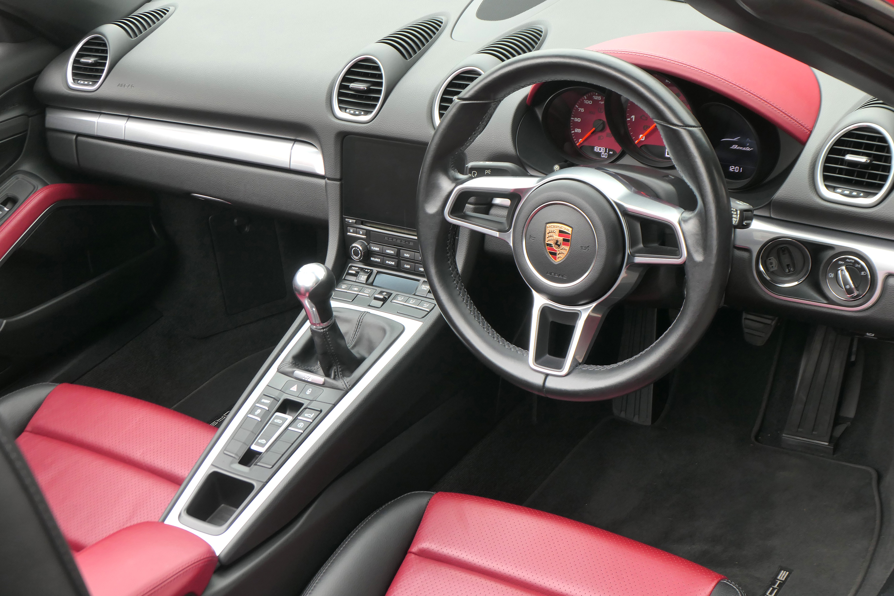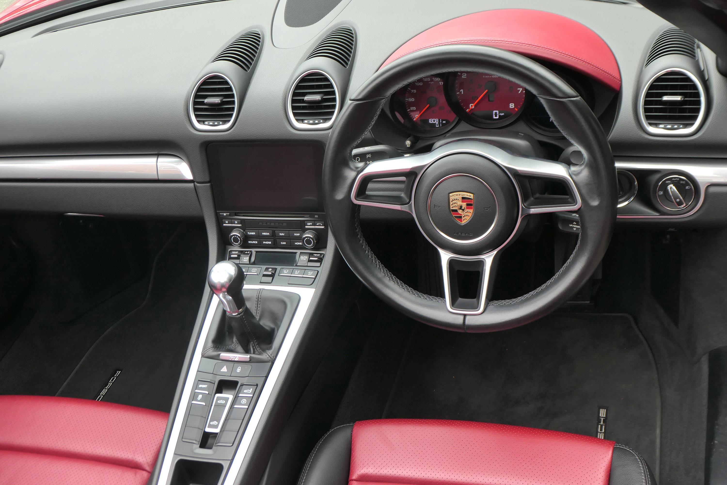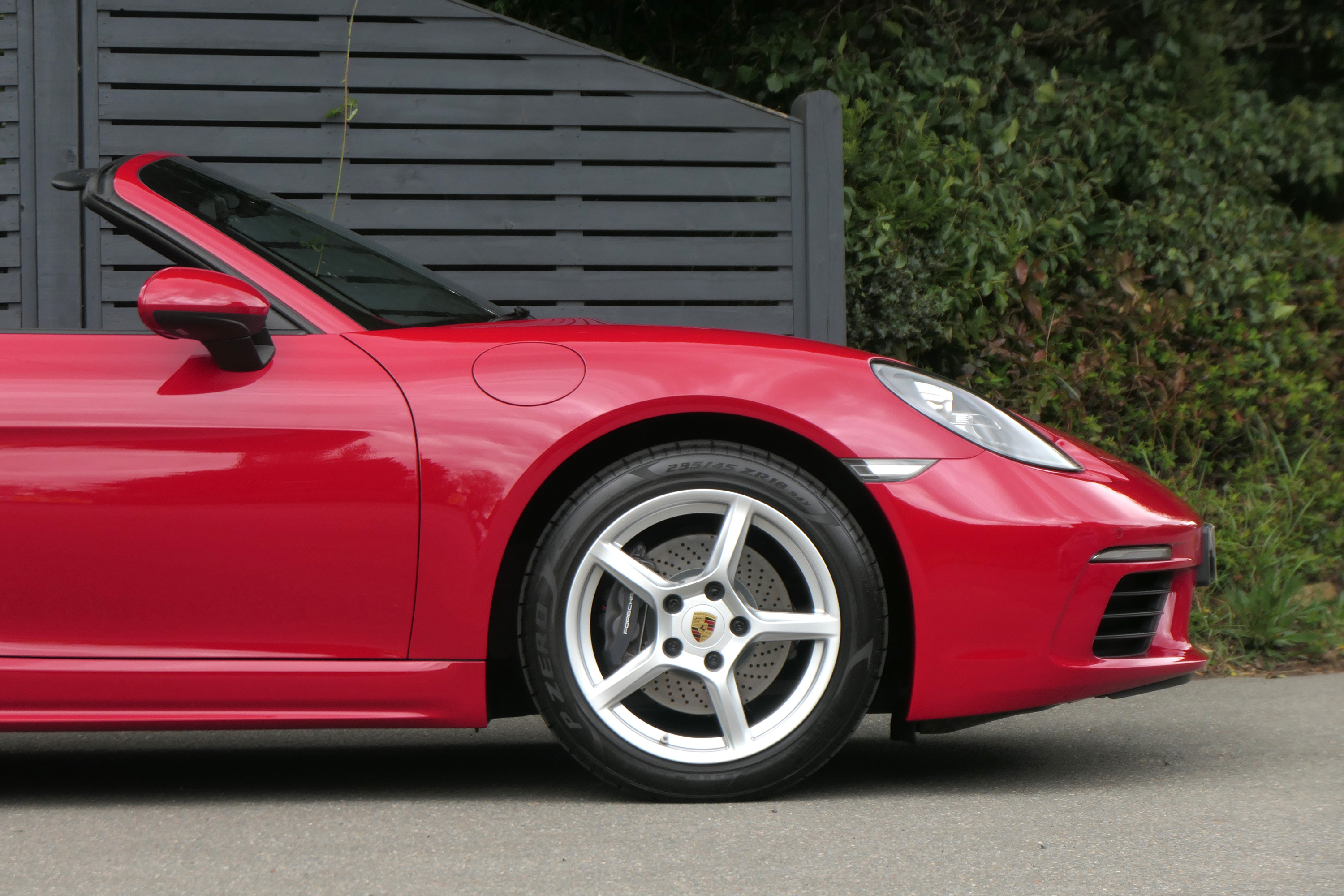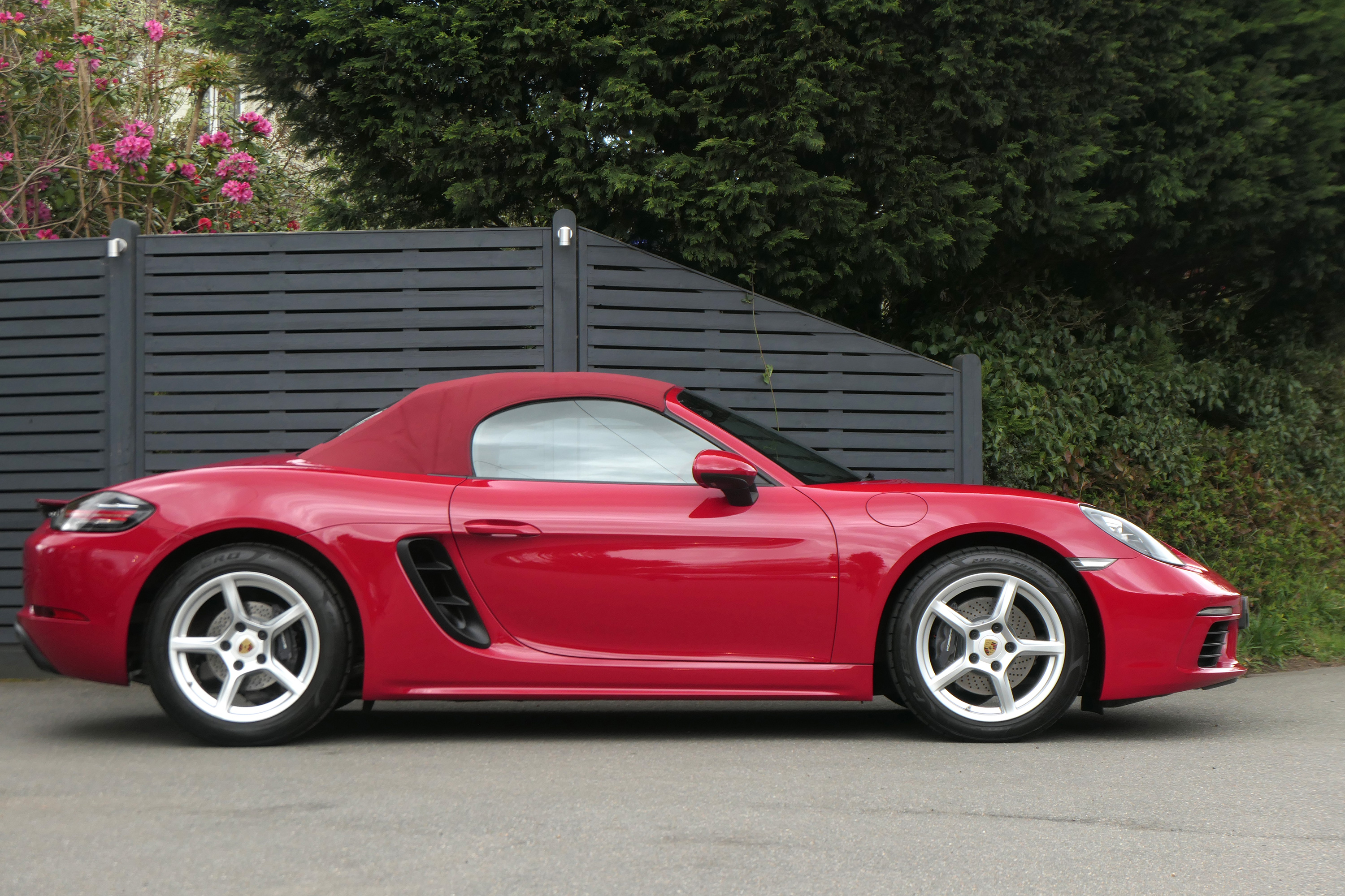 The flat four turbocharged engine develops 300 bhp and standard features include 18" Boxster wheels, mesh wind deflector, onboard computer, air conditioning, LED daytime running lights, stop/start function, automatic headlights, Porsche Stability Management (PSM), Bluetooth phone & music, and a sport button for increased throttle response.