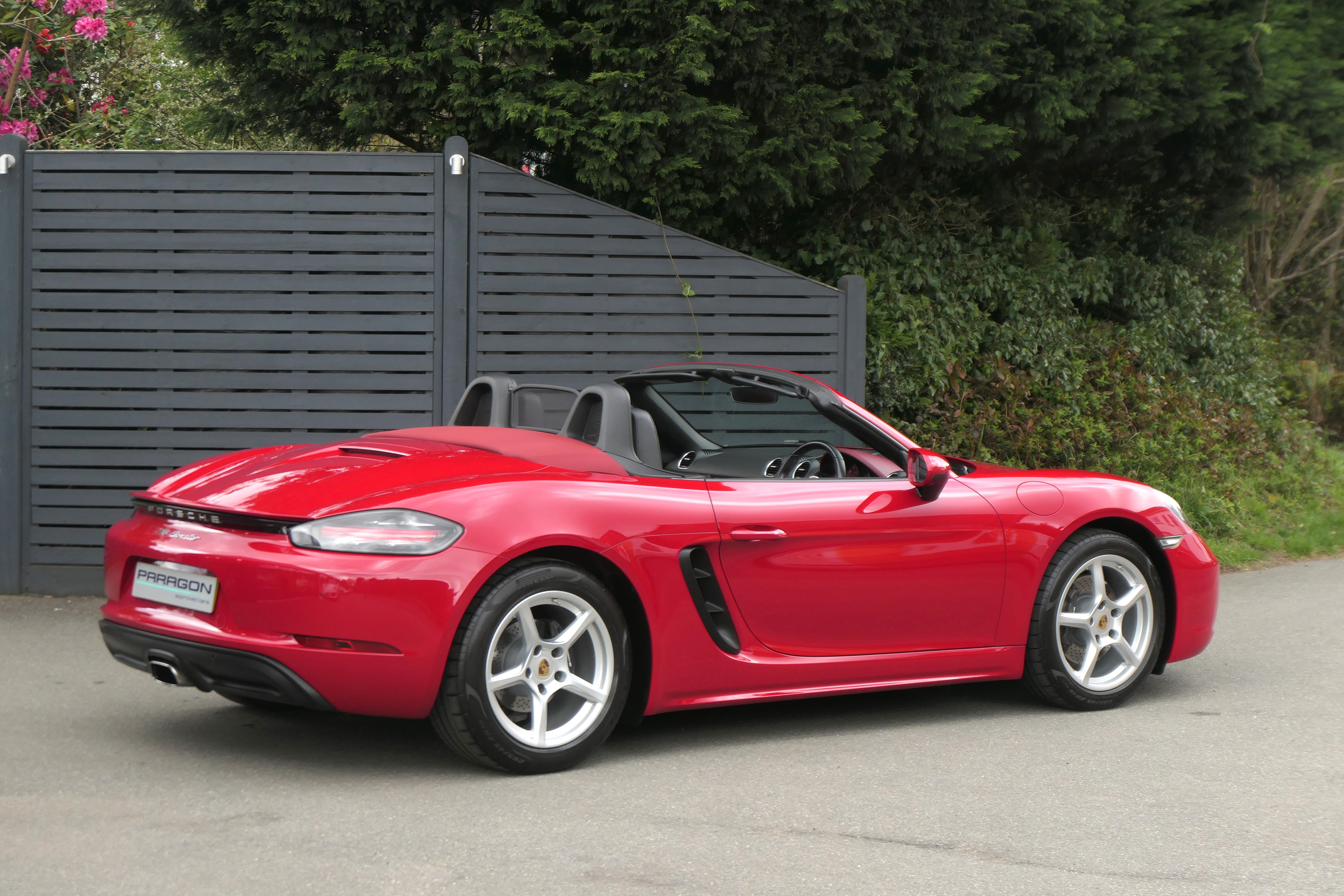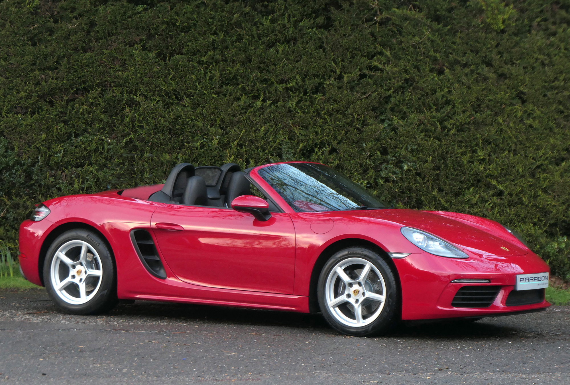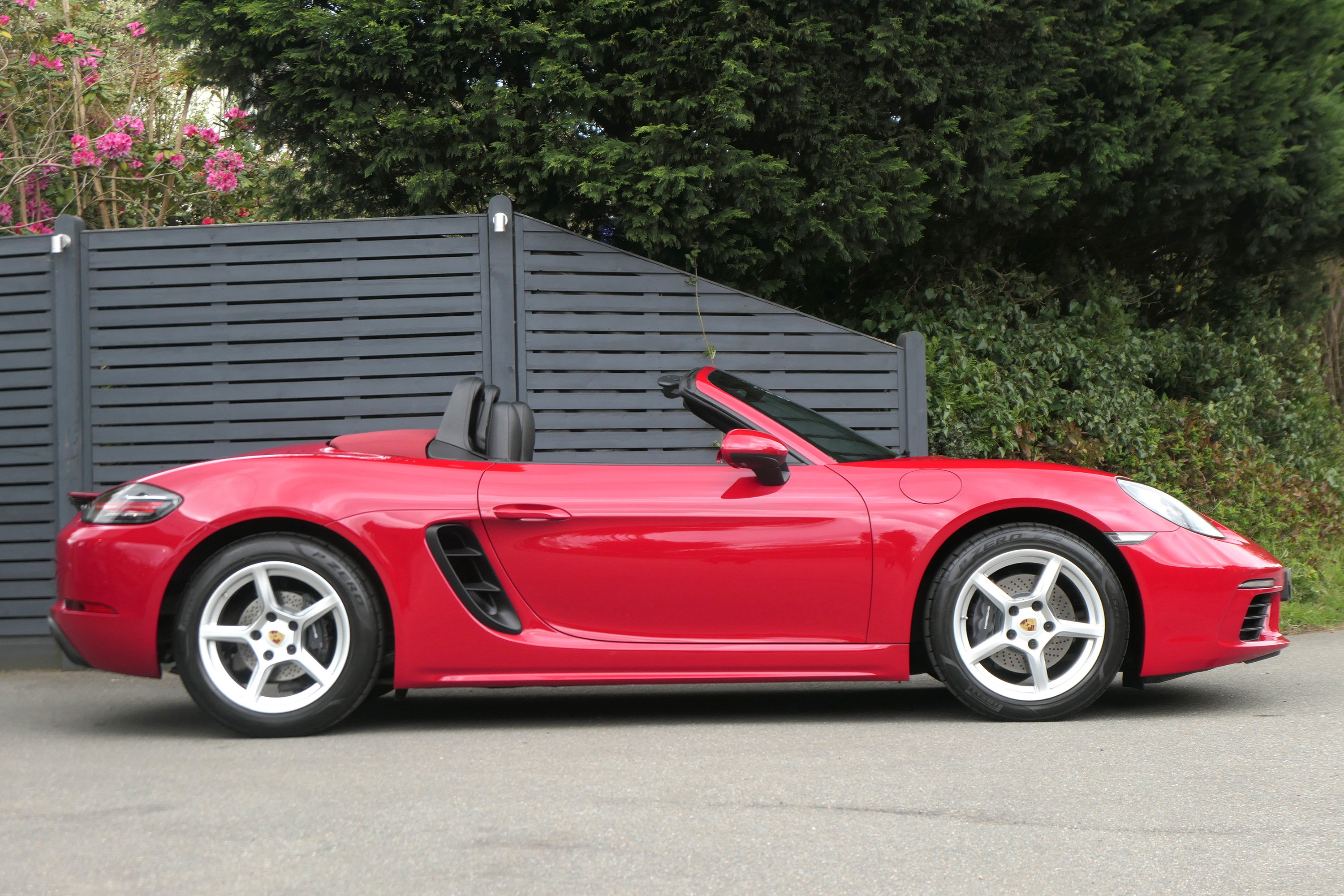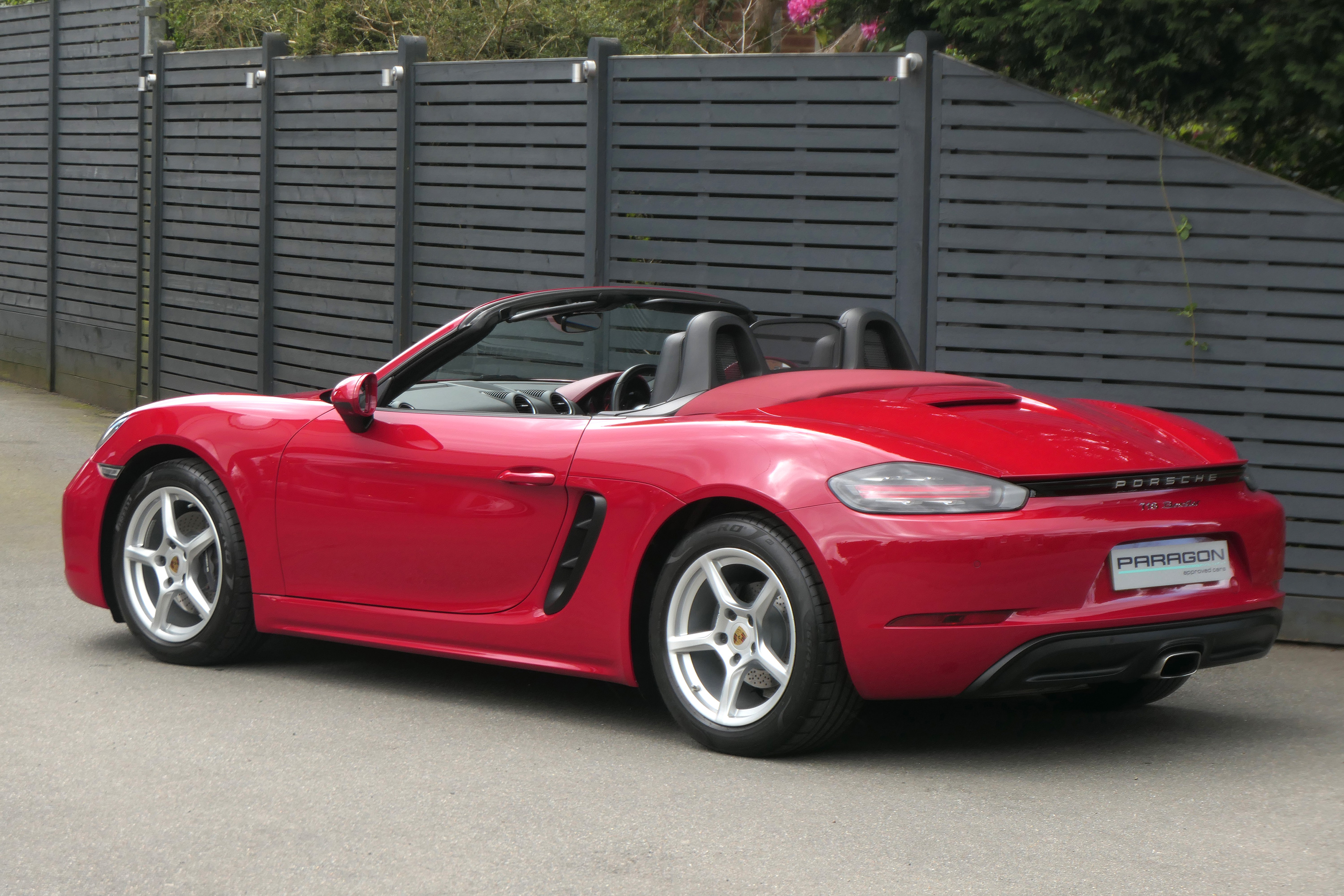 The flat four turbocharged engine develops 300 bhp and standard features include 18" Boxster wheels, mesh wind deflector, onboard computer, air conditioning, LED daytime running lights, stop/start function, automatic headlights, Porsche Stability Management (PSM), Bluetooth phone & music, and a sport button for increased throttle response.