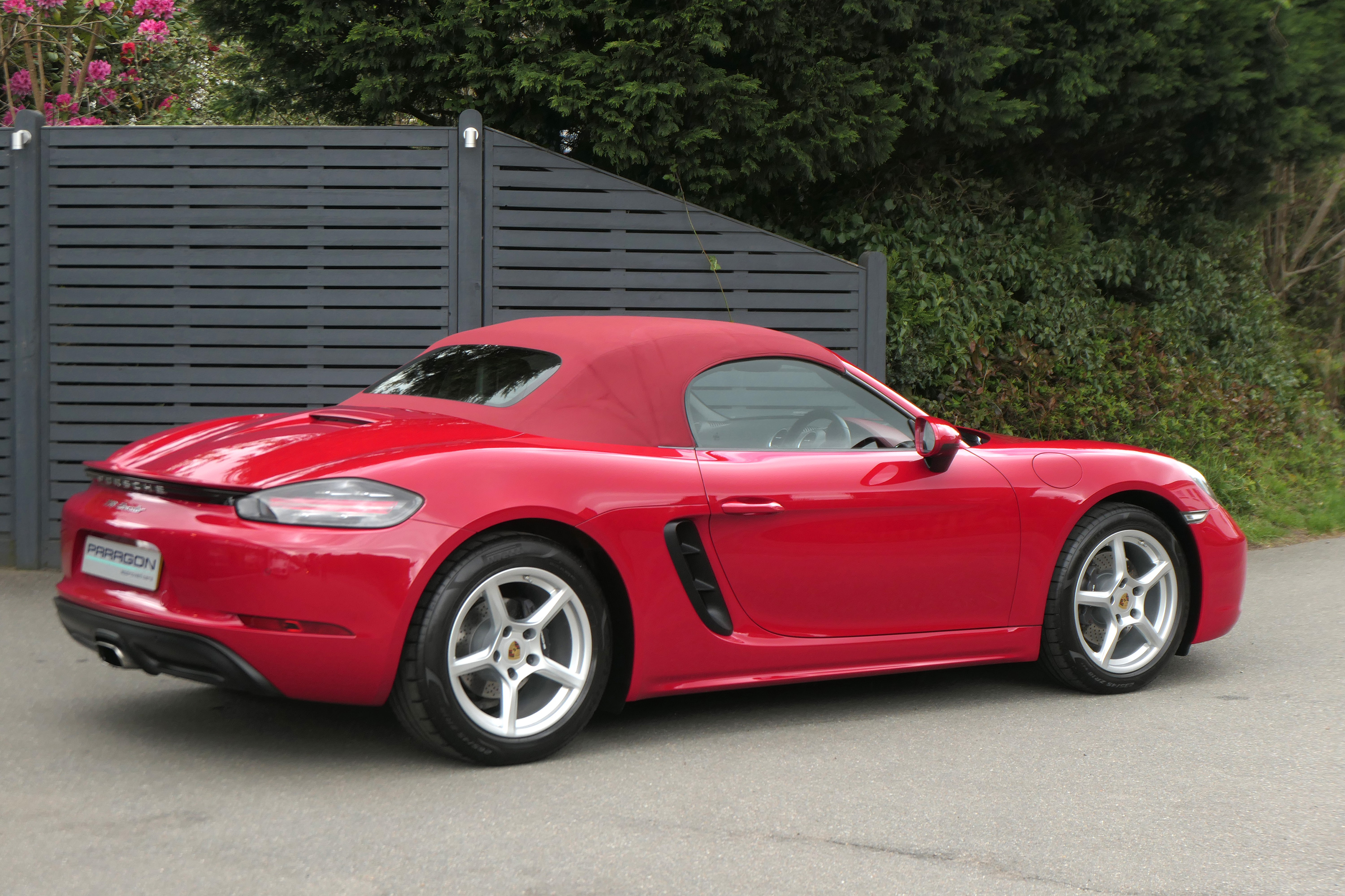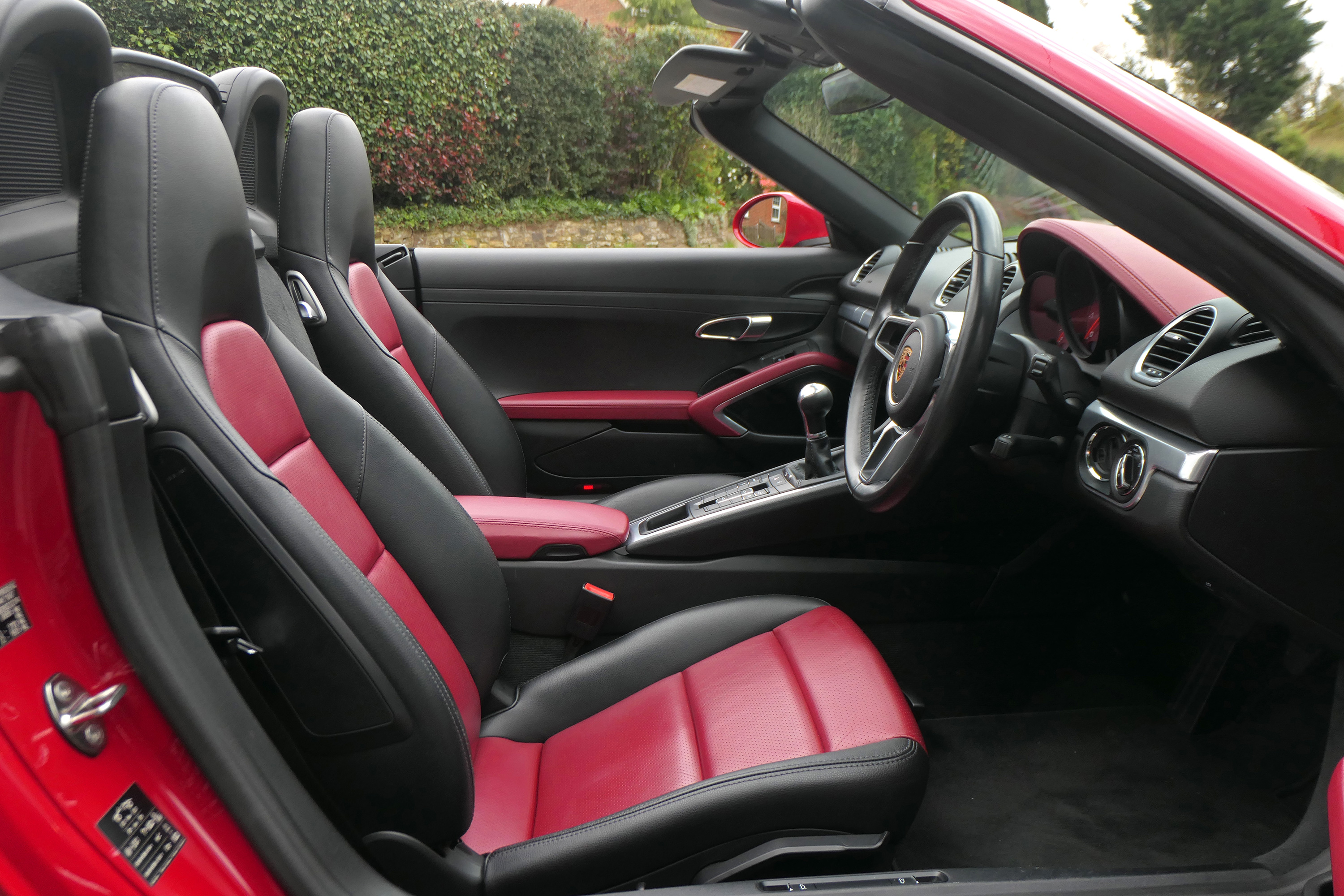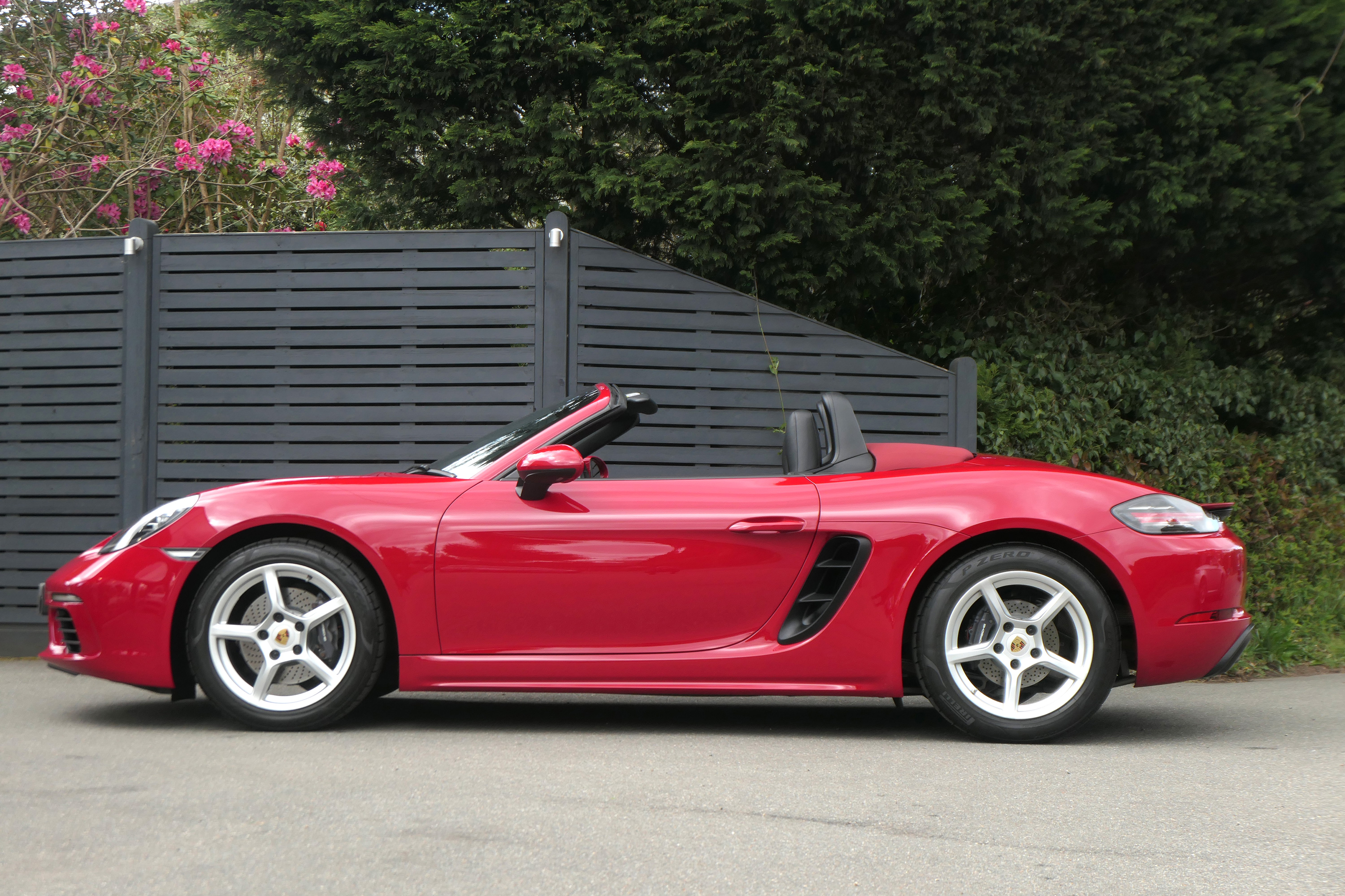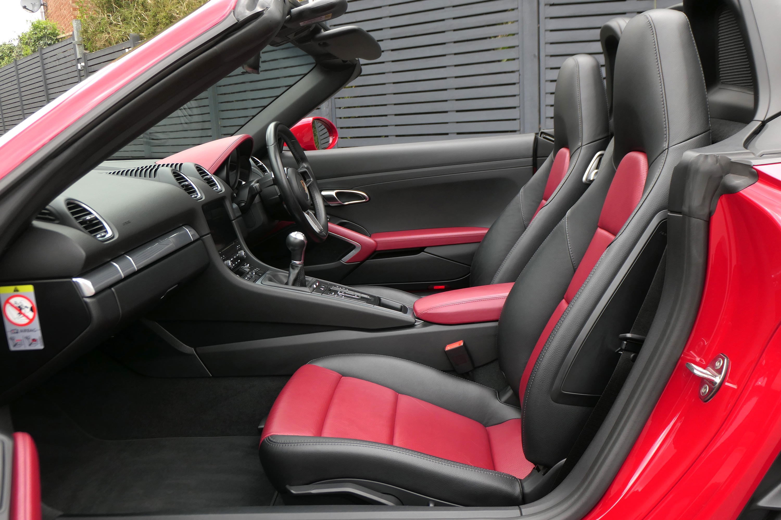 This Porsche Boxster (718) has a 6-speed manual gearbox and is presented in Carmine Red with Black/Bordeaux Red dual tone leather seats and a red power hood.