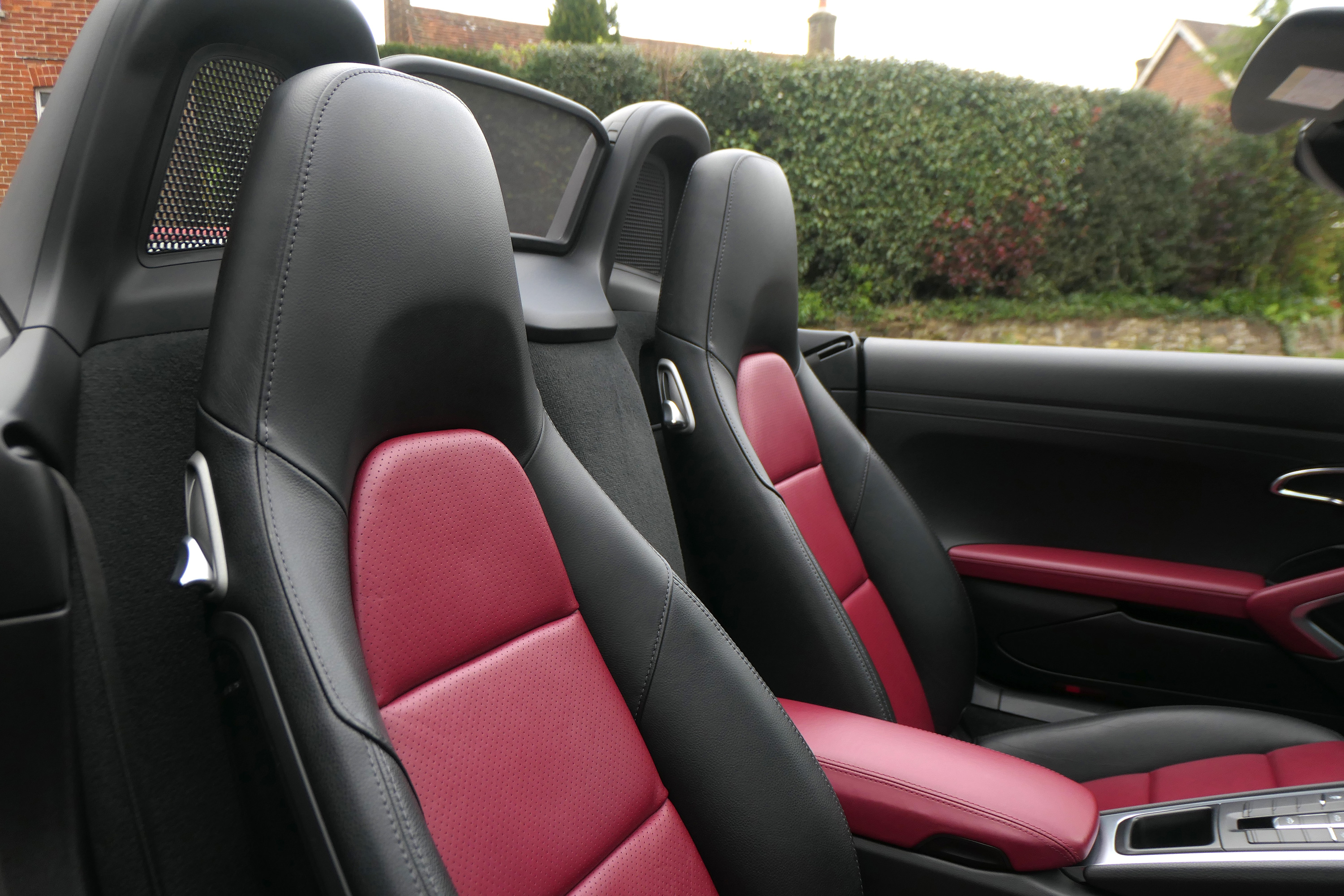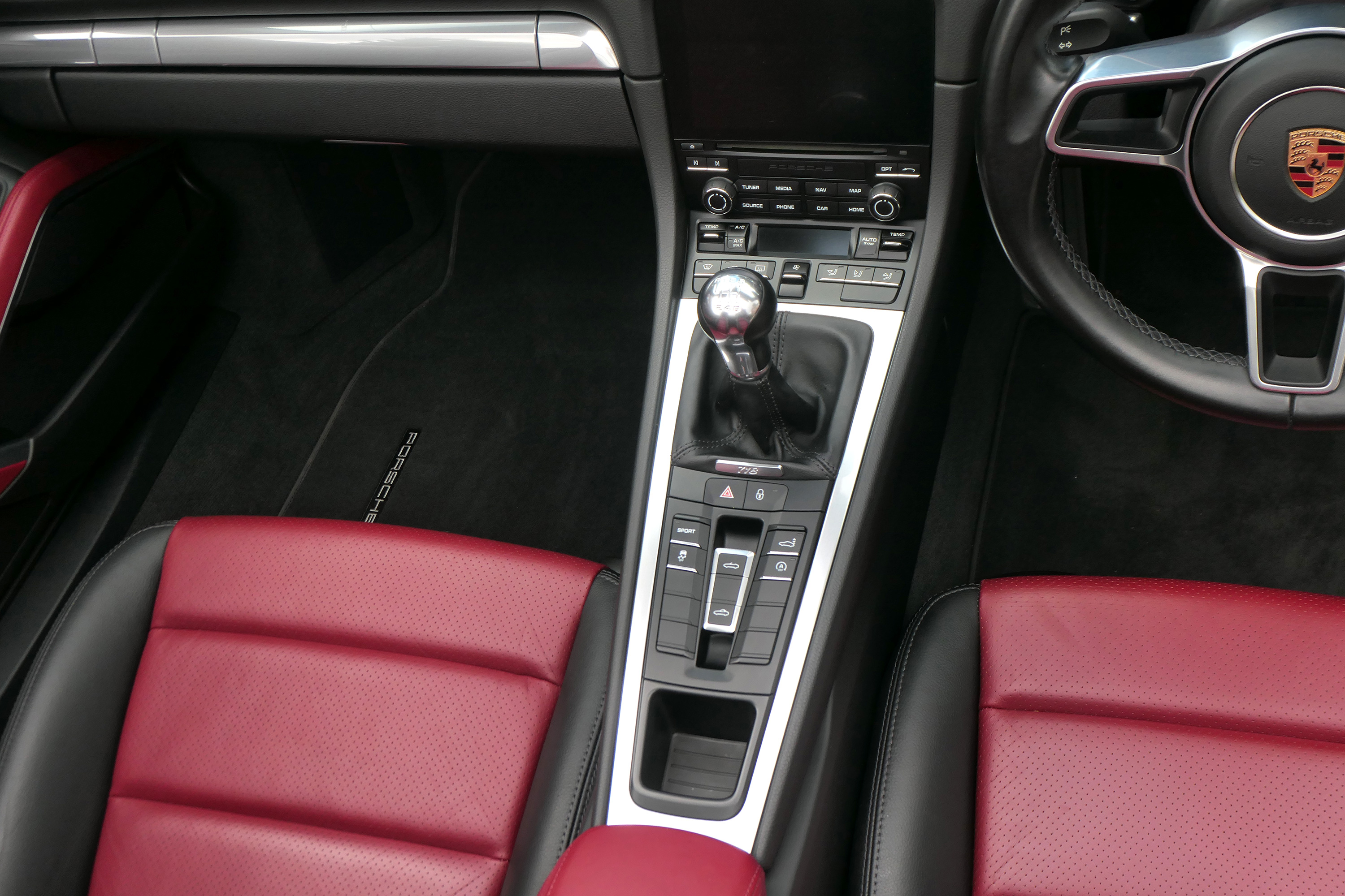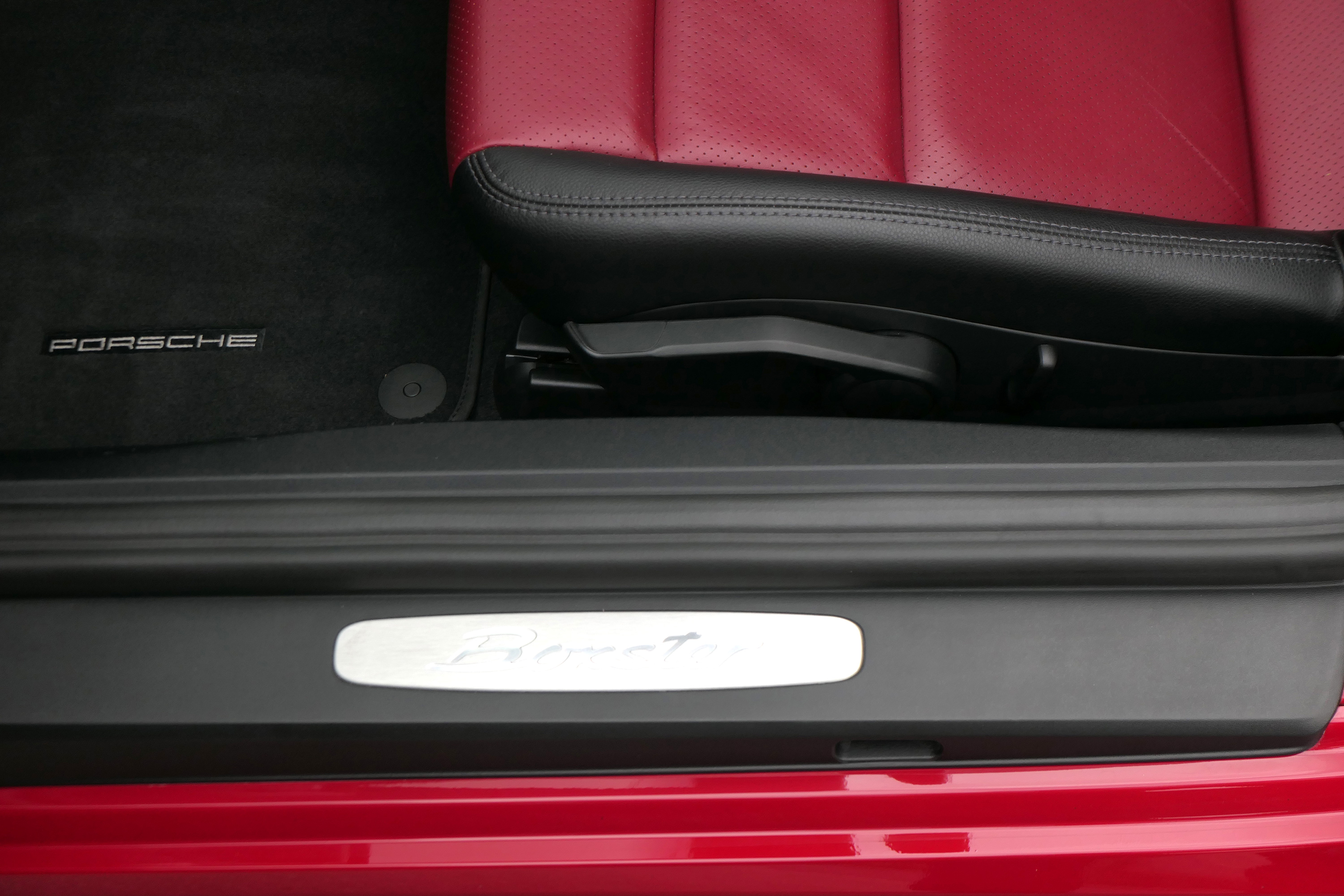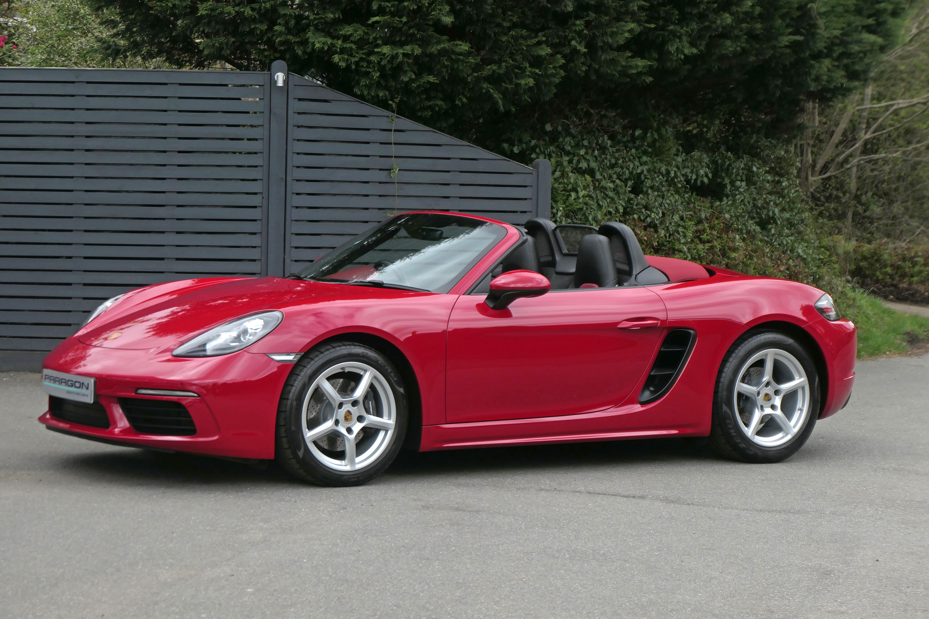 This Porsche Boxster (718) has a 6-speed manual gearbox and is presented in Carmine Red with Black/Bordeaux Red dual tone leather seats and a red power hood.