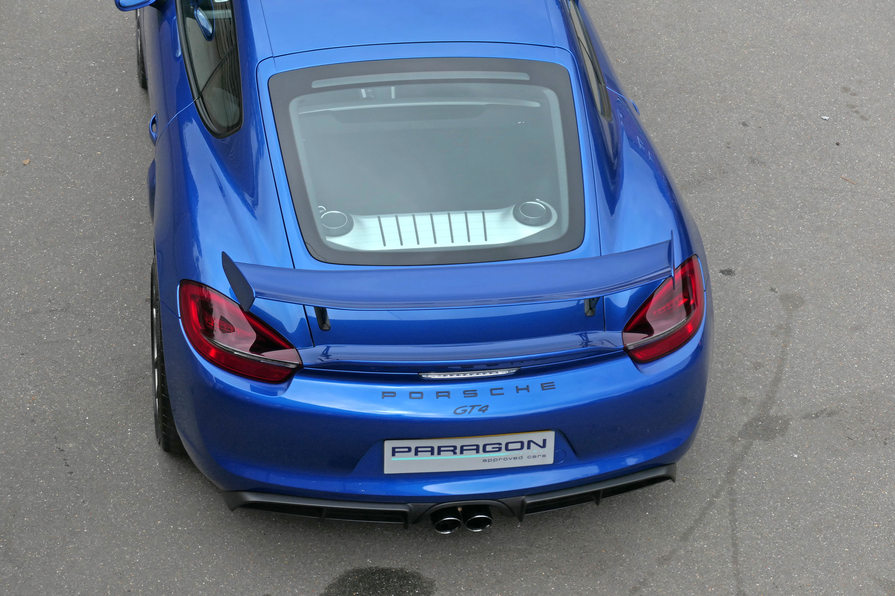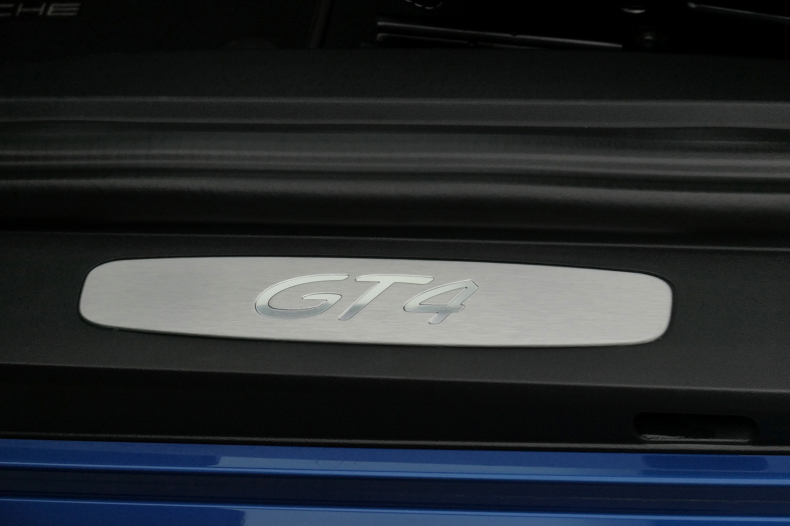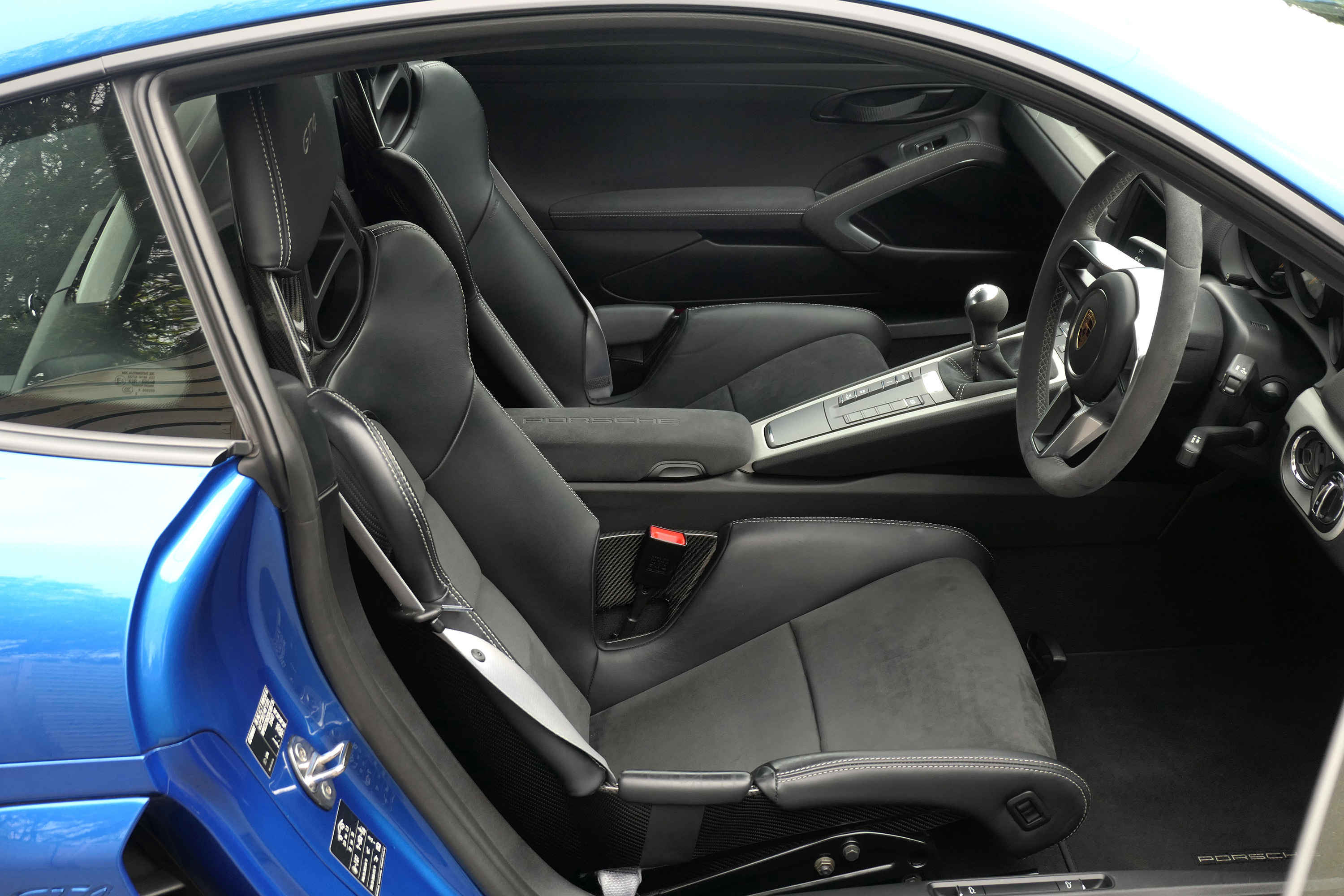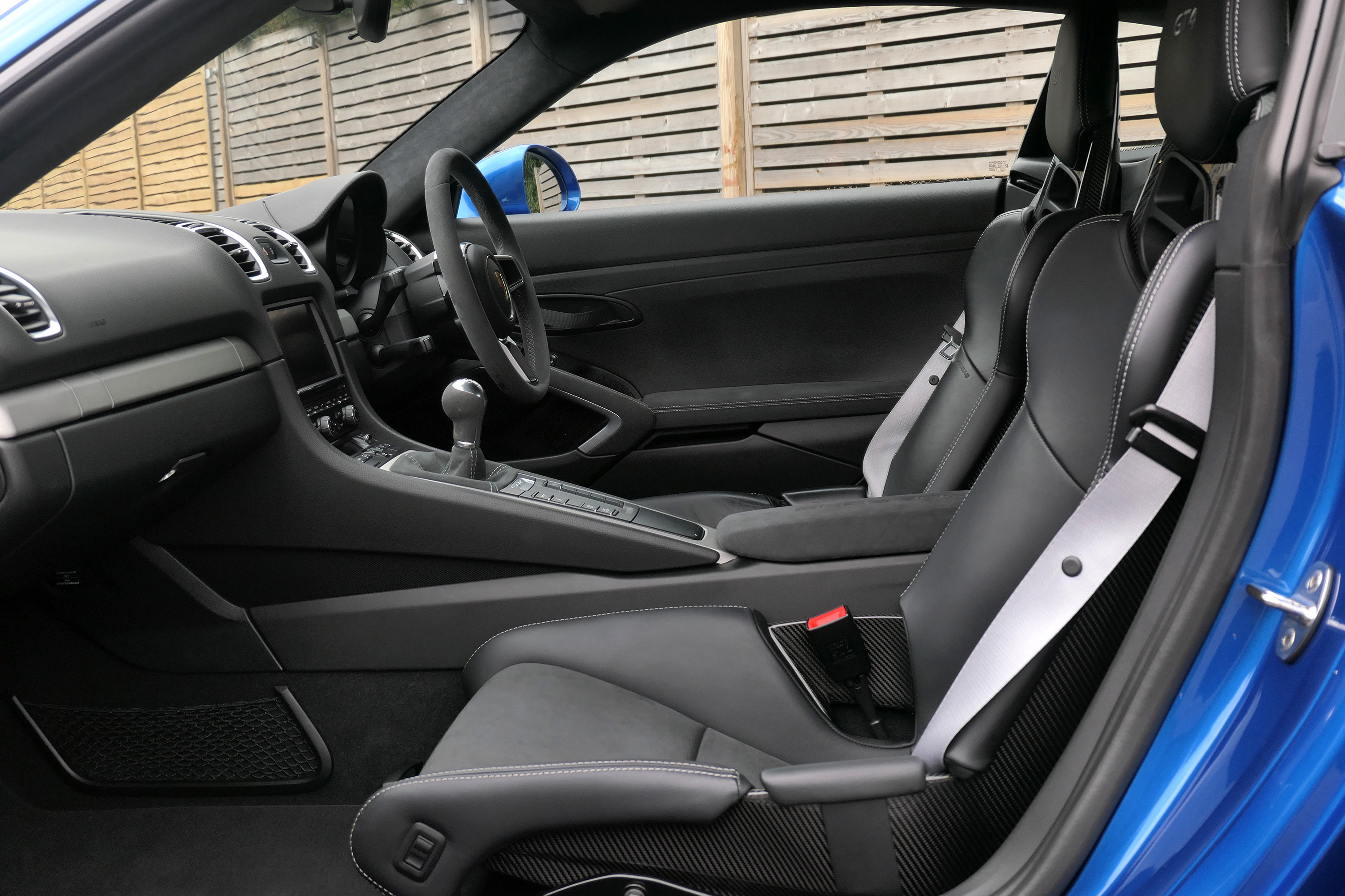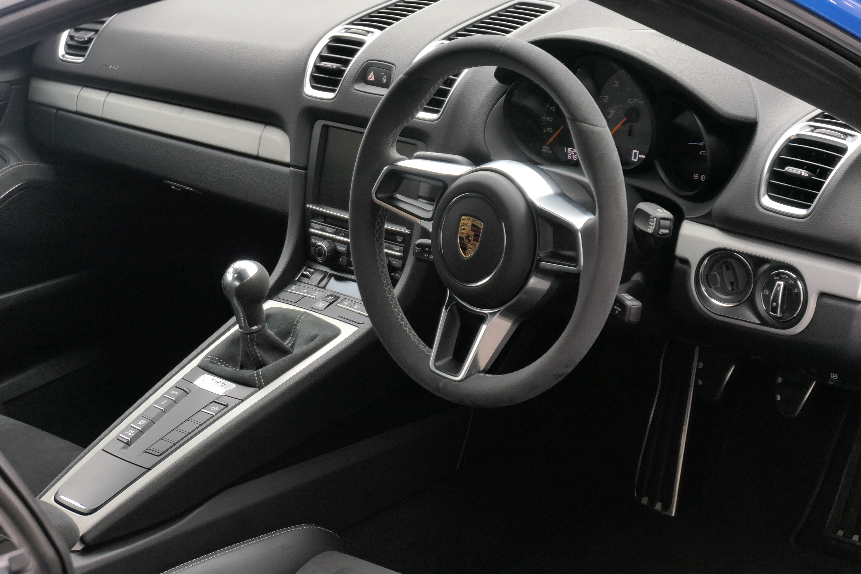 This Cayman GT4 has the 6-speed manual gearbox and is presented in Sapphire Blue with black 918 bucket seats.