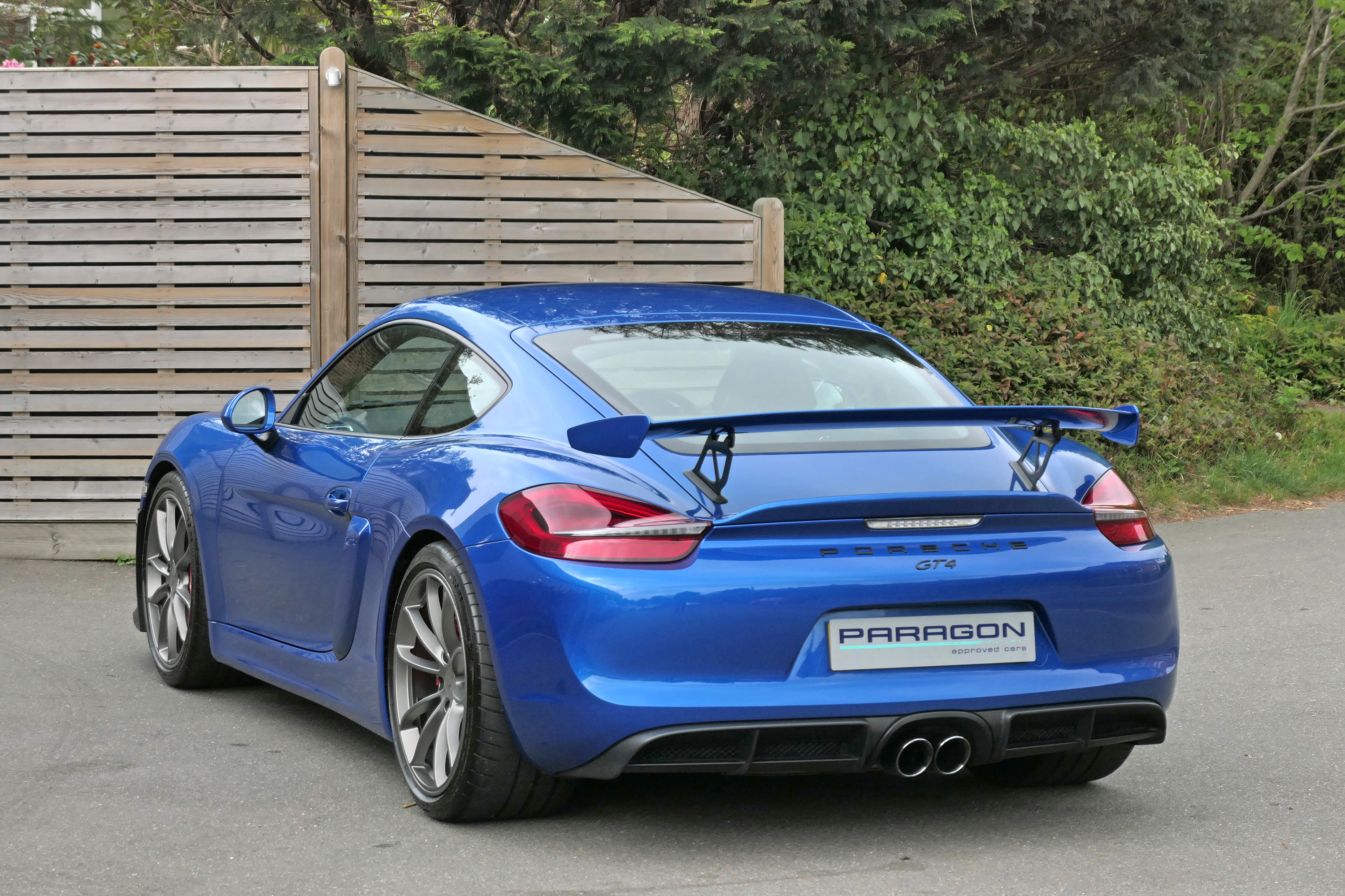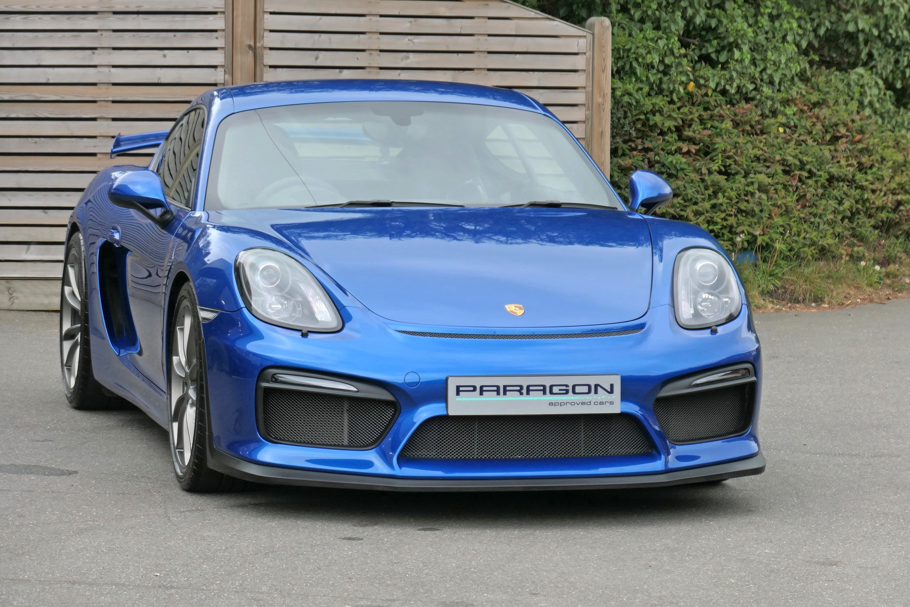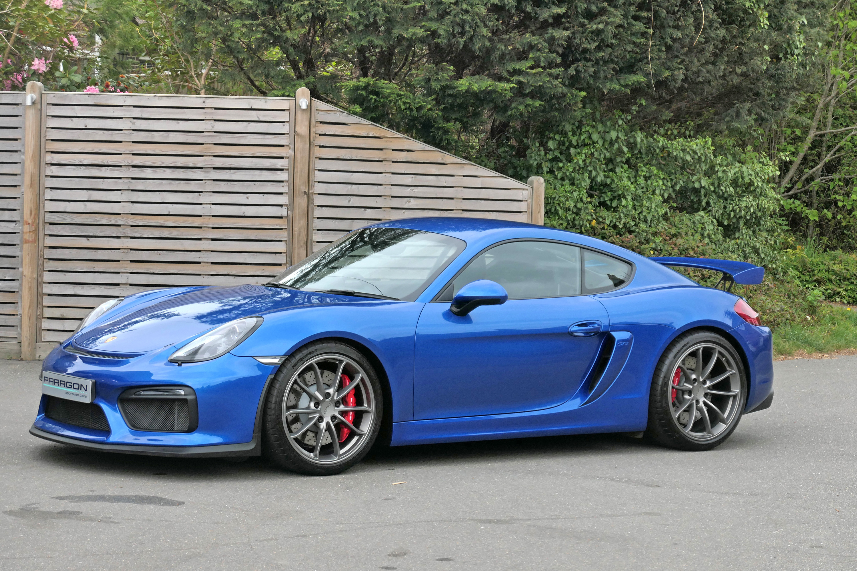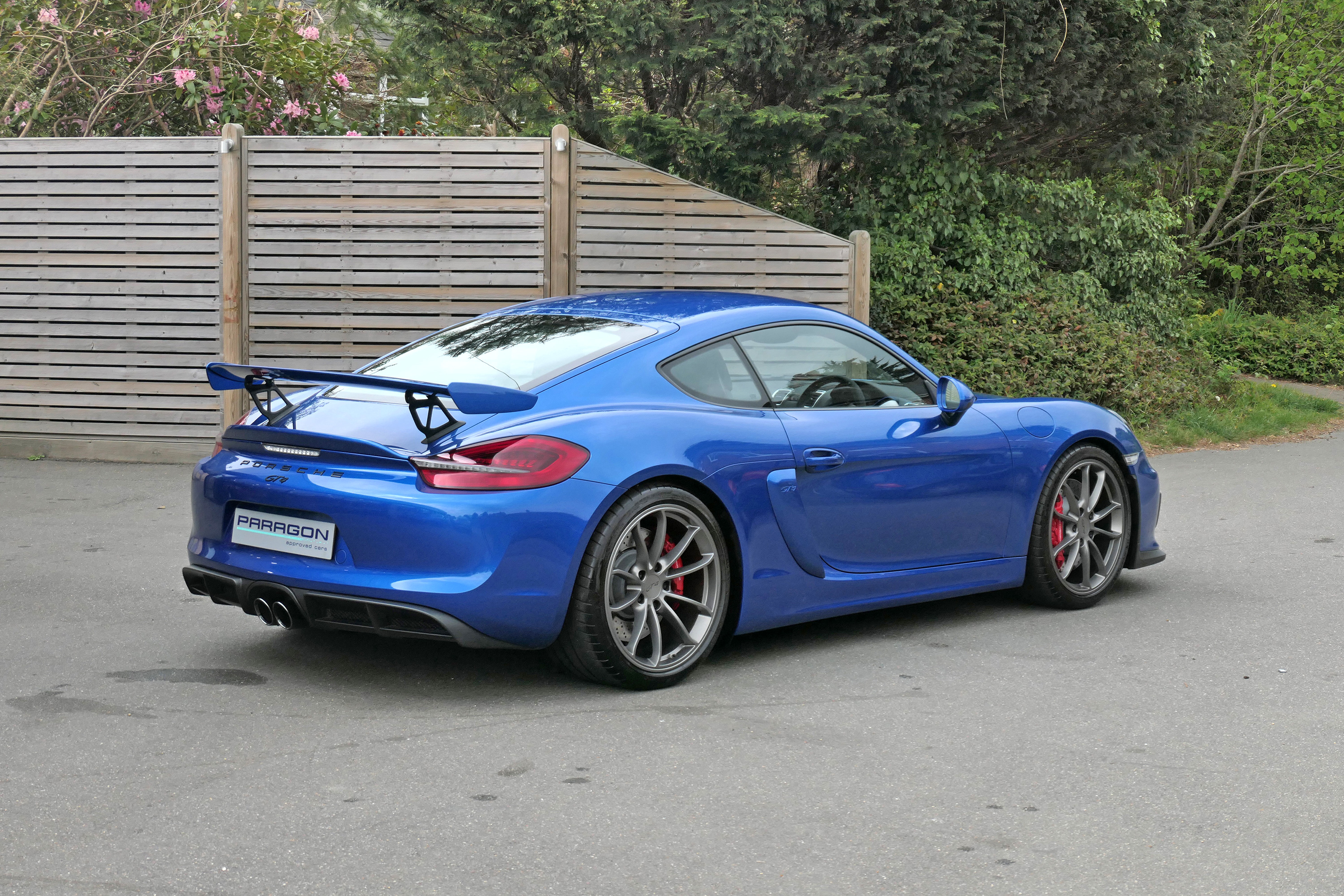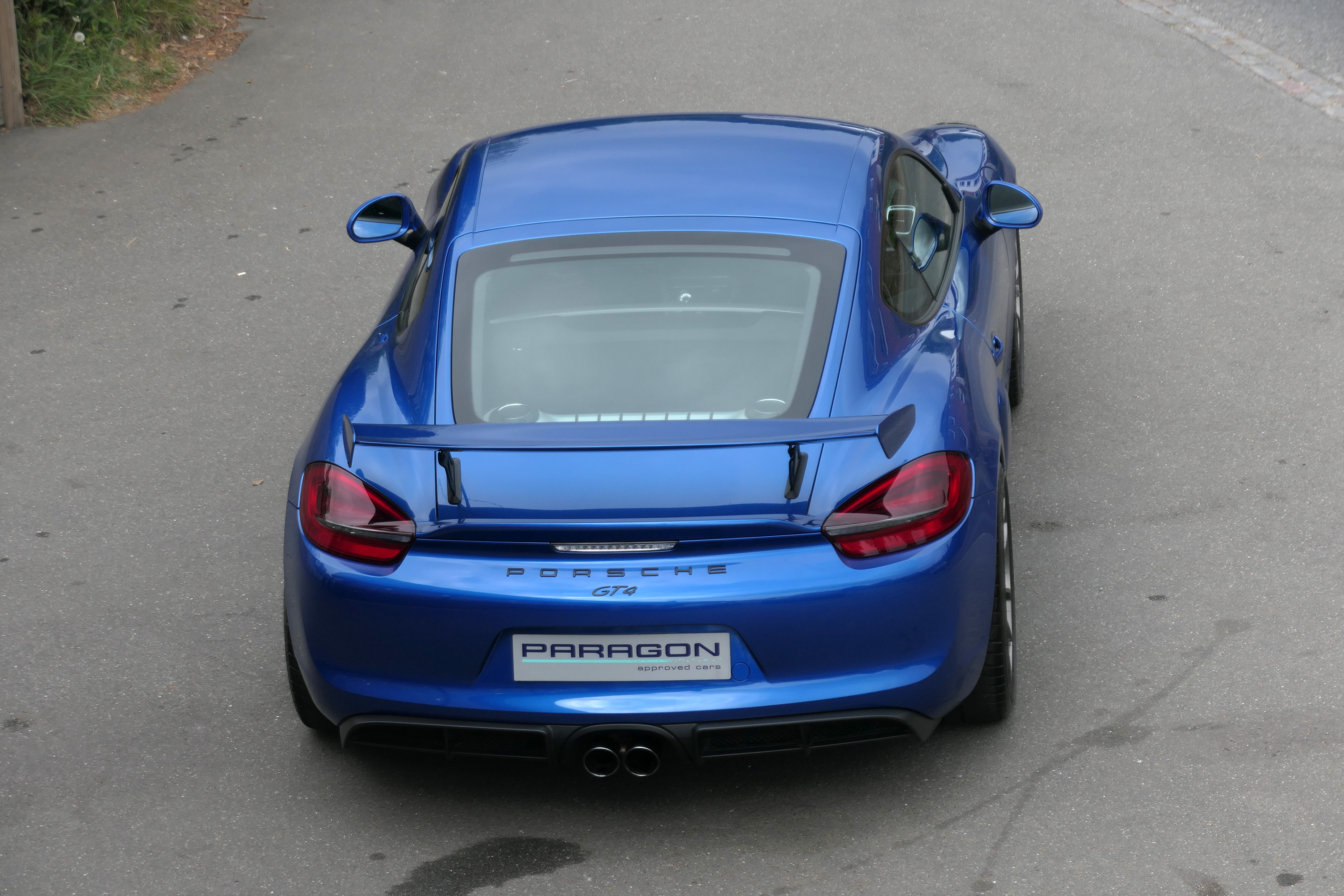 This Cayman GT4 has the 6-speed manual gearbox and is presented in Sapphire Blue with black 918 bucket seats.
