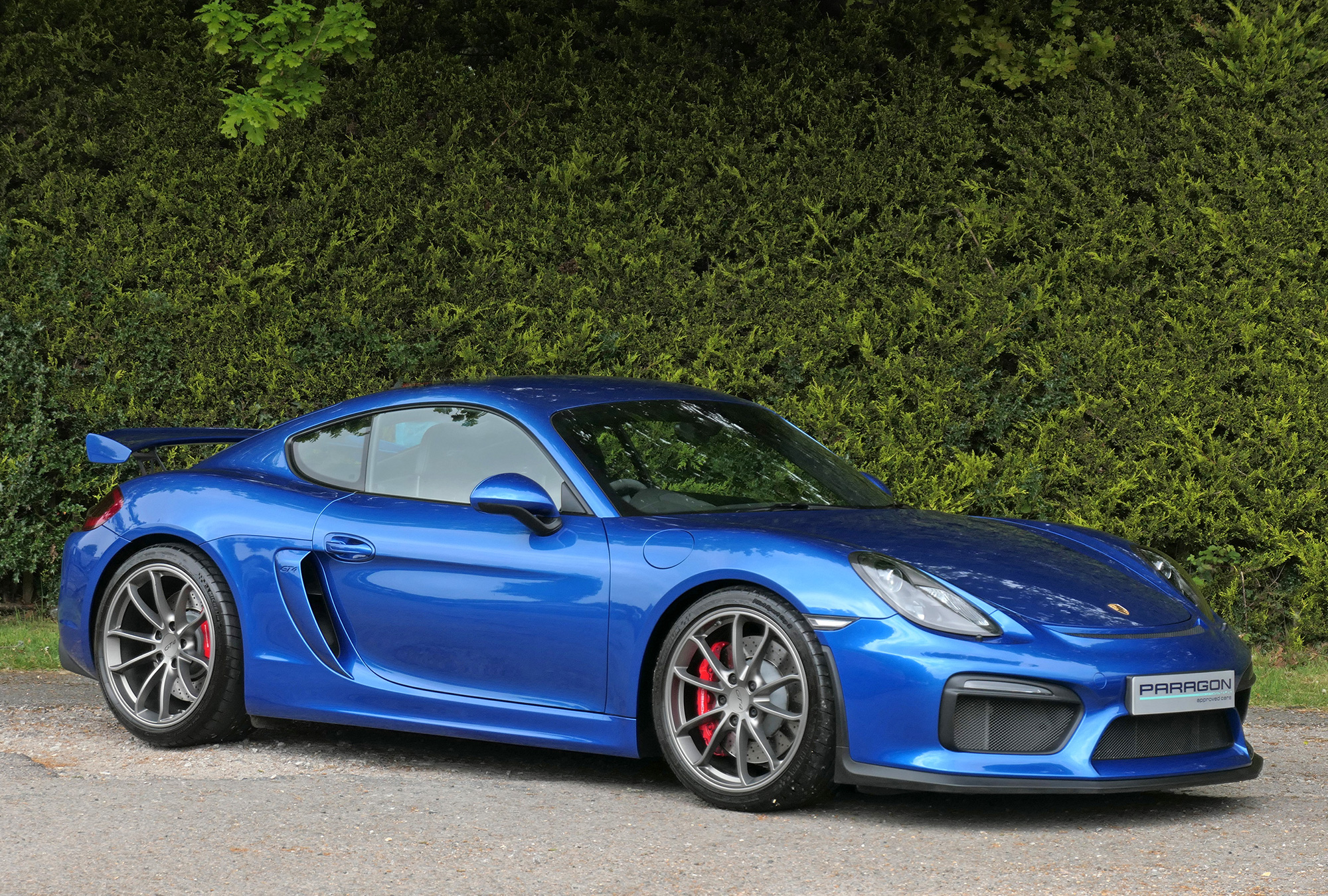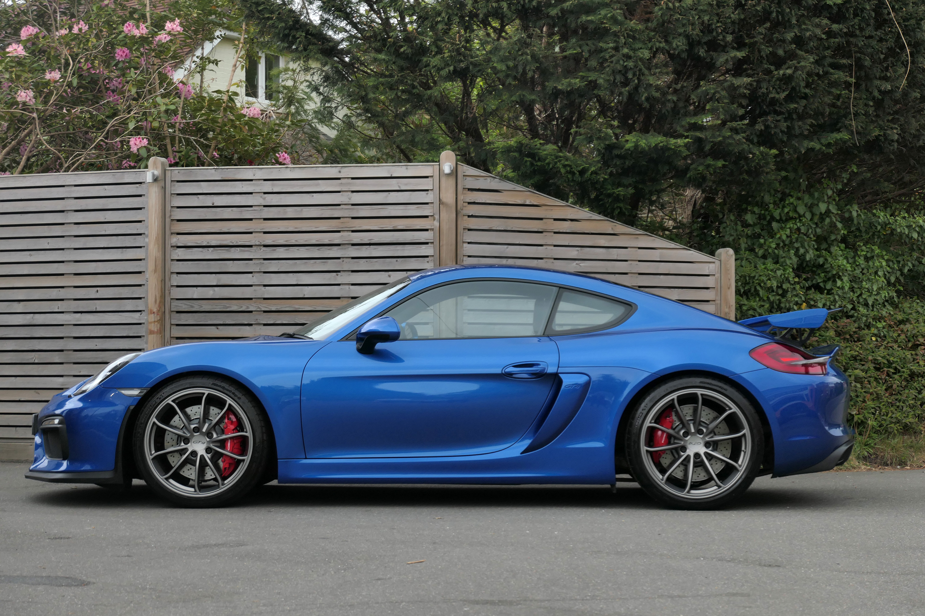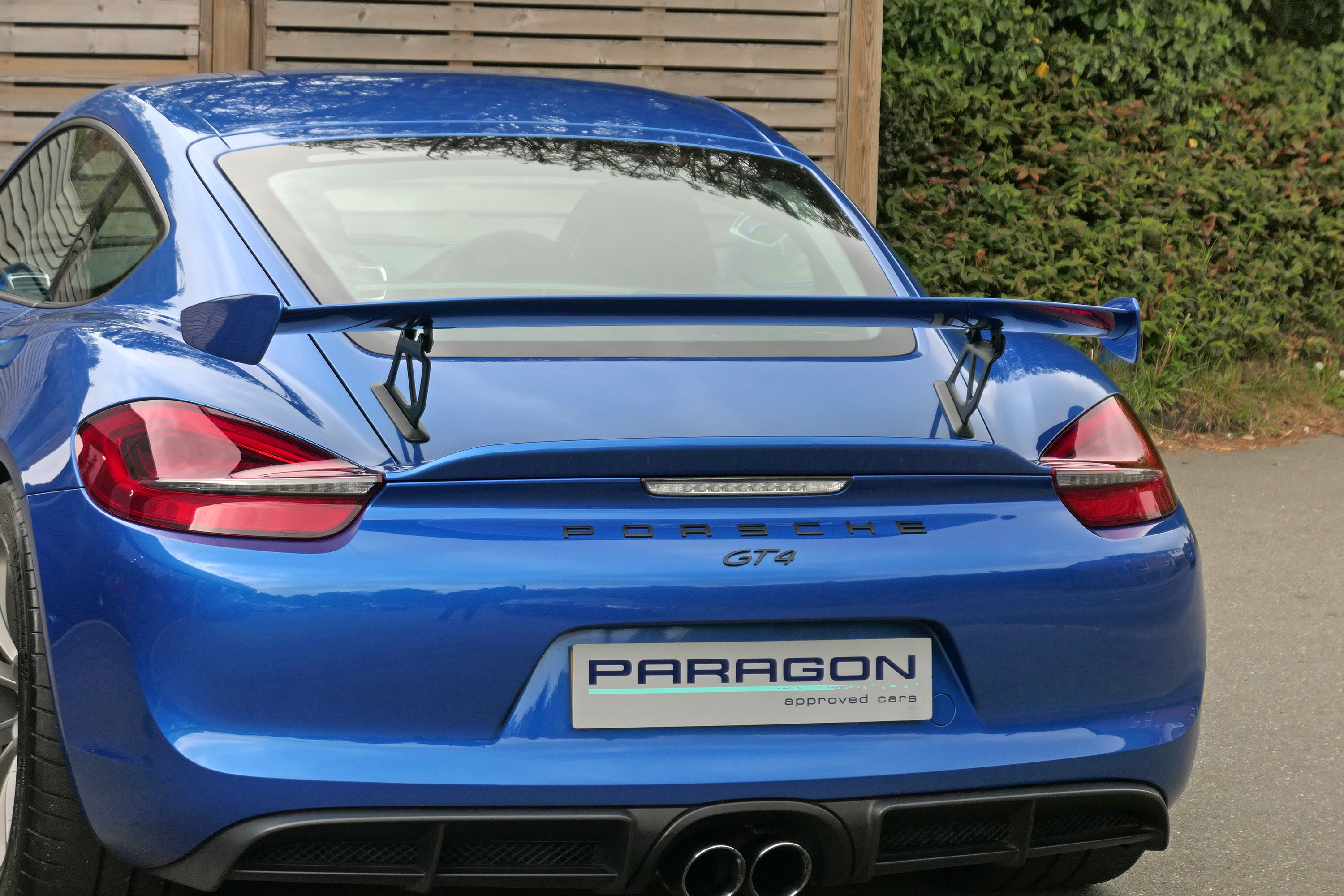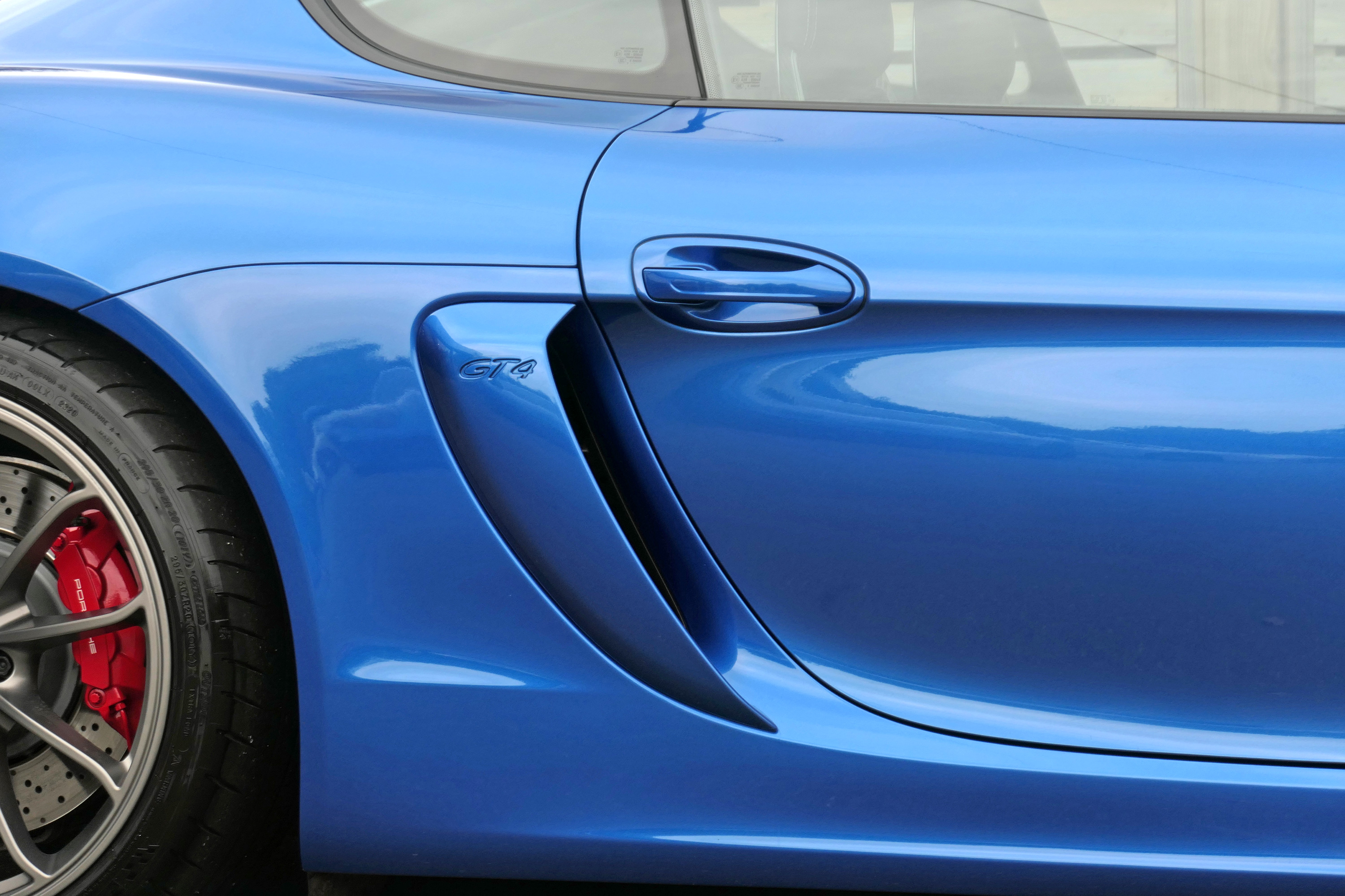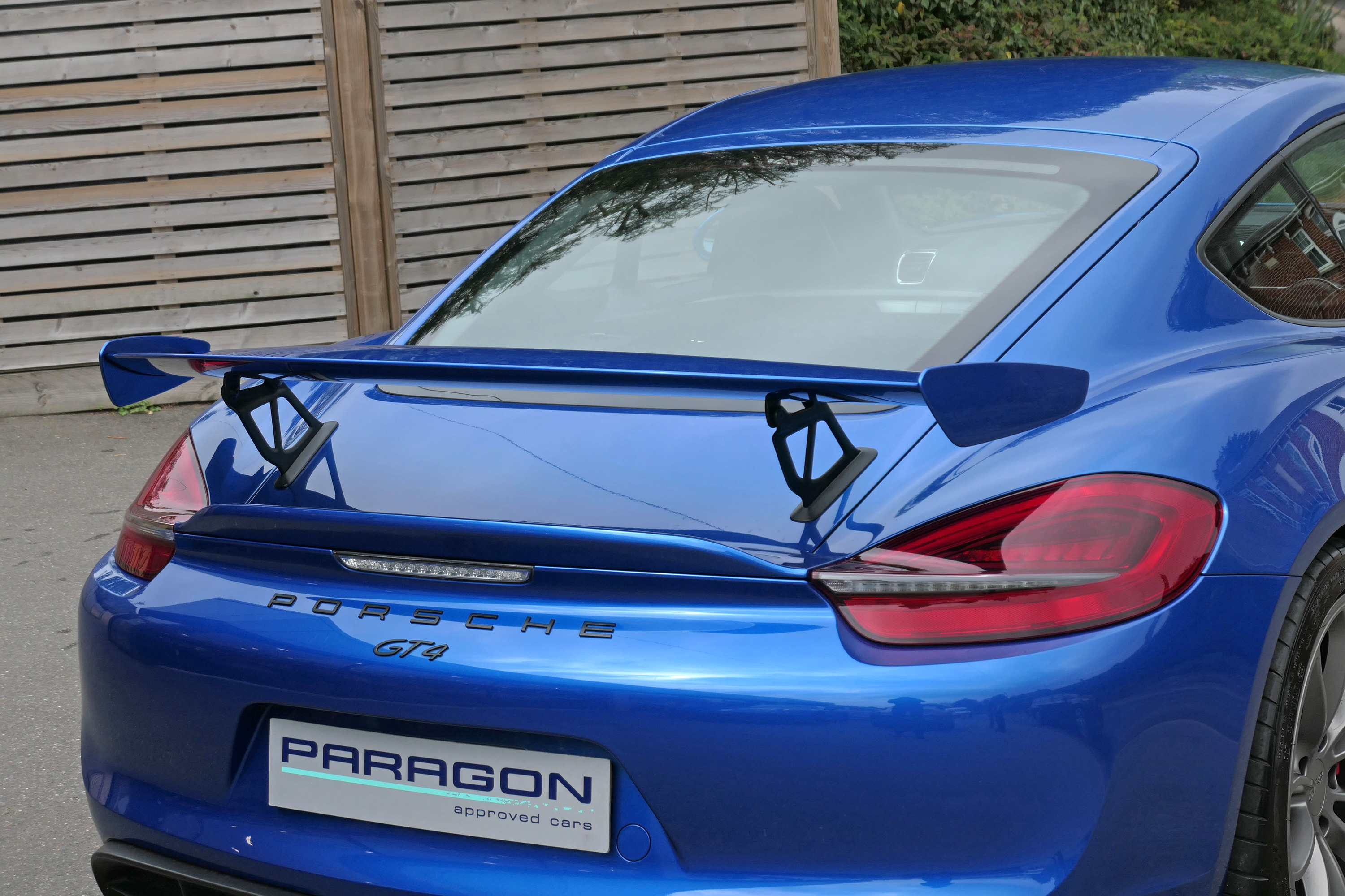 This Cayman GT4 has the 6-speed manual gearbox and is presented in Sapphire Blue with black 918 bucket seats.