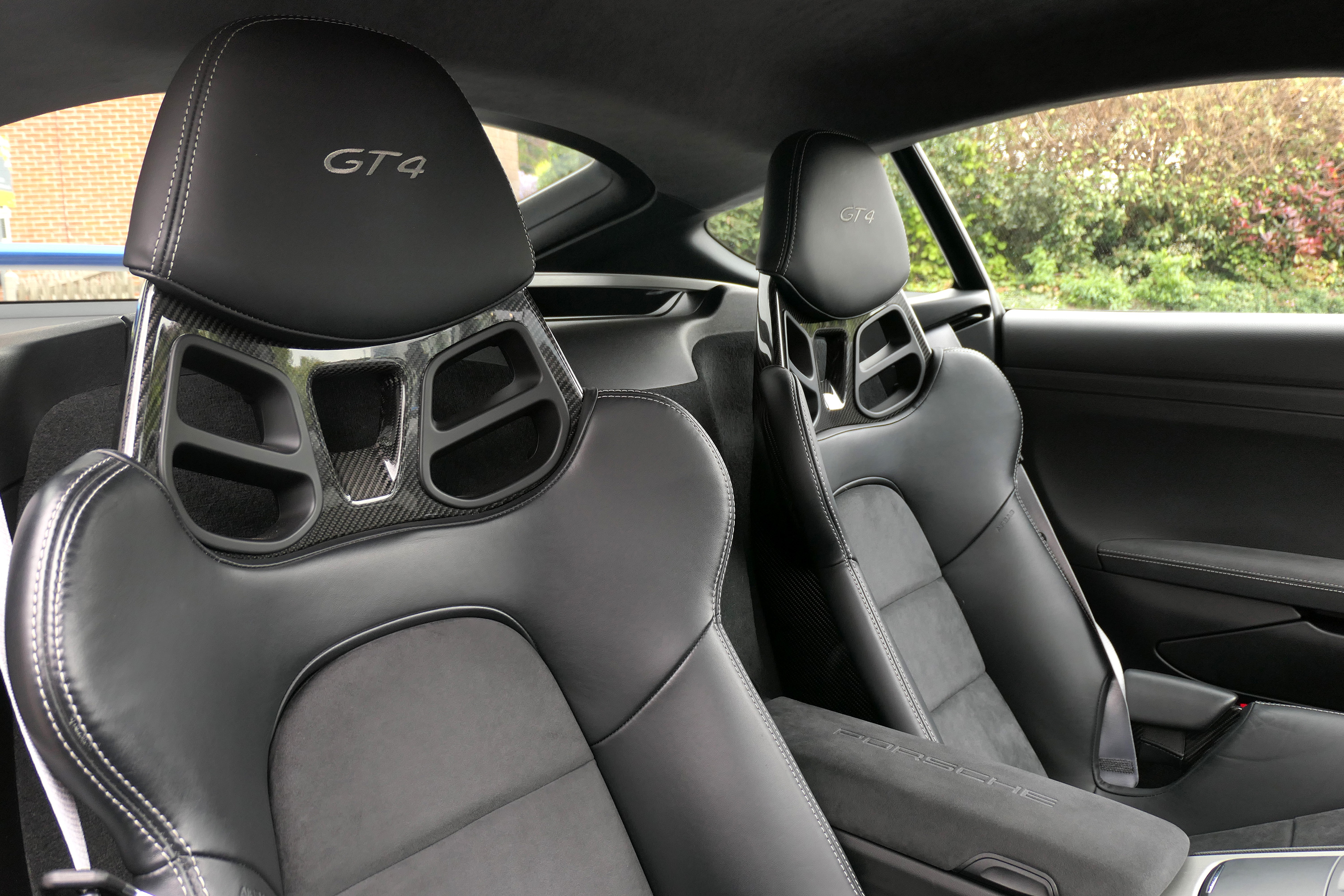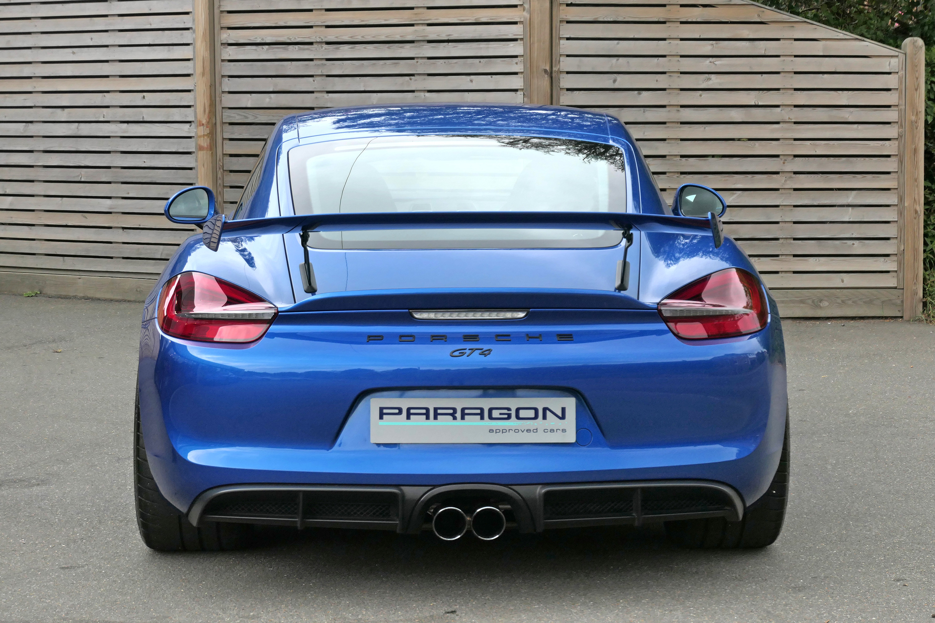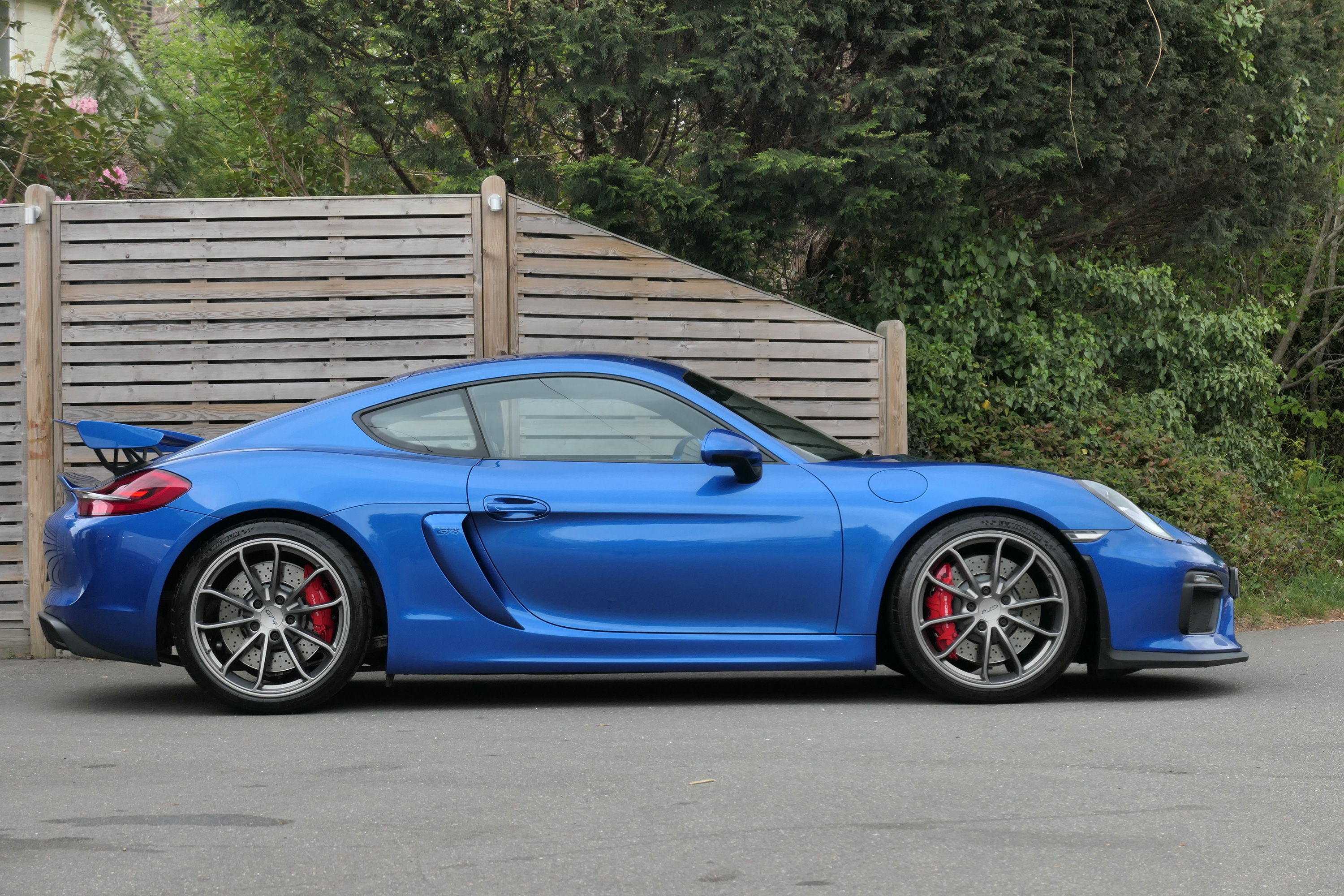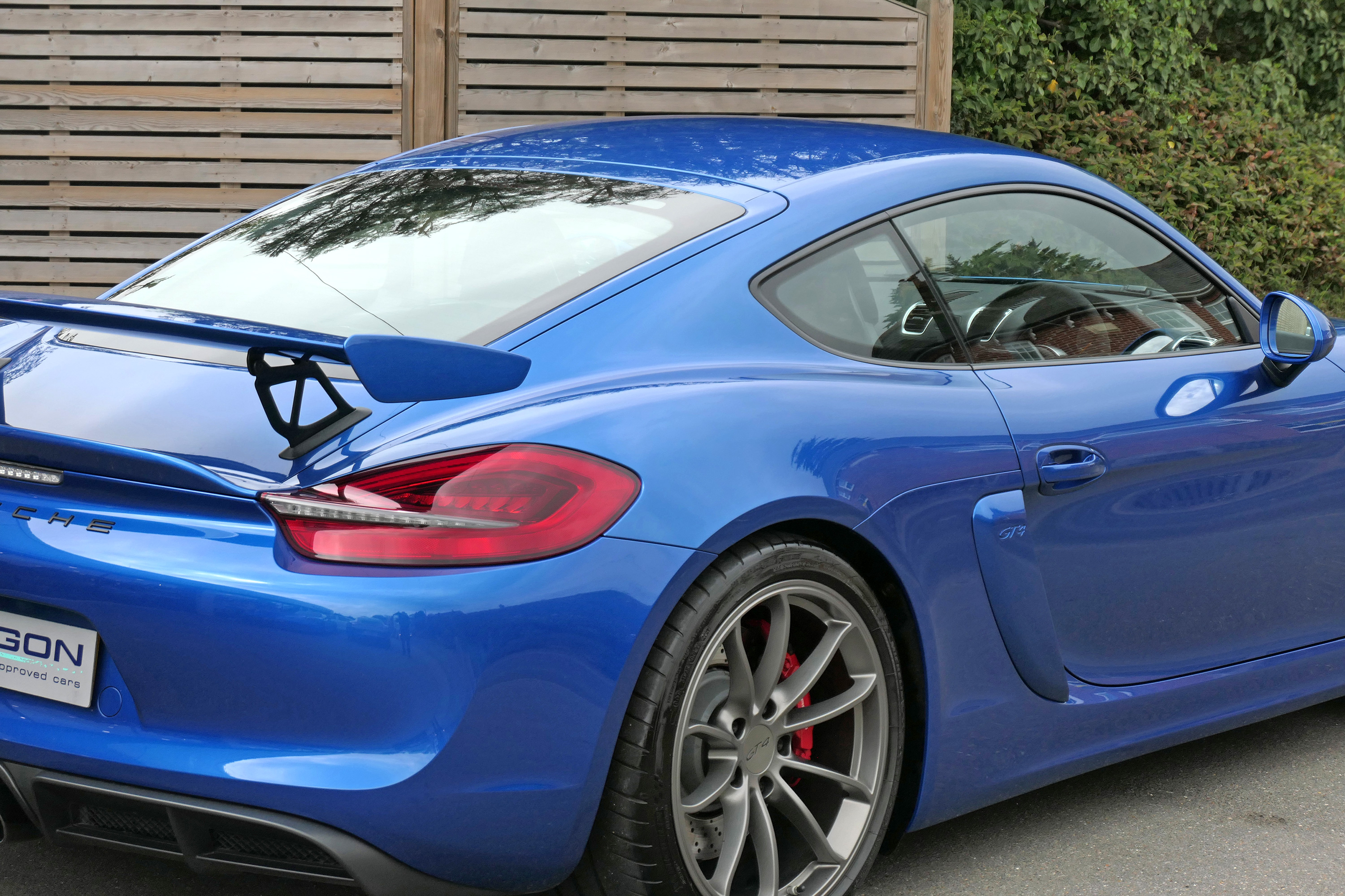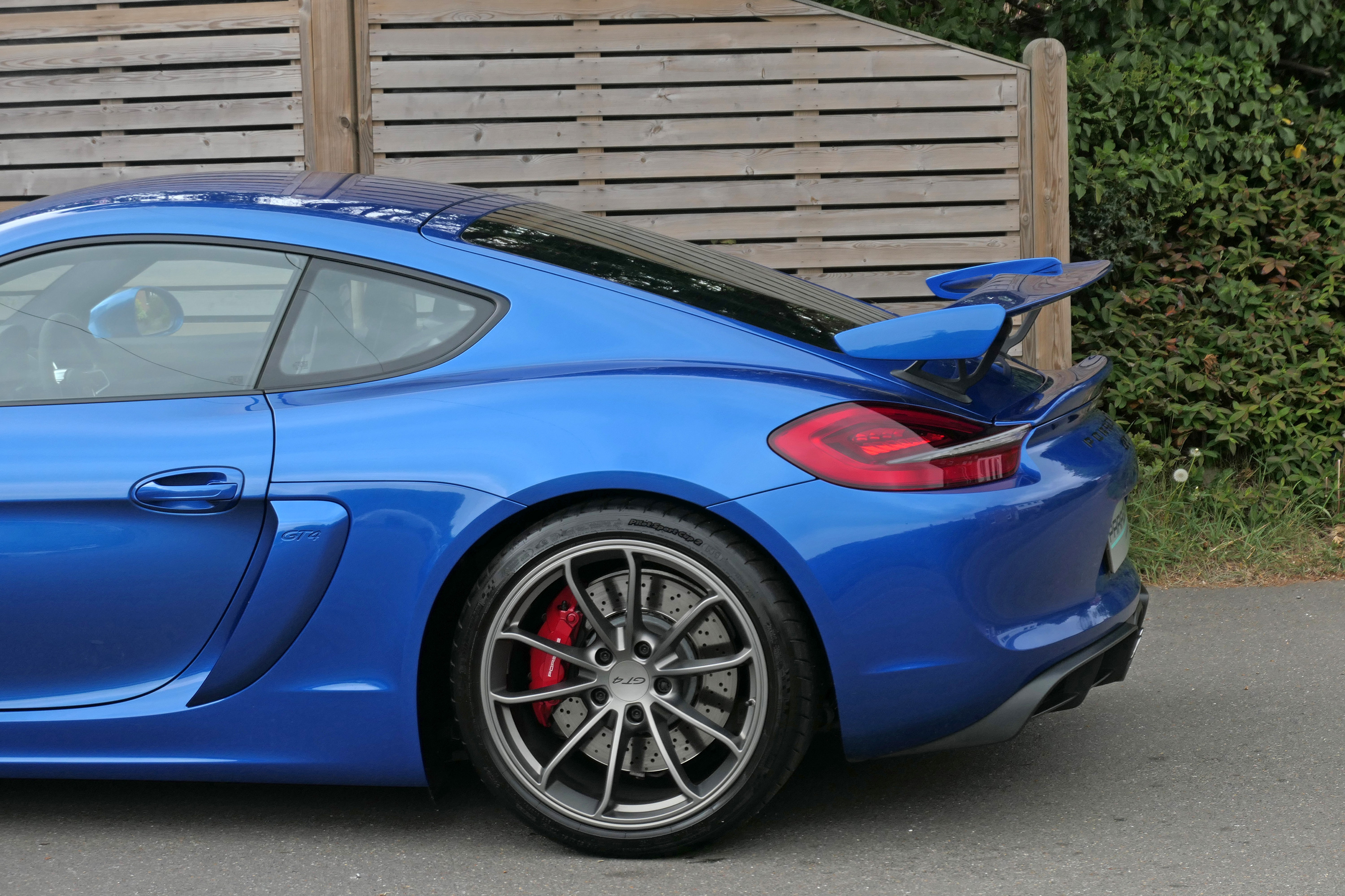 This Cayman GT4 has the 6-speed manual gearbox and is presented in Sapphire Blue with black 918 bucket seats.