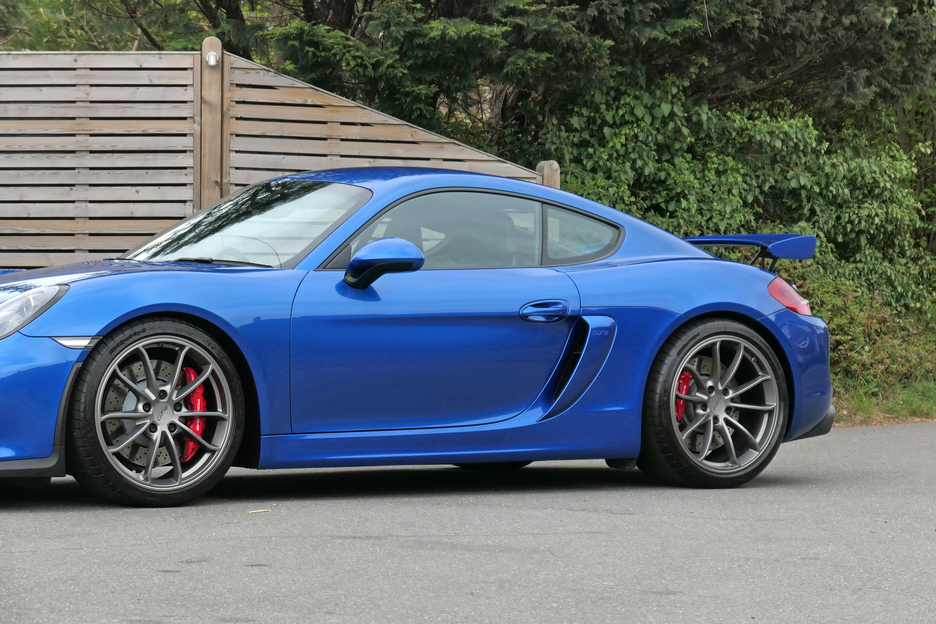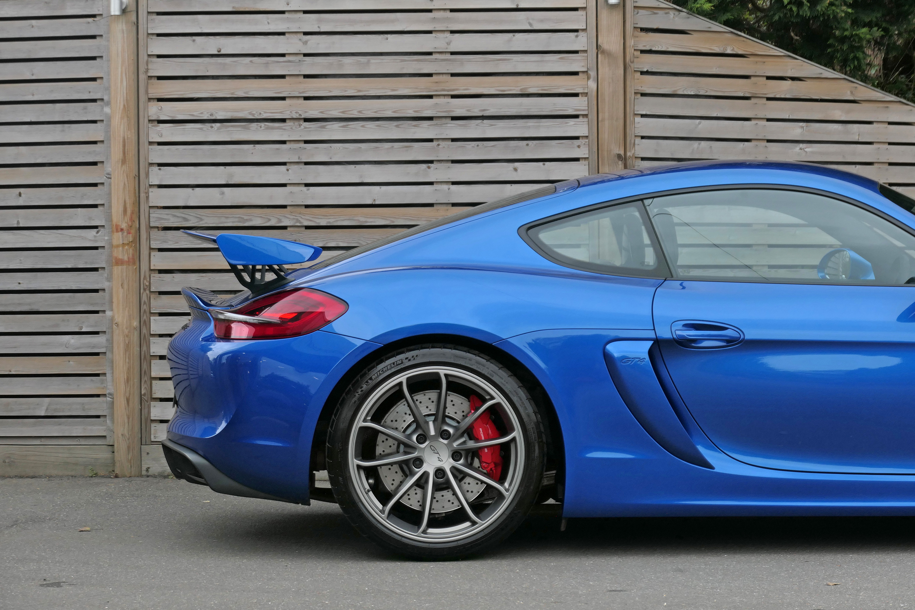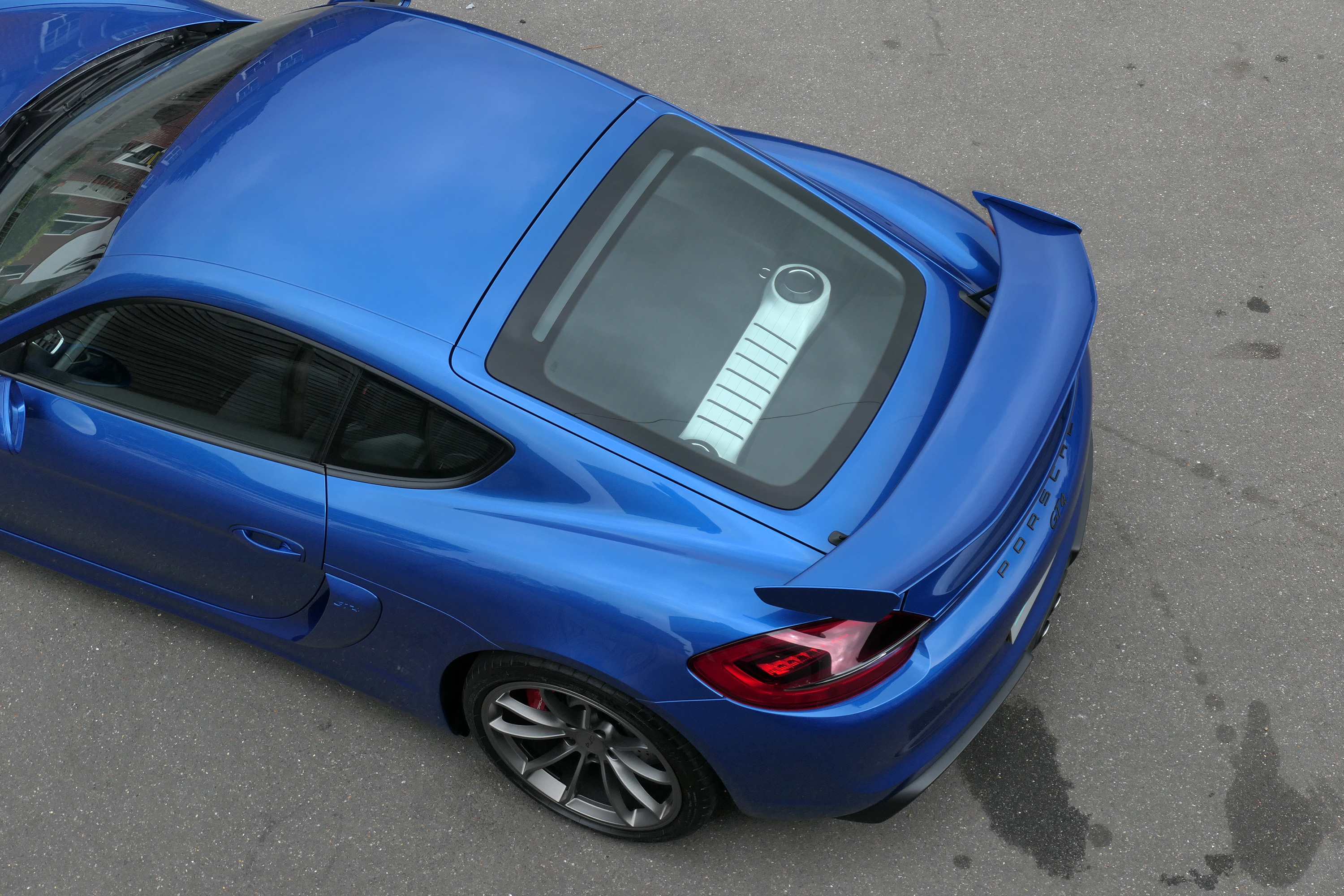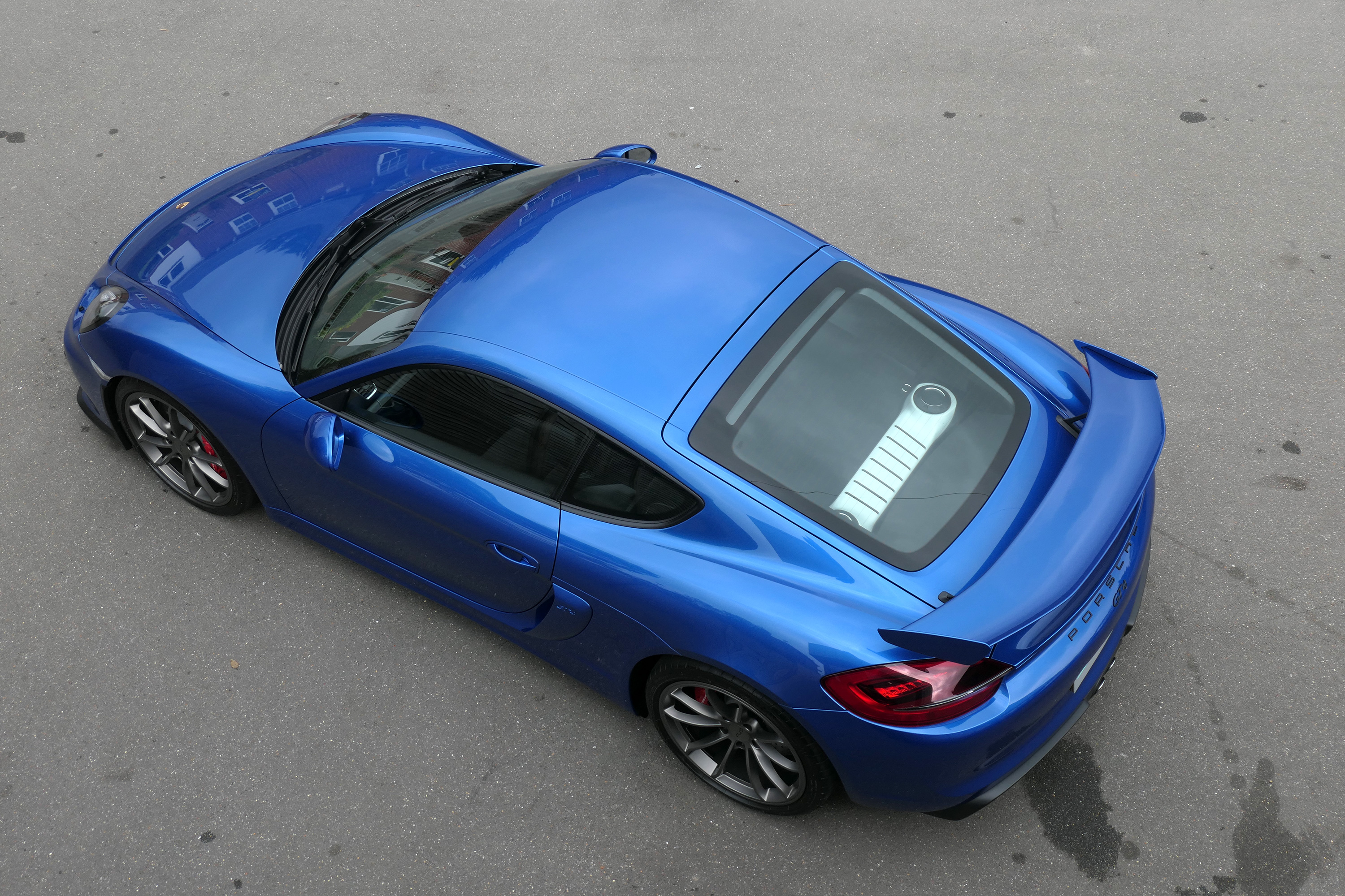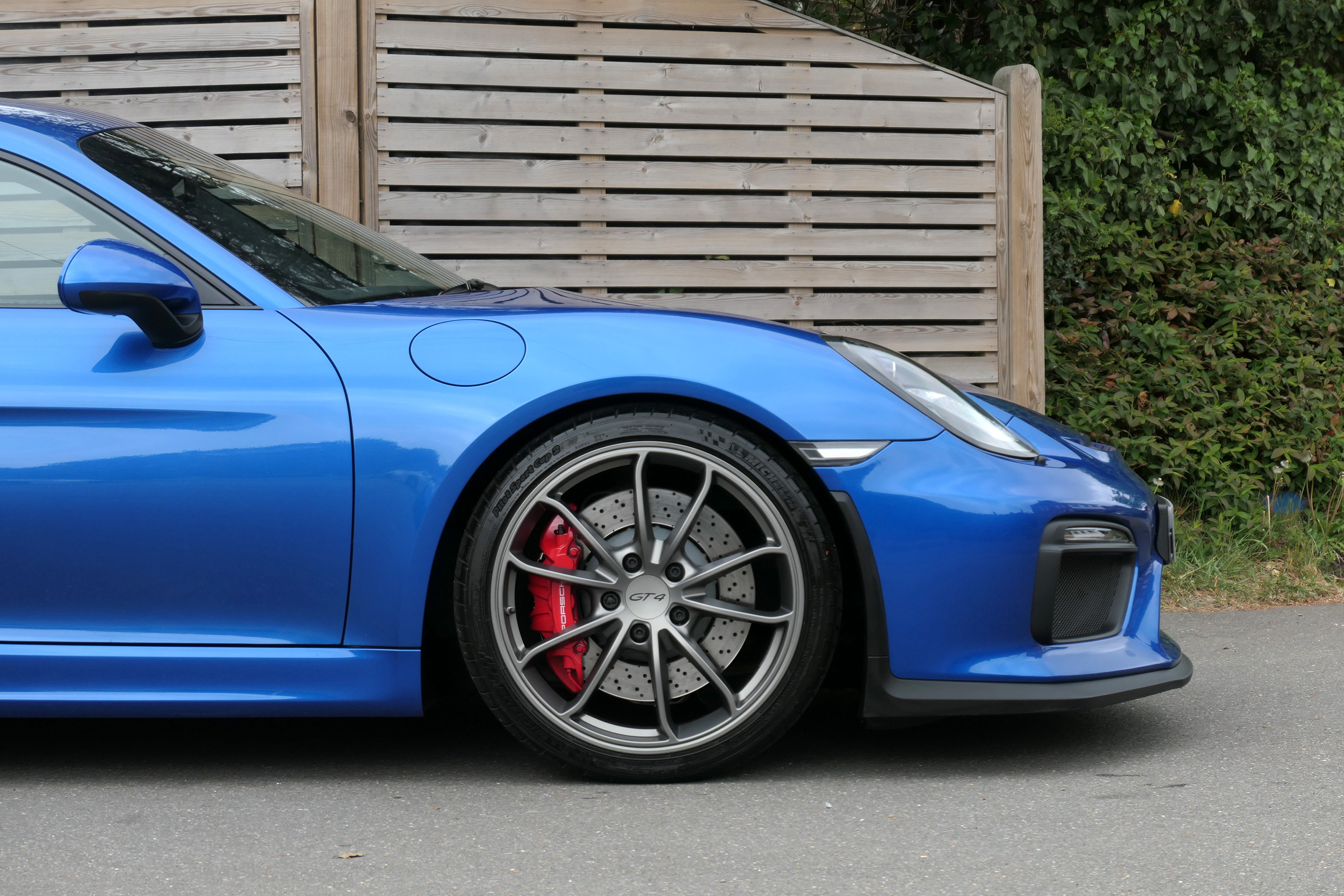 This Cayman GT4 has the 6-speed manual gearbox and is presented in Sapphire Blue with black 918 bucket seats.