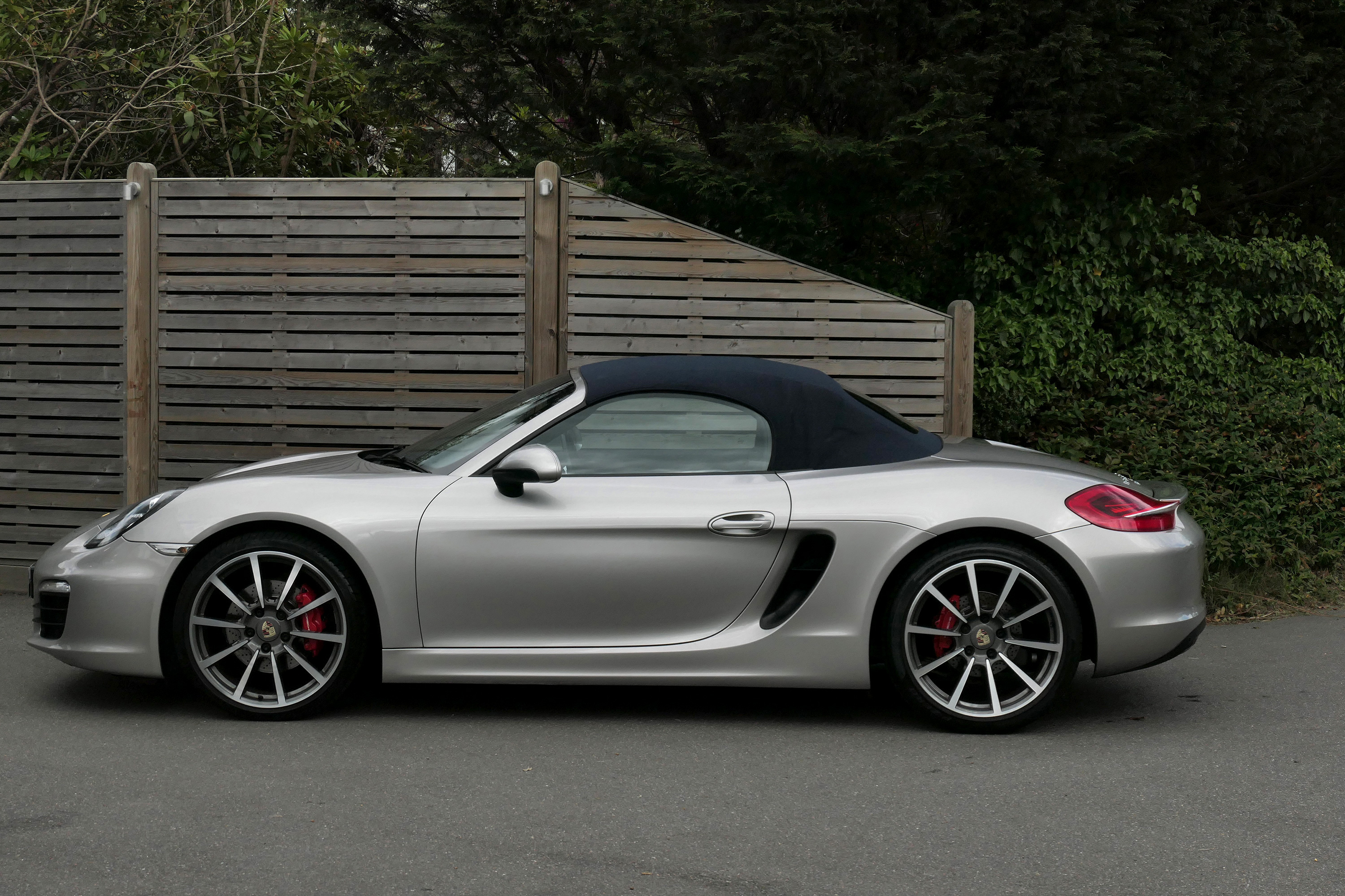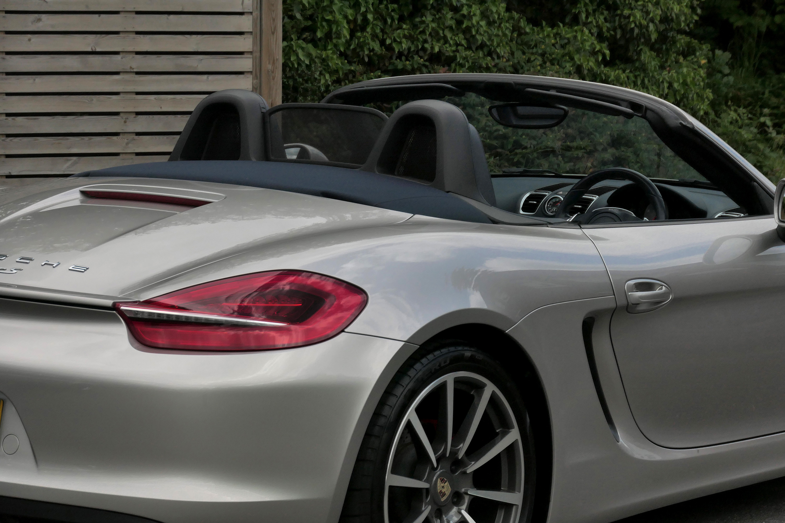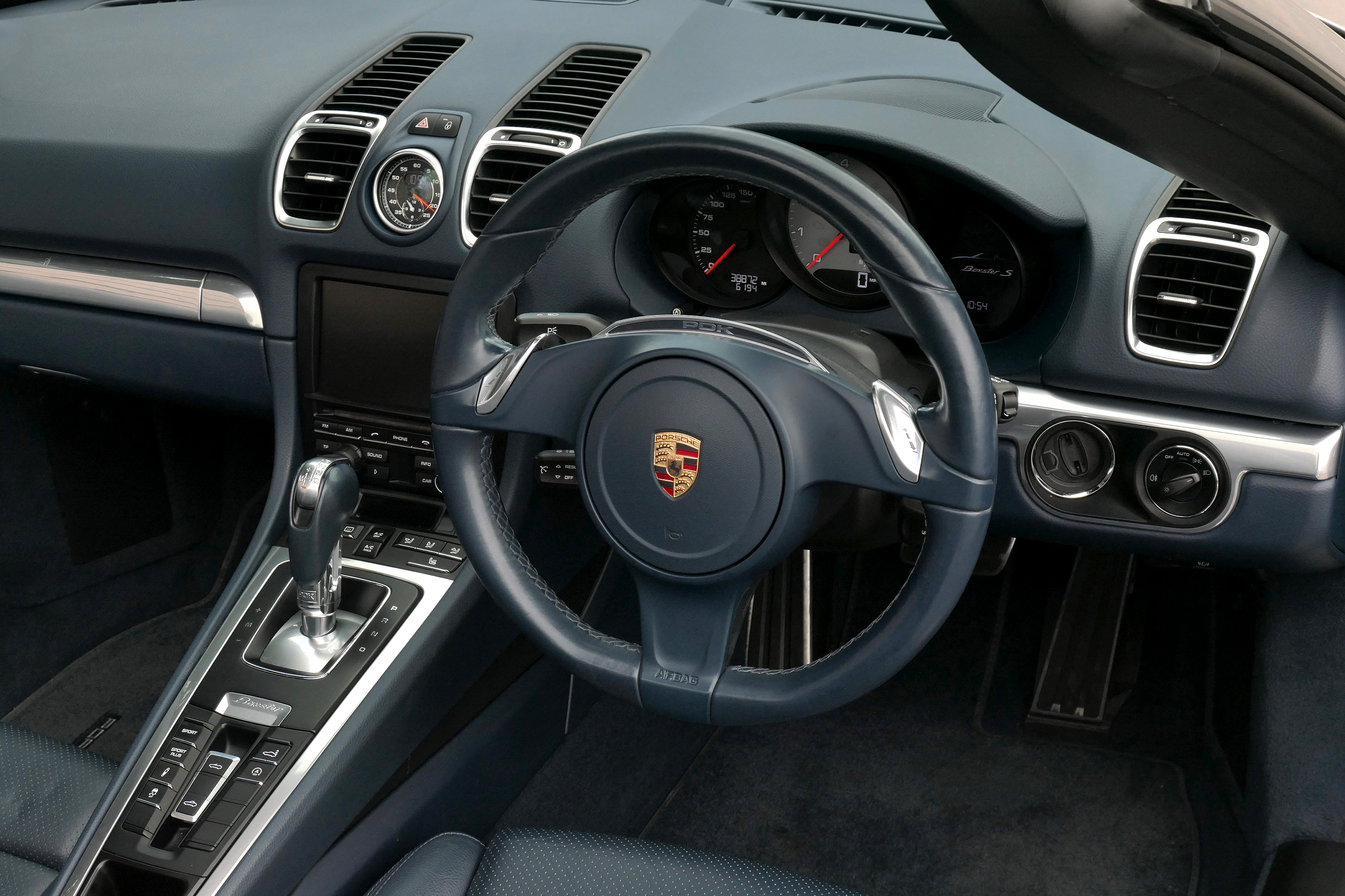 This Boxster S (981) has the 7-speed PDK gearbox and is presented in Platinum Silver with blue leather seats and a dark blue power hood.