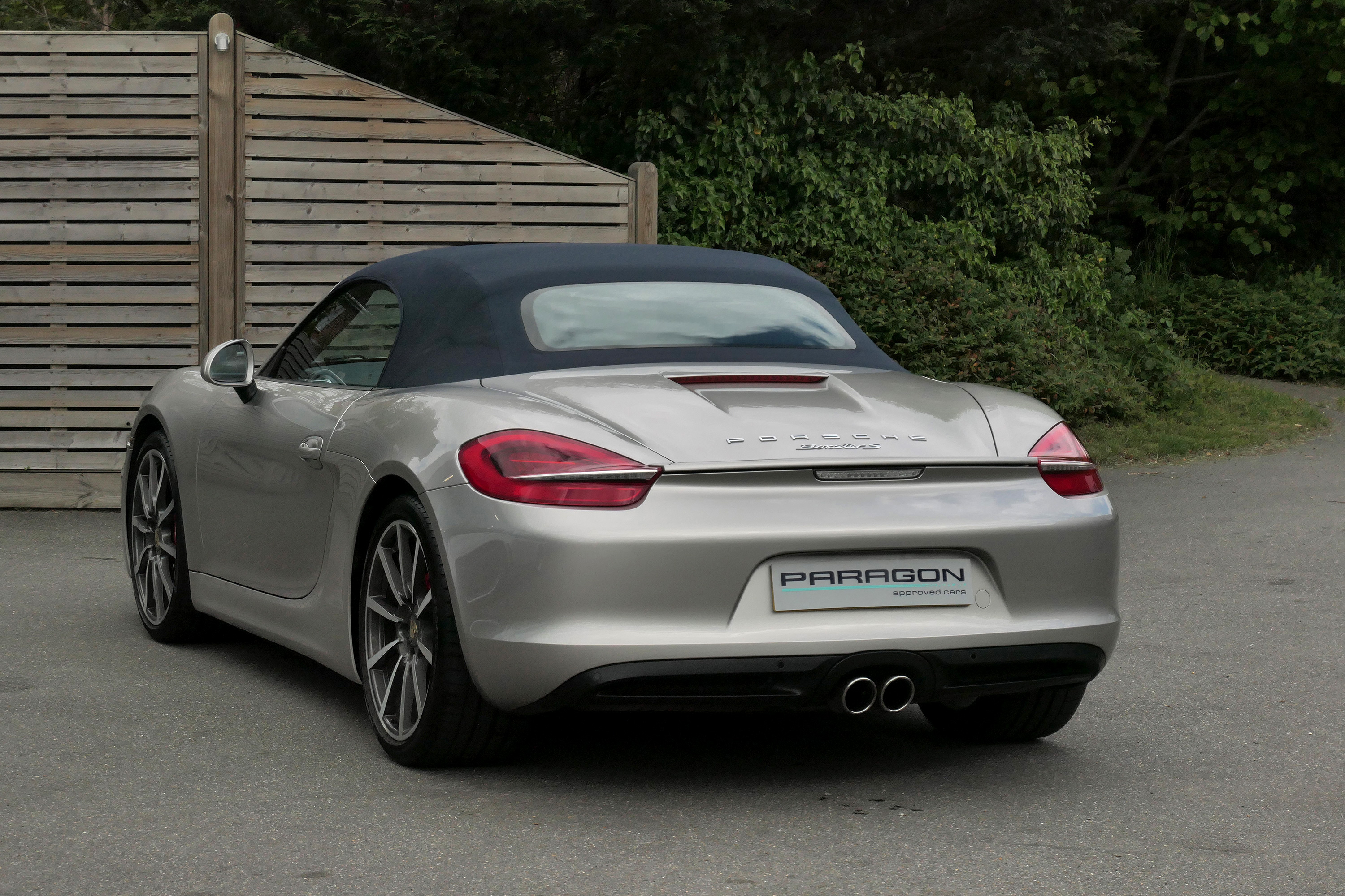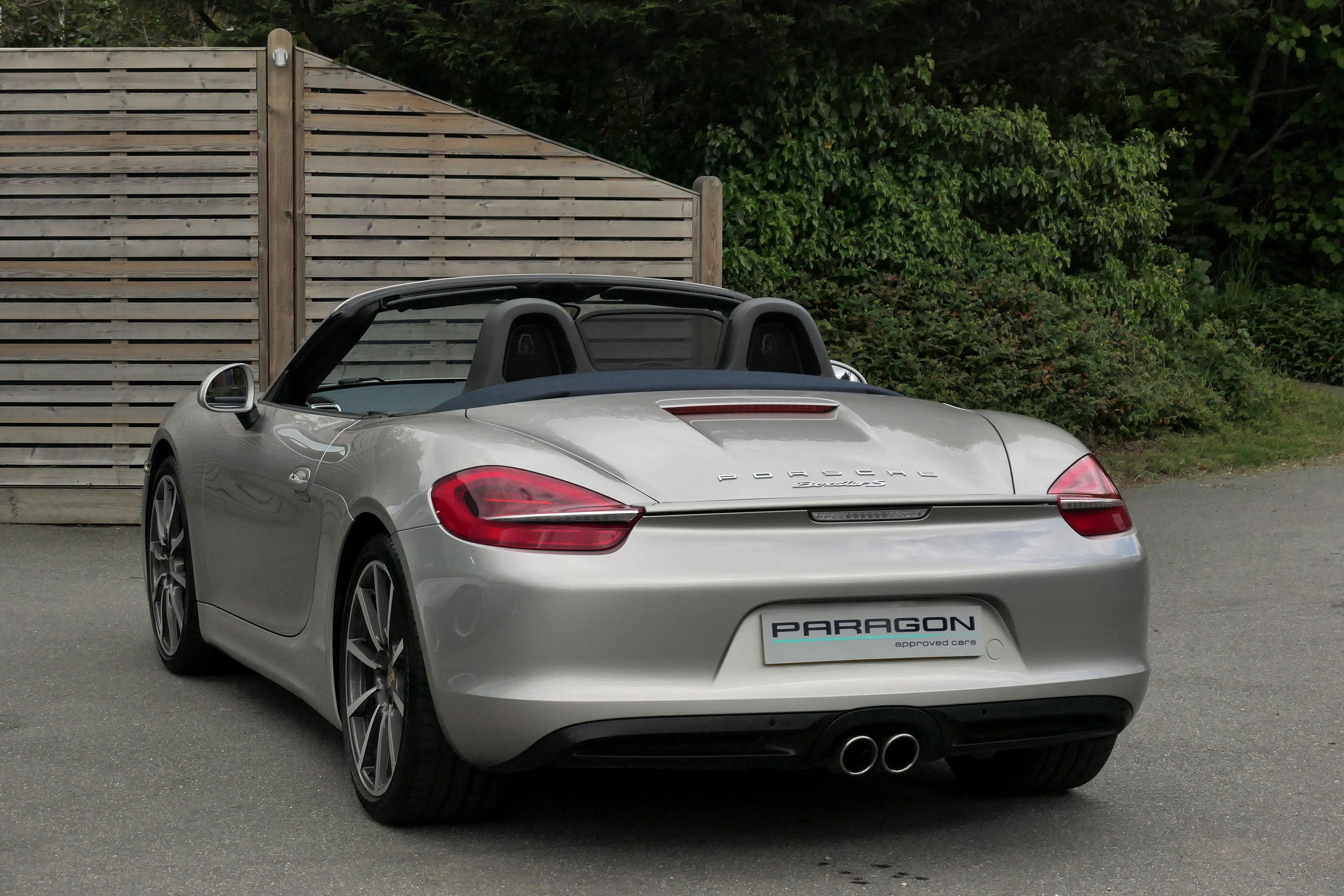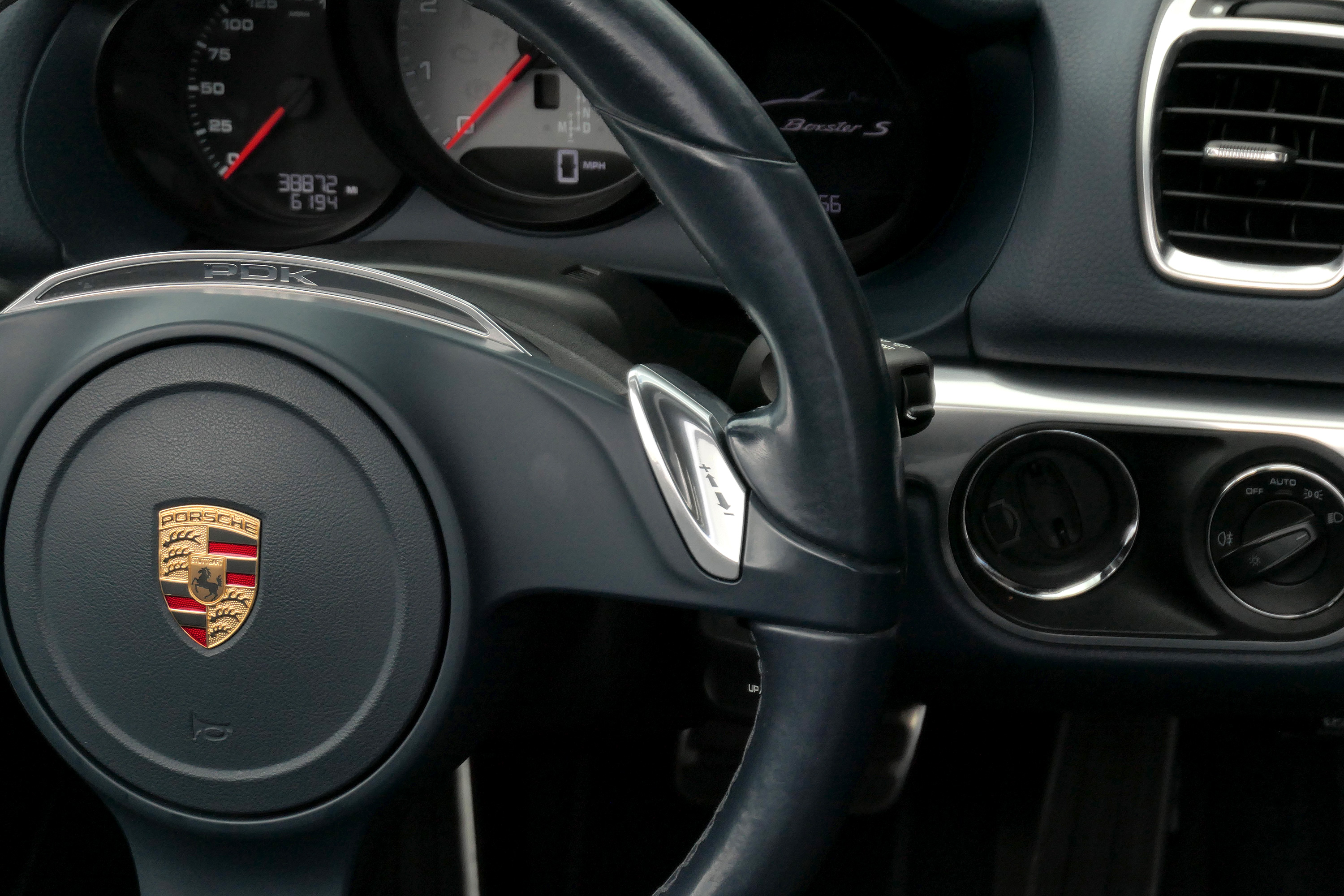 This Boxster S (981) has the 7-speed PDK gearbox and is presented in Platinum Silver with blue leather seats and a dark blue power hood.