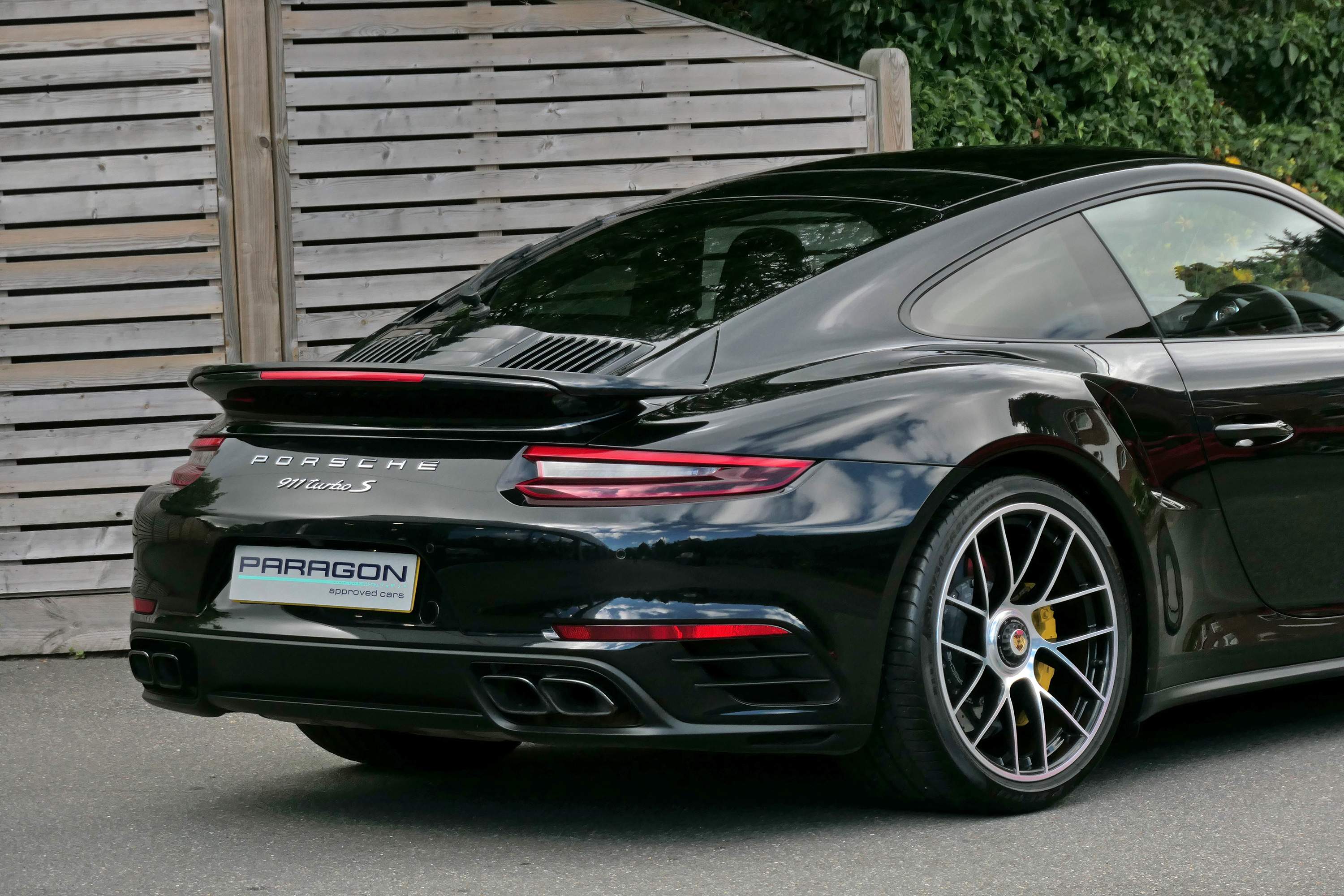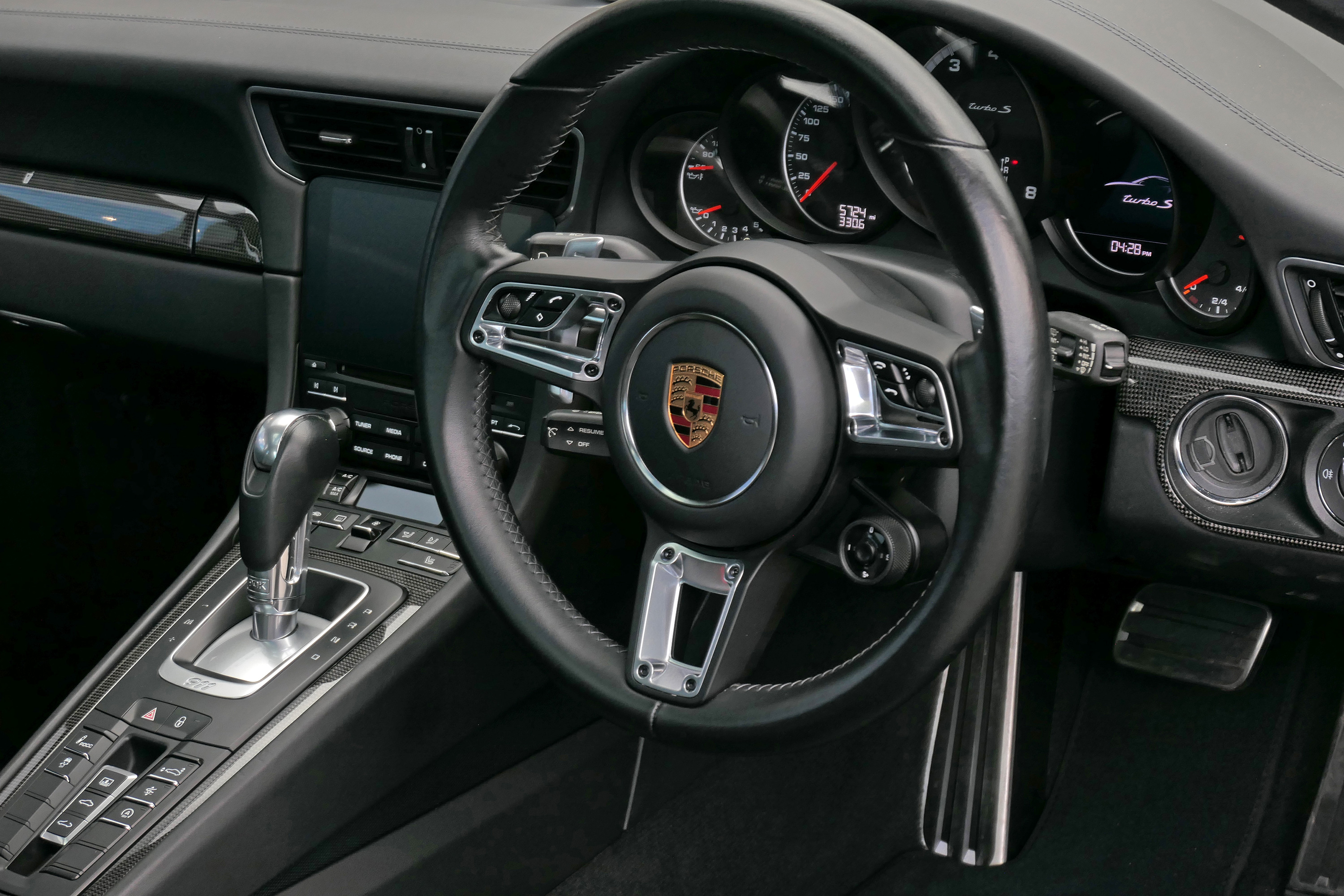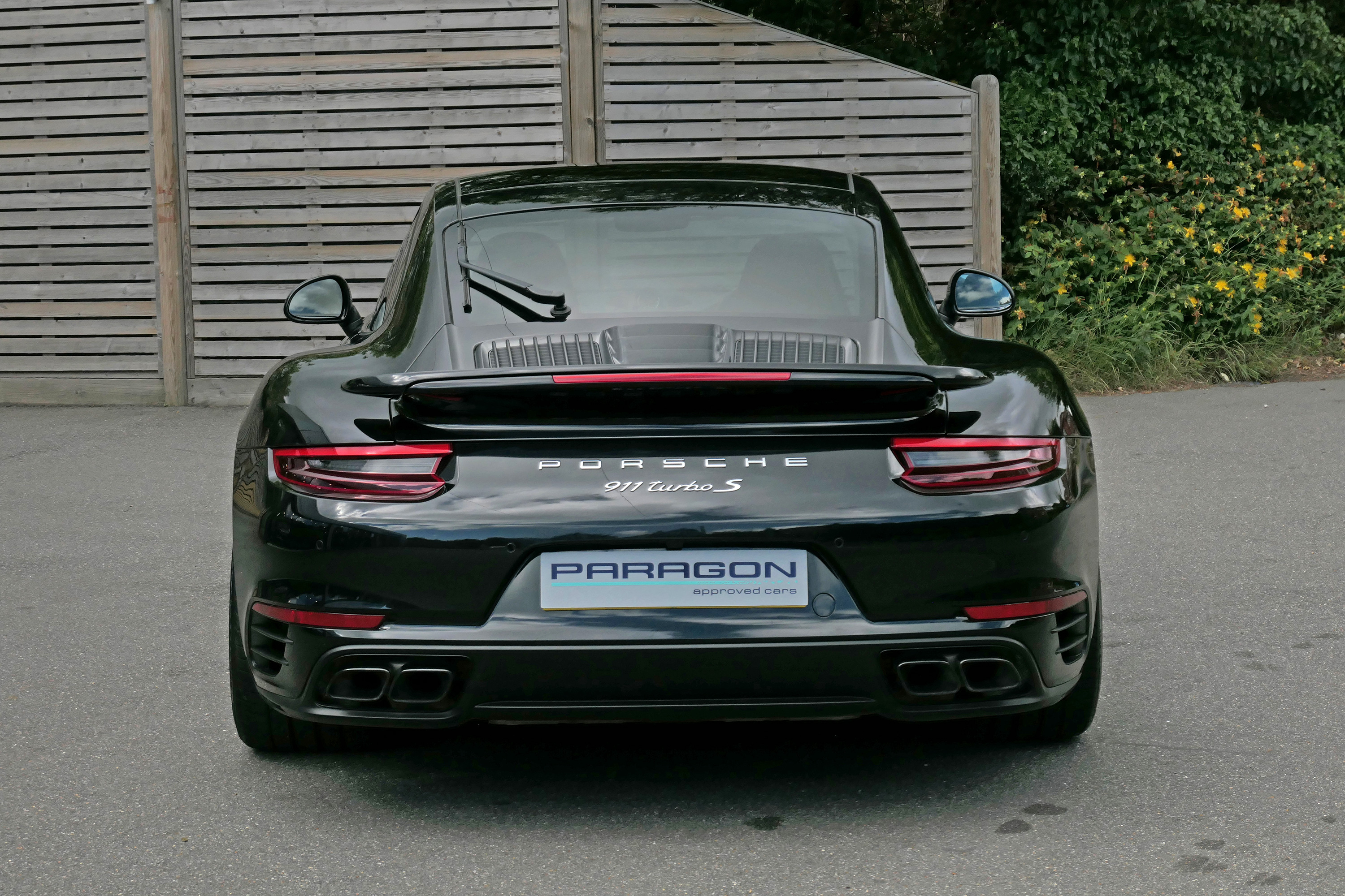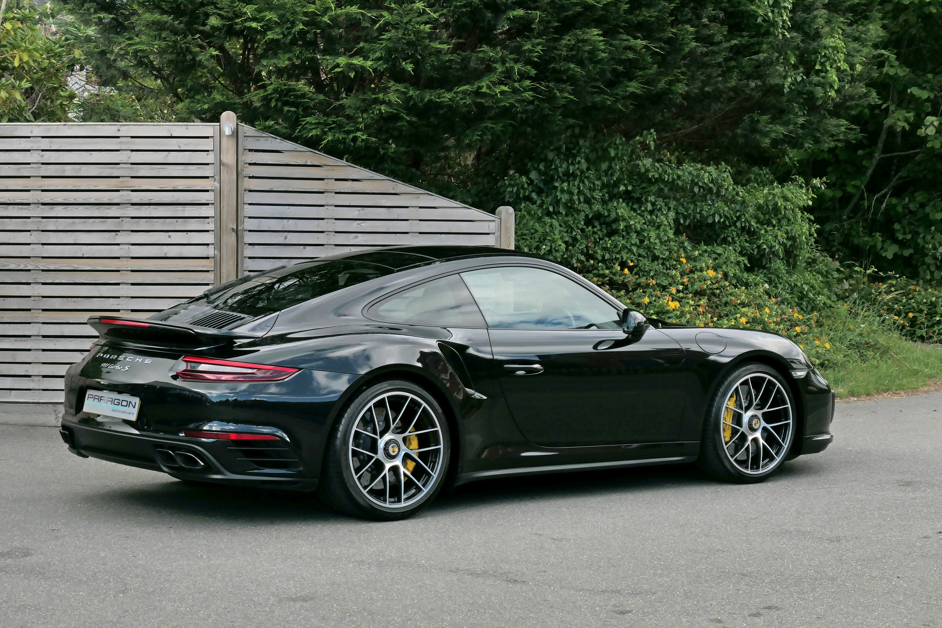 This 911 Turbo S (991) has the 7-speed PDK gearbox and is presented in Jet Black Metallic with black leather sport seats.