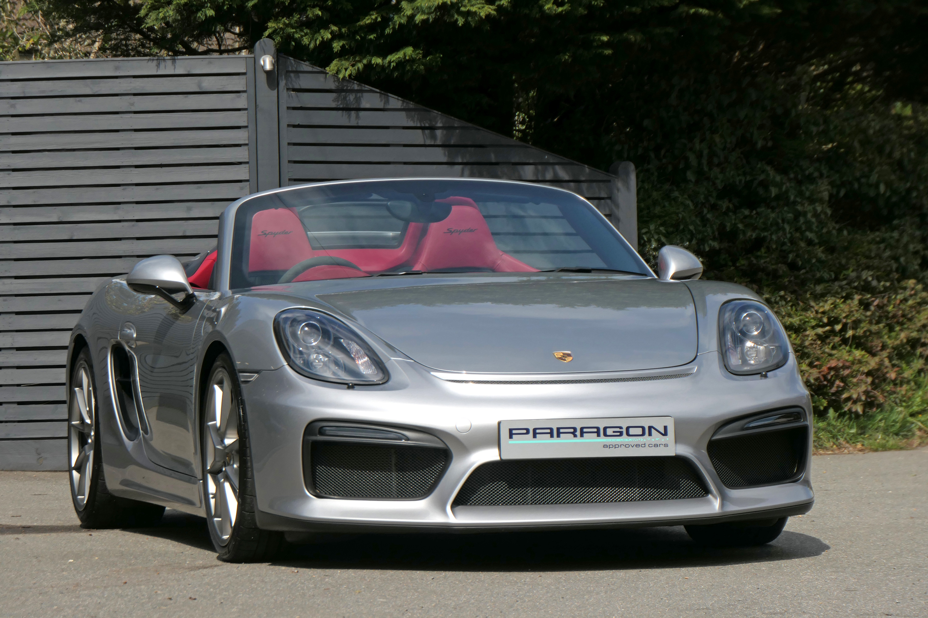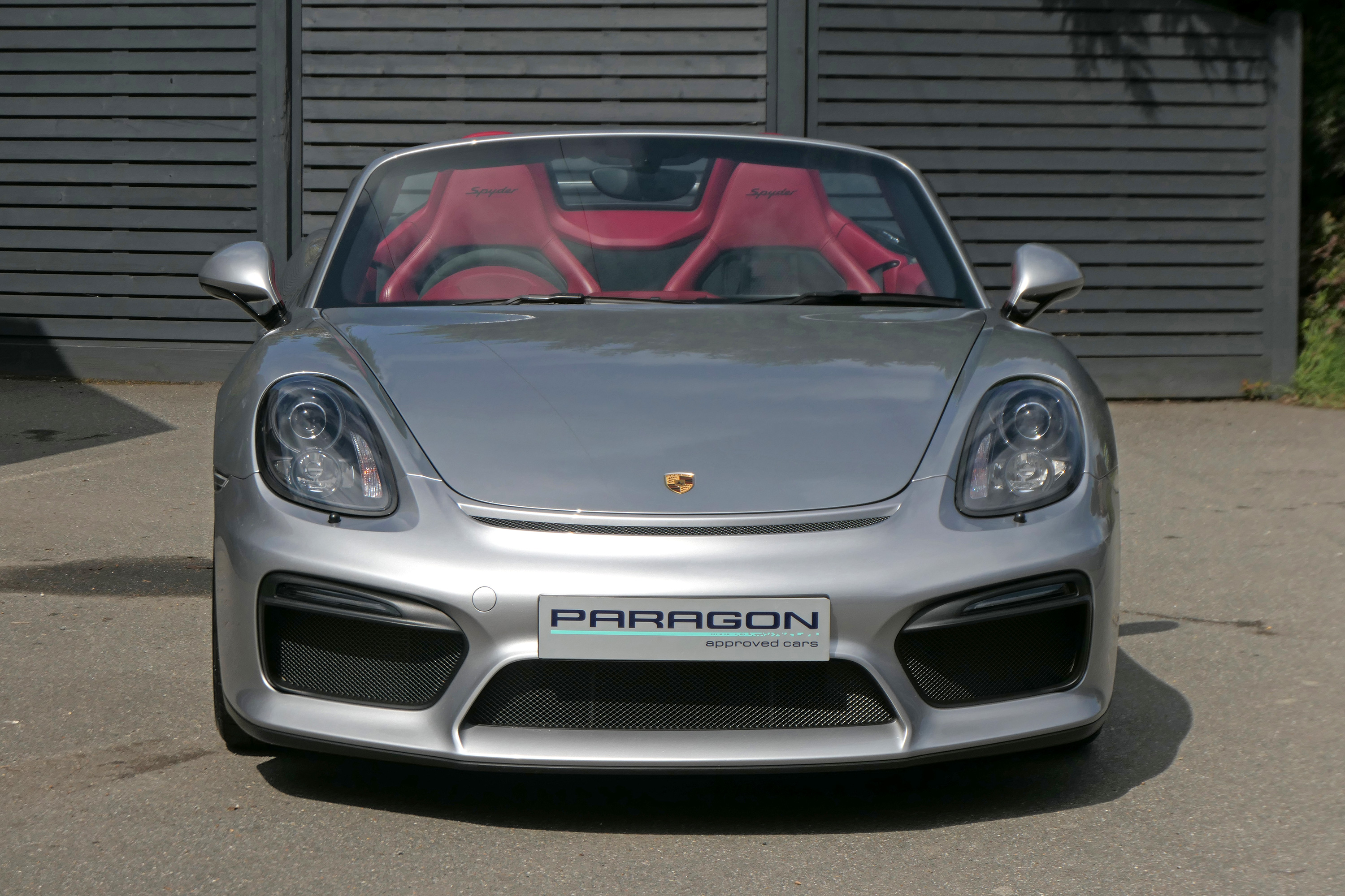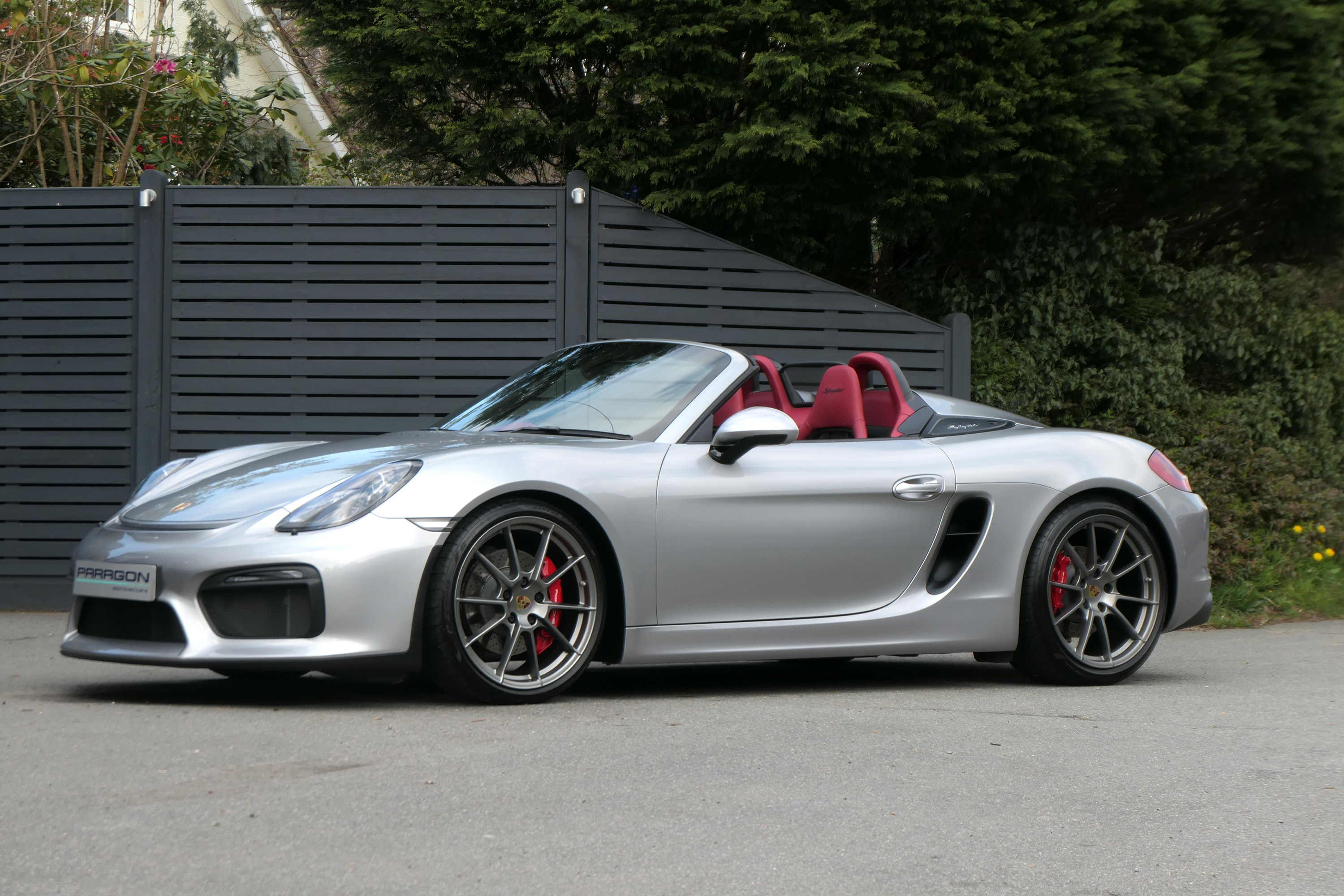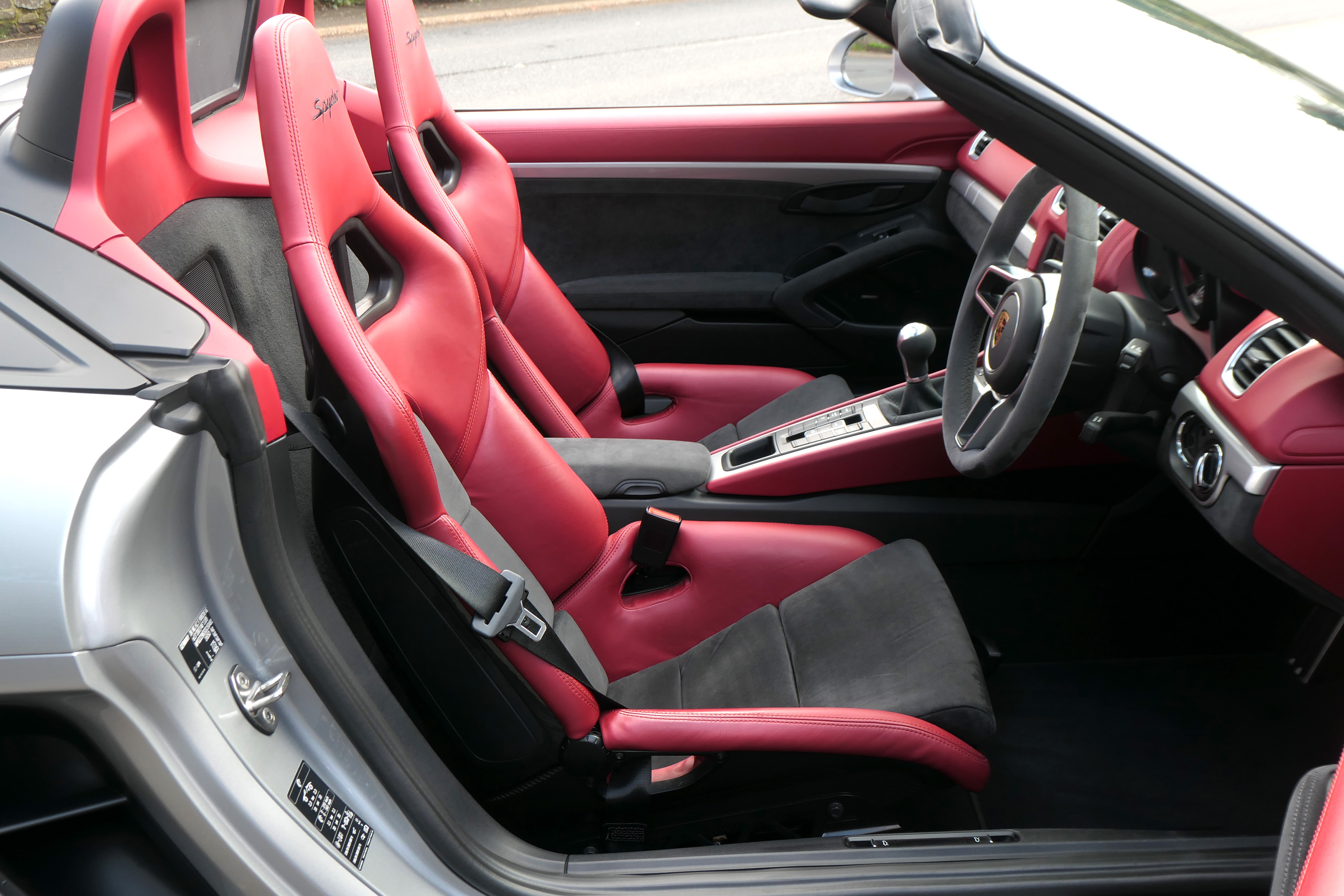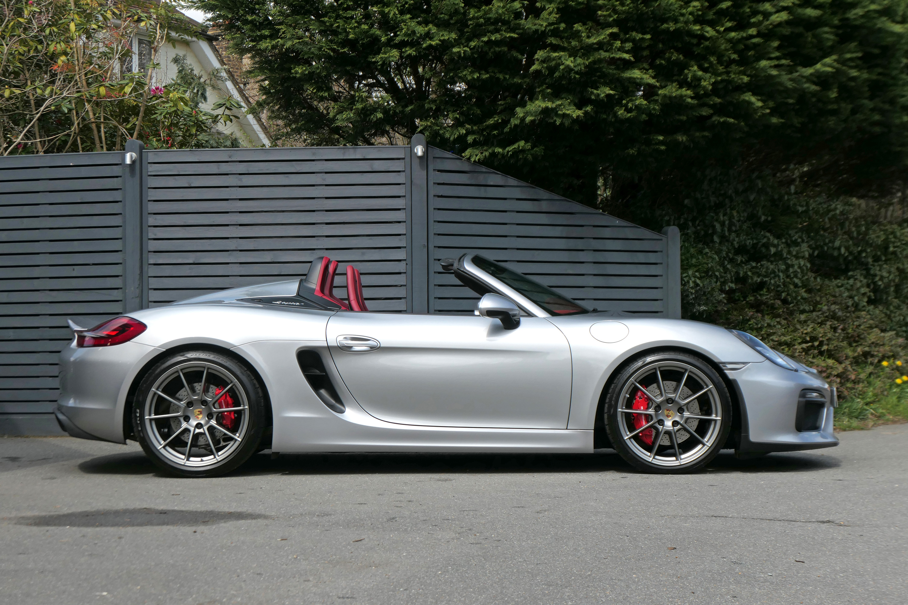 This Boxster Spyder (981) has the 6-speed manual gearbox and is presented in GT Silver with a Boxster Spyder Classic Red leather interior.