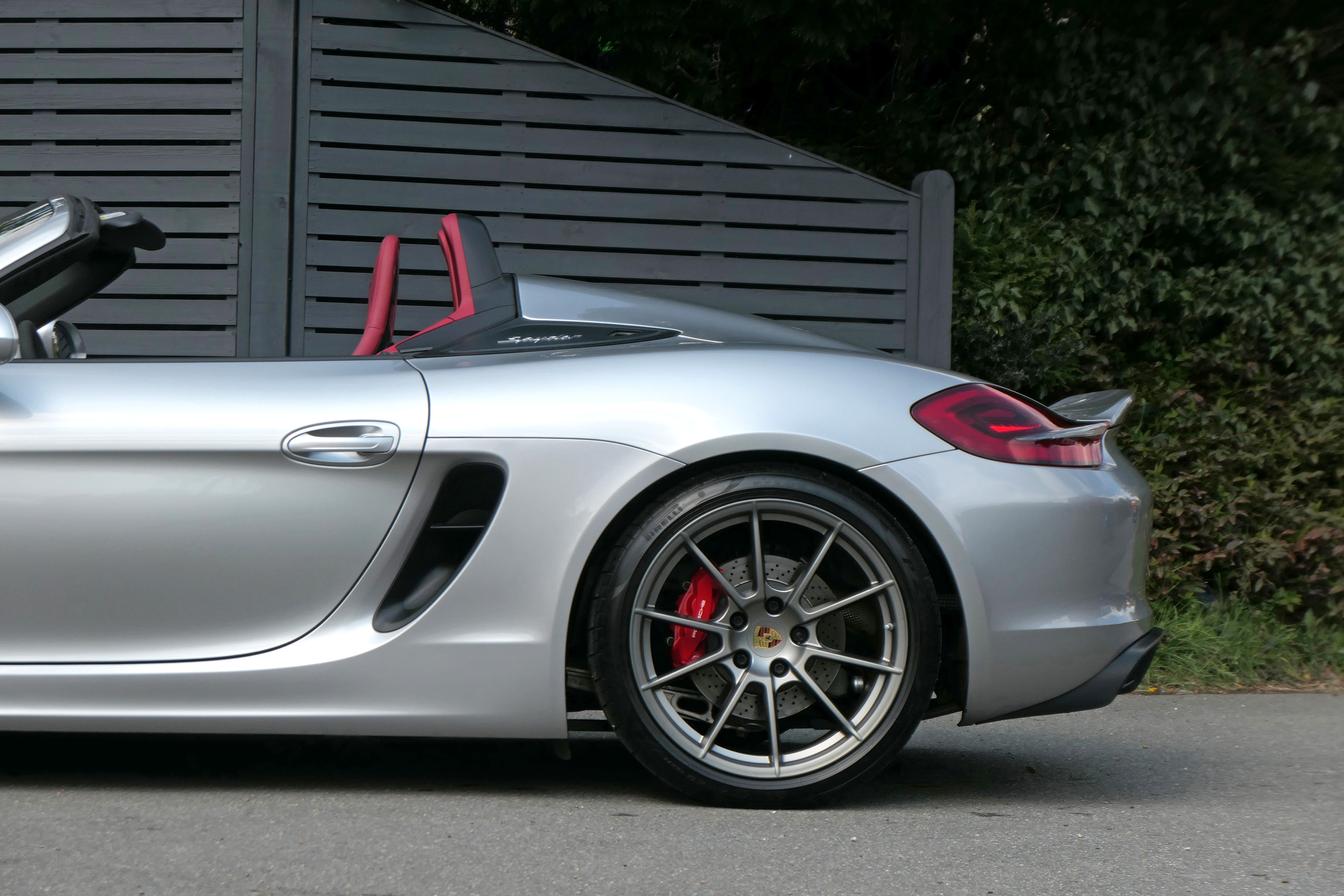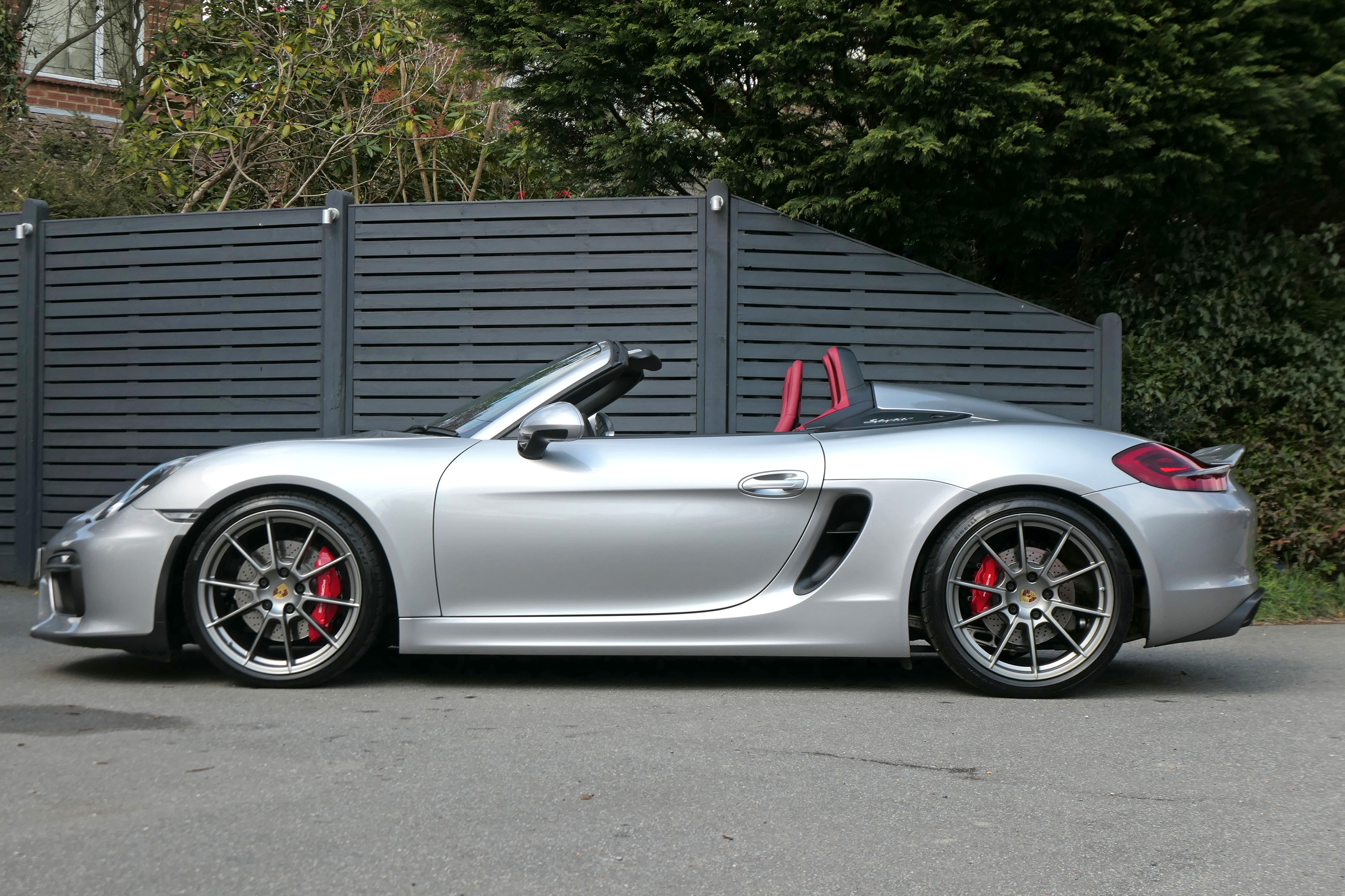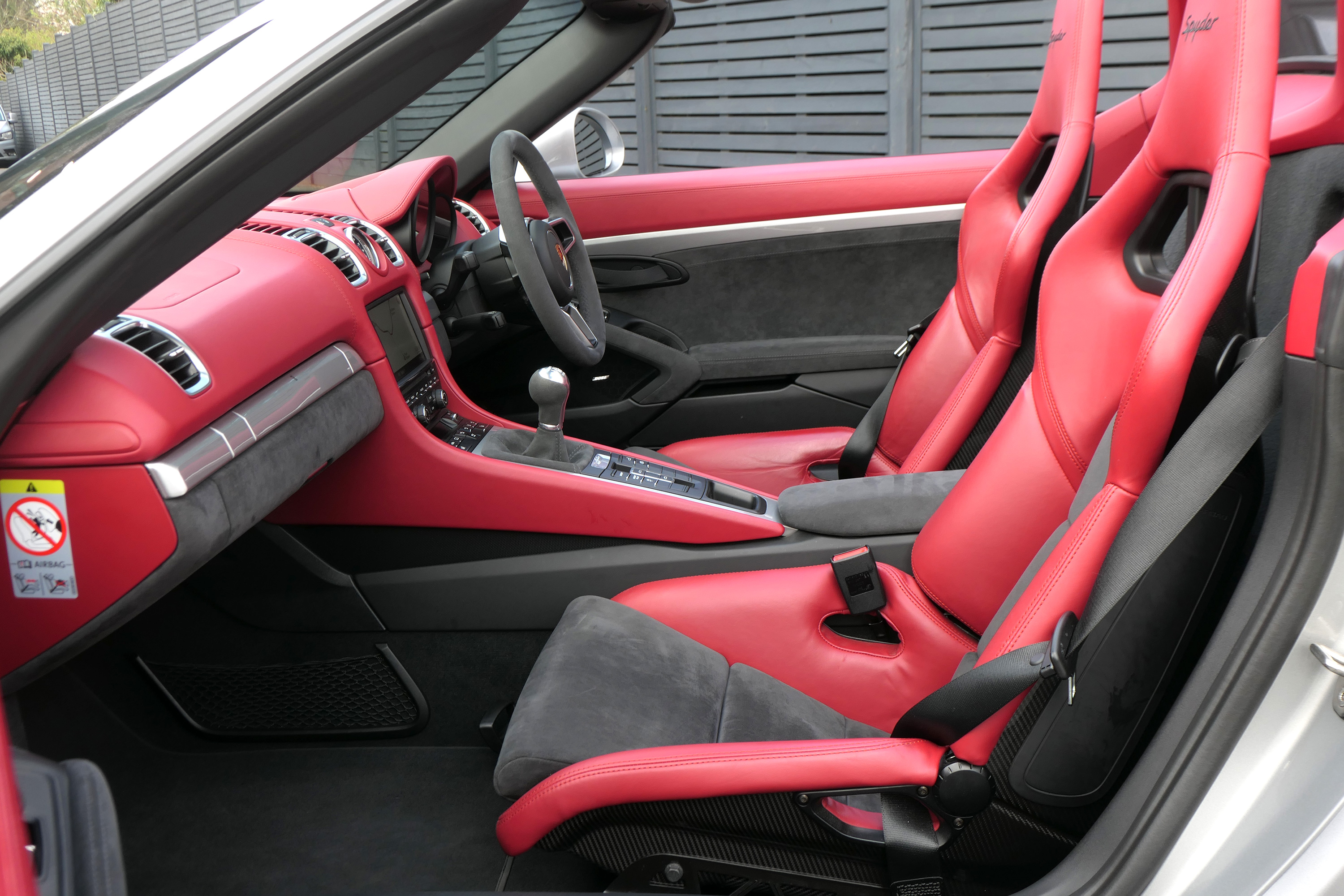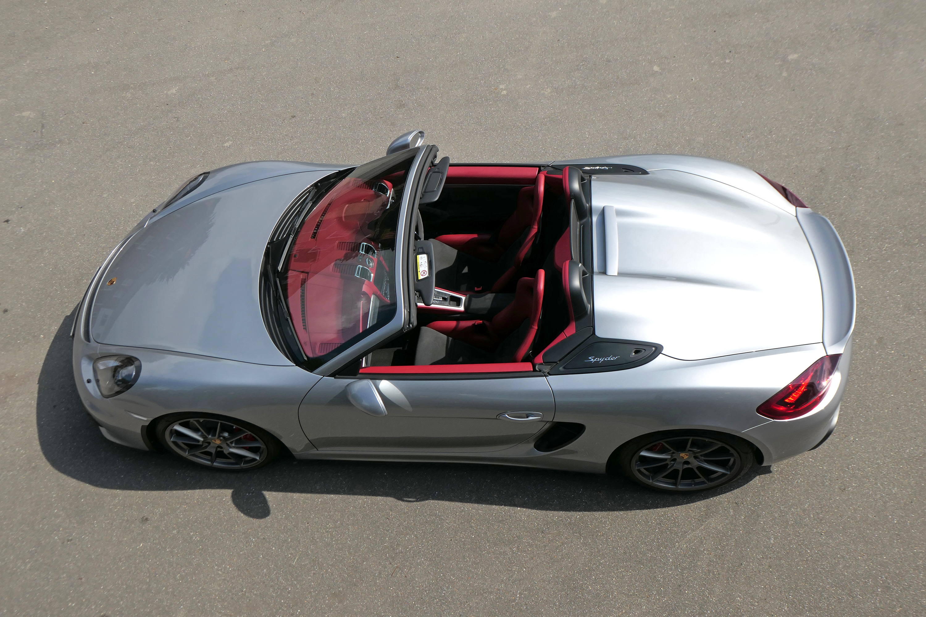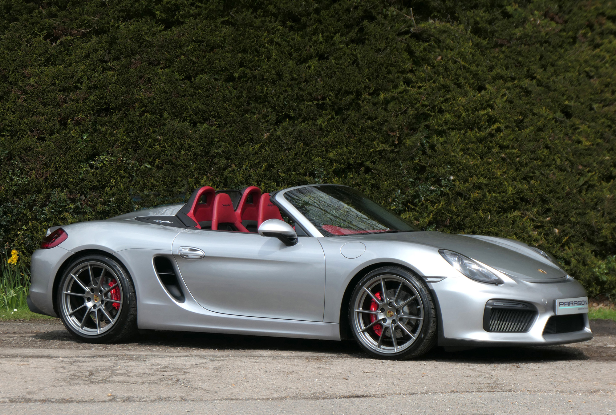 This Boxster Spyder (981) has the 6-speed manual gearbox and is presented in GT Silver with a Boxster Spyder Classic Red leather interior.