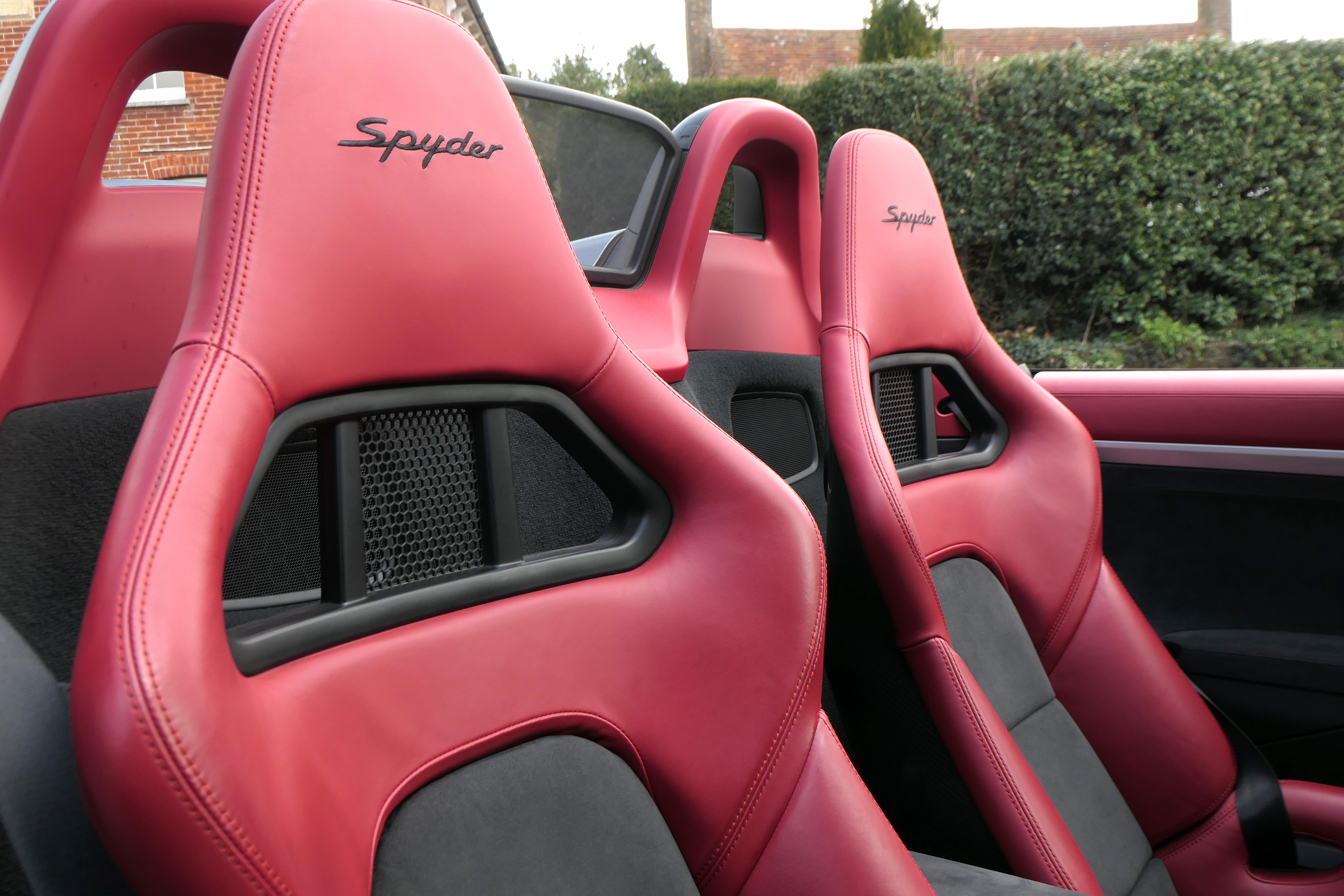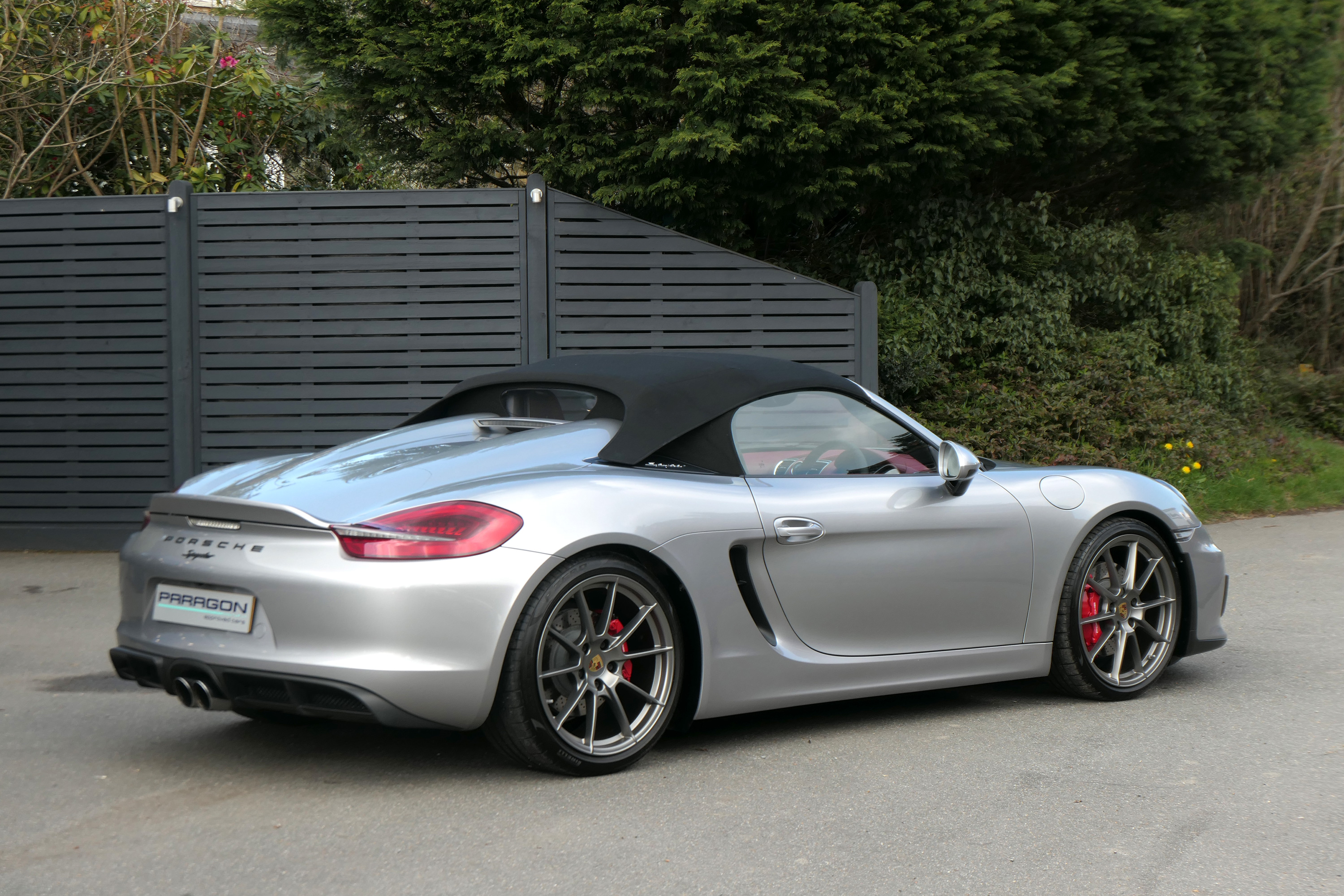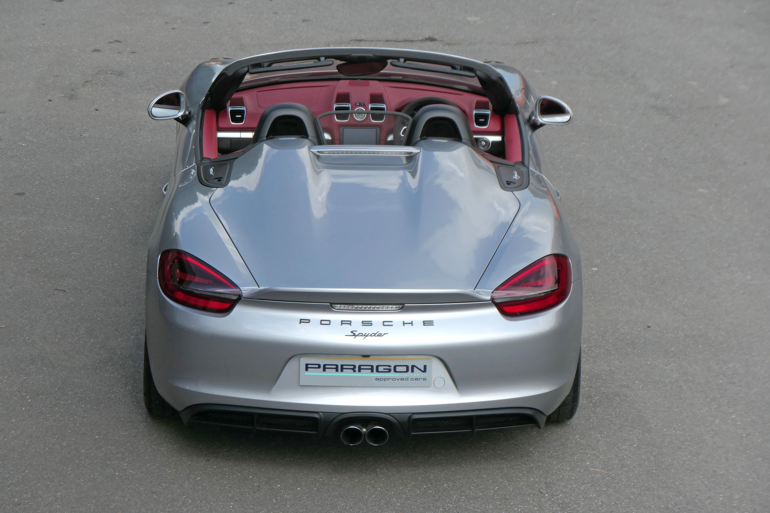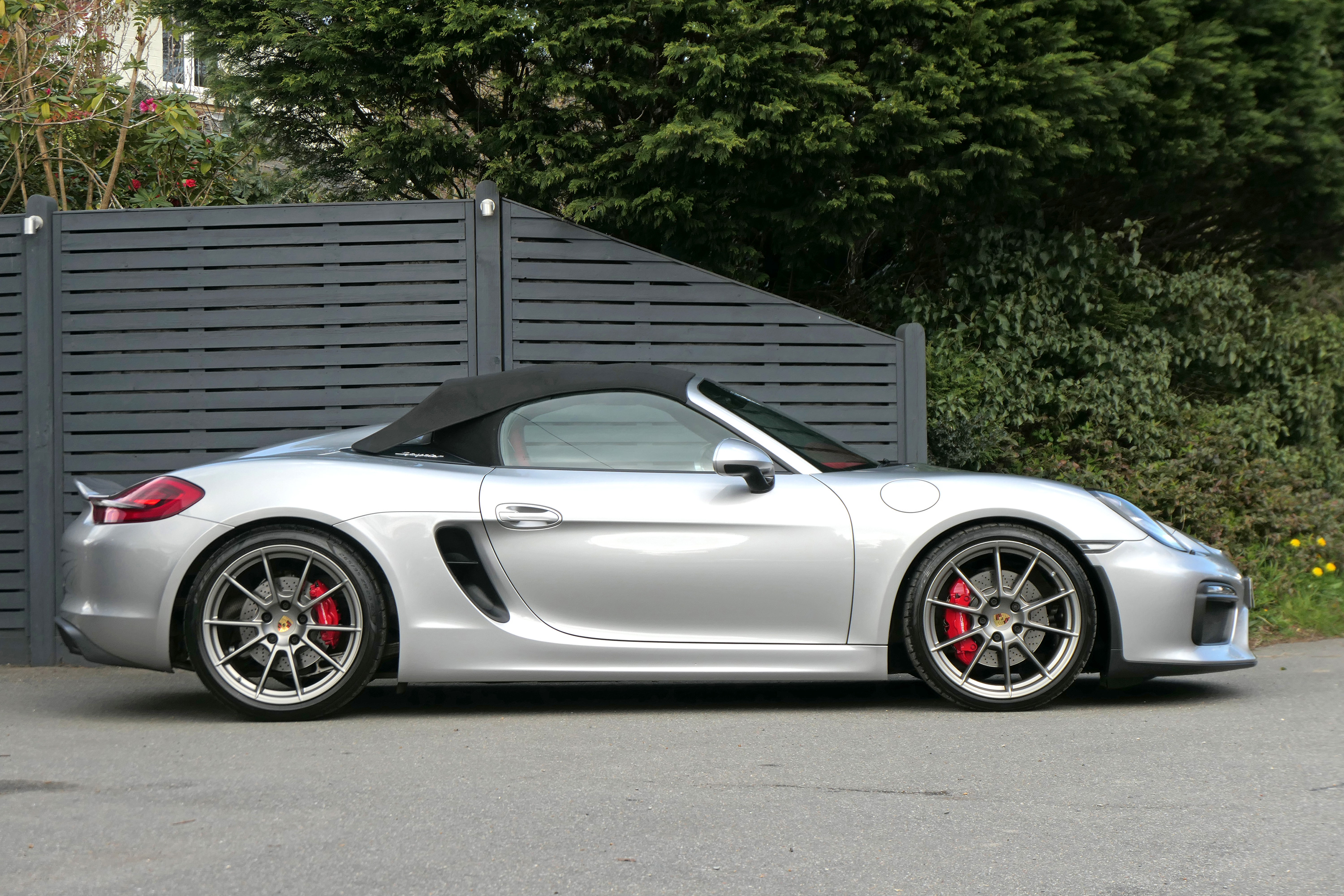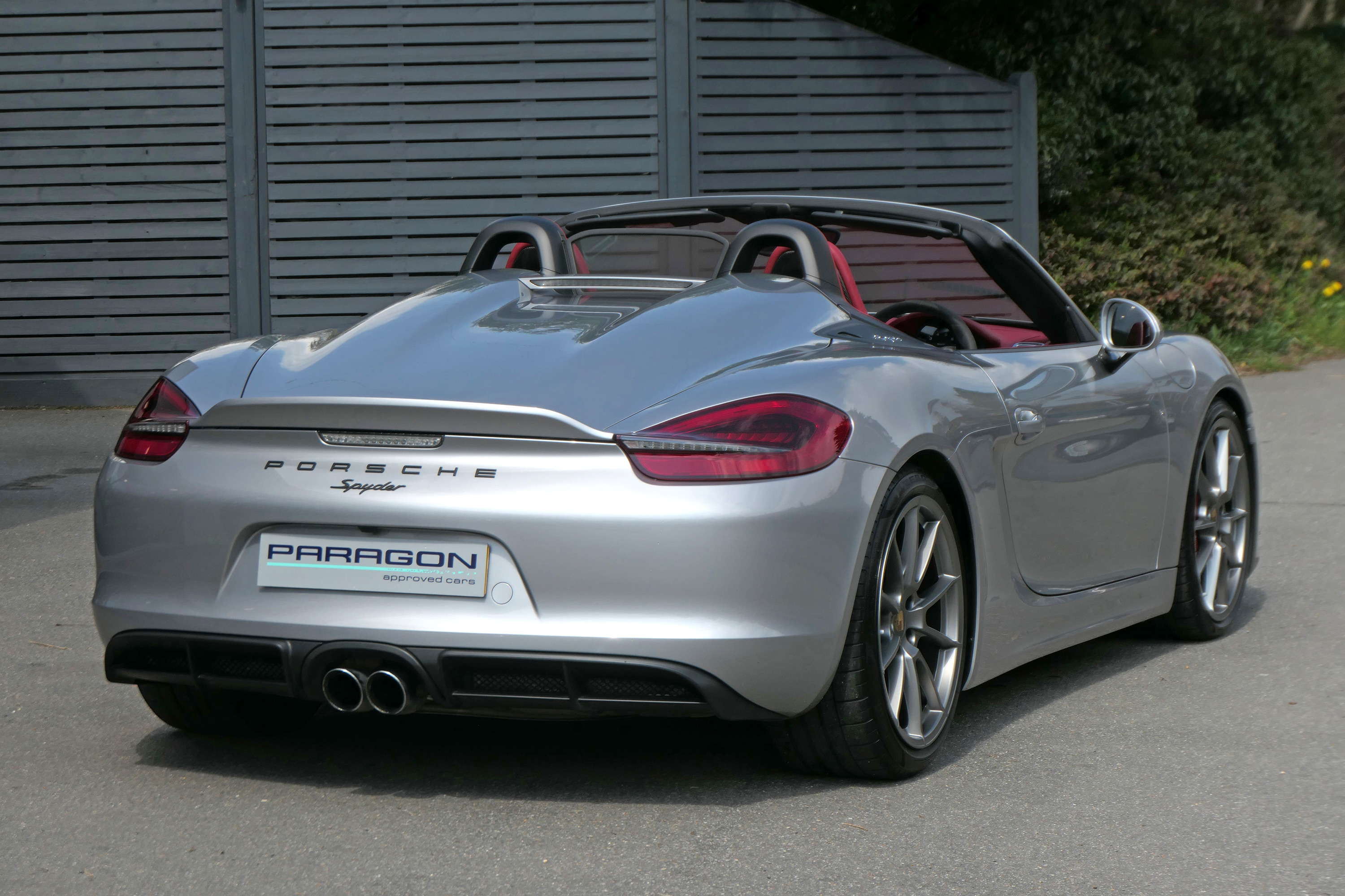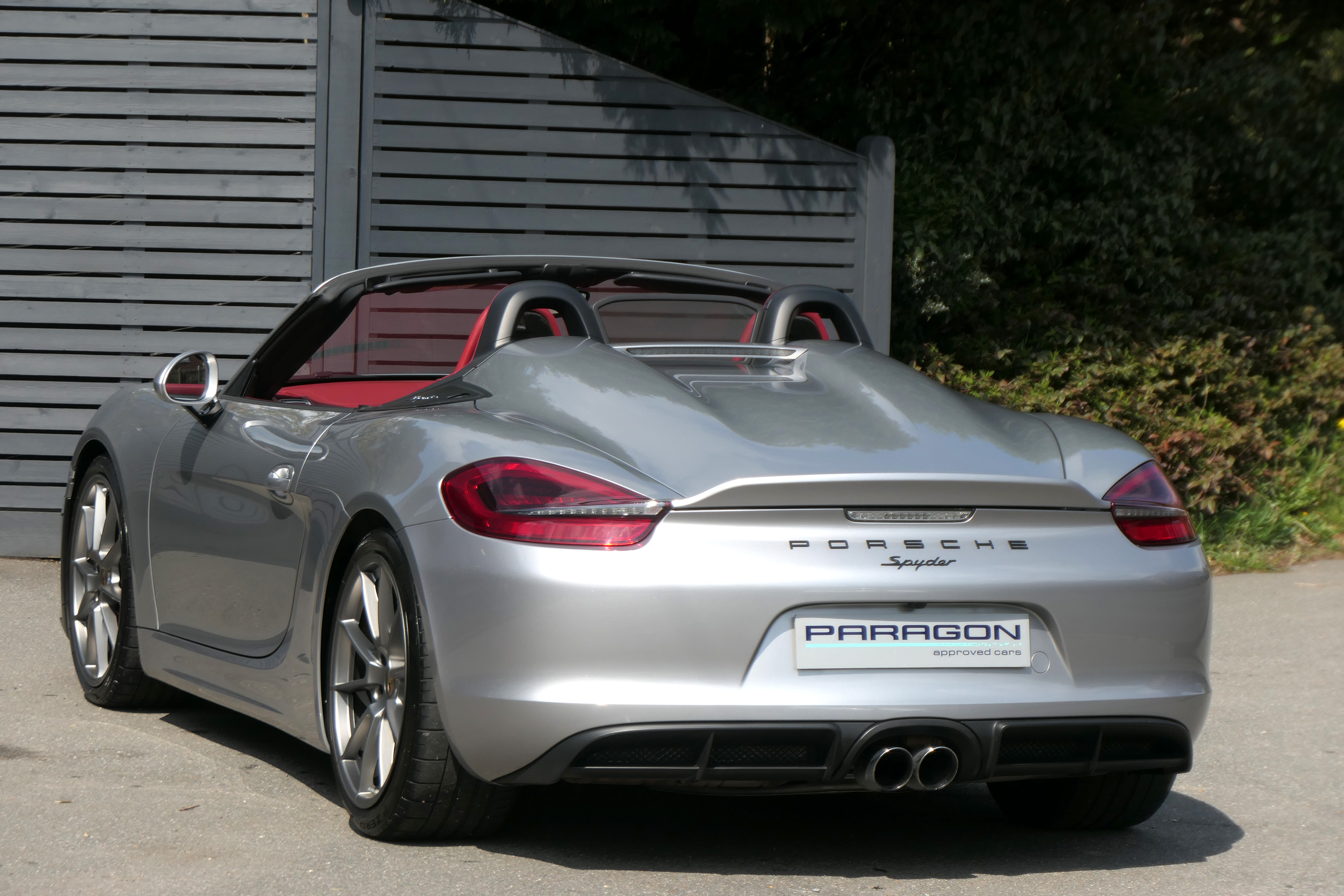 This Boxster Spyder (981) has the 6-speed manual gearbox and is presented in GT Silver with a Boxster Spyder Classic Red leather interior.