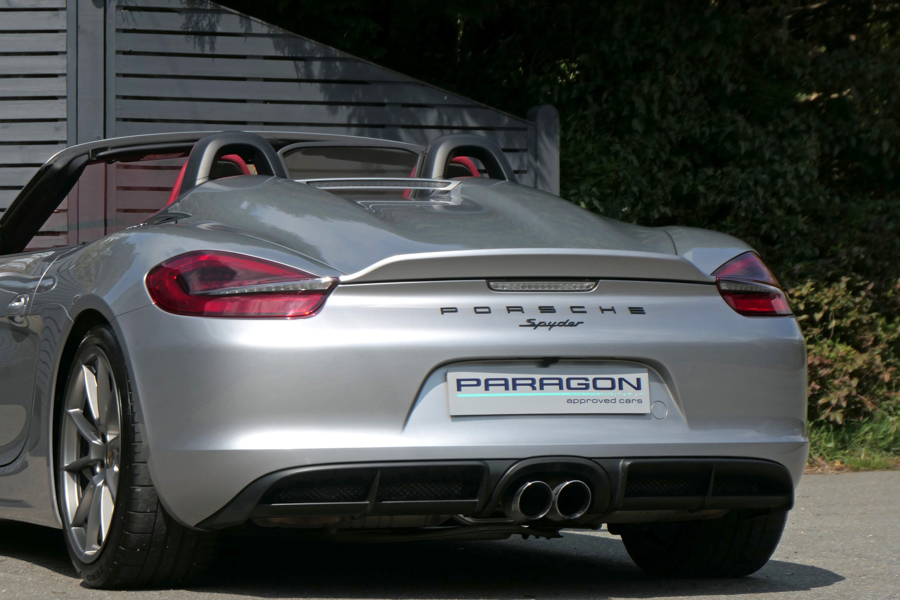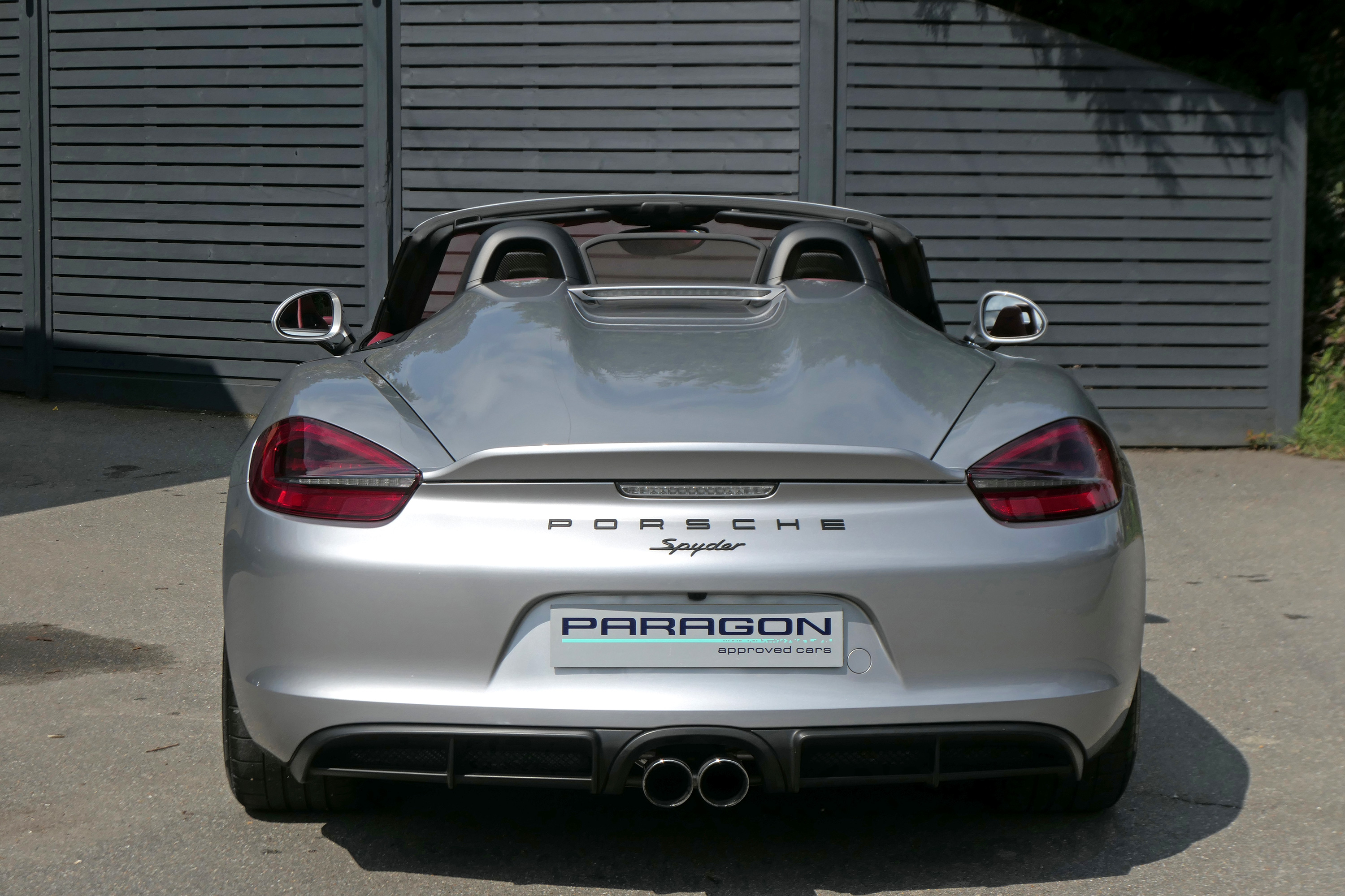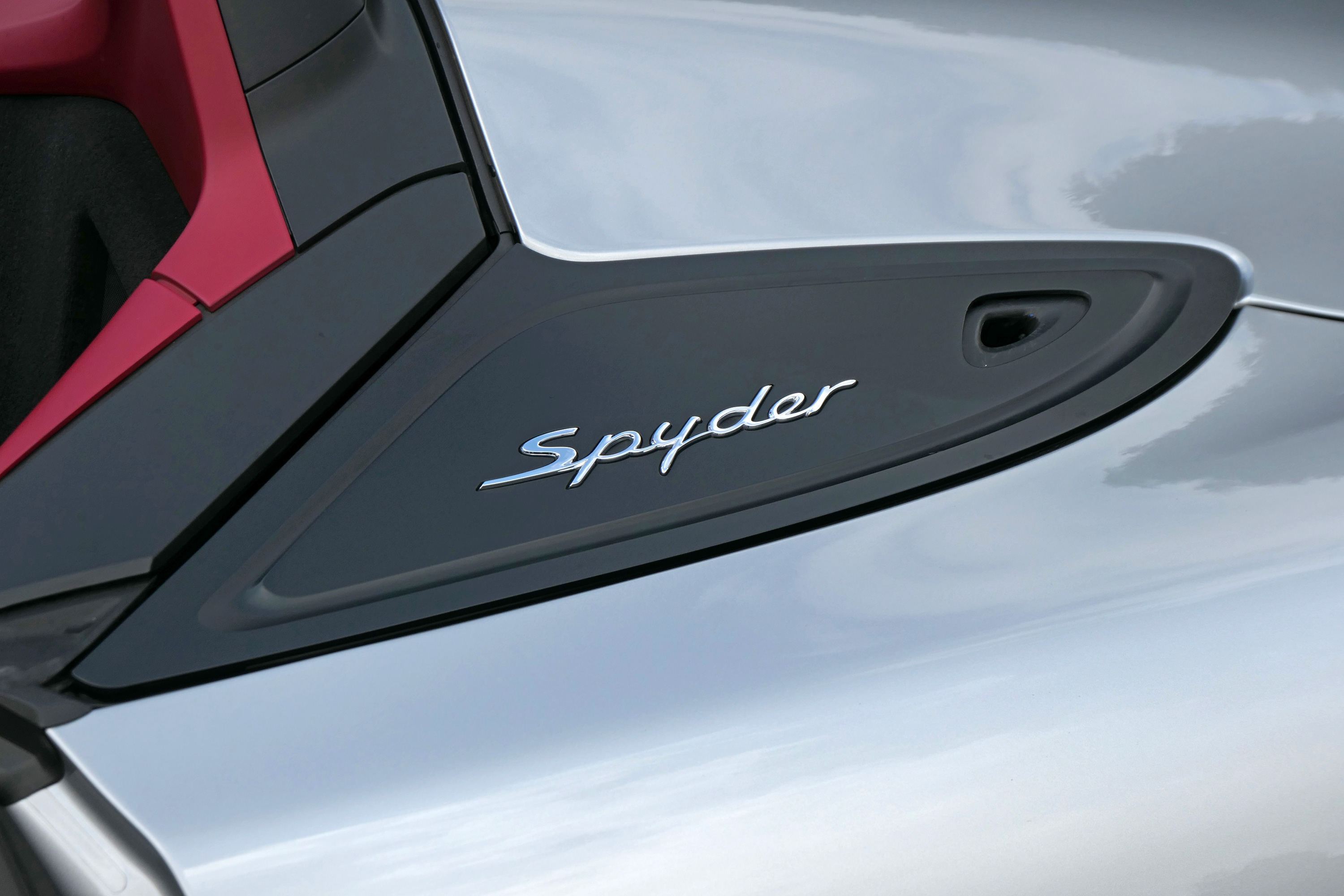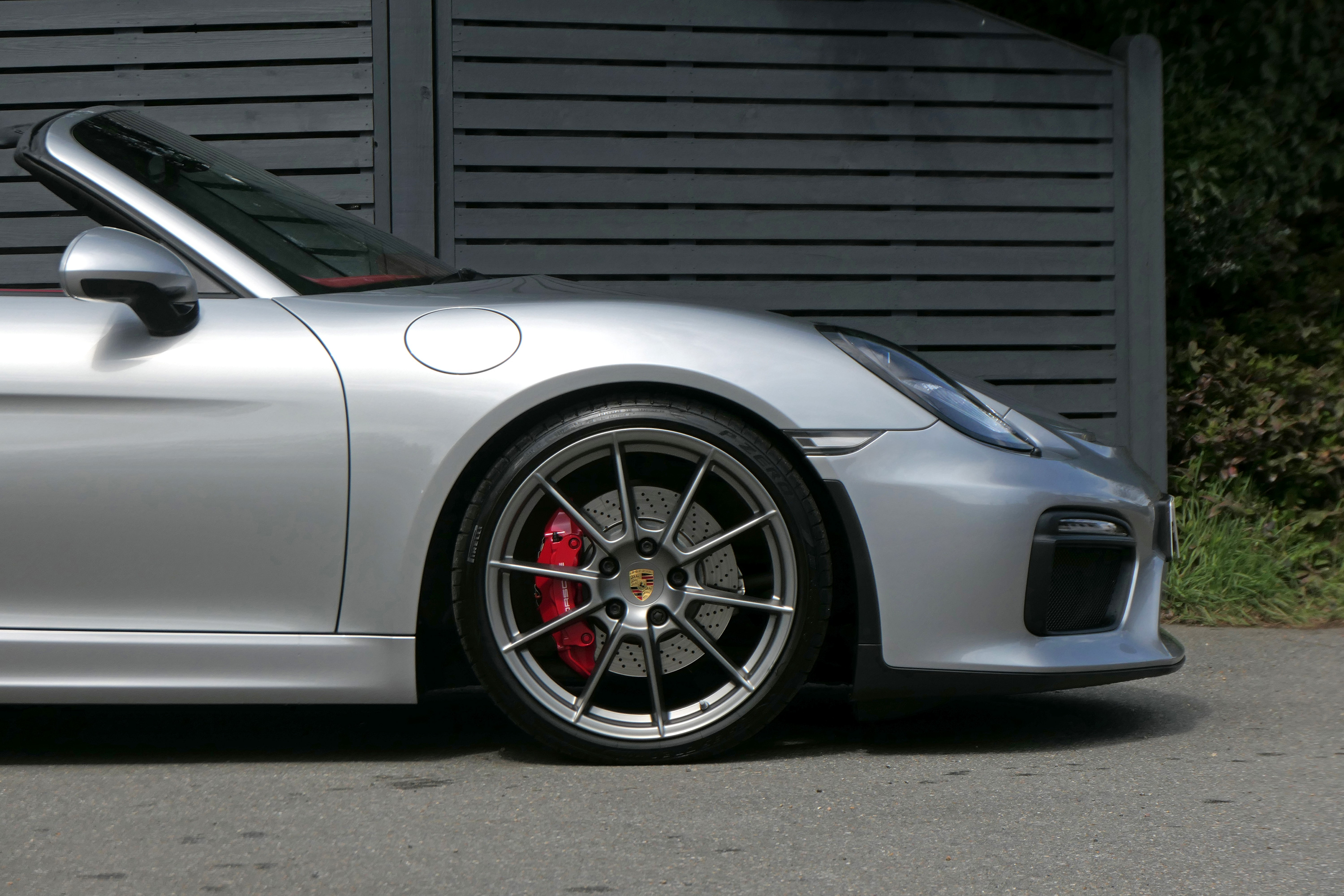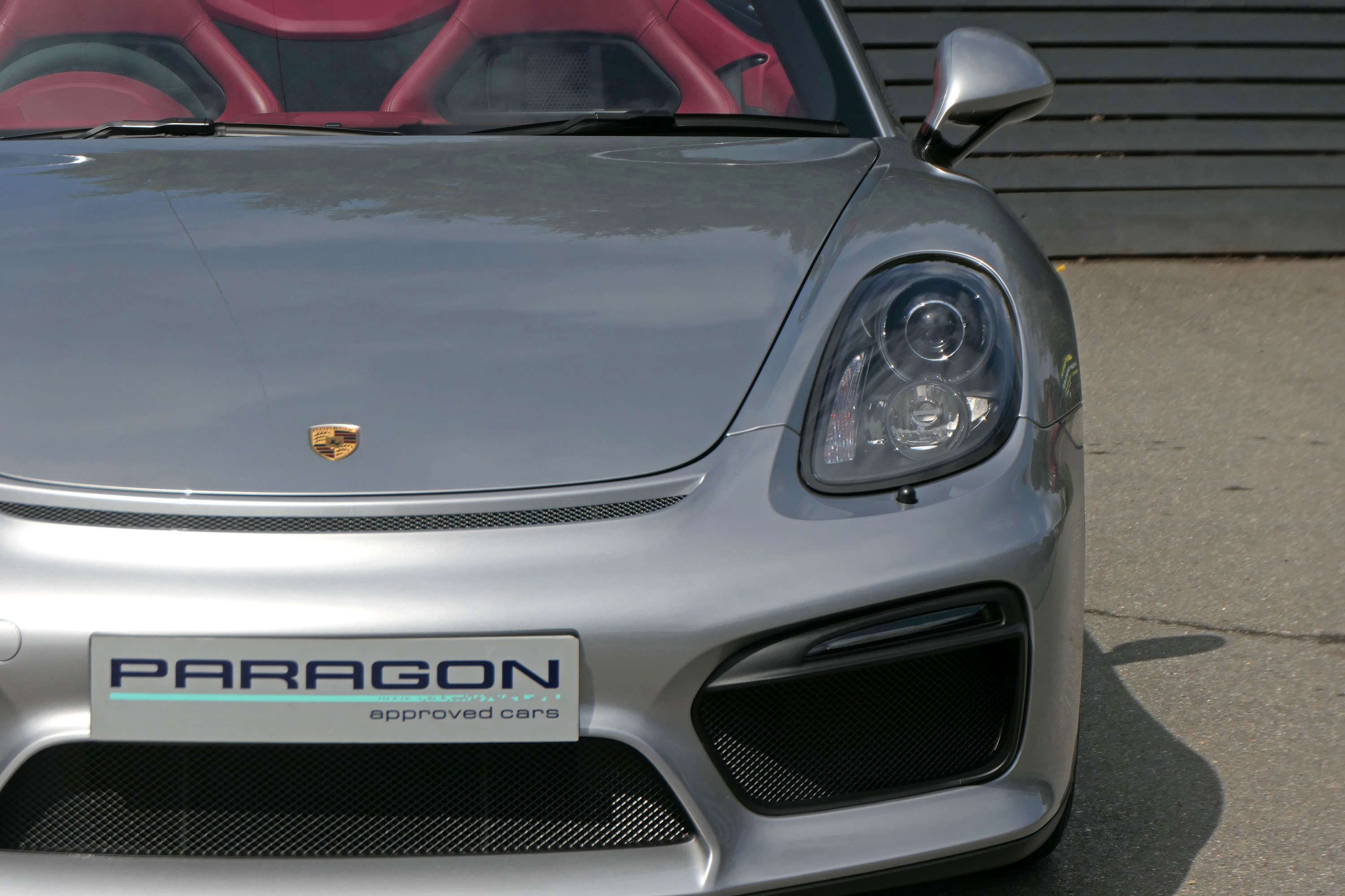 This Boxster Spyder (981) has the 6-speed manual gearbox and is presented in GT Silver with a Boxster Spyder Classic Red leather interior.