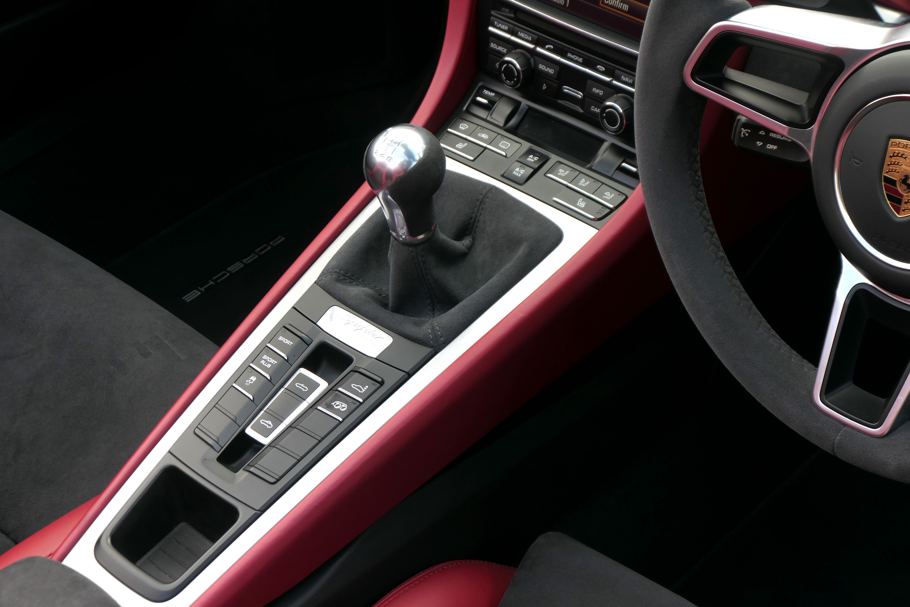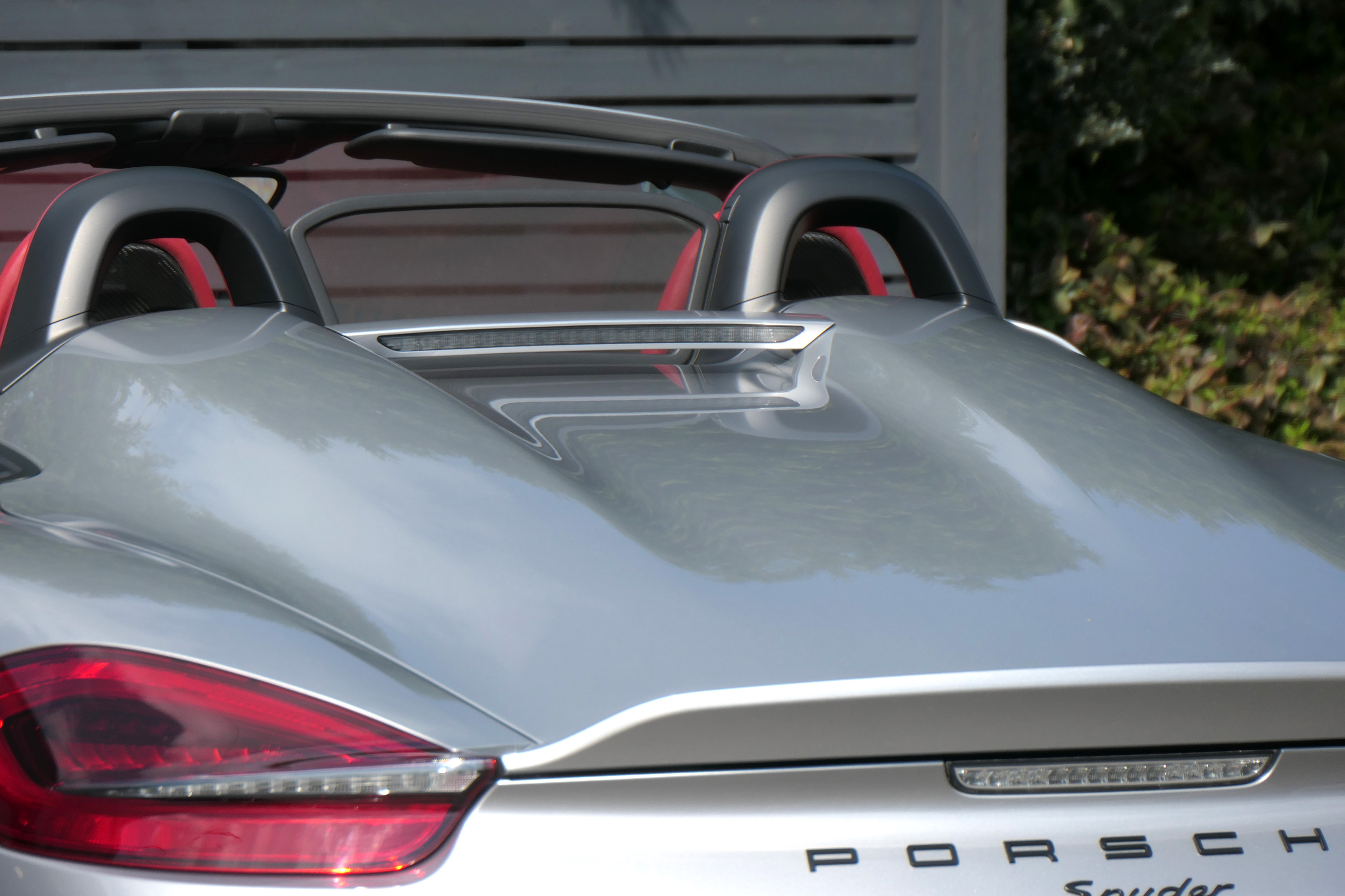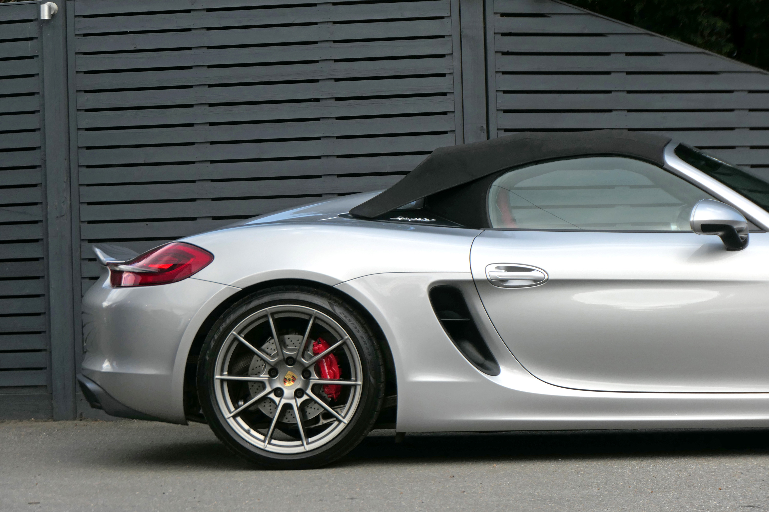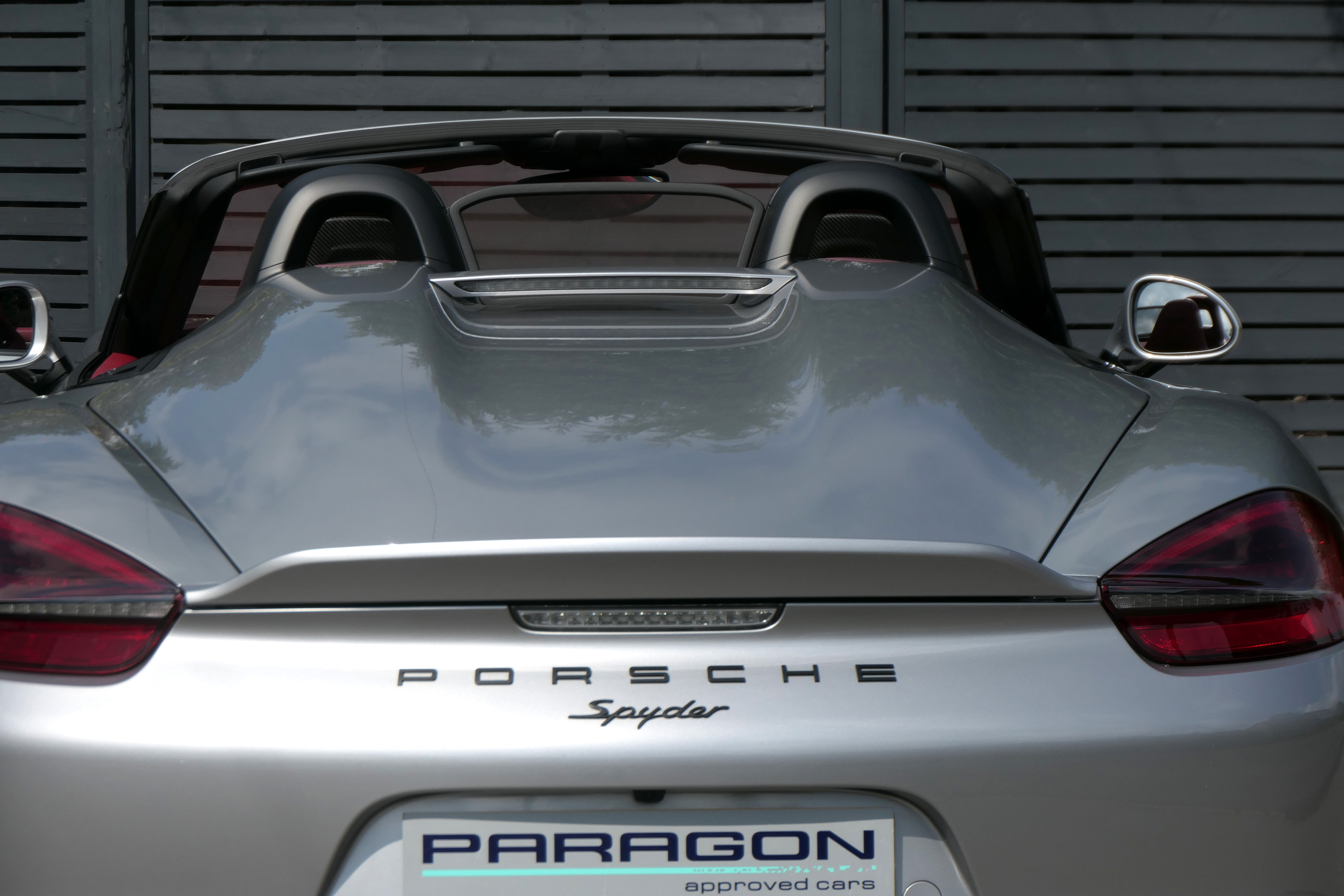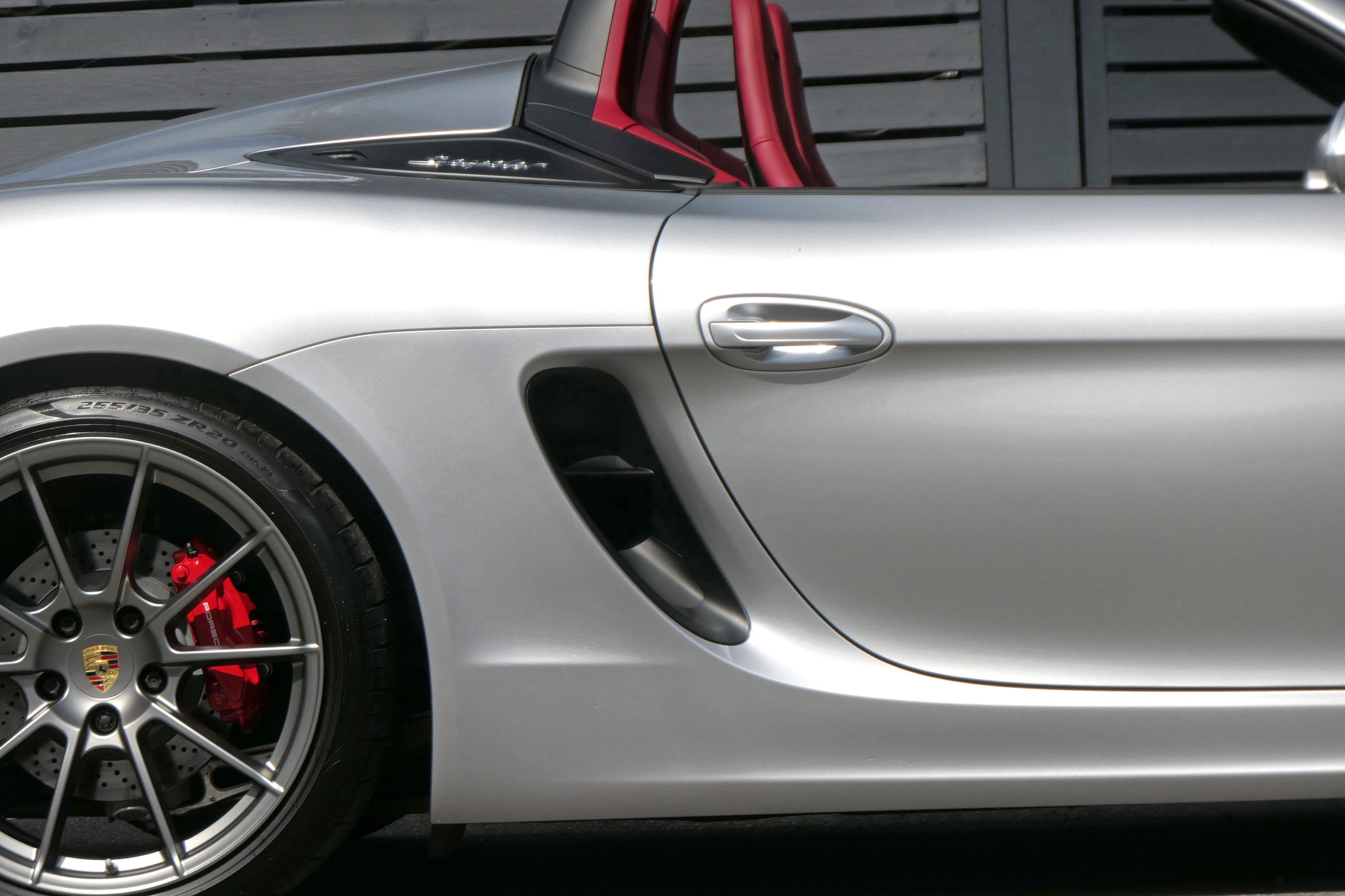 This Boxster Spyder (981) has the 6-speed manual gearbox and is presented in GT Silver with a Boxster Spyder Classic Red leather interior.