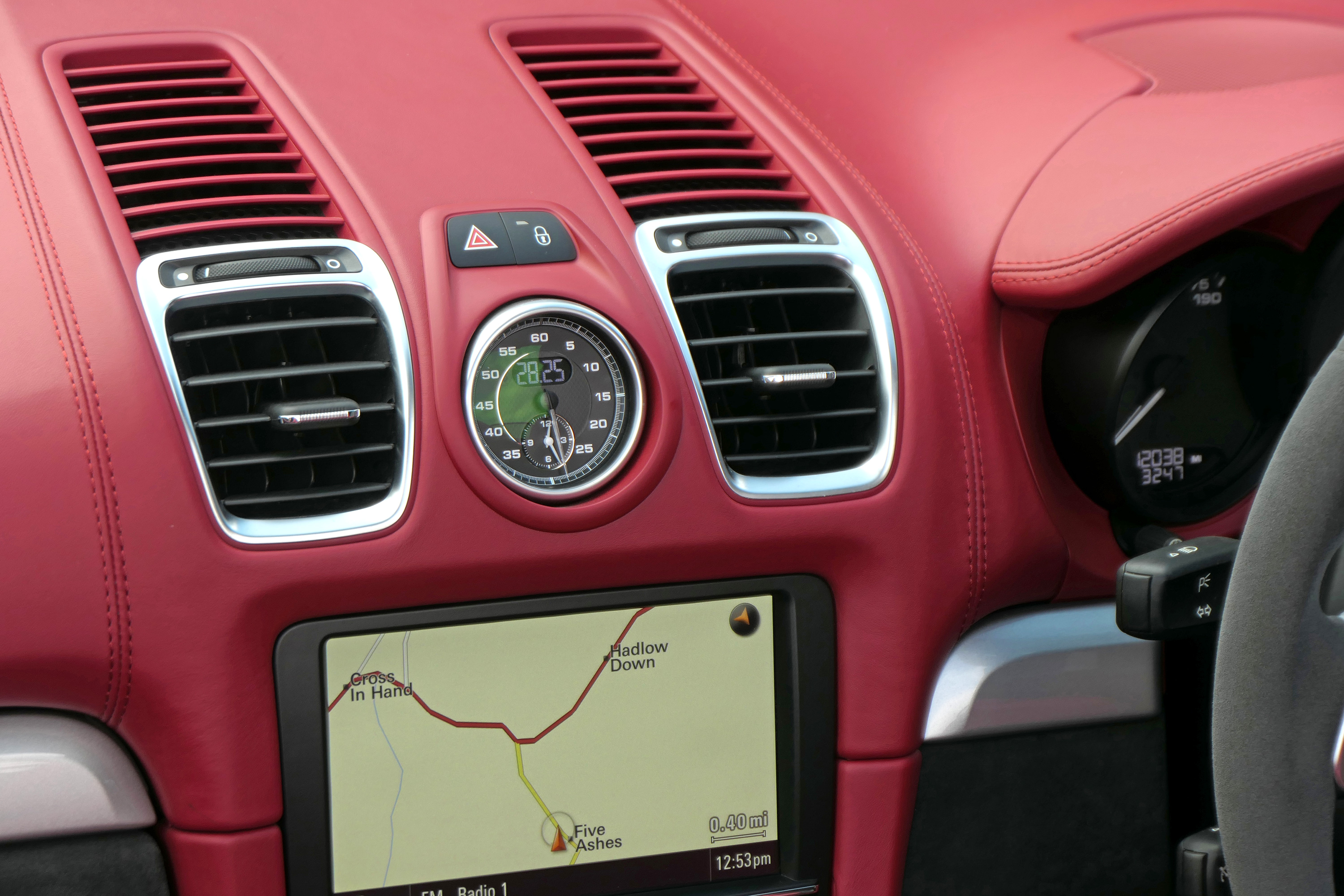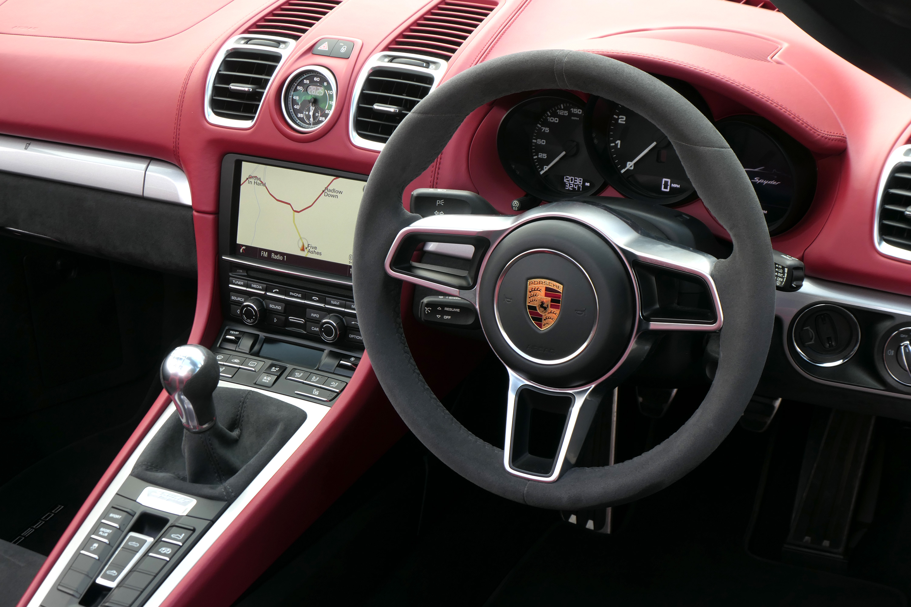 Factory-fitted options include the Boxster Spyder Classic red leather interior with heated bucket seats, touchscreen satellite navigation, a DAB digital radio, cruise control, a BOSE Sound system and Bluetooth phone & music.