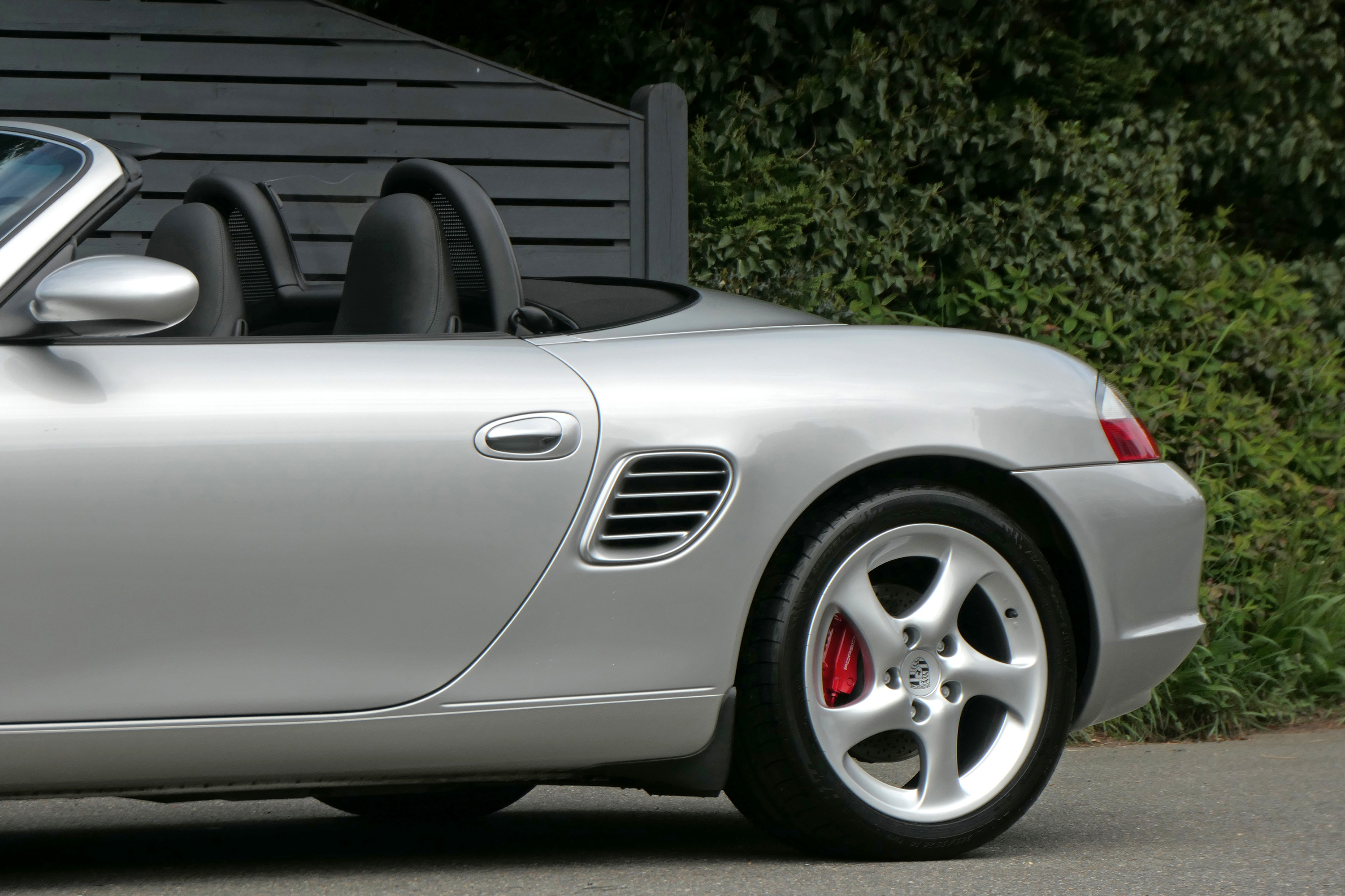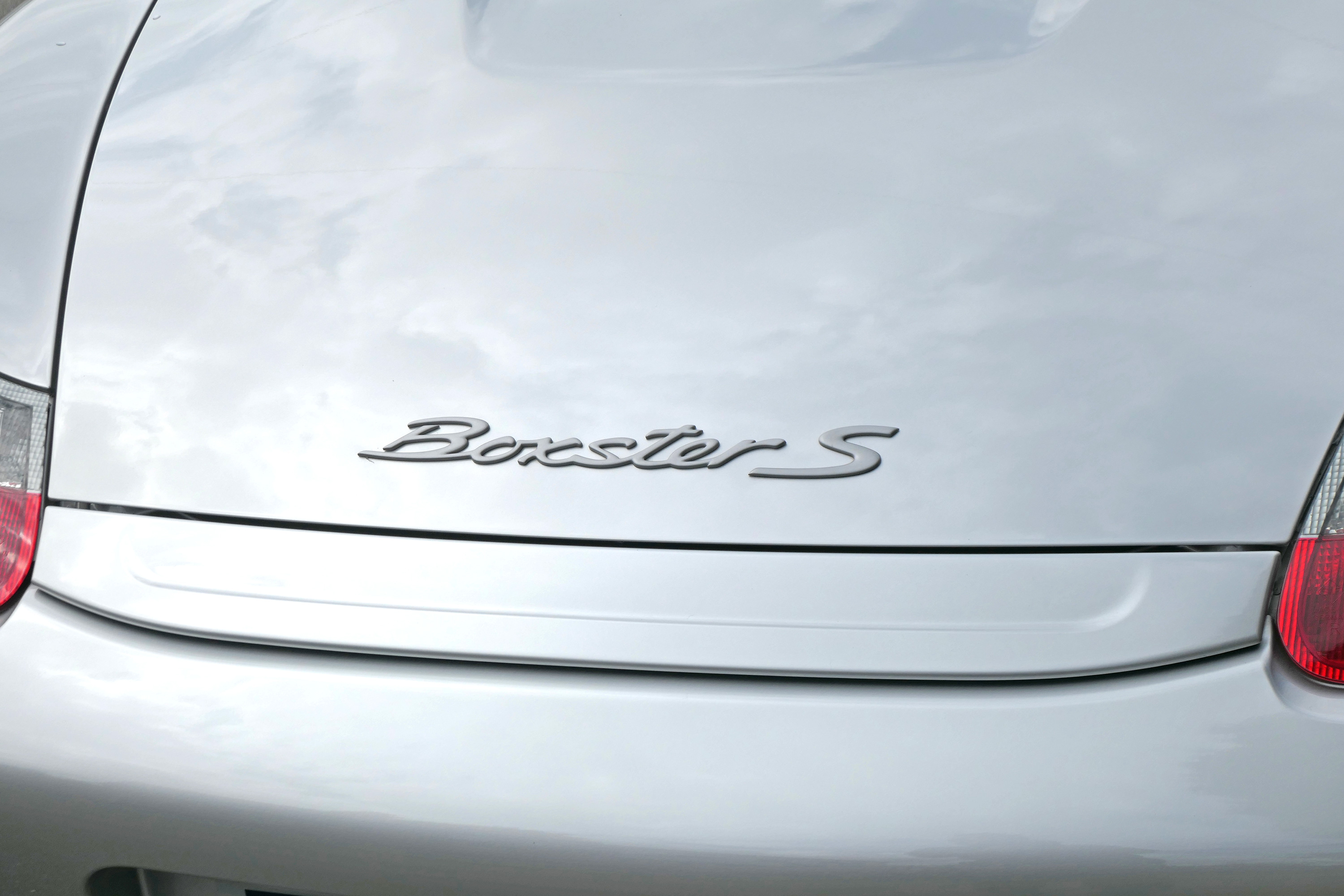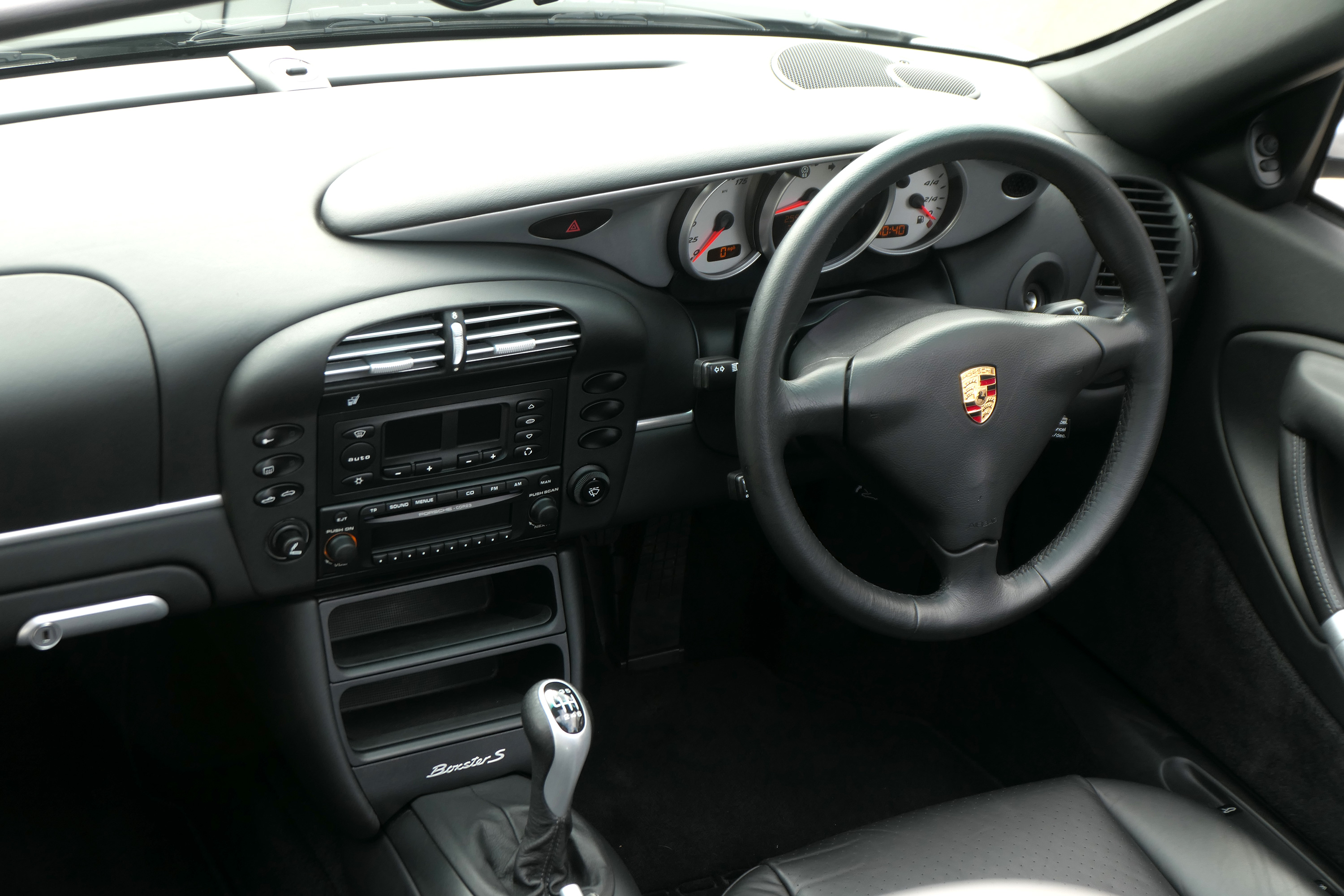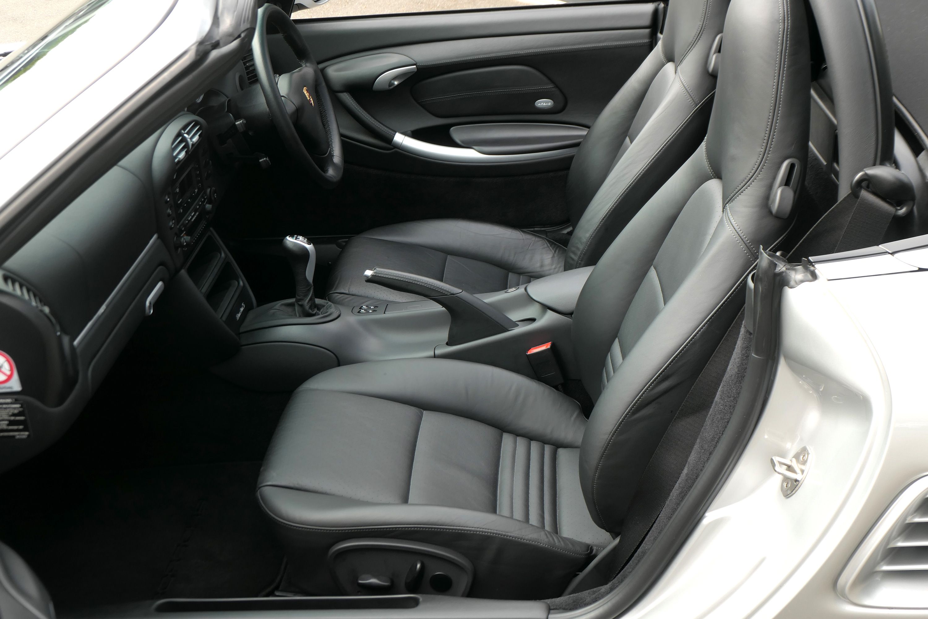 This Boxster S (986) has the 6-speed manual gearbox and is presented in Arctic Silver with black leather seats and a black power hood.