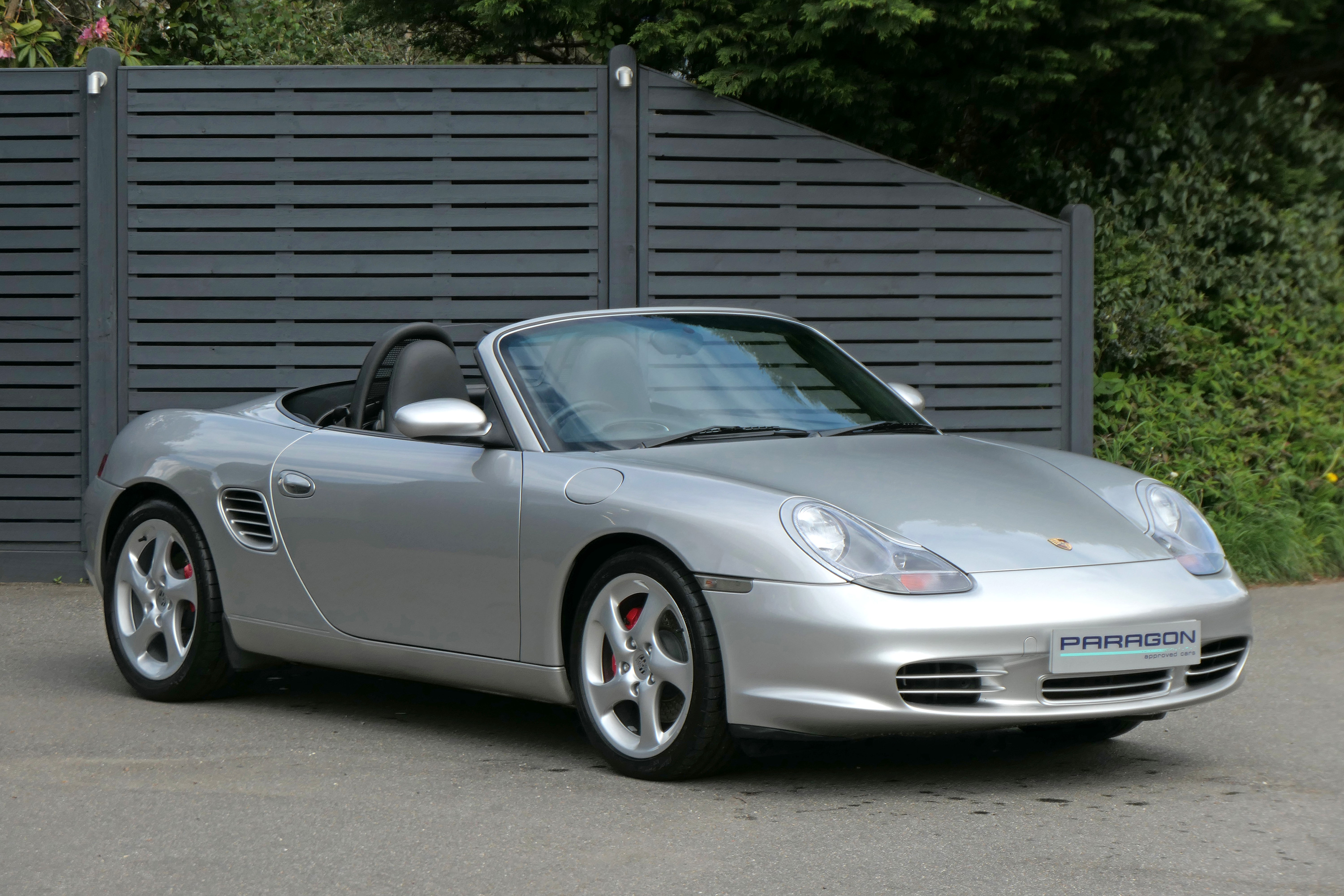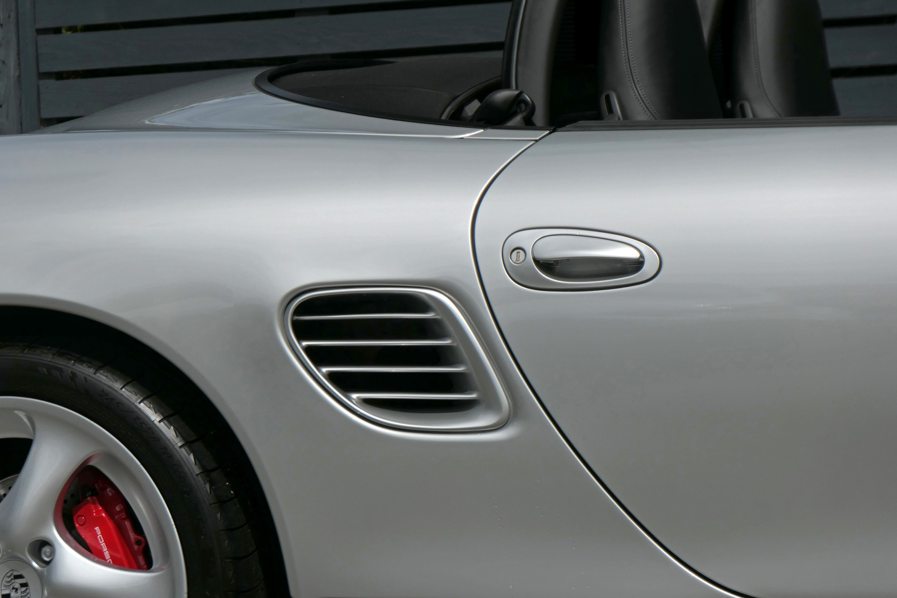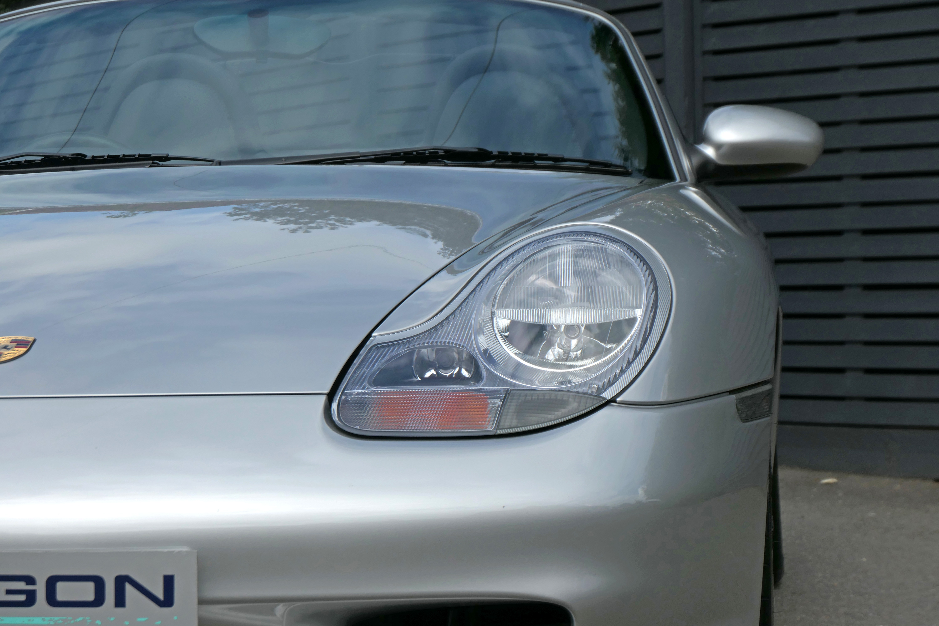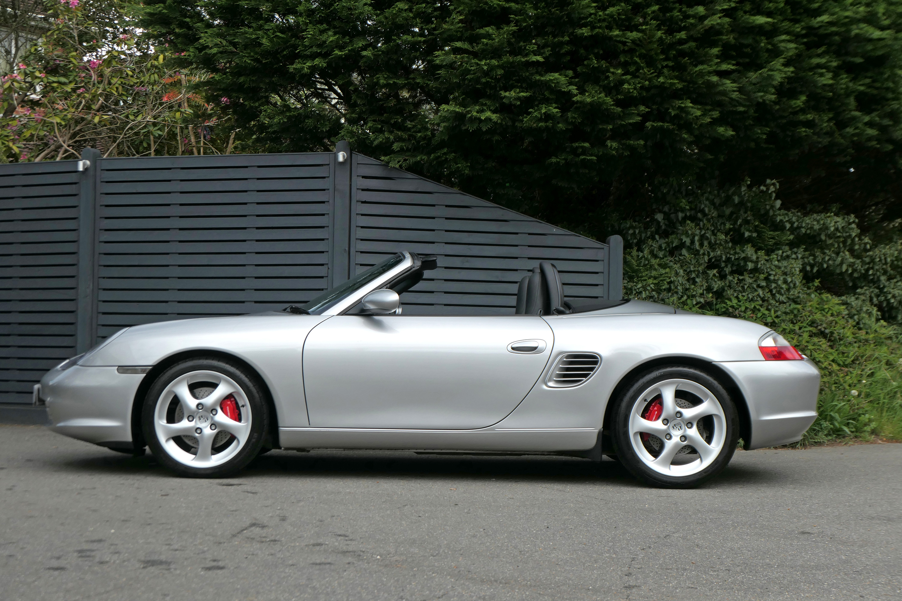 This Boxster S (986) has the 6-speed manual gearbox and is presented in Arctic Silver with black leather seats and a black power hood.