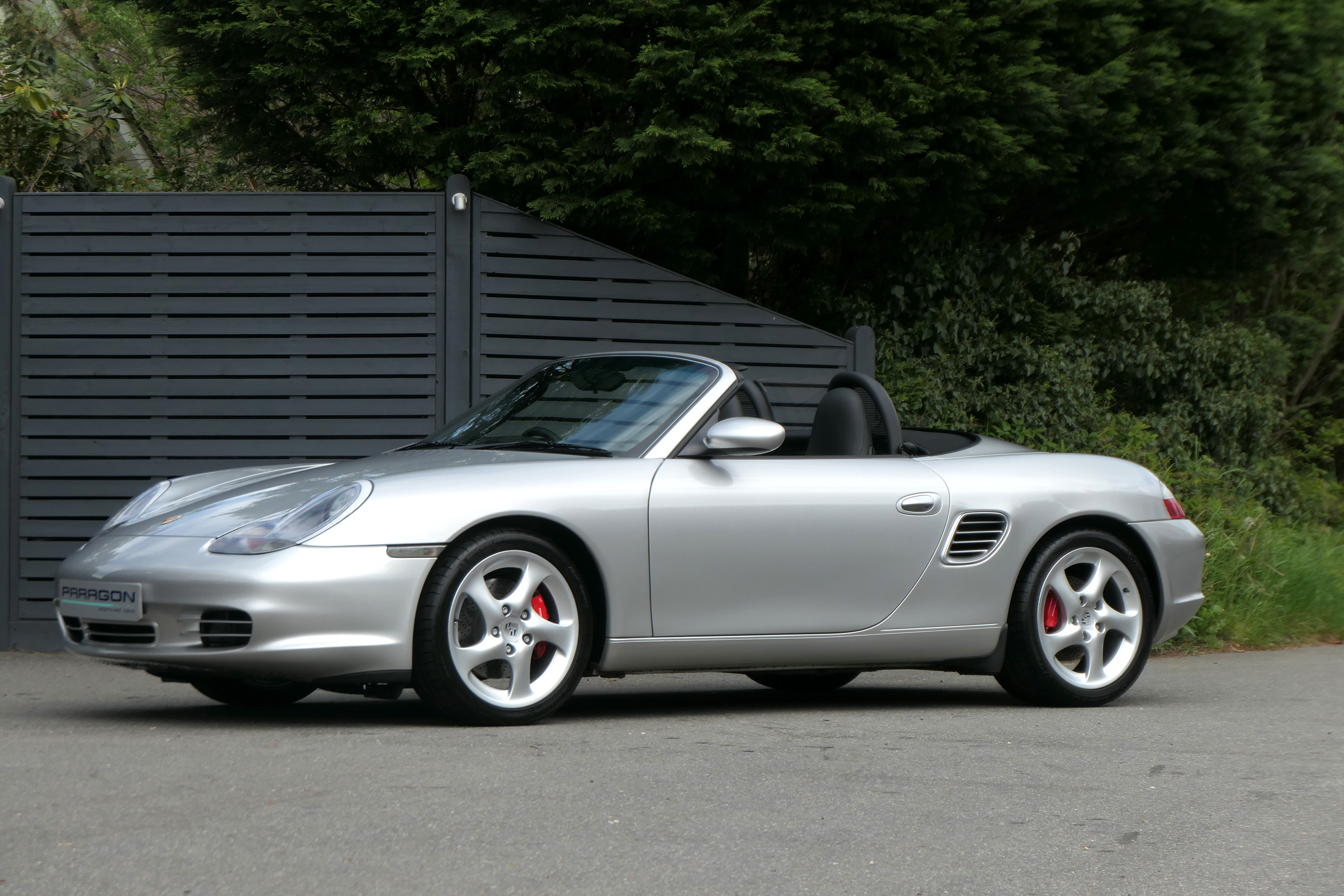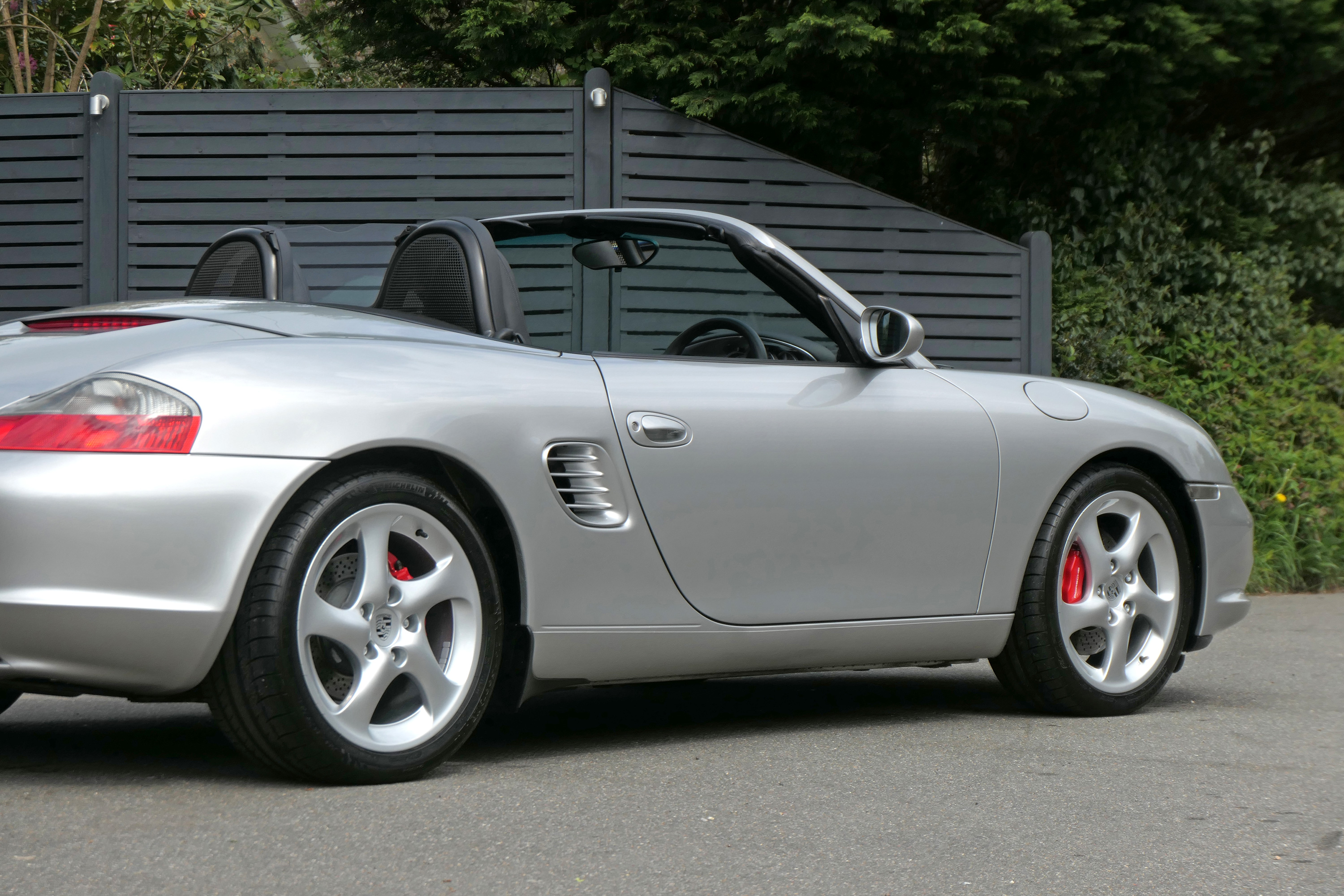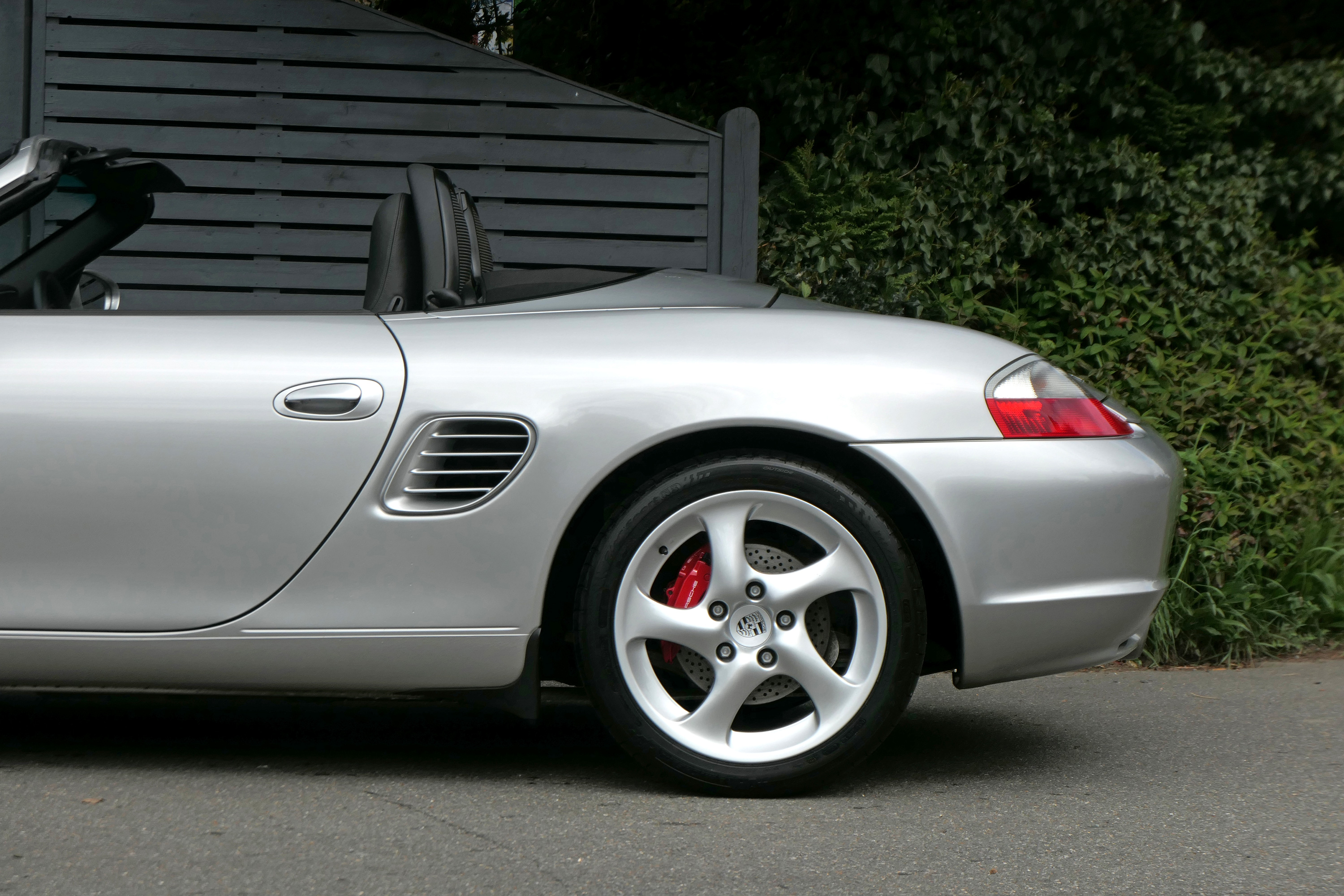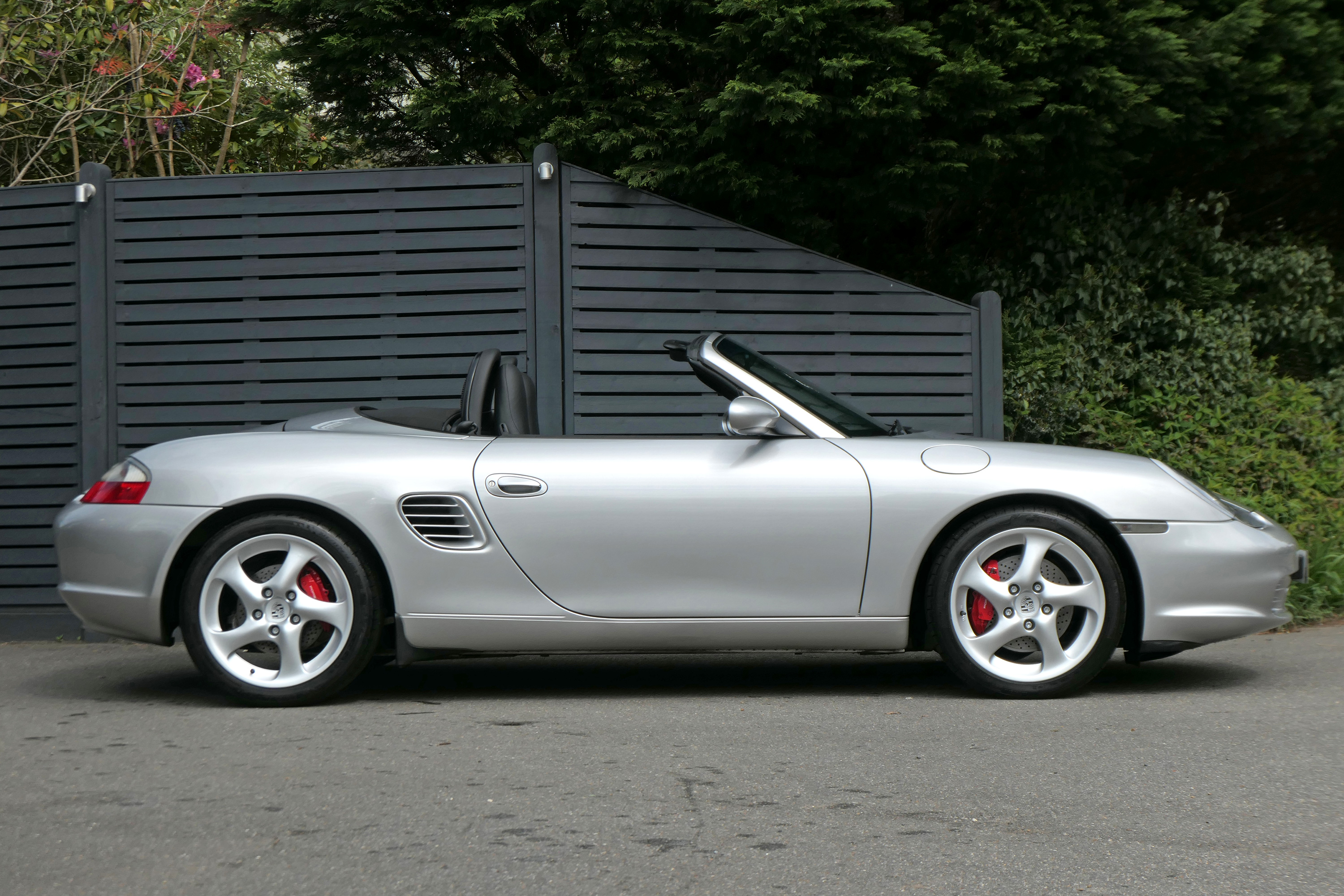 This Boxster S (986) has the 6-speed manual gearbox and is presented in Arctic Silver with black leather seats and a black power hood.