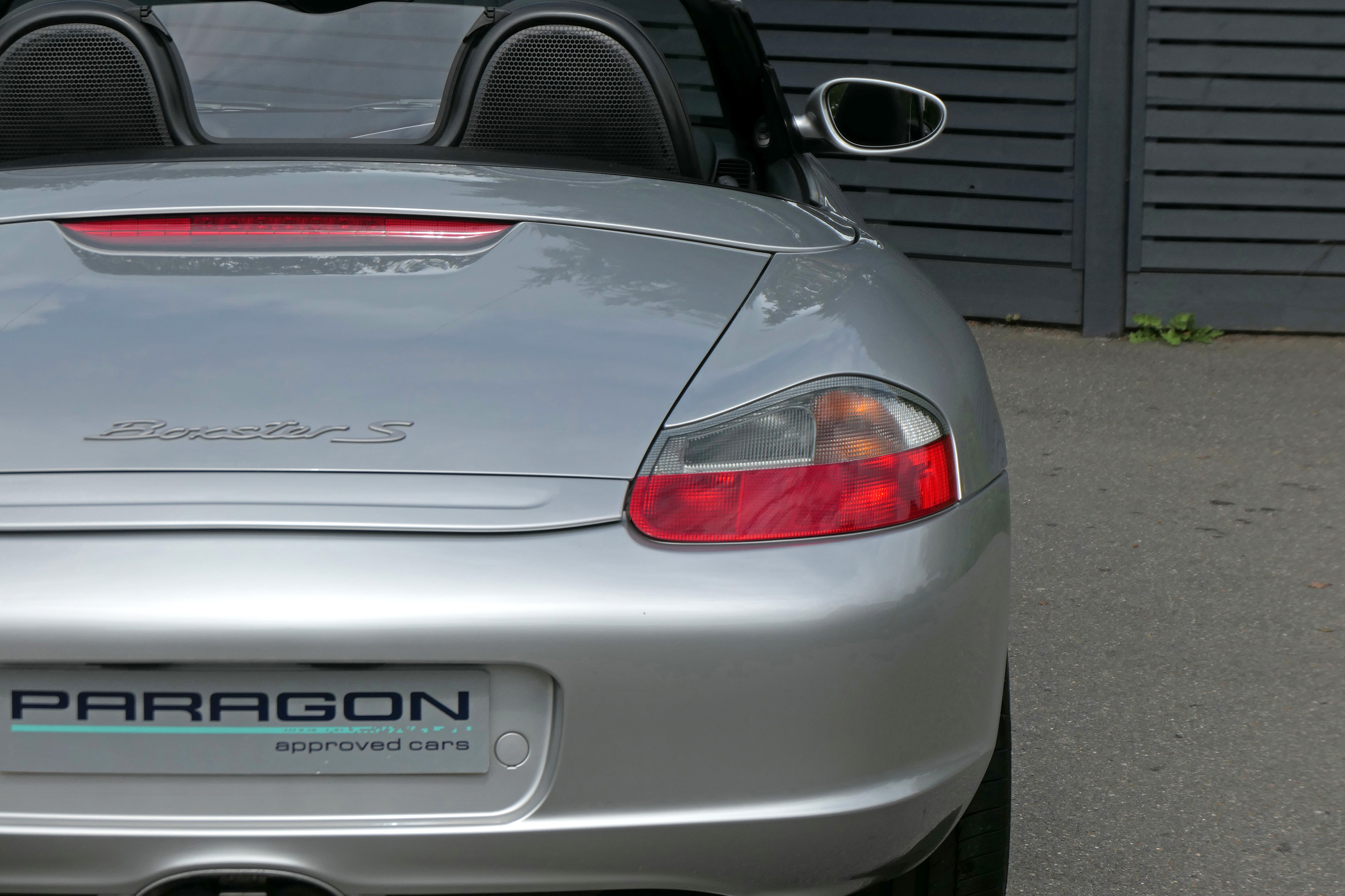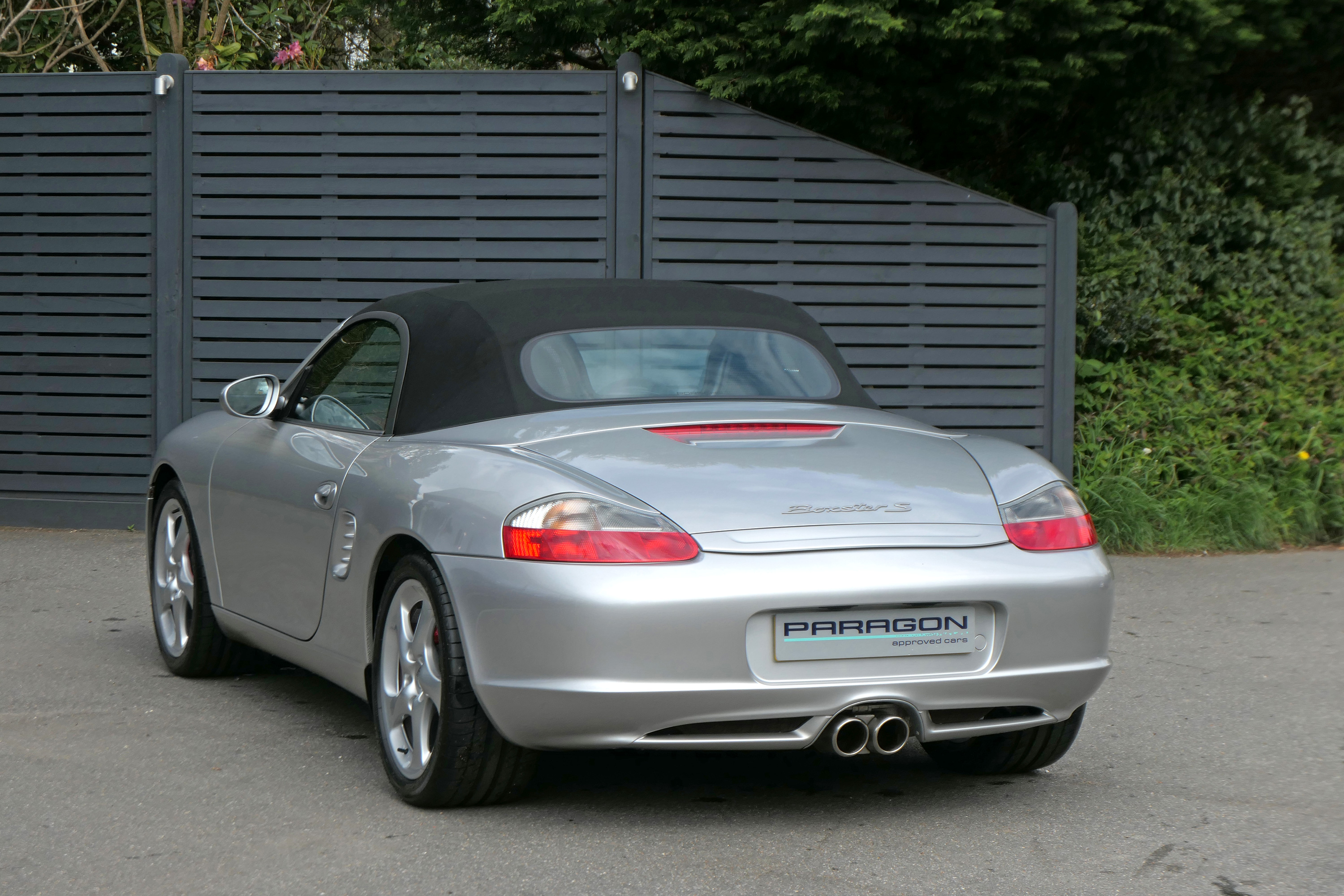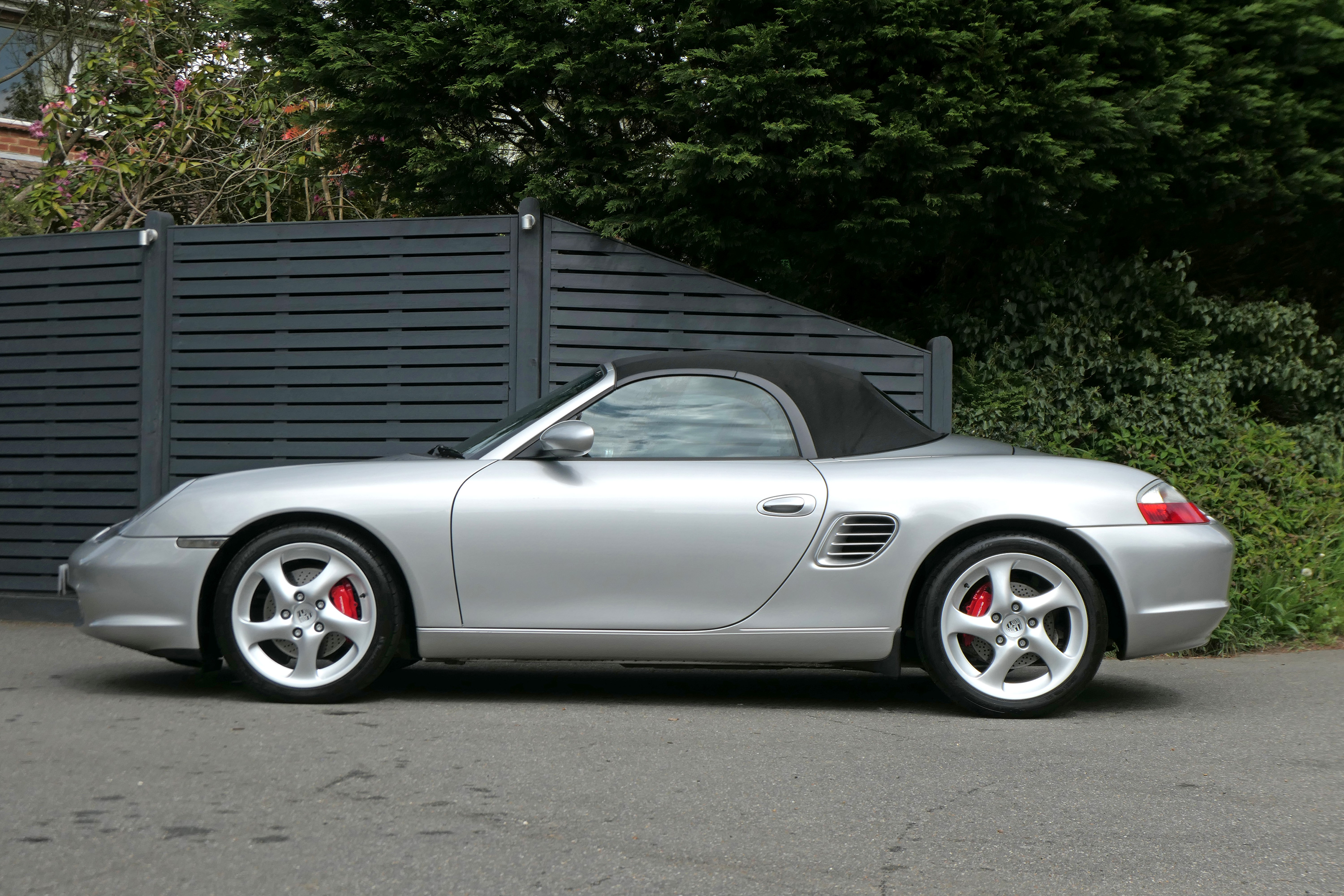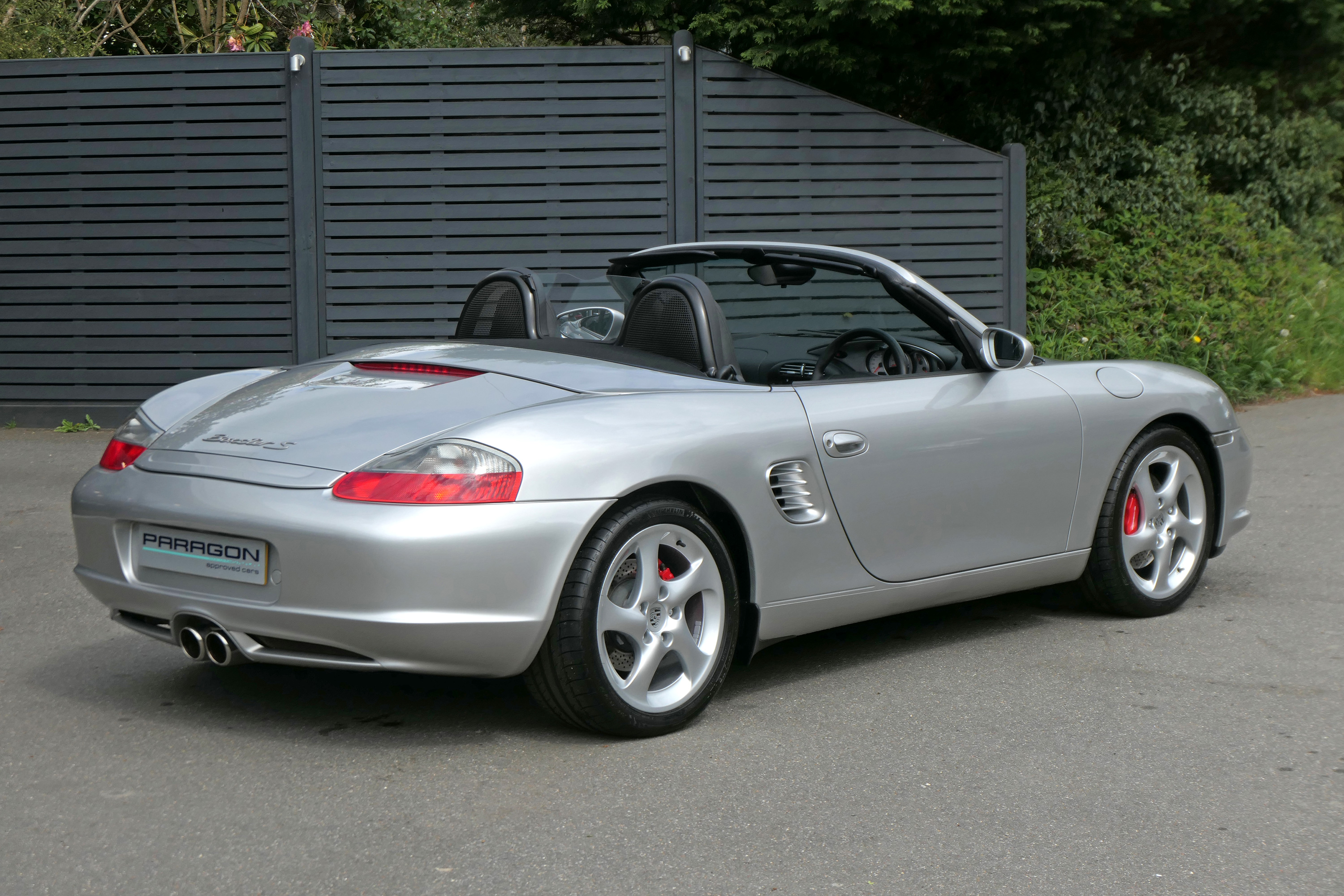 This Boxster S (986) has the 6-speed manual gearbox and is presented in Arctic Silver with black leather seats and a black power hood.