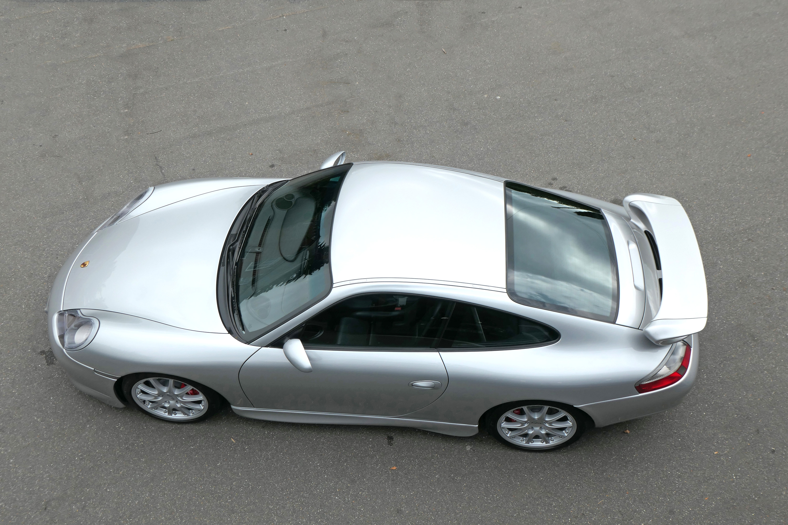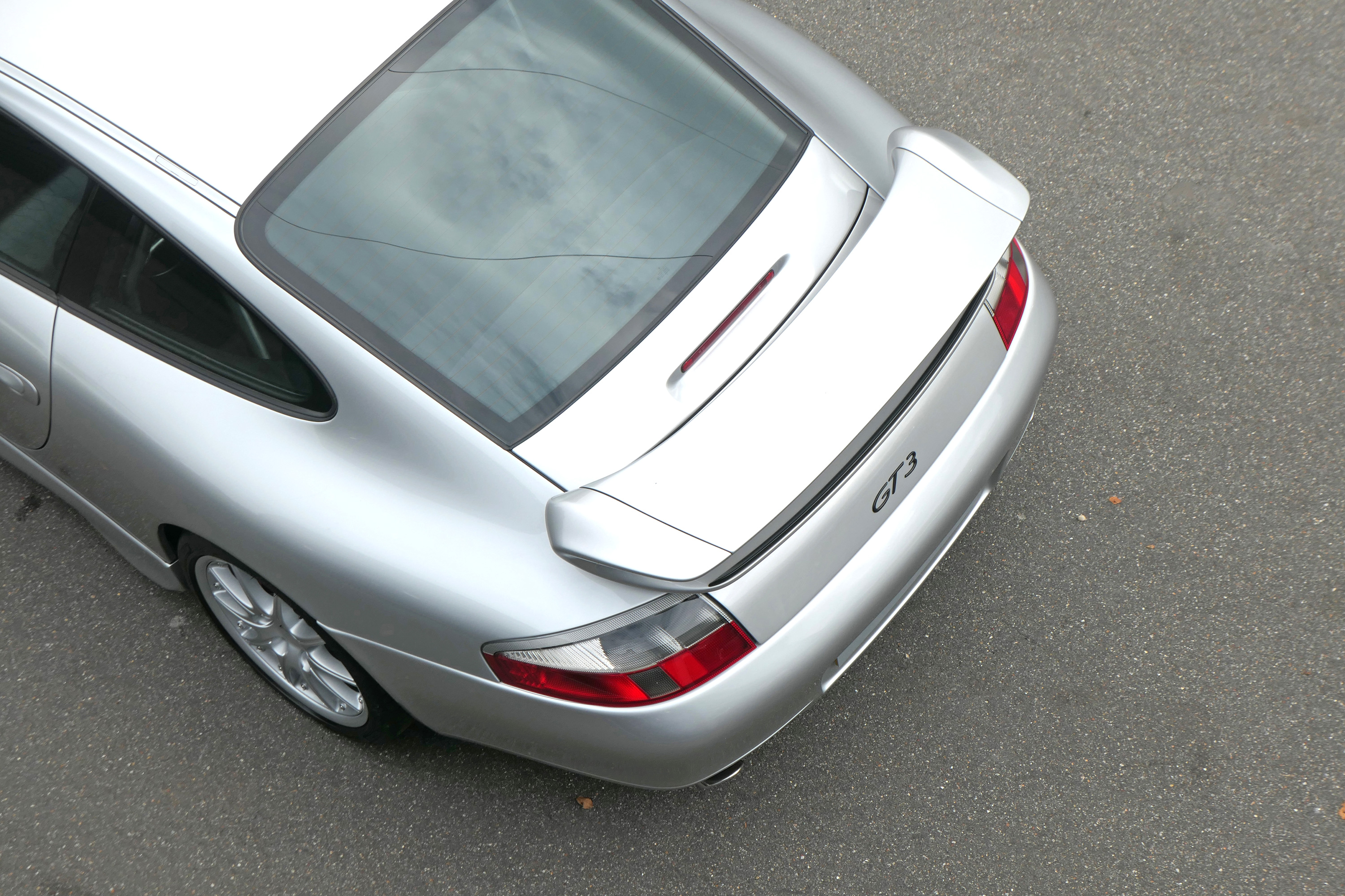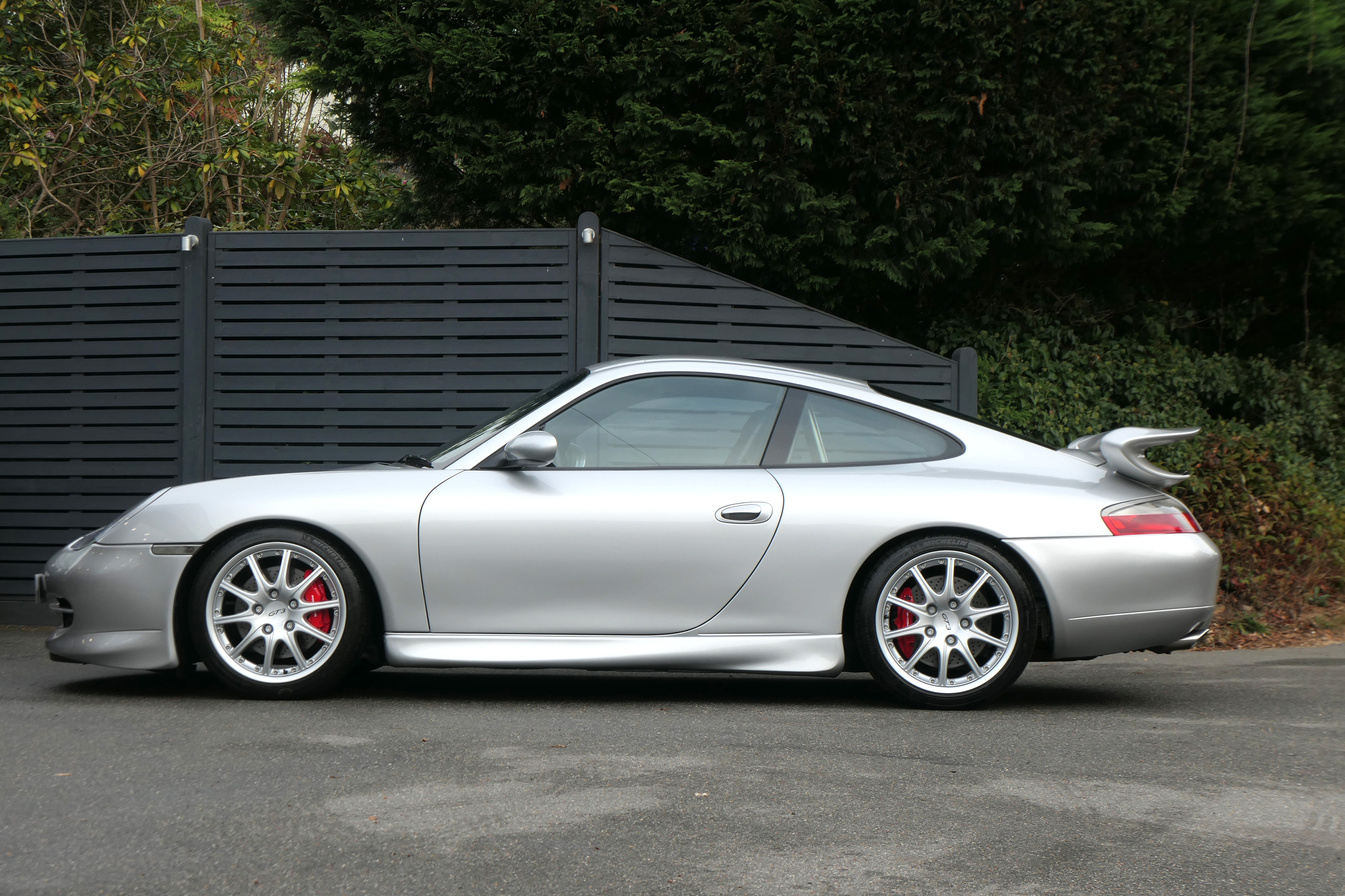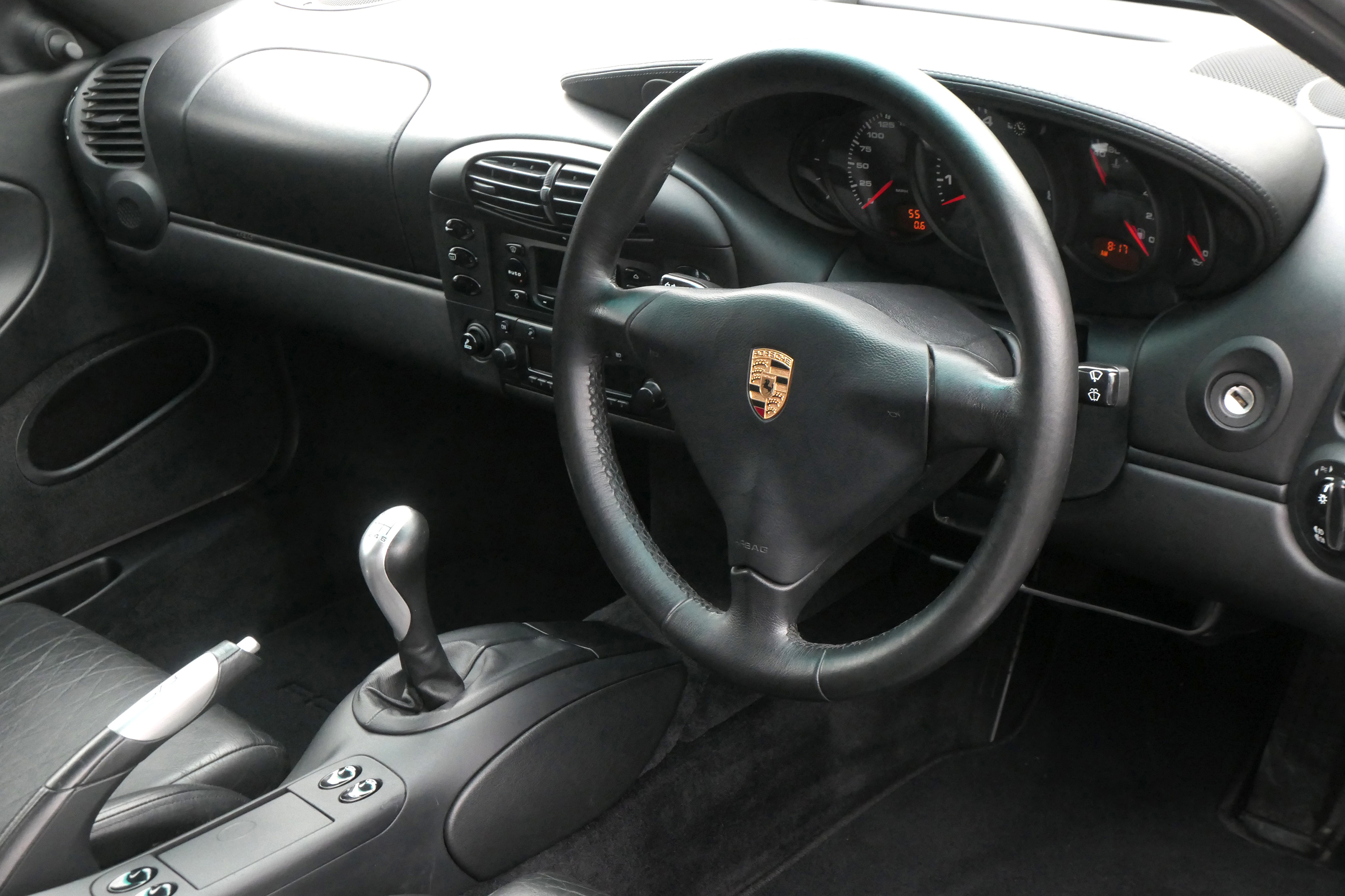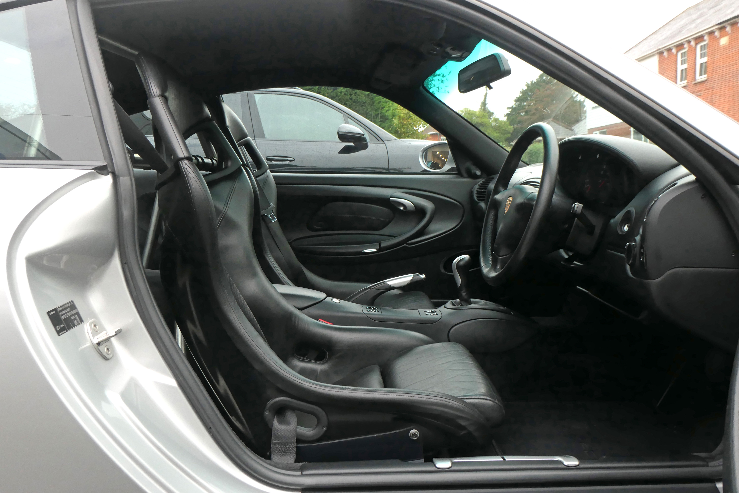 This 911 GT3 (996) has the 6-speed manual gearbox and is presented in Arctic Silver with black leather bucket seats.