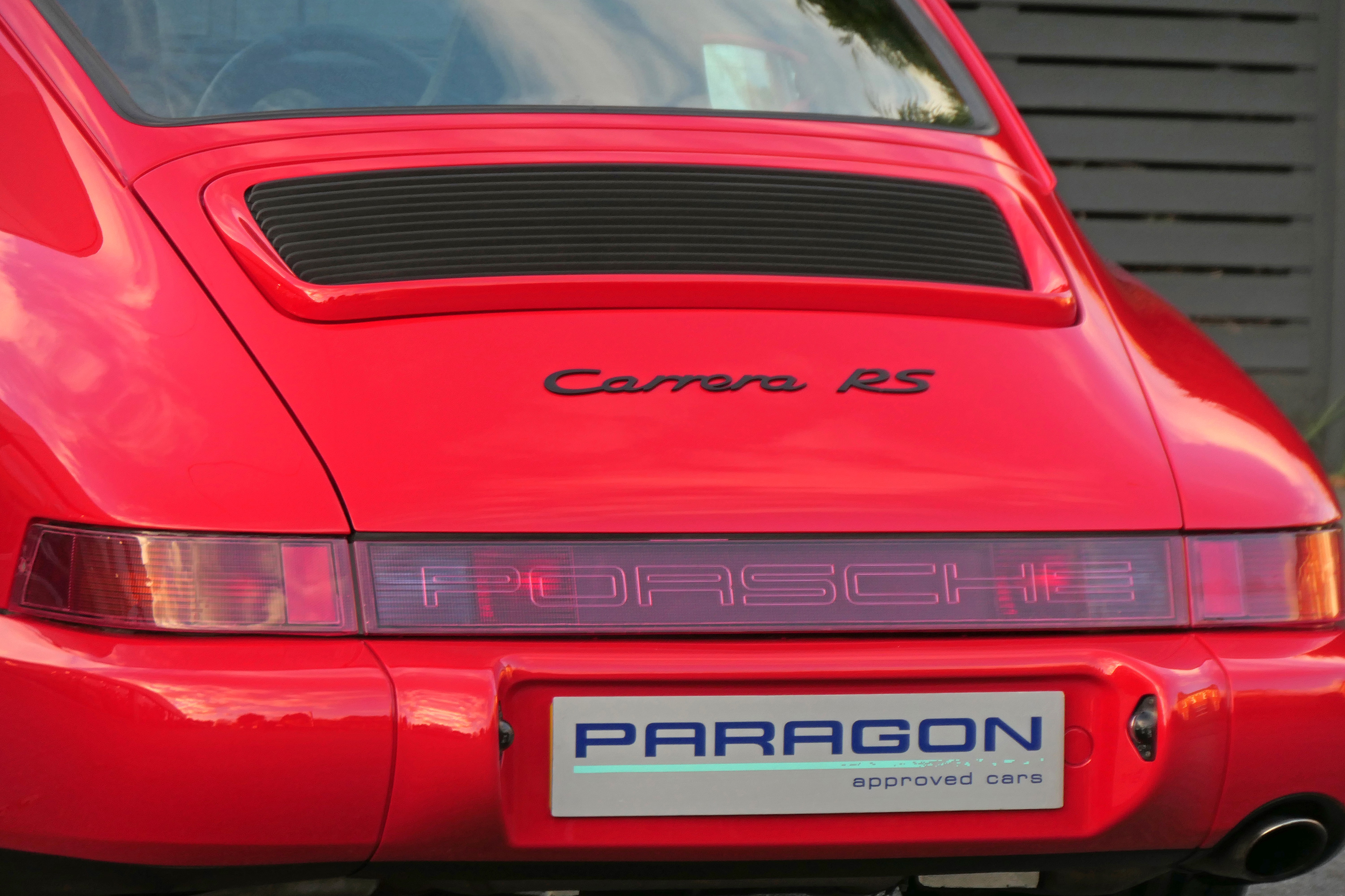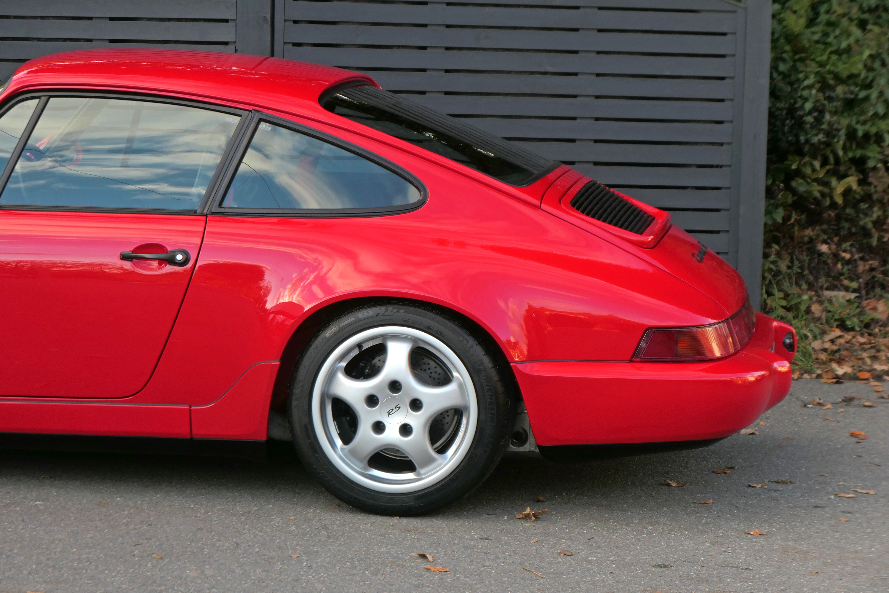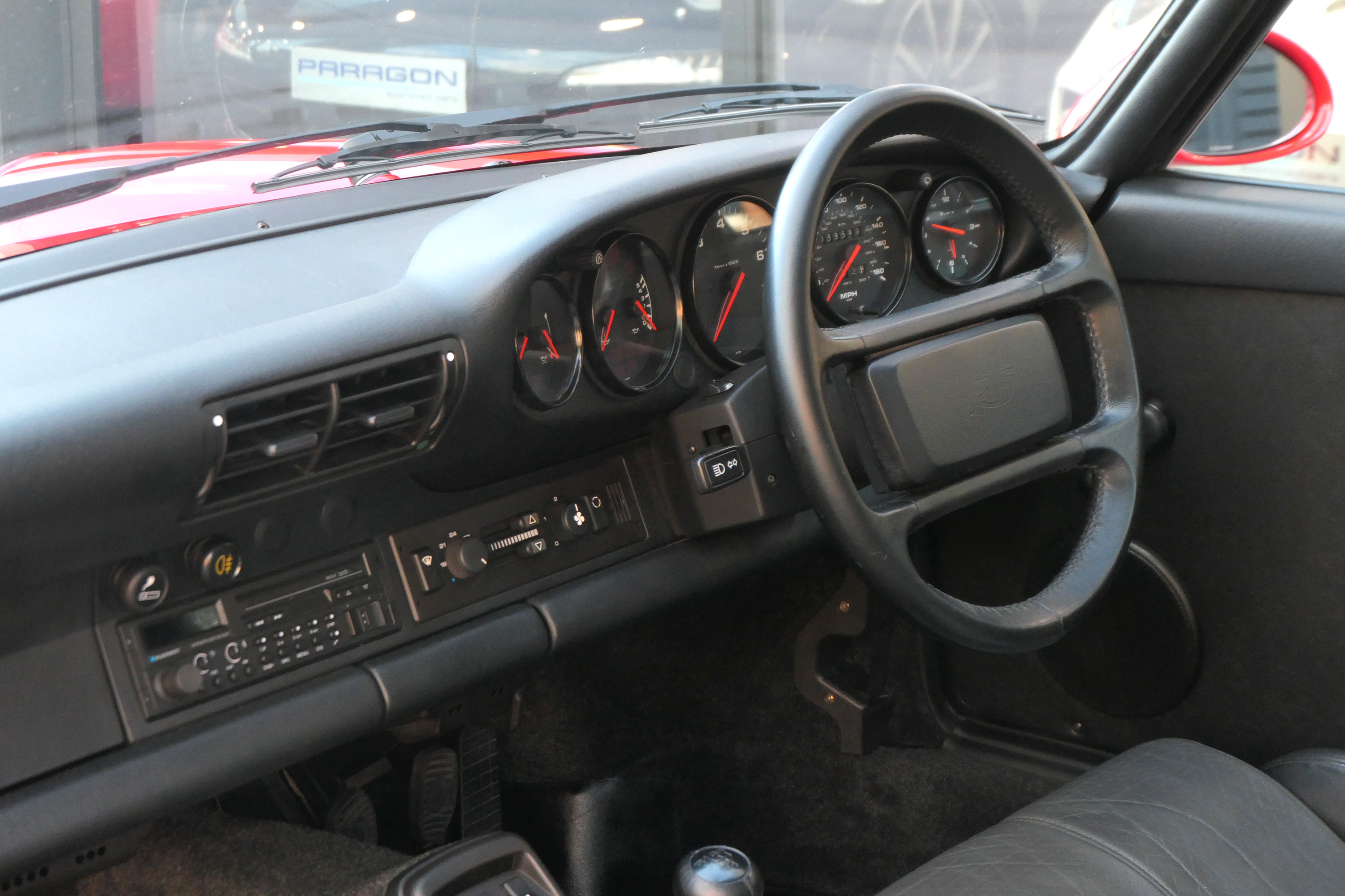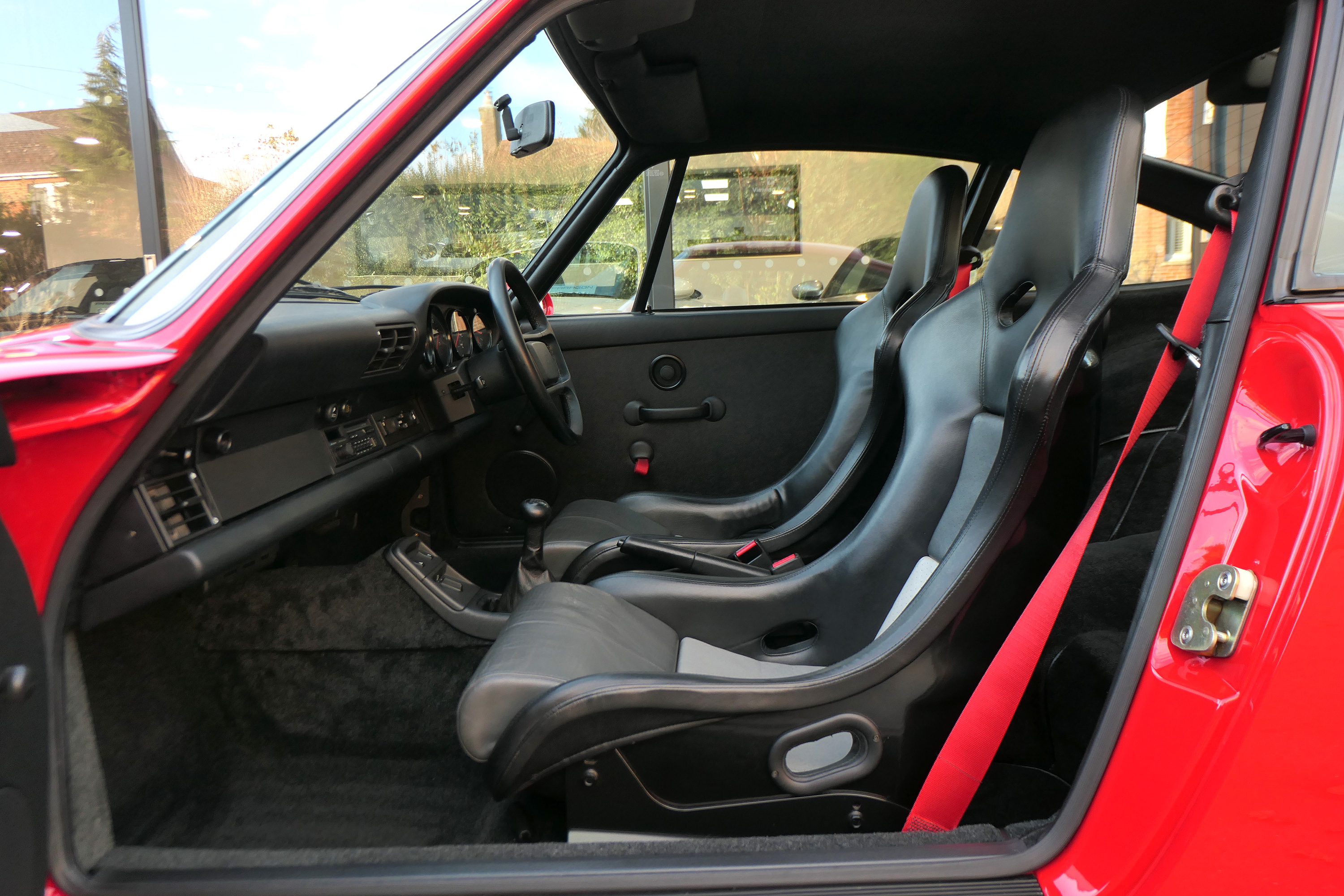 This 911 Carrera RS (964) has the 5-speed manual gearbox and is presented in Guards Red with triple tone leather bucket seats.