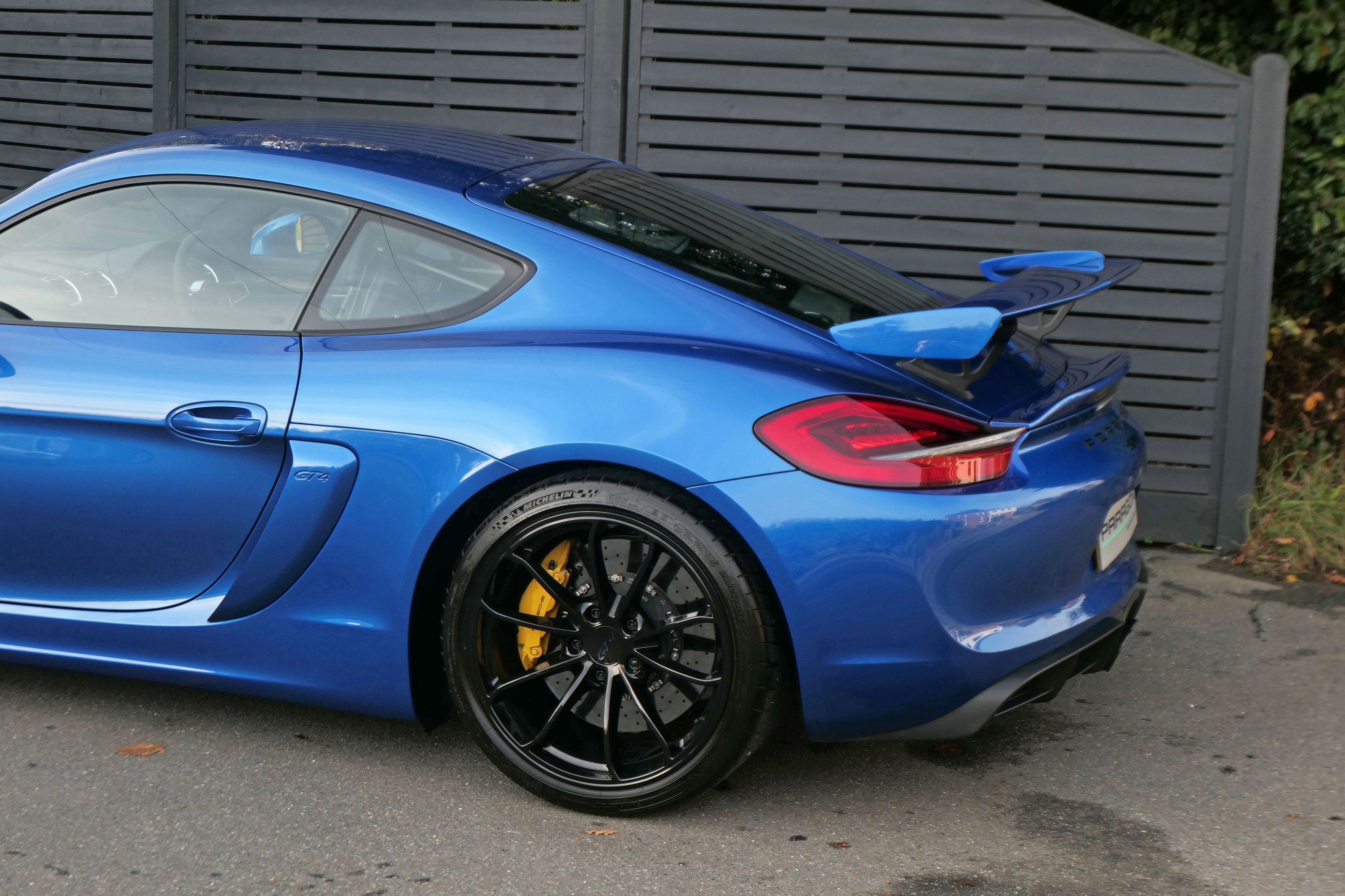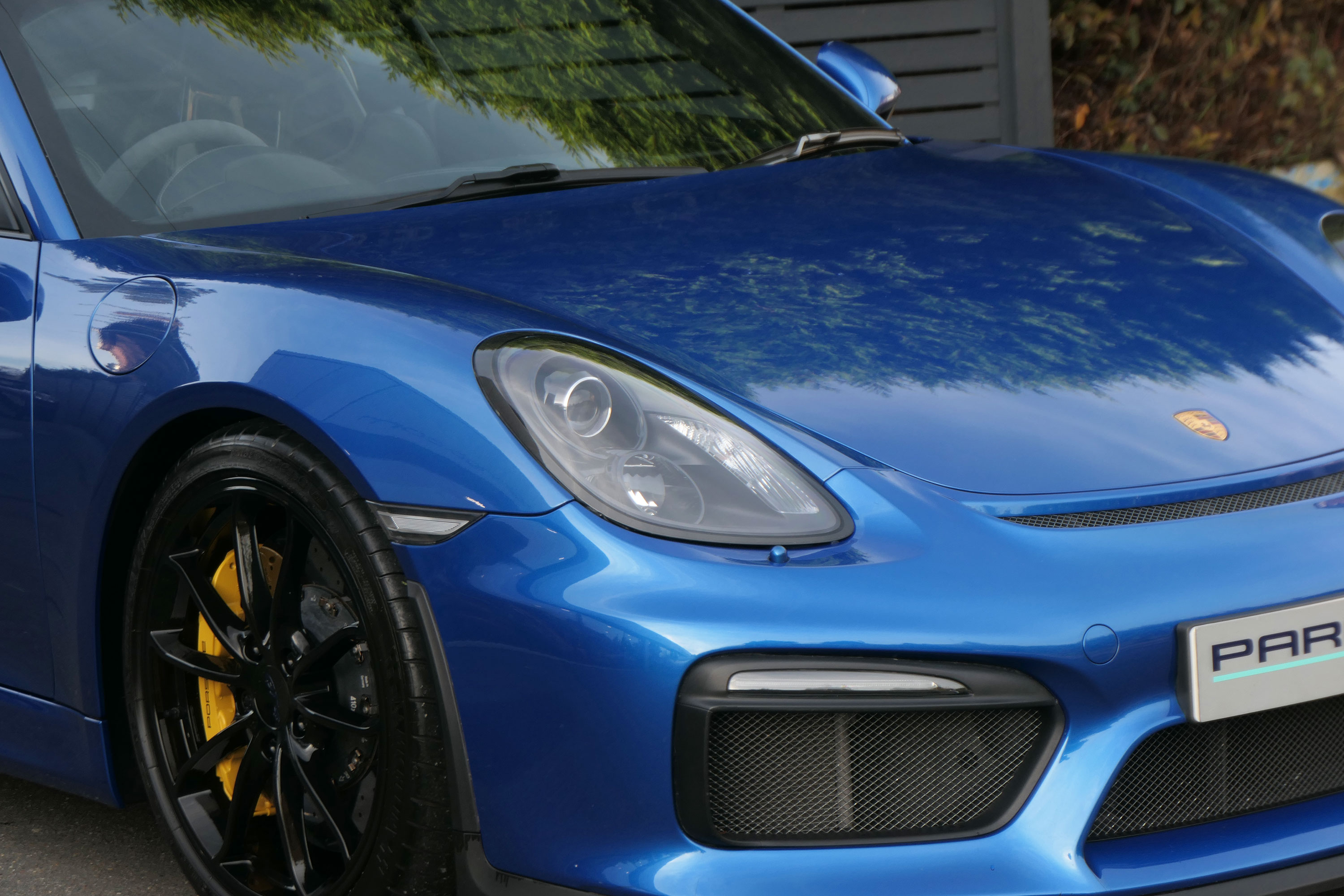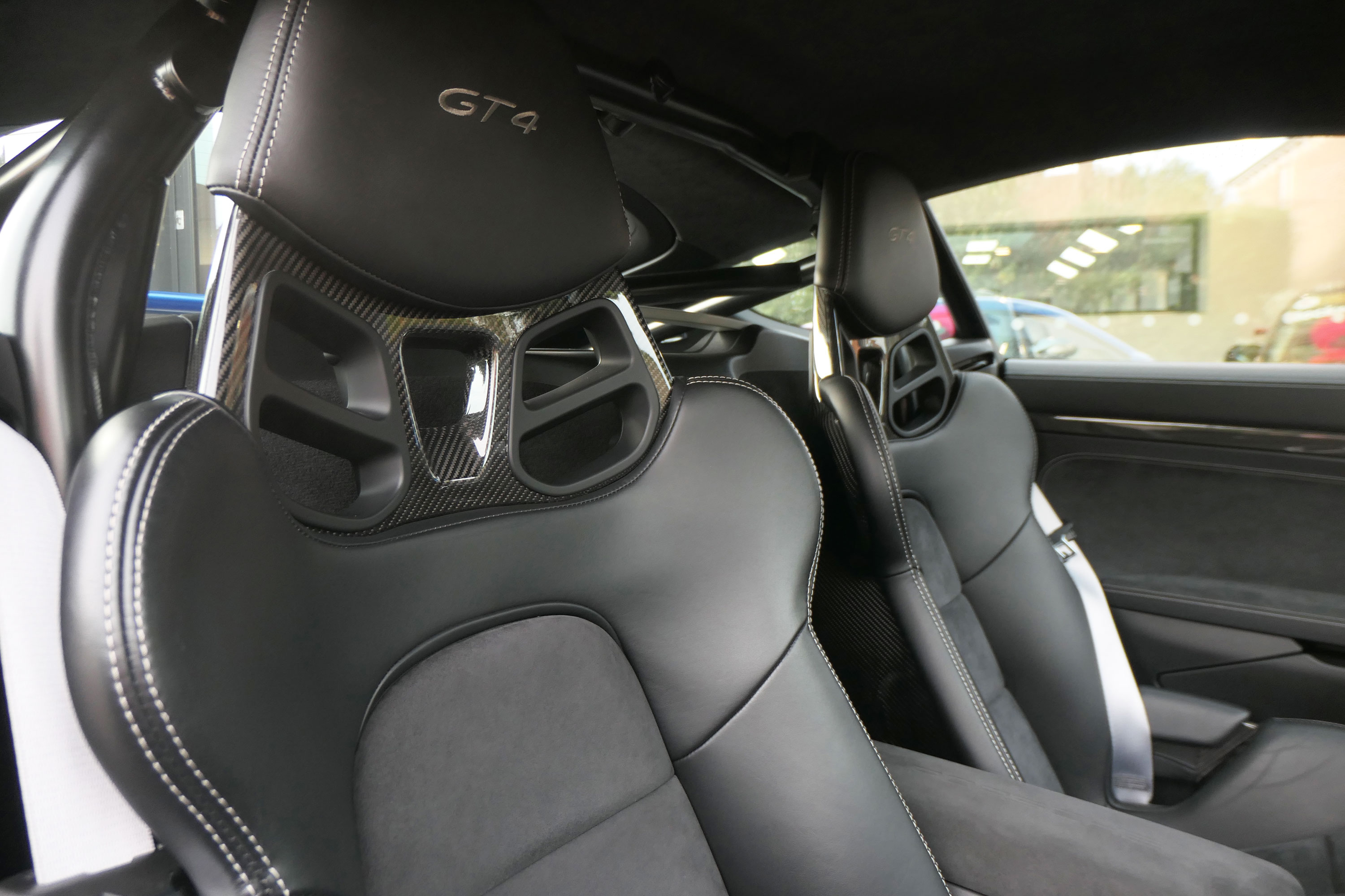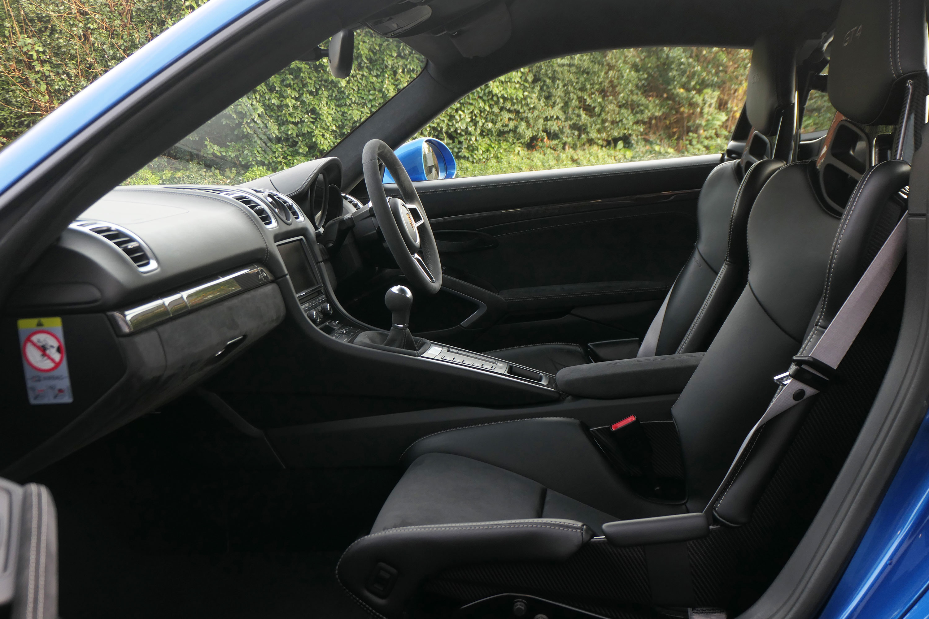 This Cayman GT4 (981) has the 6-speed manual gearbox and is presented in Sapphire Blue with black half leather 918 bucket seats.