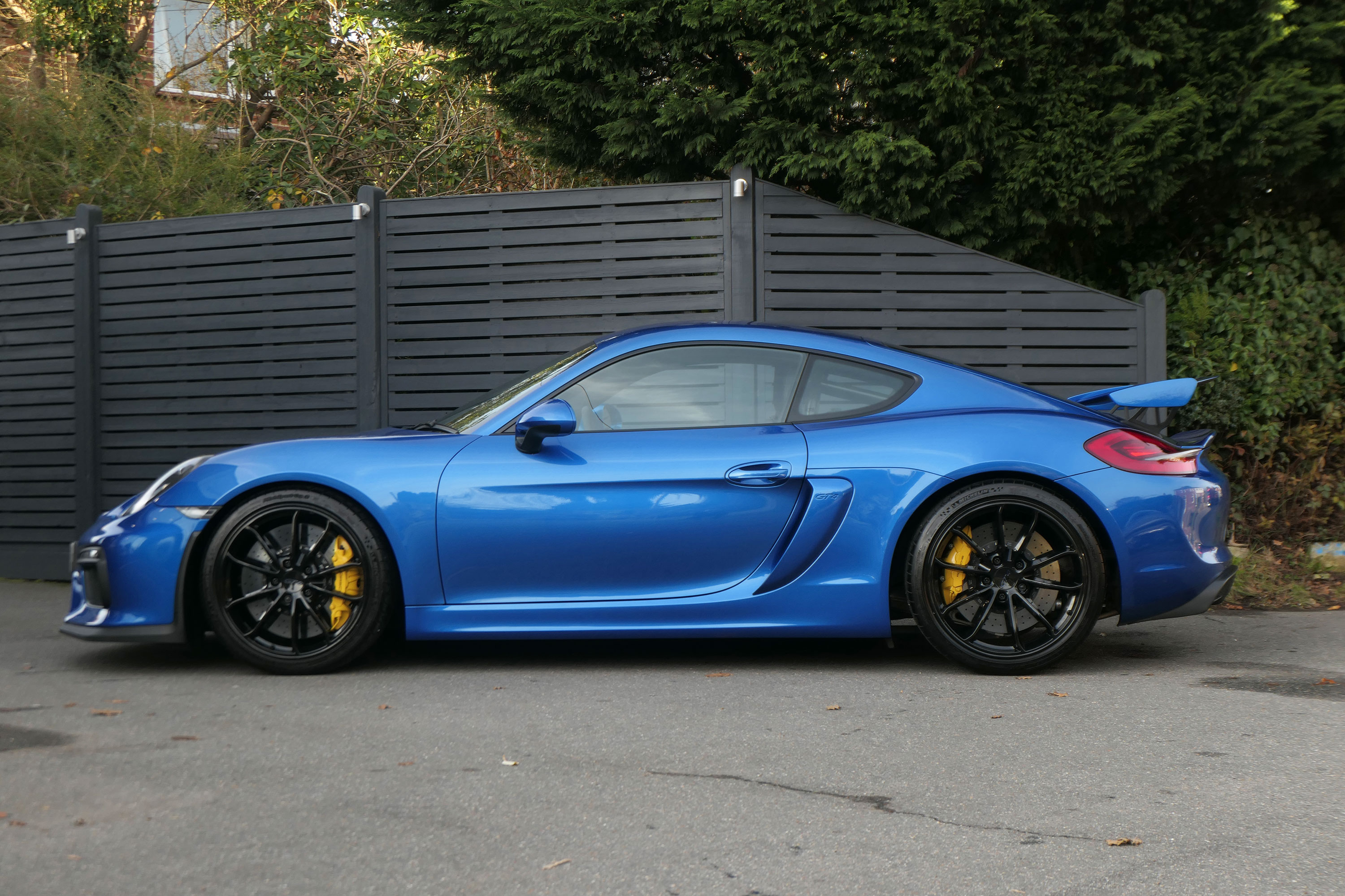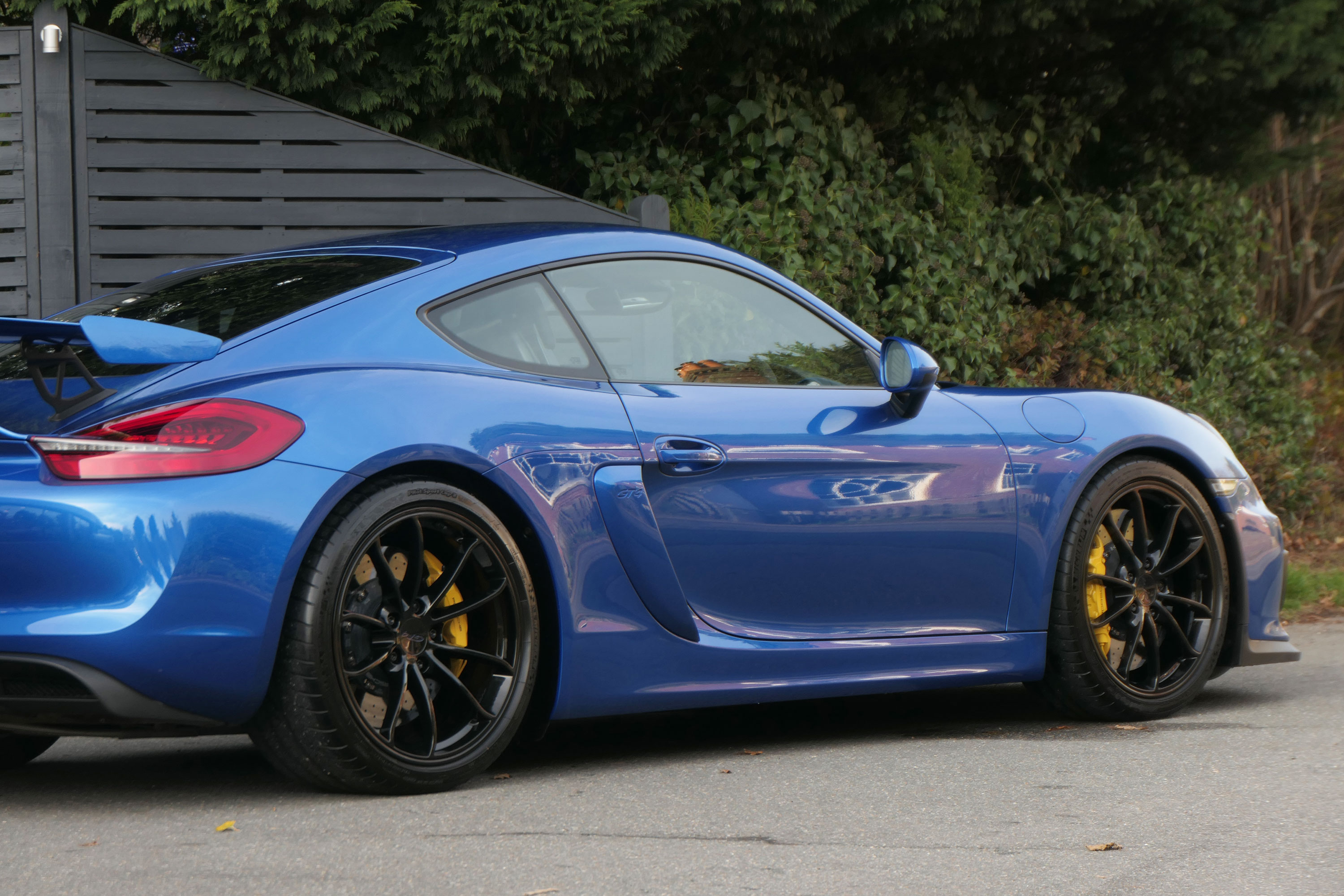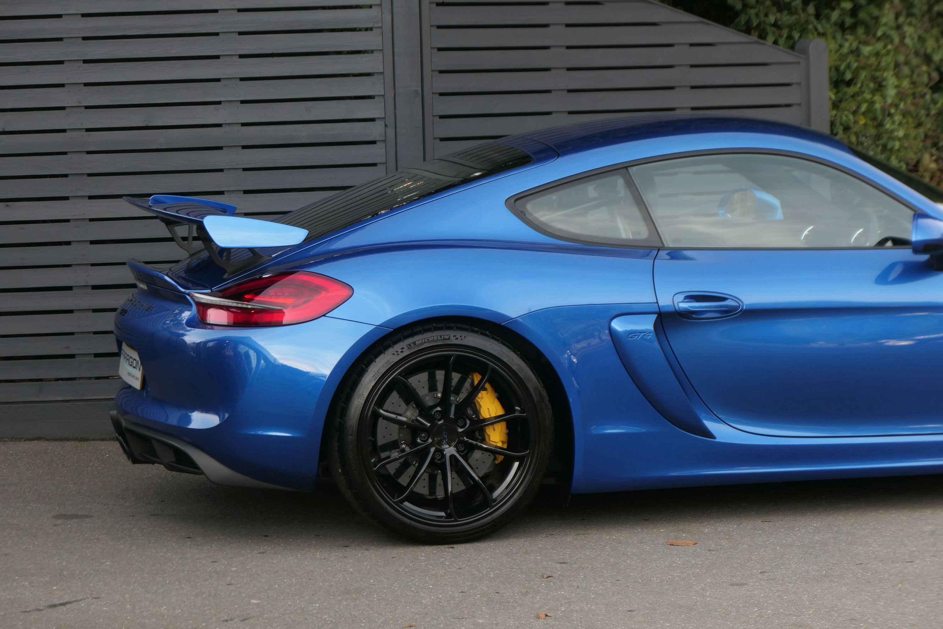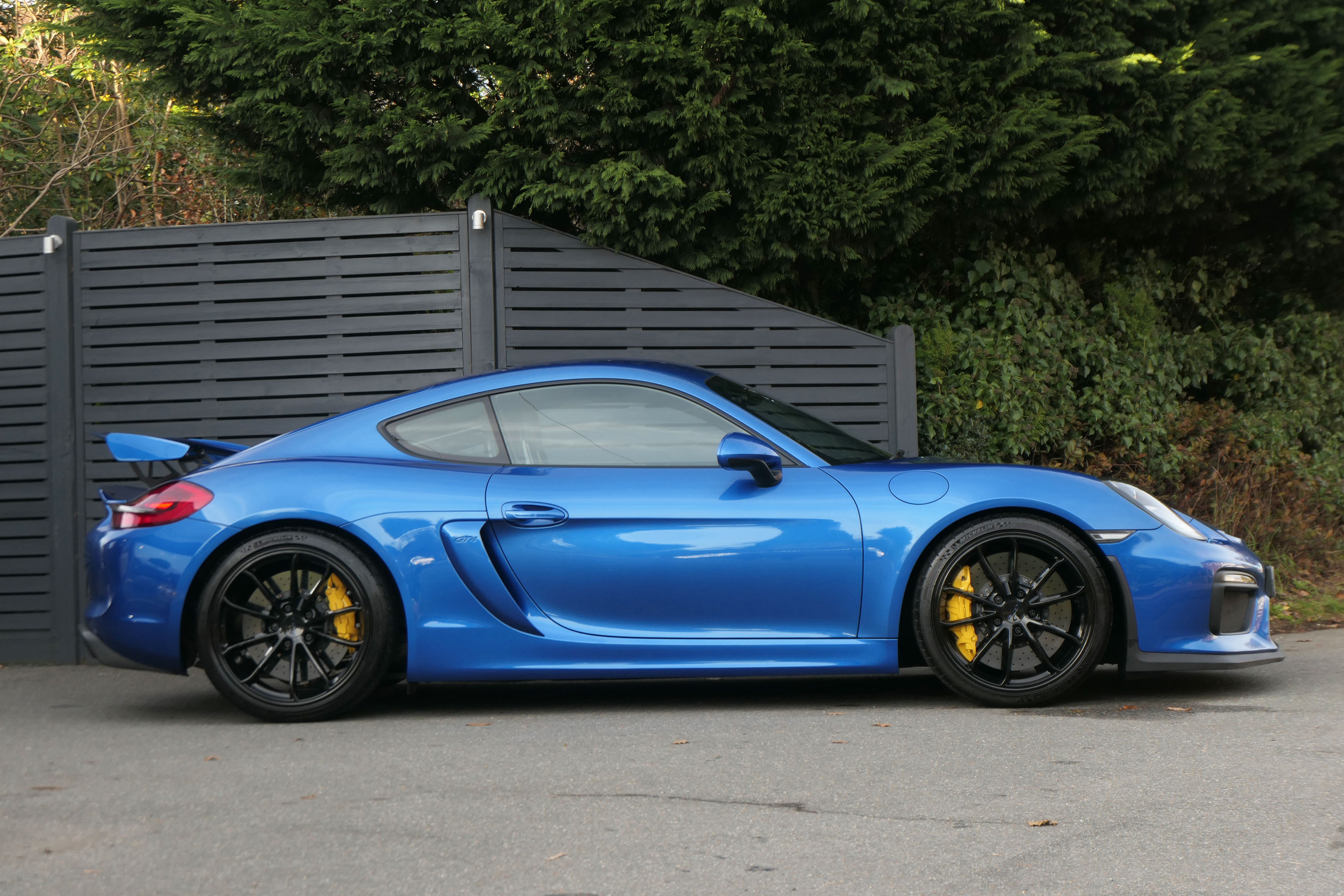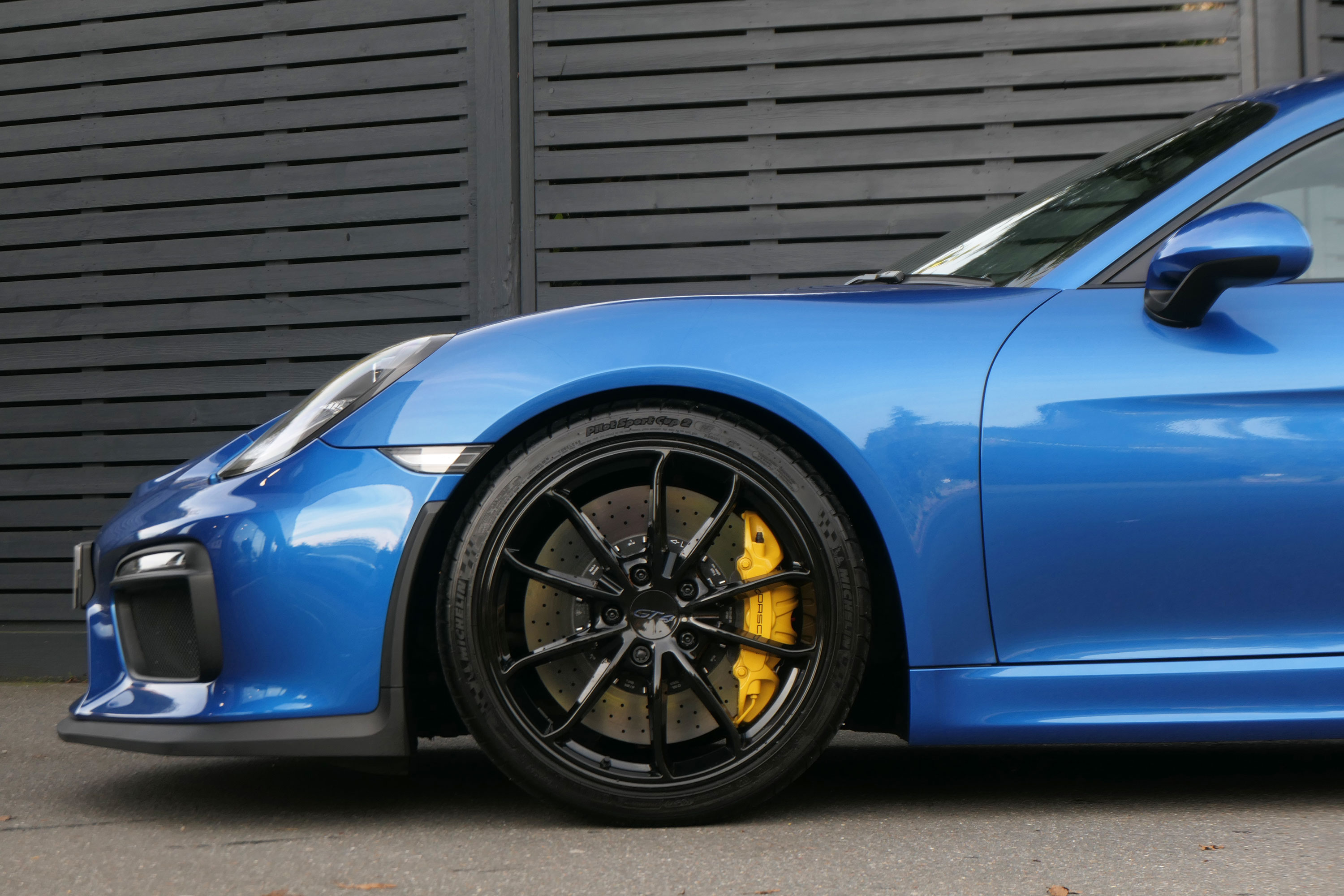 This Cayman GT4 (981) has the 6-speed manual gearbox and is presented in Sapphire Blue with black half leather 918 bucket seats.