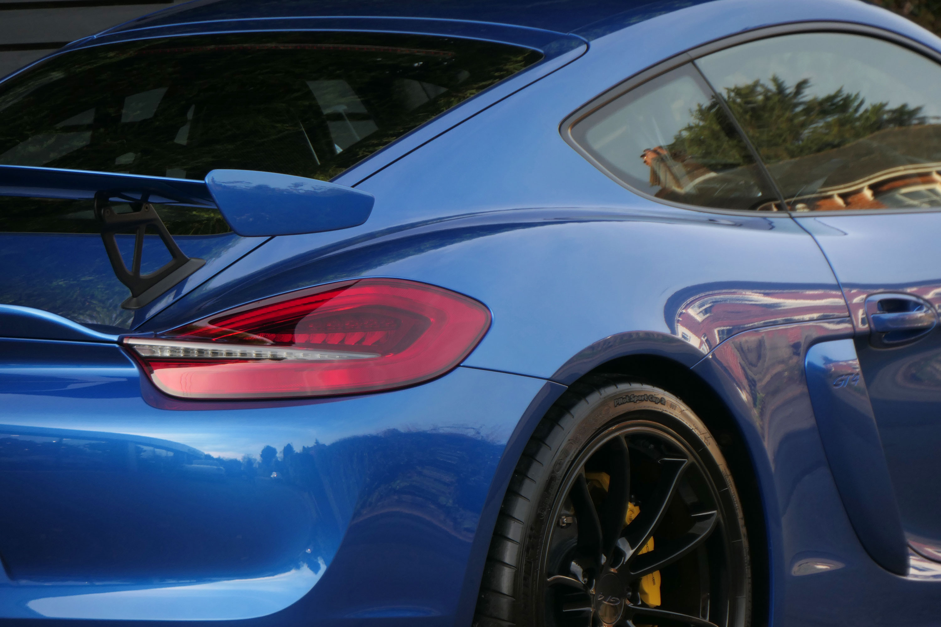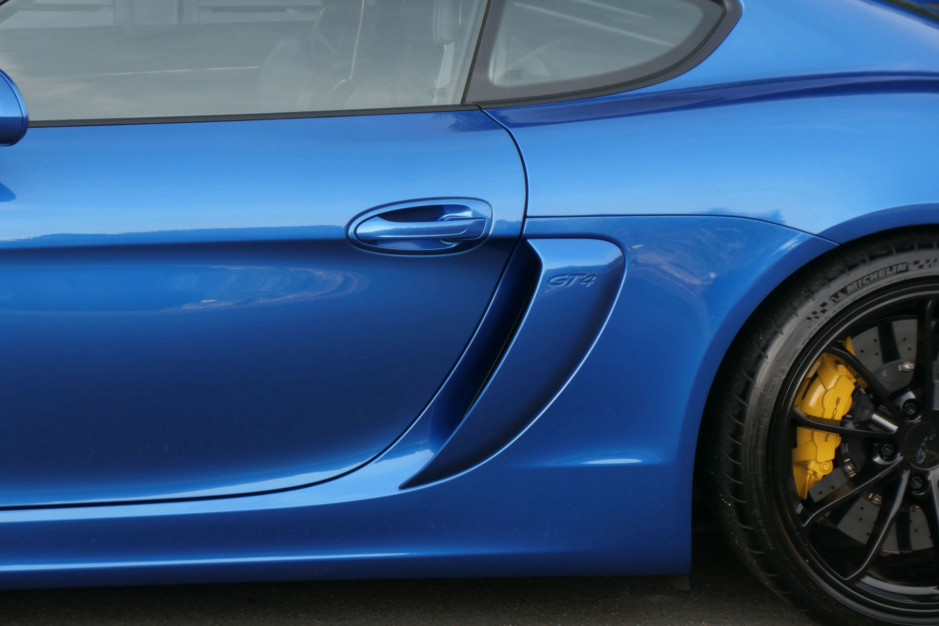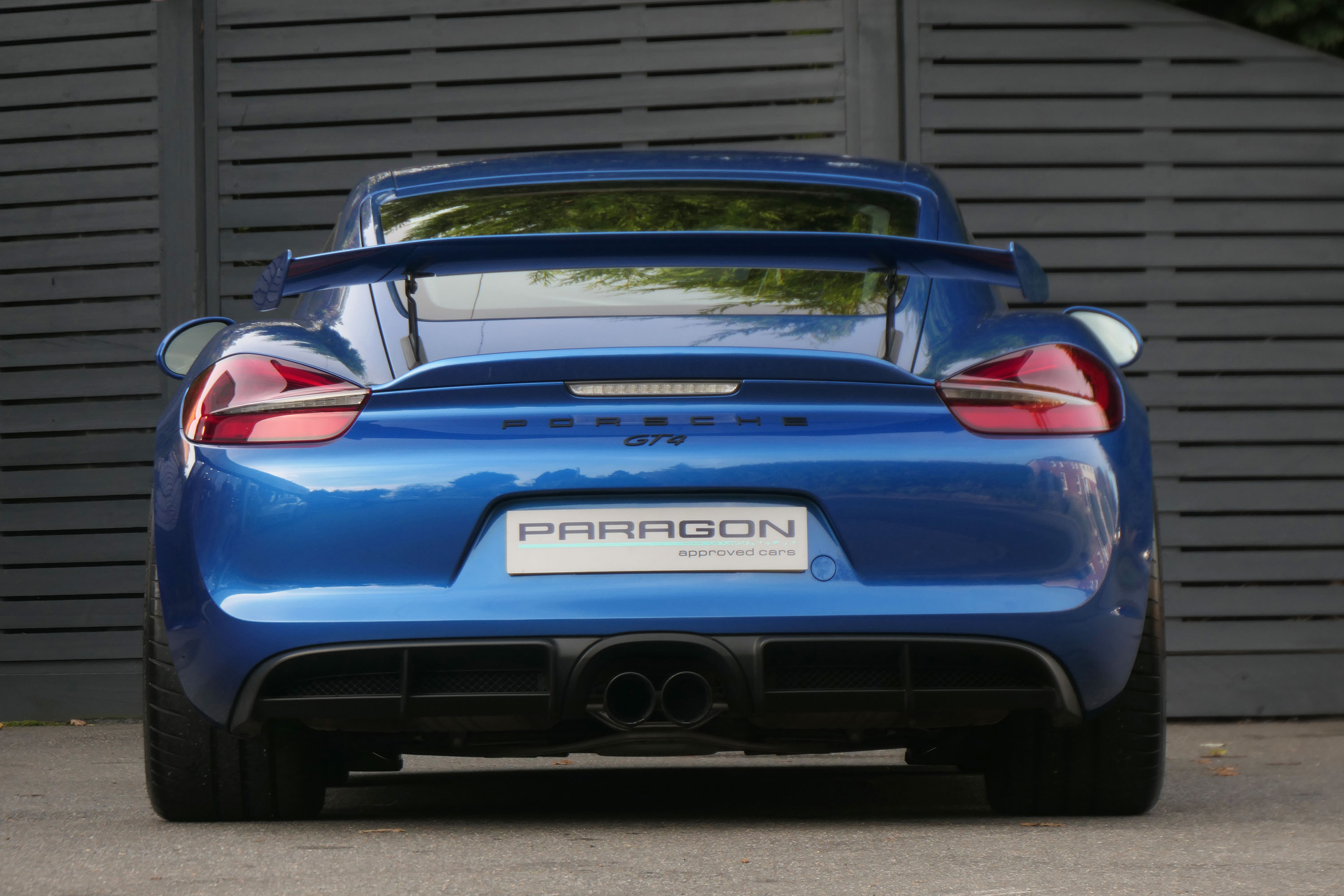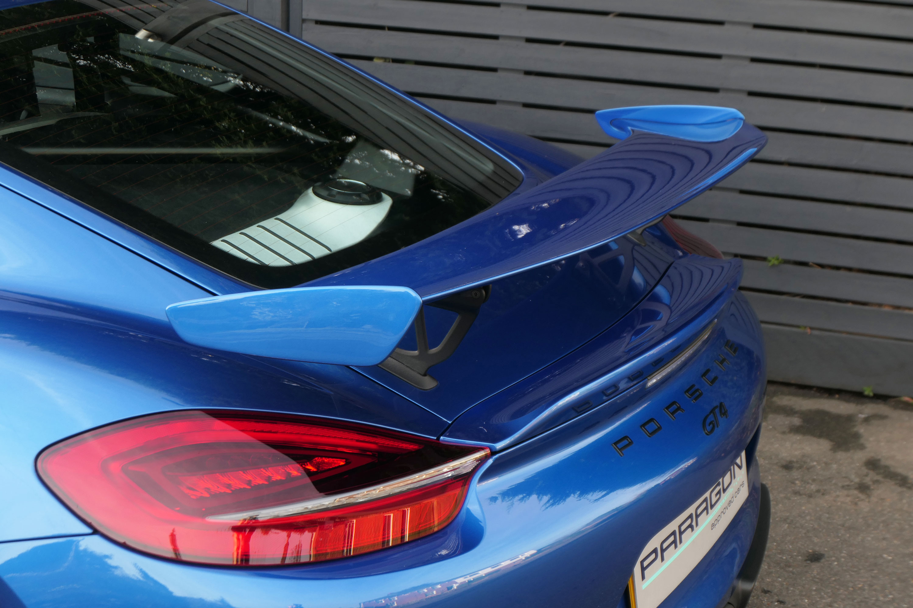This Cayman GT4 (981) has the 6-speed manual gearbox and is presented in Sapphire Blue with black half leather 918 bucket seats.