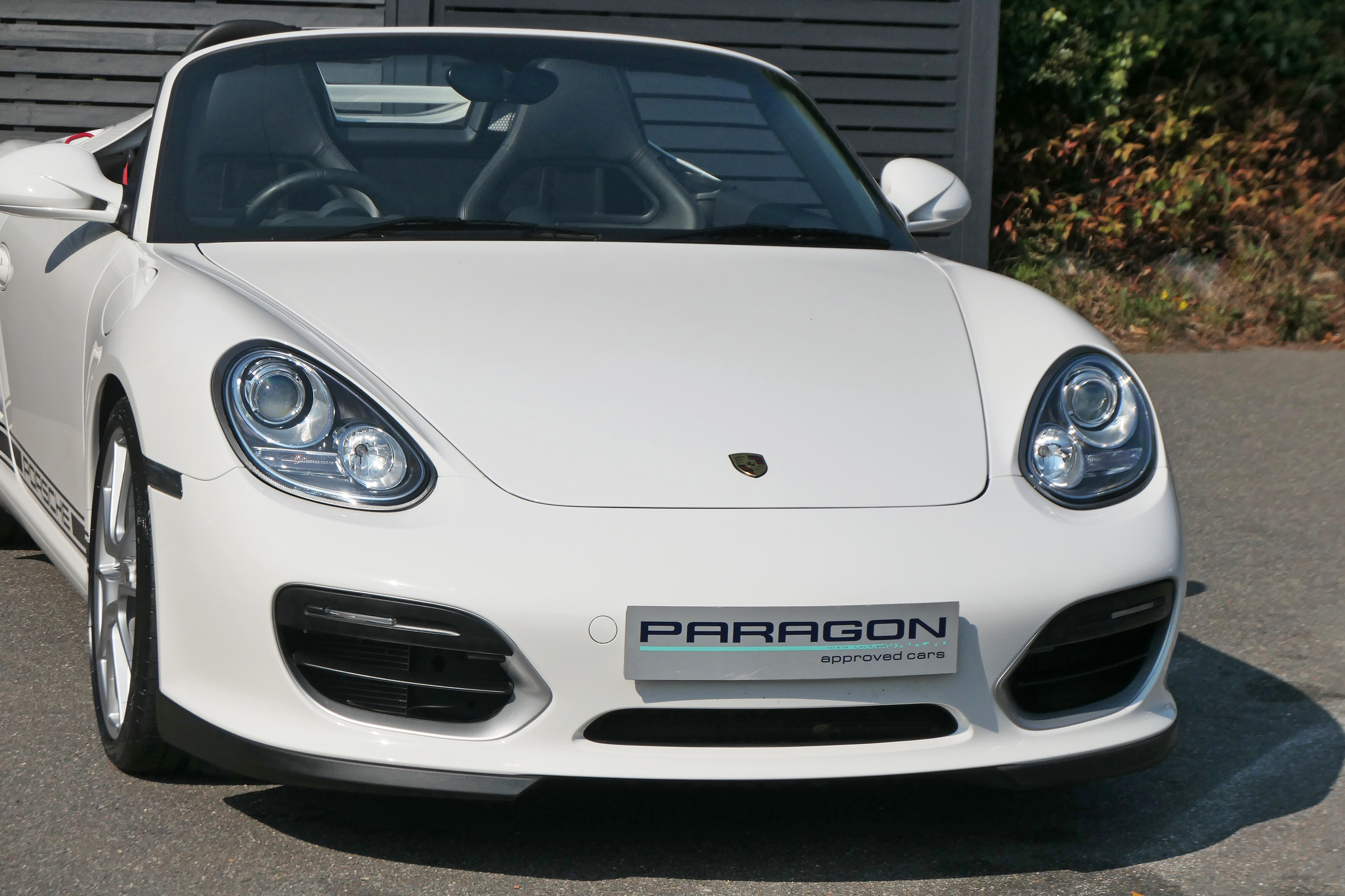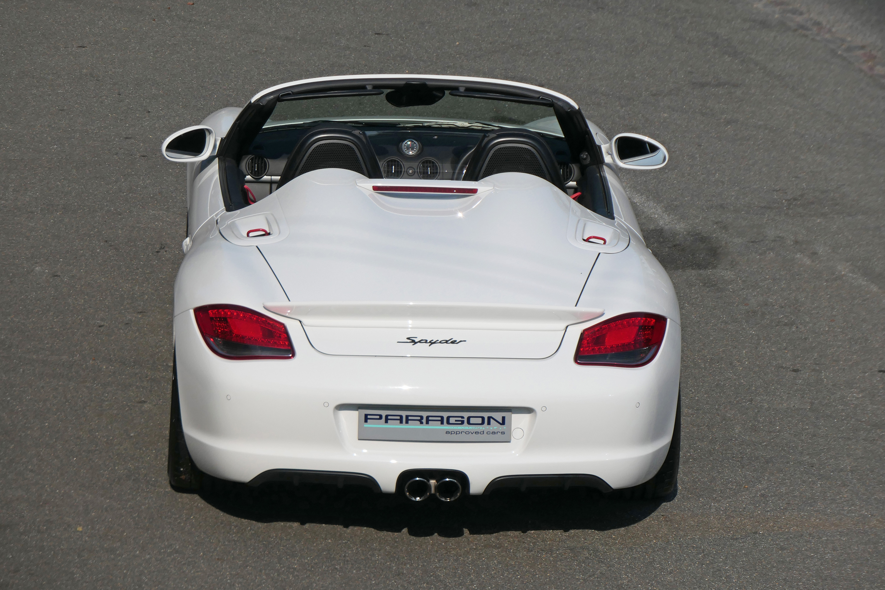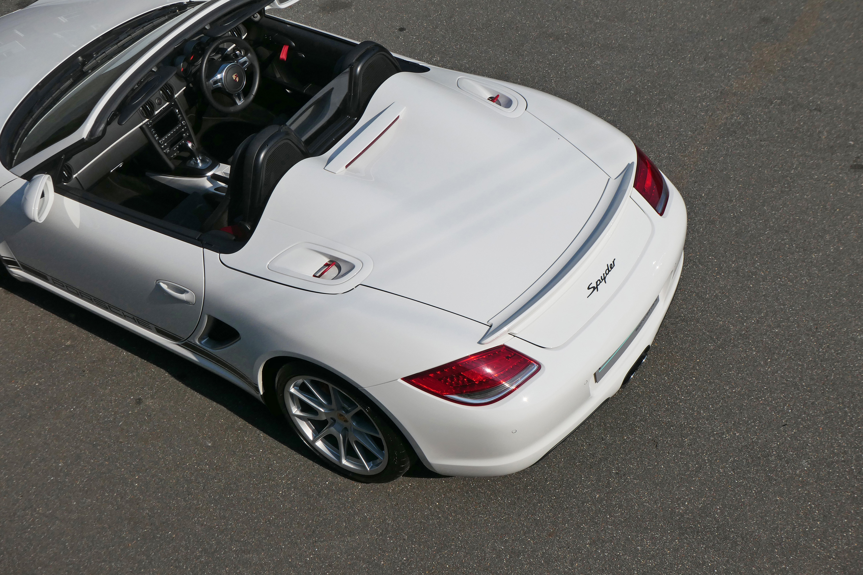 This Boxster Spyder (987.2) has the 7-speed PDK gearbox and is presented in Carrara White with black leather sport seats and a black lightweight hood.