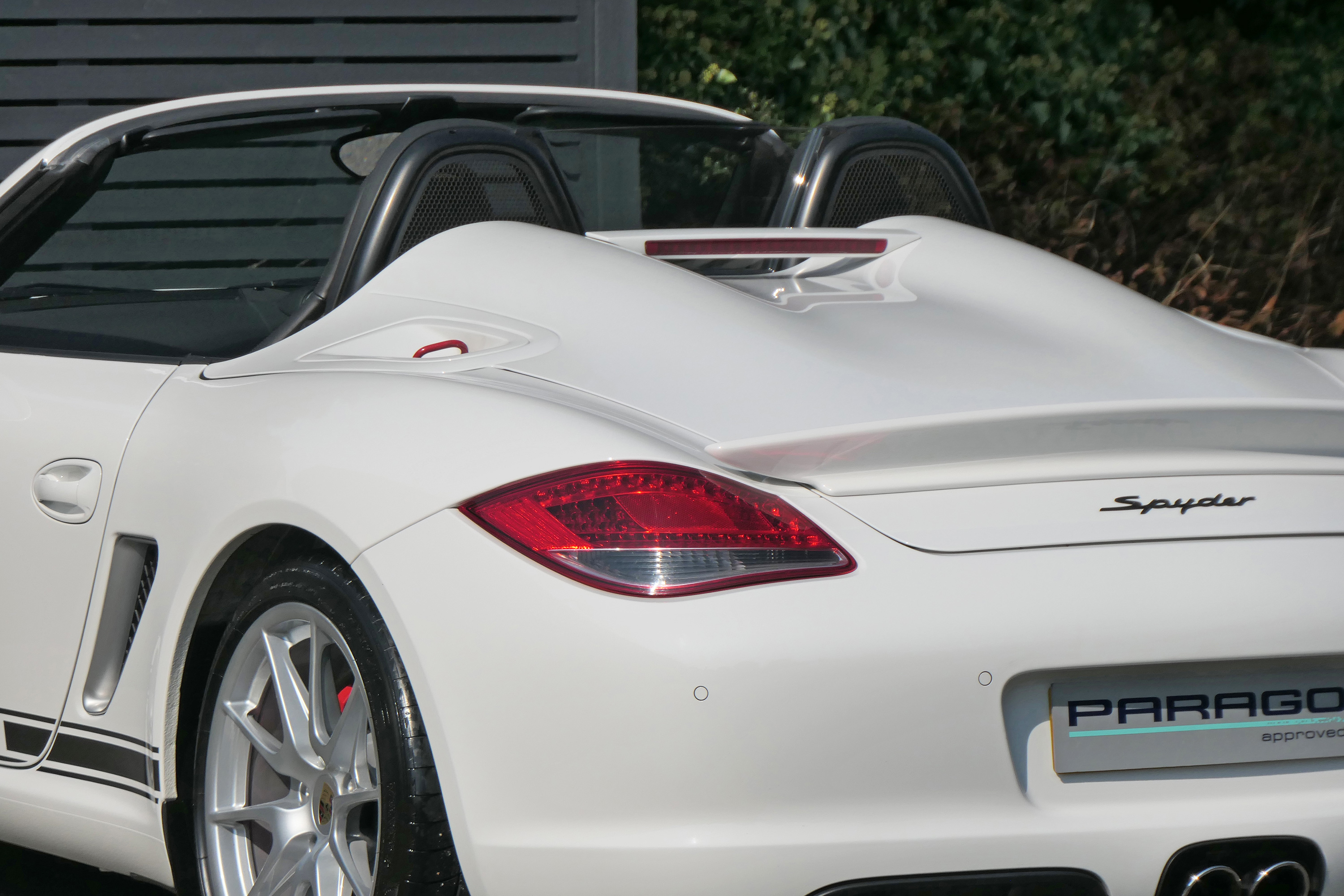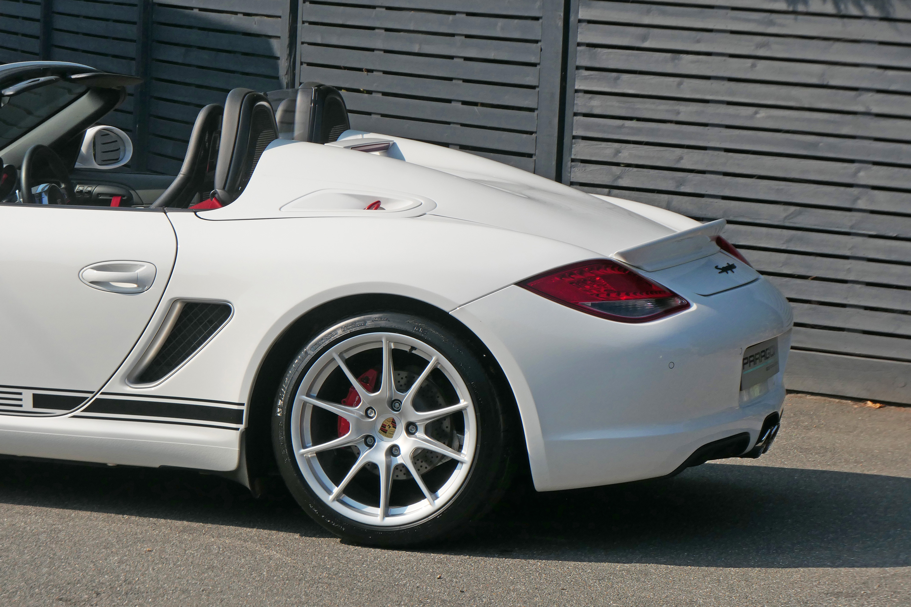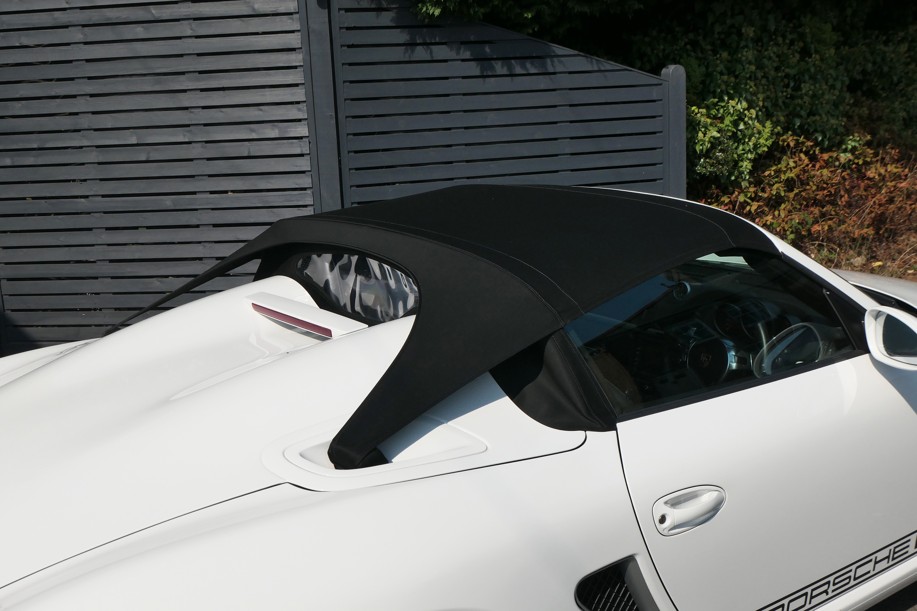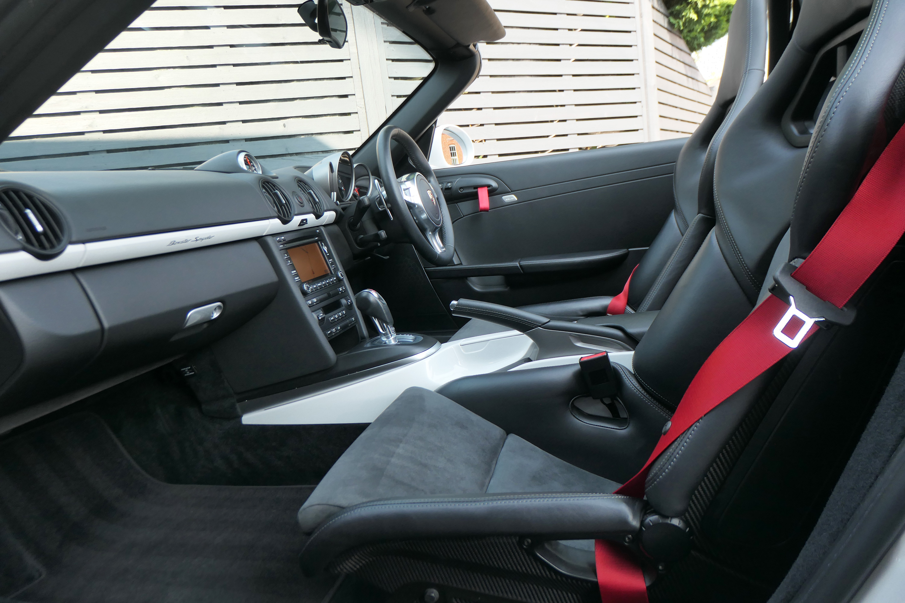 As standard the Spyder is fitted with a wind deflector, Porsche Stability Management, onboard computer, the Porsche Sound Package, 19" Boxster Spyder wheels, a colour coded centre console, LED daytime running lights and the black lightweight hood.