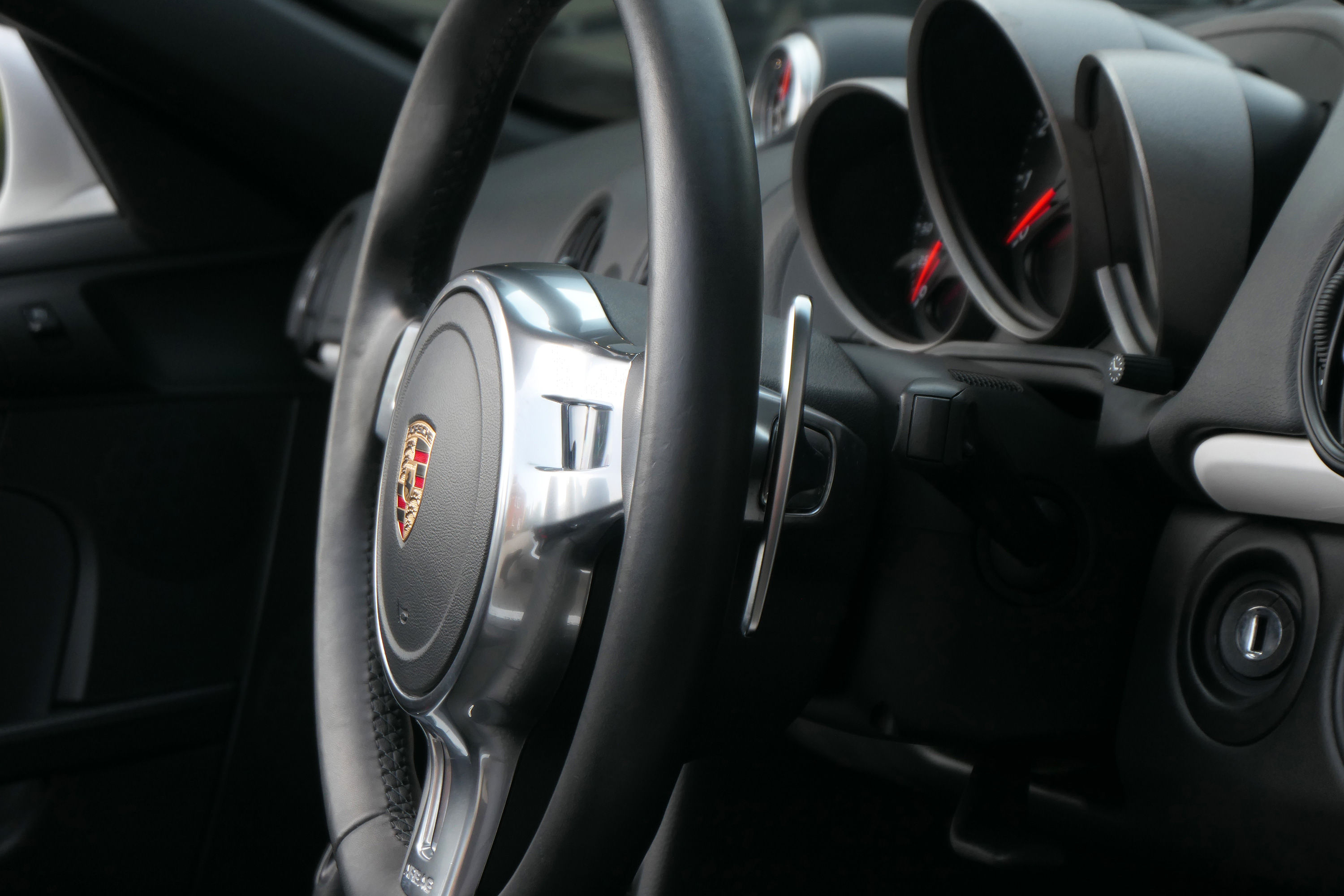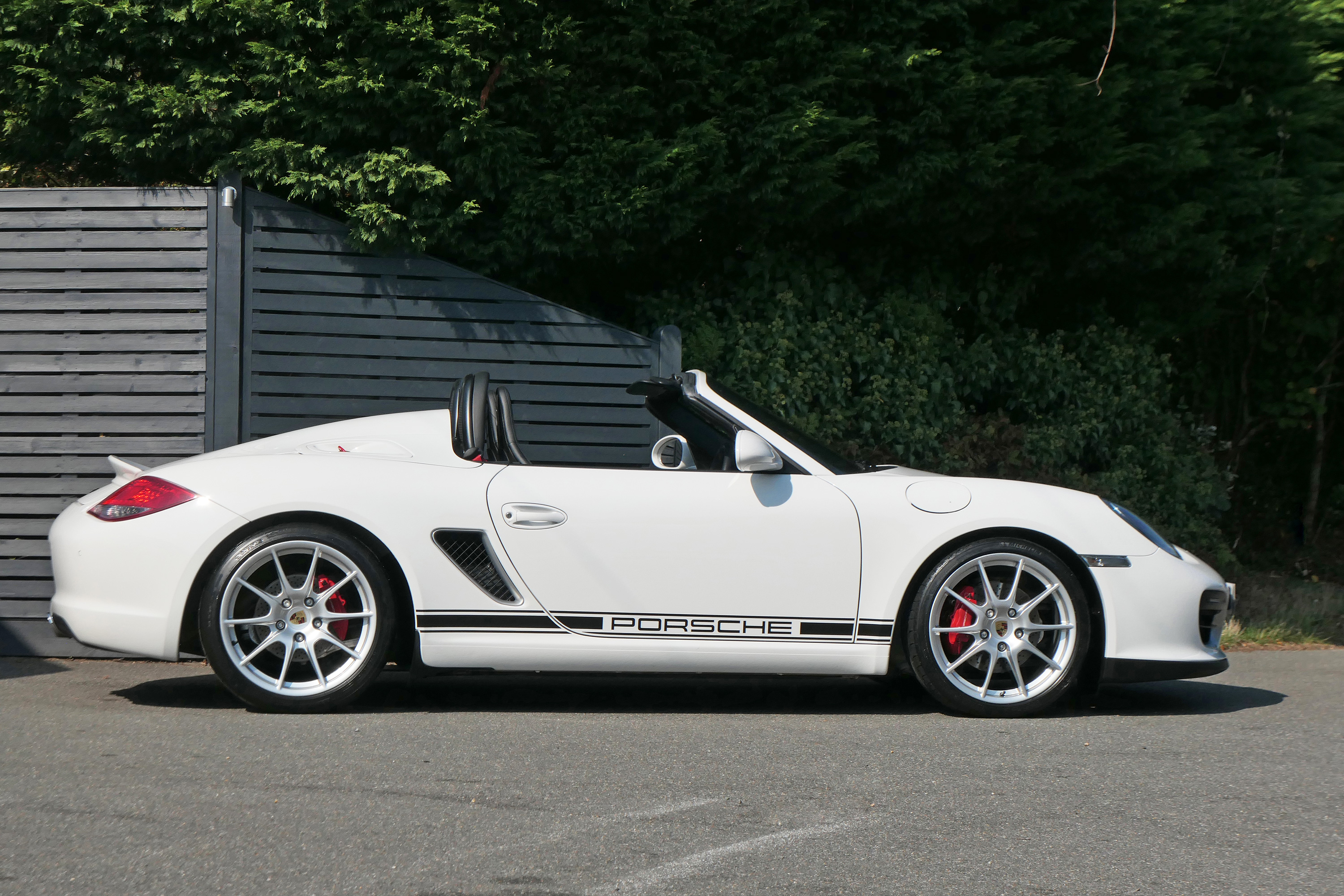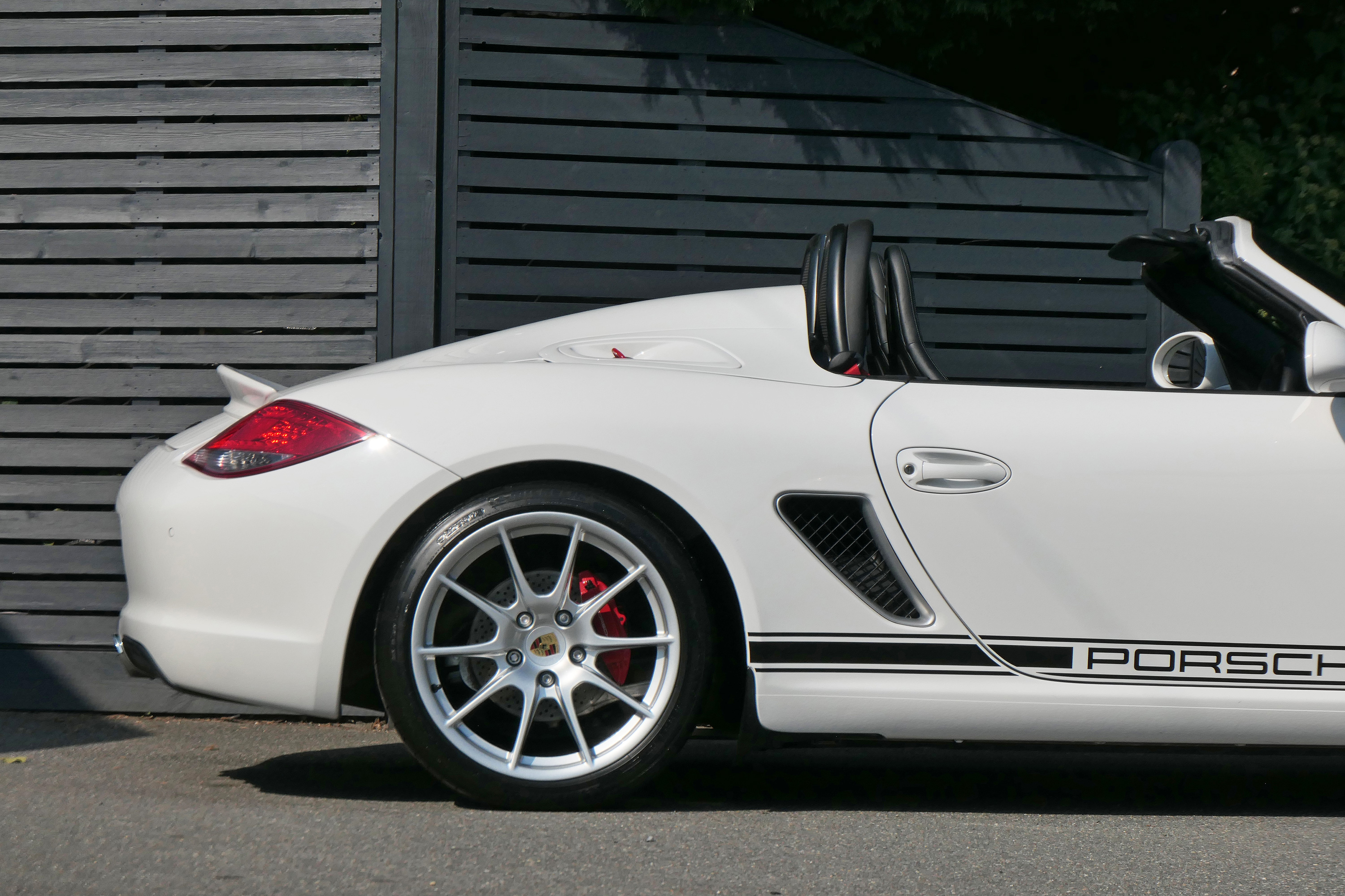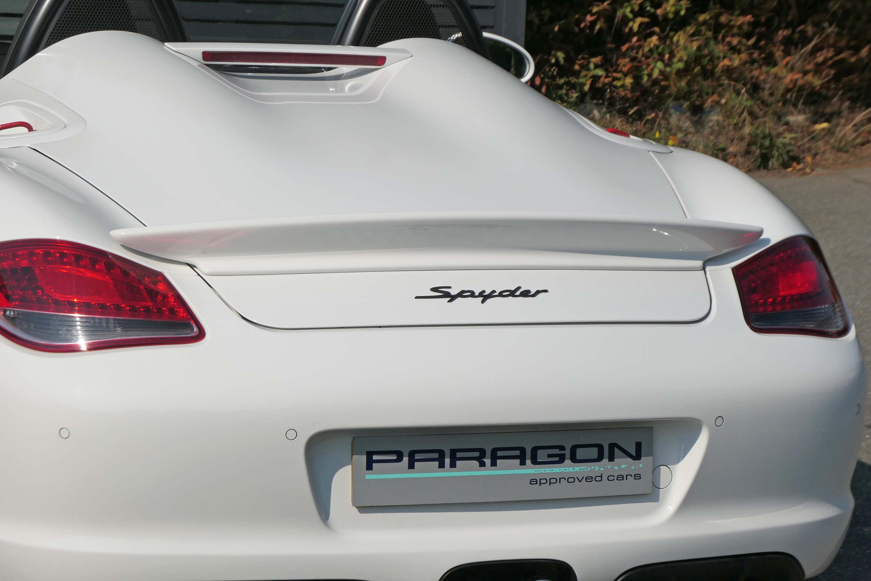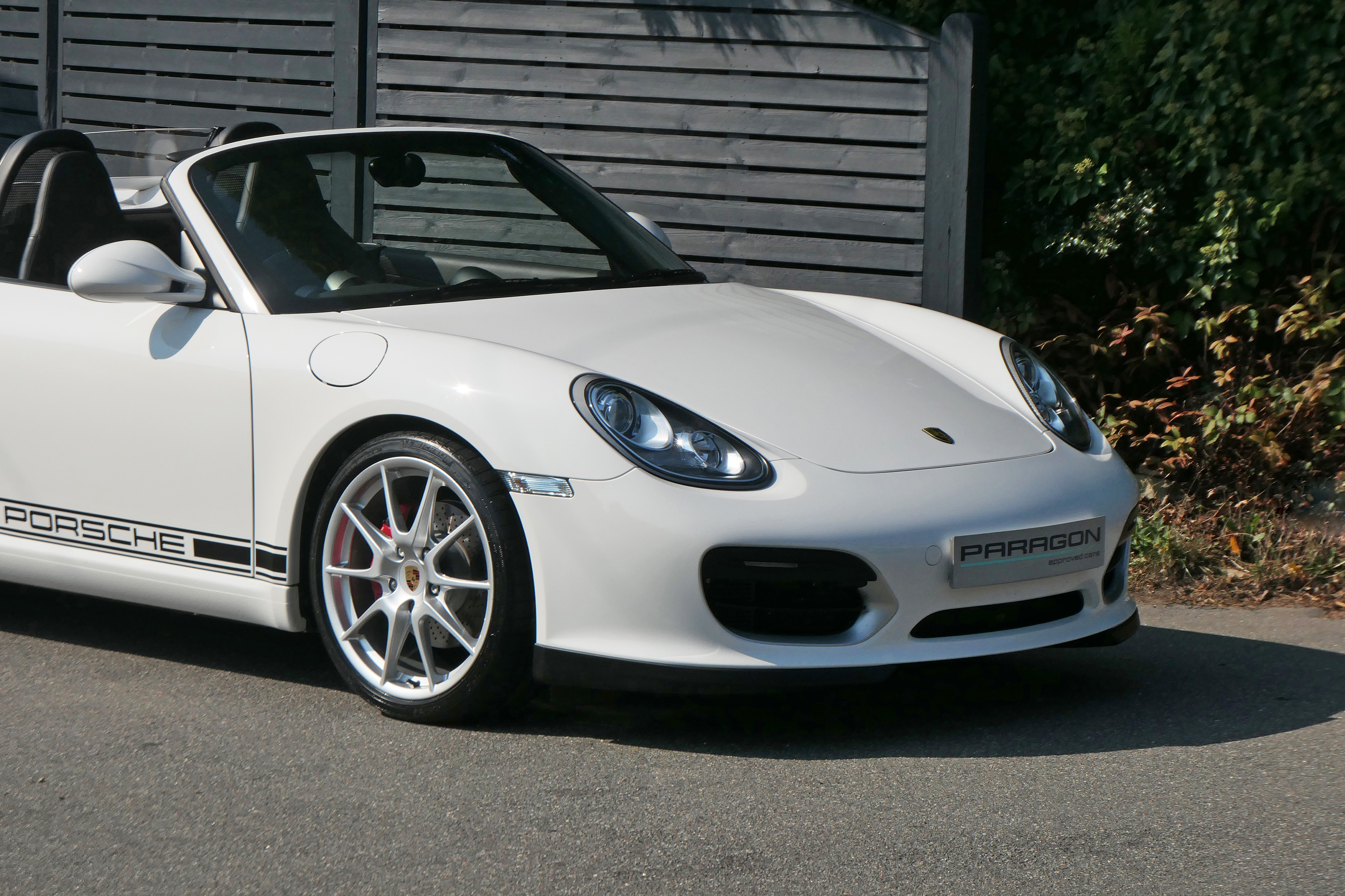 As standard the Spyder is fitted with a wind deflector, Porsche Stability Management, onboard computer, the Porsche Sound Package, 19" Boxster Spyder wheels, a colour coded centre console, LED daytime running lights and the black lightweight hood.