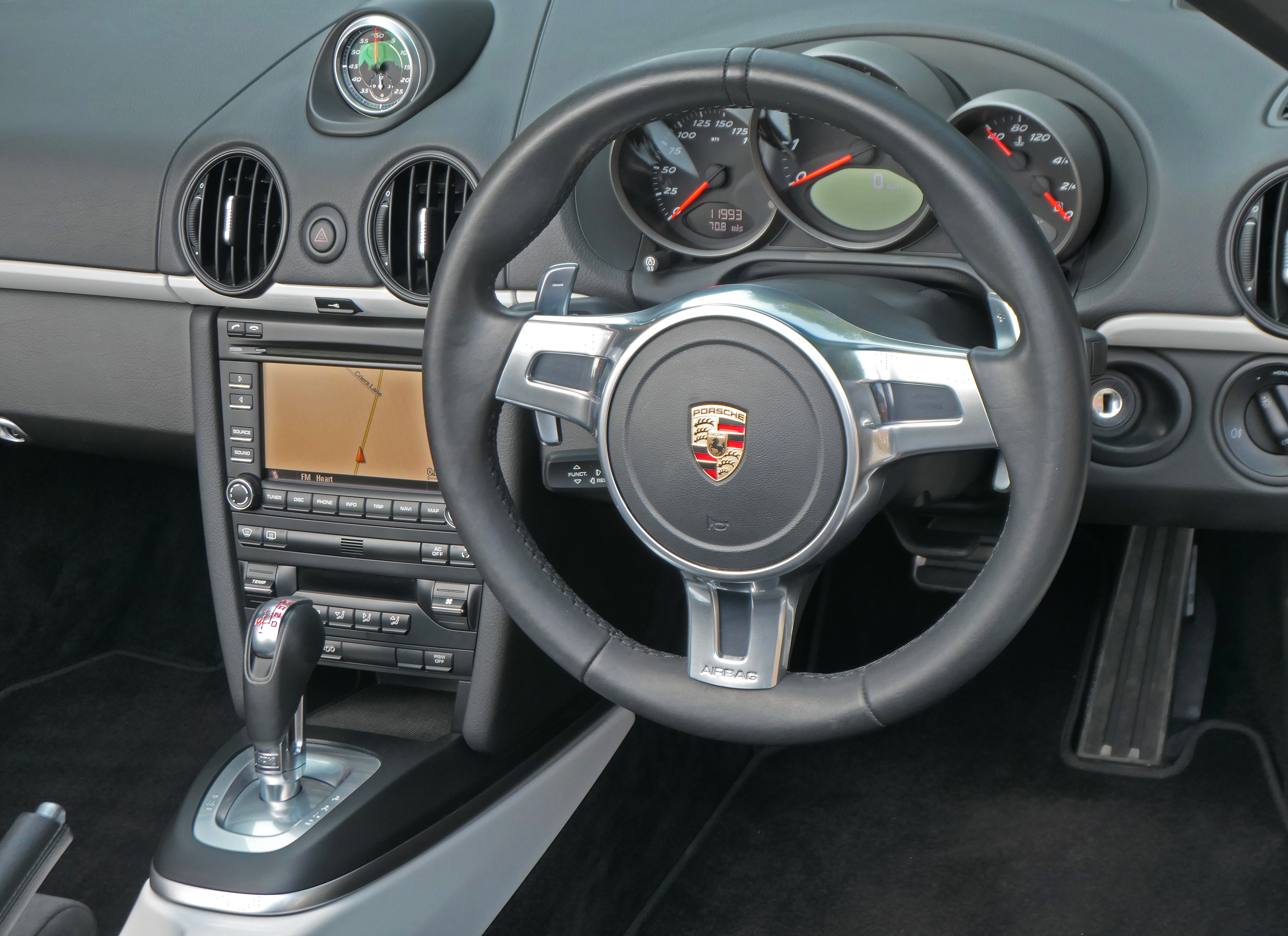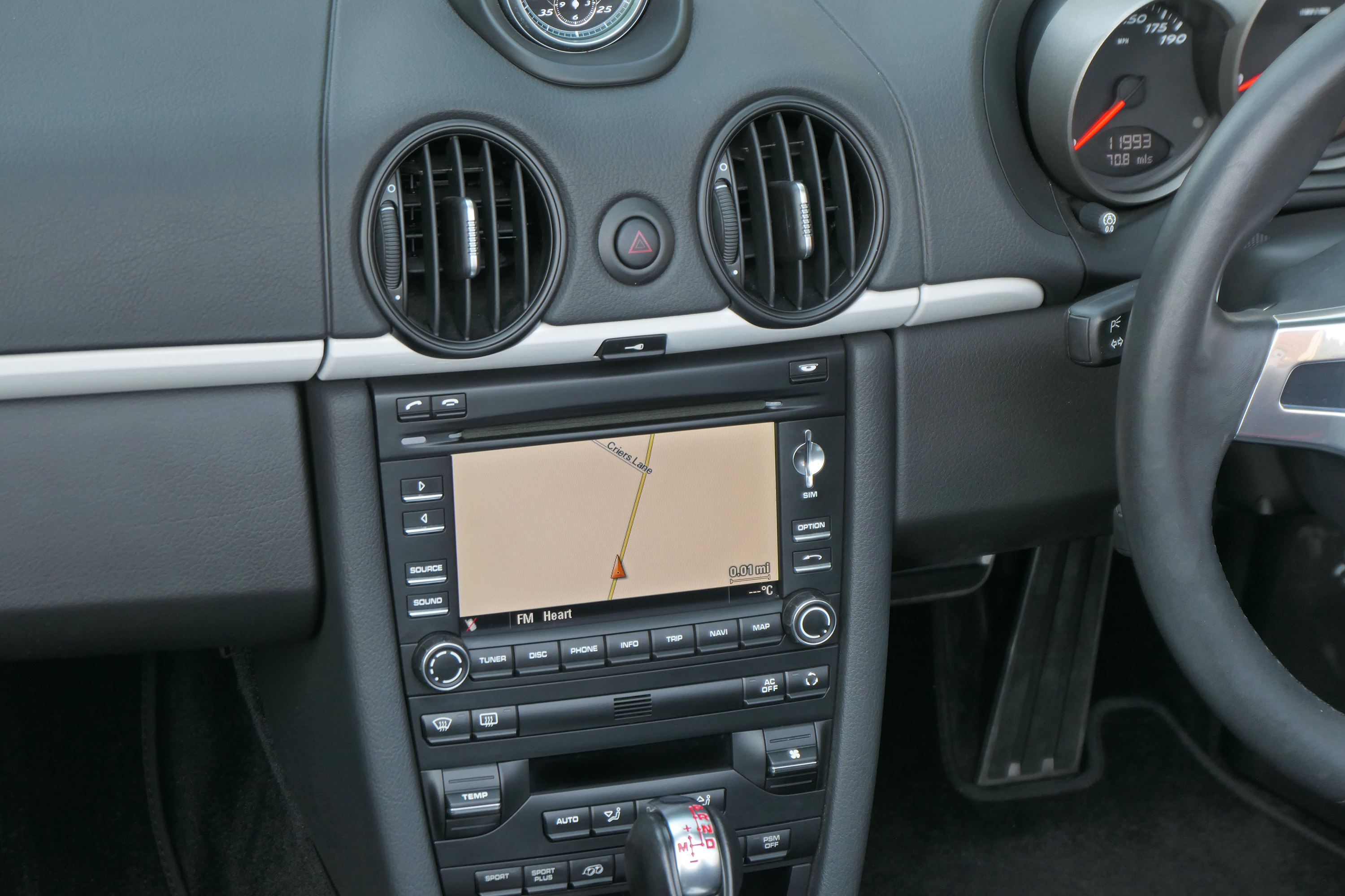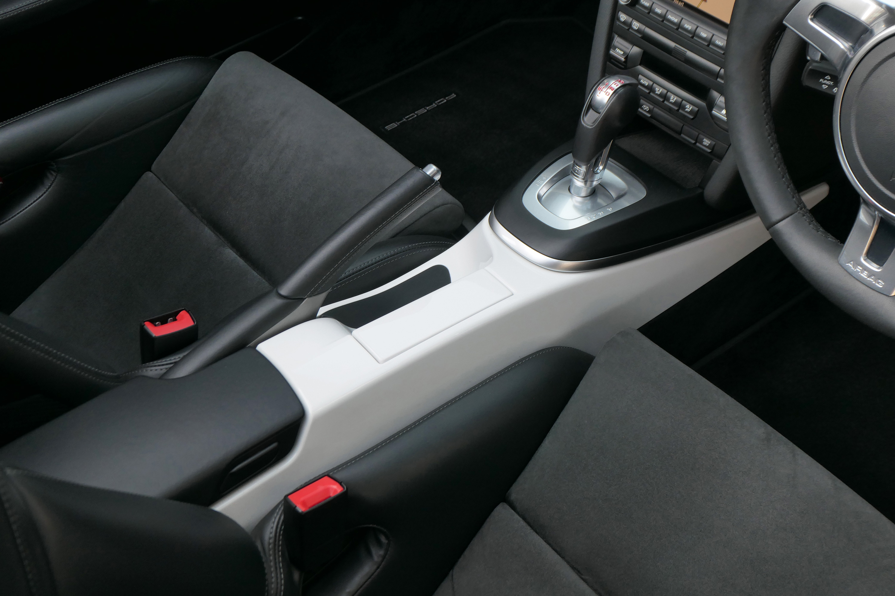Factory-fitted options include touchscreen satellite navigation, the 7-speed PDK gearbox with Sport Design steering wheel, Guards Red seat belts, a switchable sports exhaust, rear parking sensors, the Sport Chrono Pack with Sport Plus and Bluetooth phone.